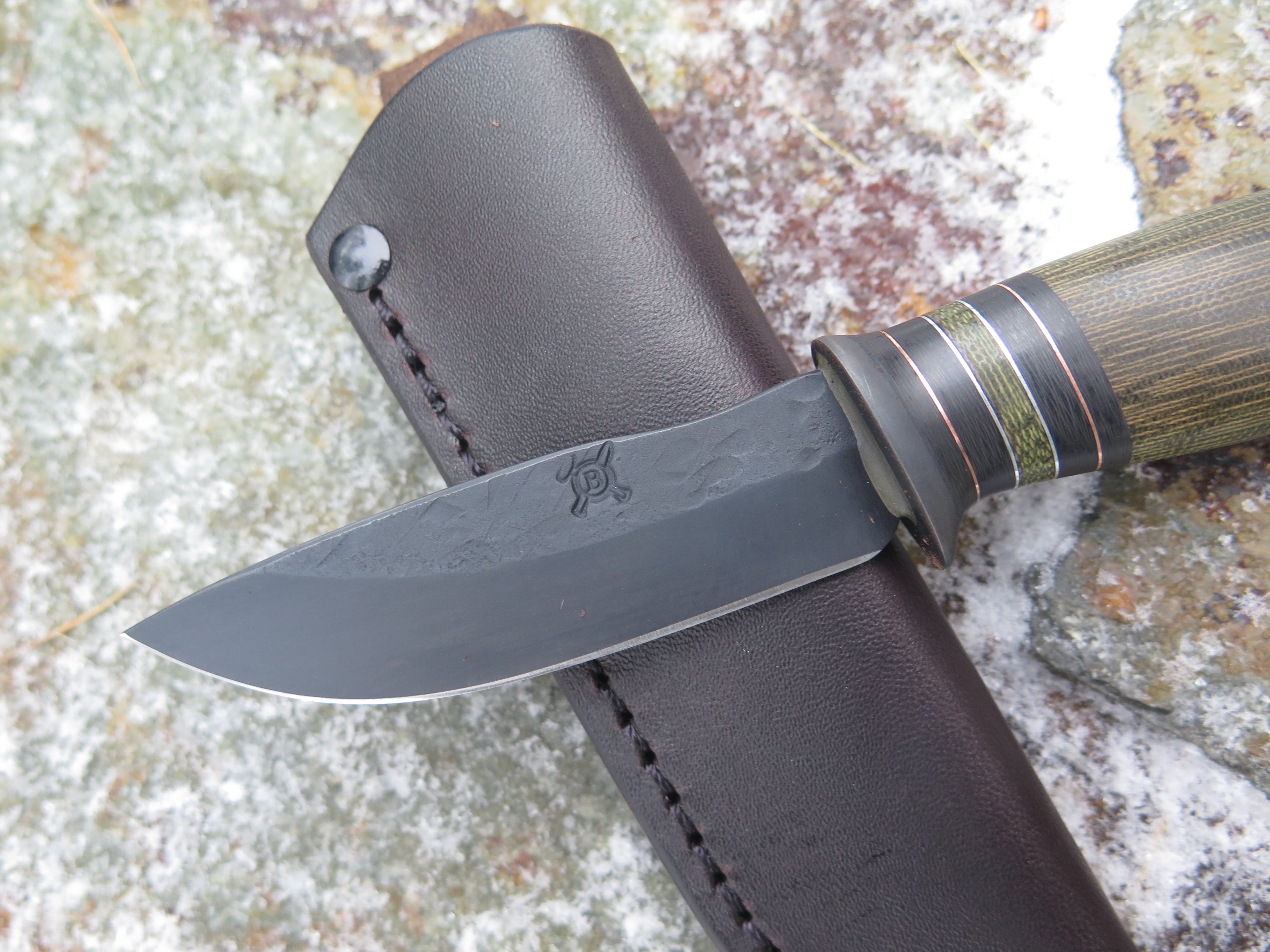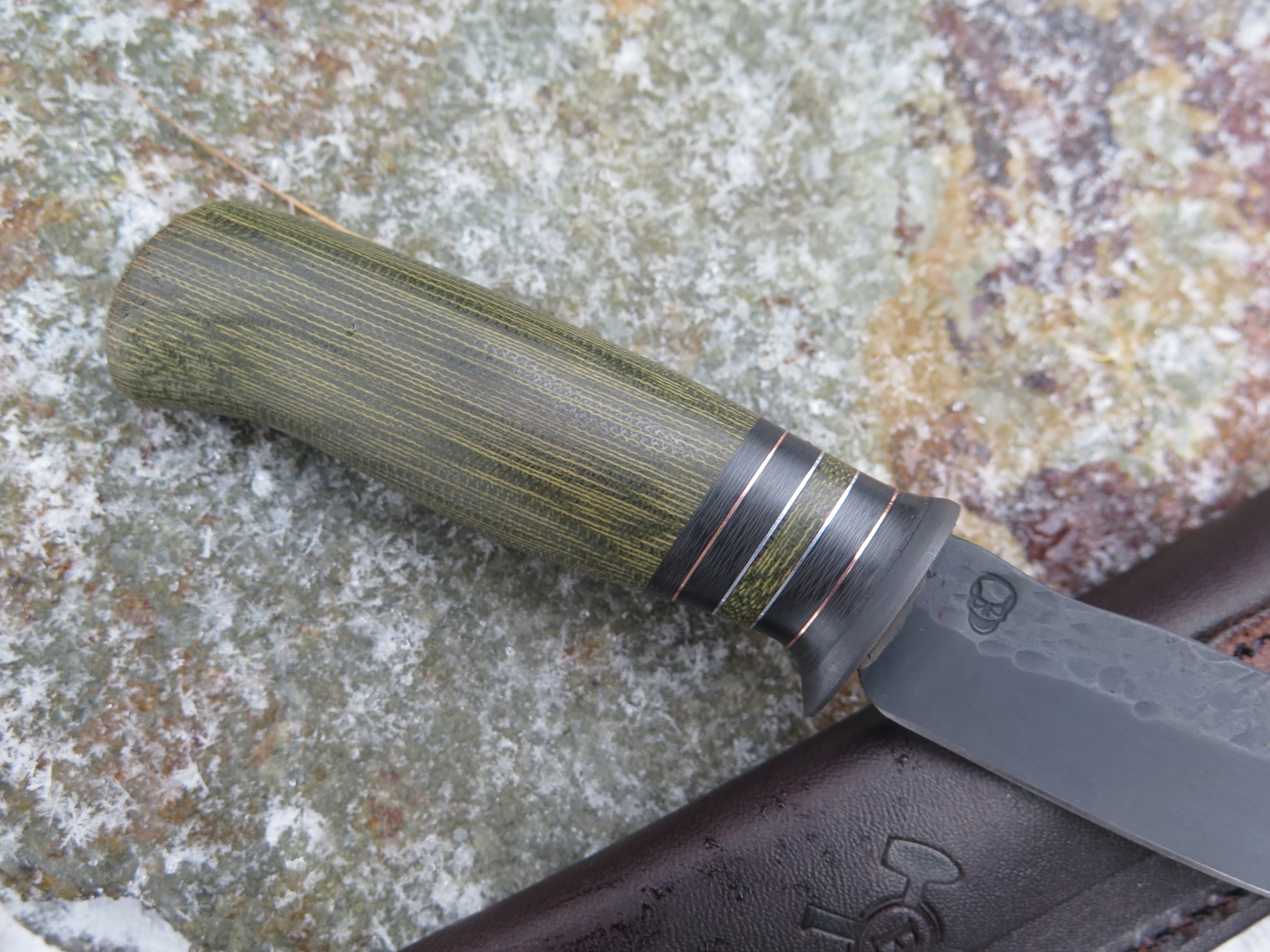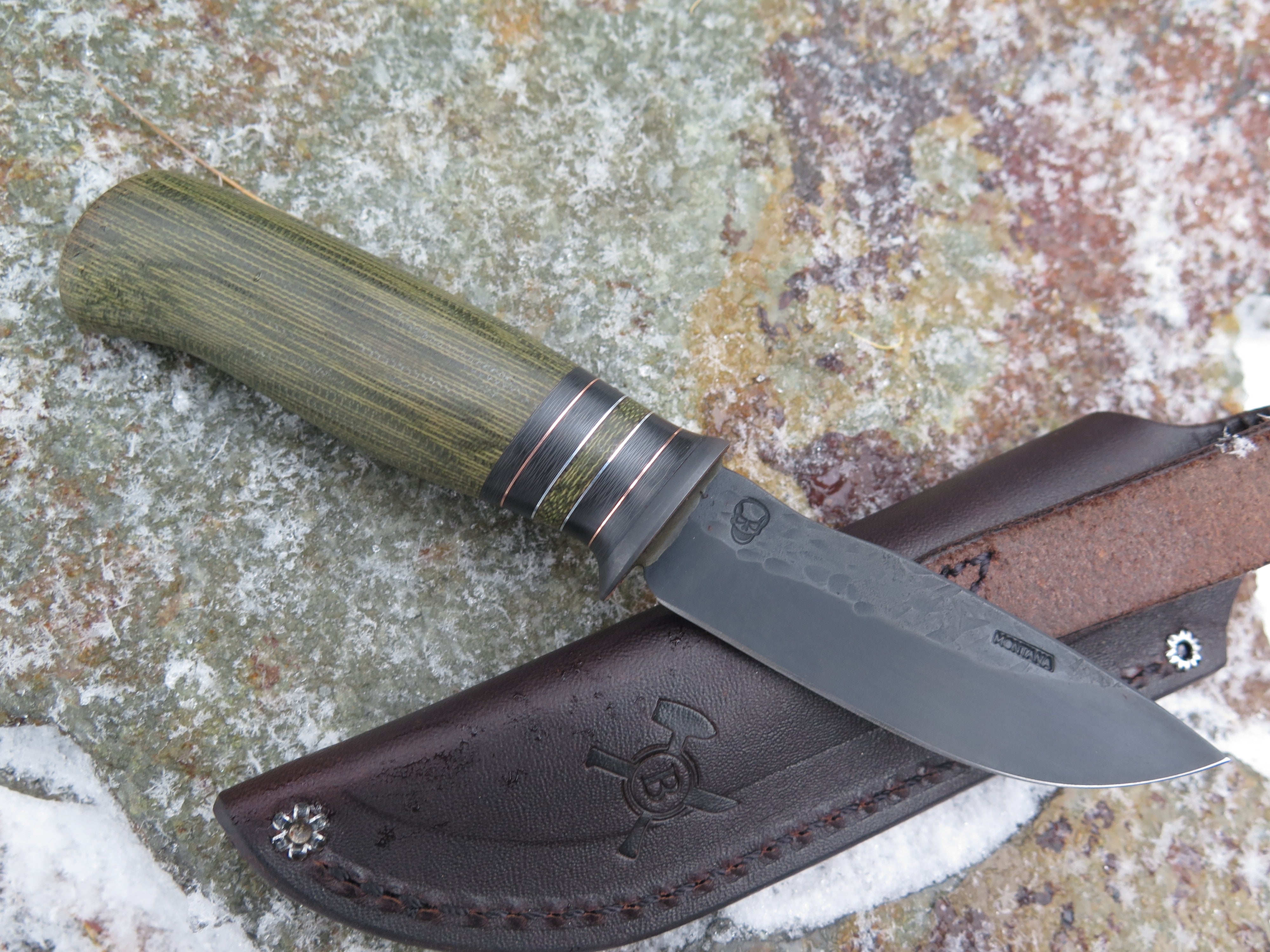 This sleek new modified Drop Point from Behring Made© is hand forged from 1/8" thick high carbon 01 tool steel and measures 3 1/4" from tip to guard with a razor sharp hollow grind, hammermarks and our forced patina blued finish. The blued steel guard is soldered in place above black fiber, copper, aluminum, carbon fiber and green micarta spacers as well as a green canvas micarta handle. The overall length measures 6 3/4" and it comes in the shown premium leather belt pouch sheath, though substitutions are available upon request.