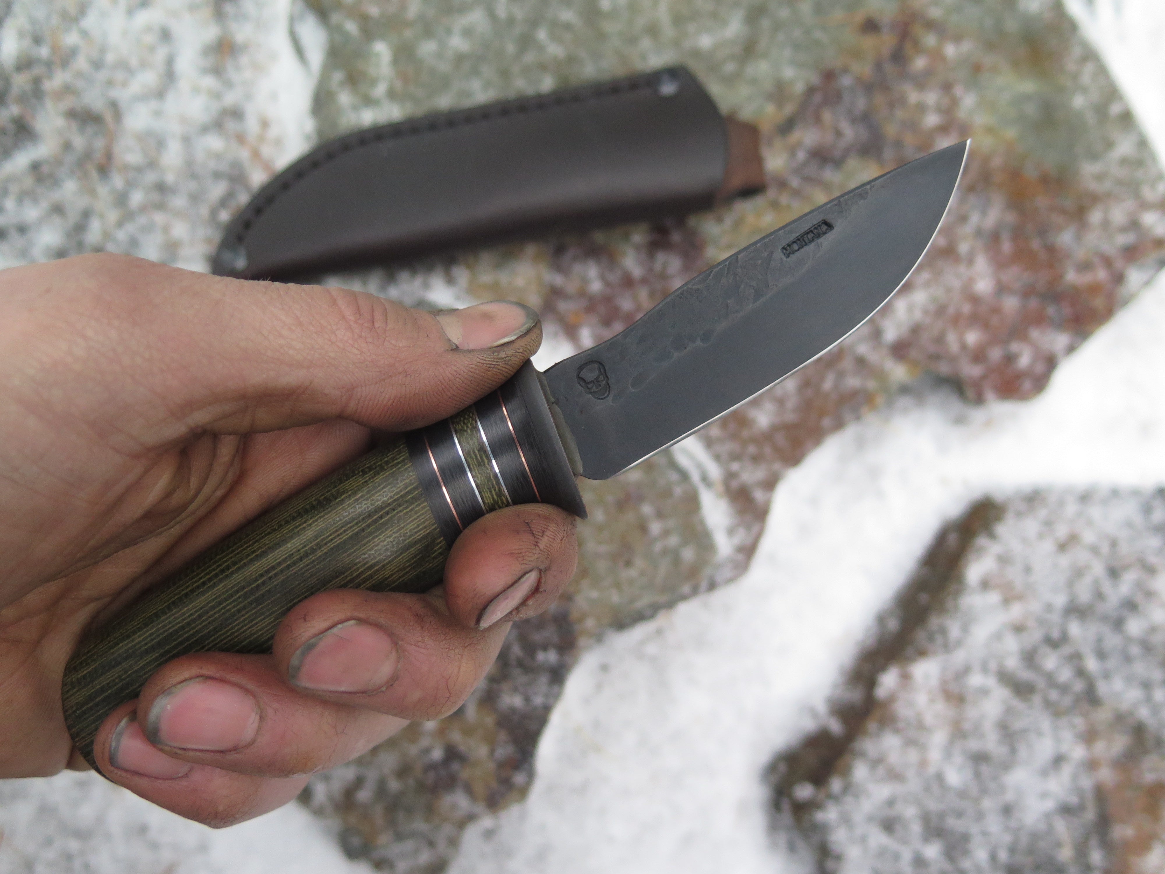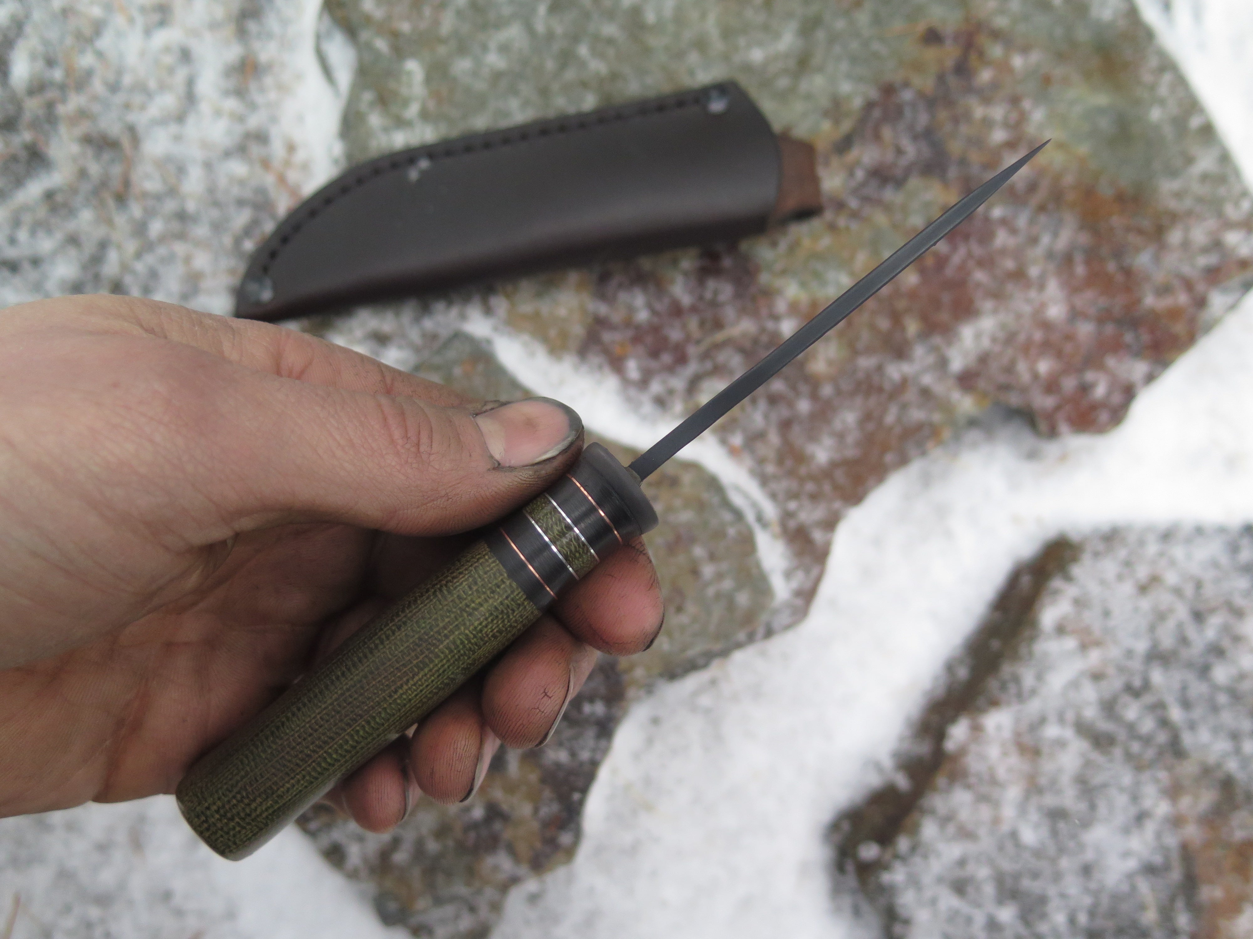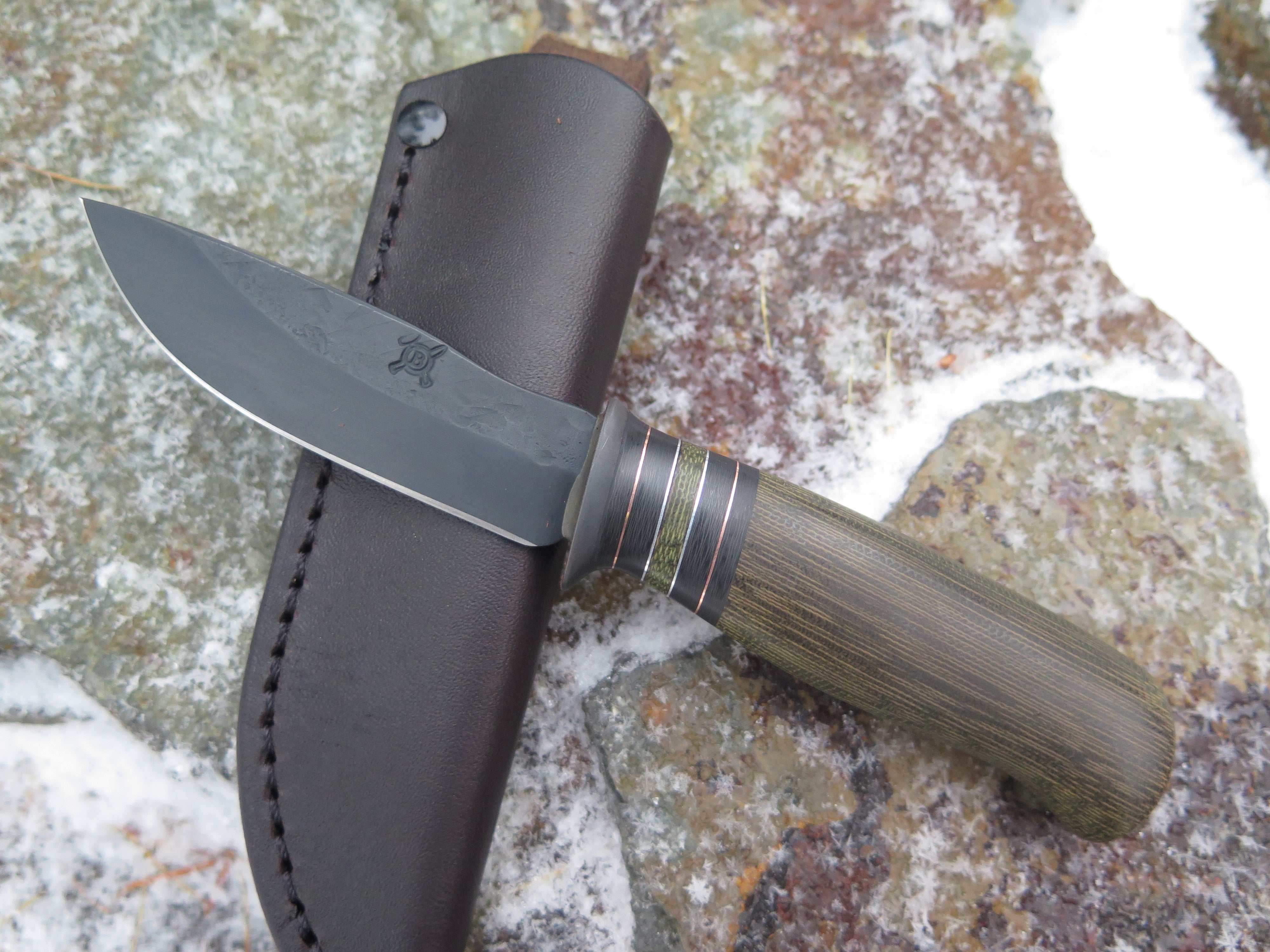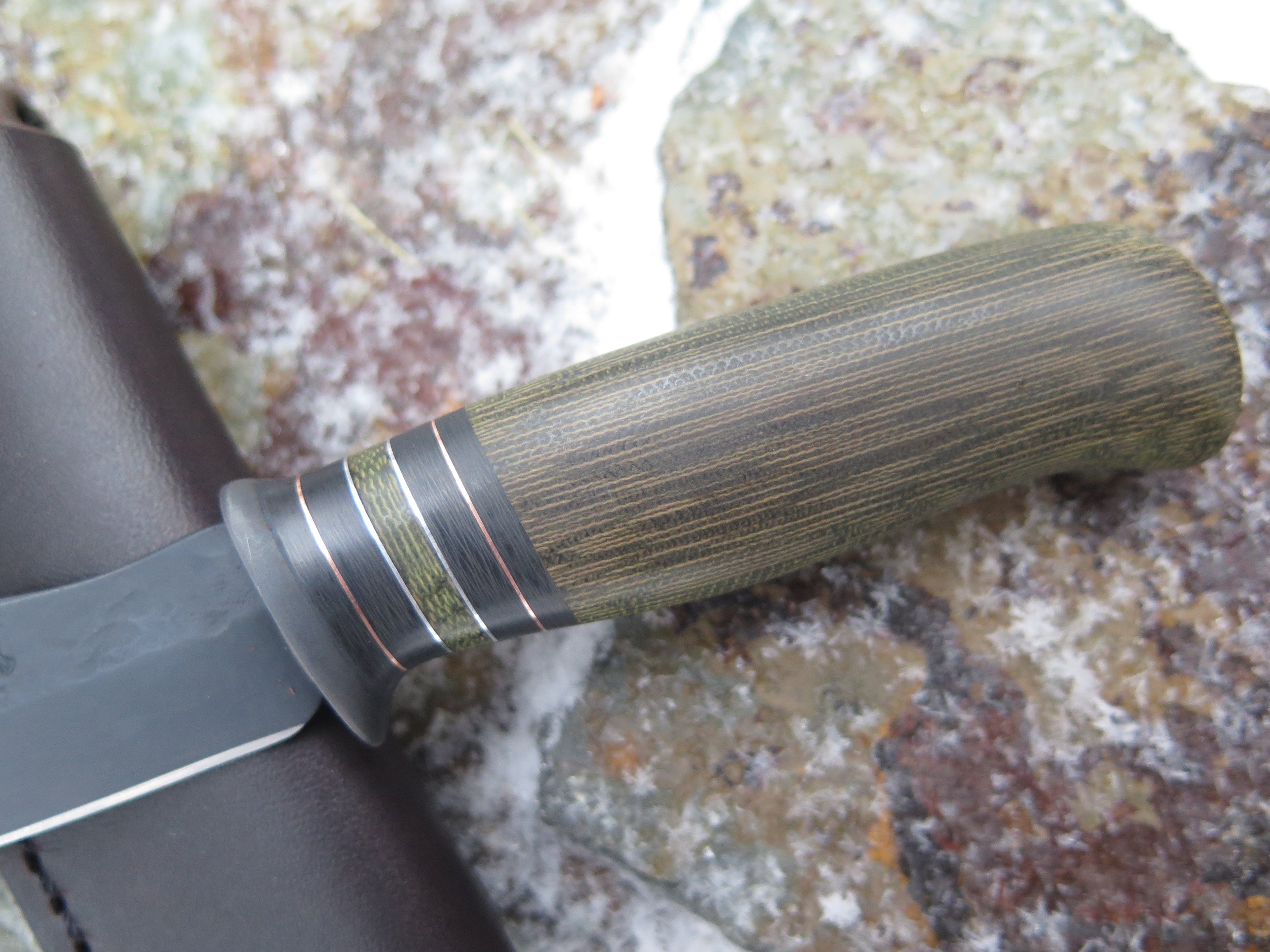 This sleek new modified Drop Point from Behring Made© is hand forged from 1/8" thick high carbon 01 tool steel and measures 3 1/4" from tip to guard with a razor sharp hollow grind, hammermarks and our forced patina blued finish. The blued steel guard is soldered in place above black fiber, copper, aluminum, carbon fiber and green micarta spacers as well as a green canvas micarta handle. The overall length measures 6 3/4" and it comes in the shown premium leather belt pouch sheath, though substitutions are available upon request.