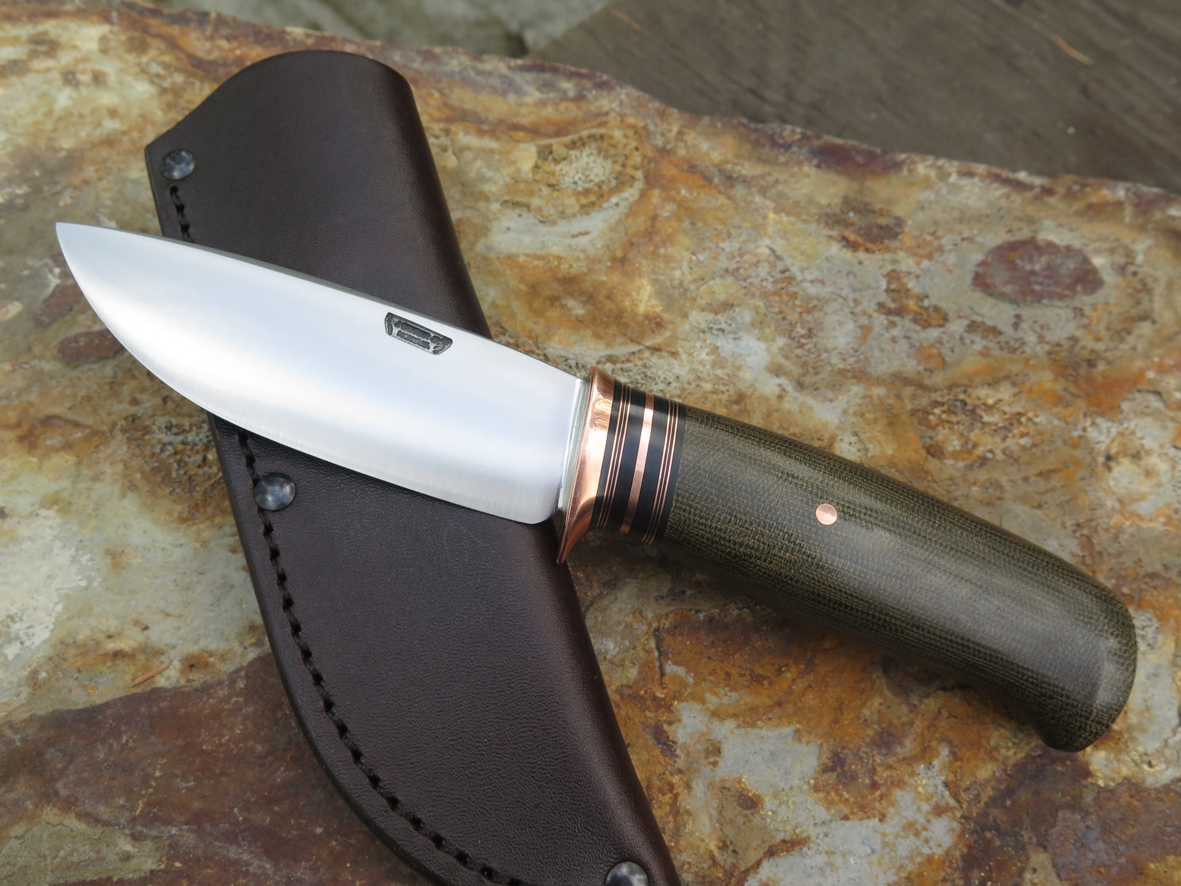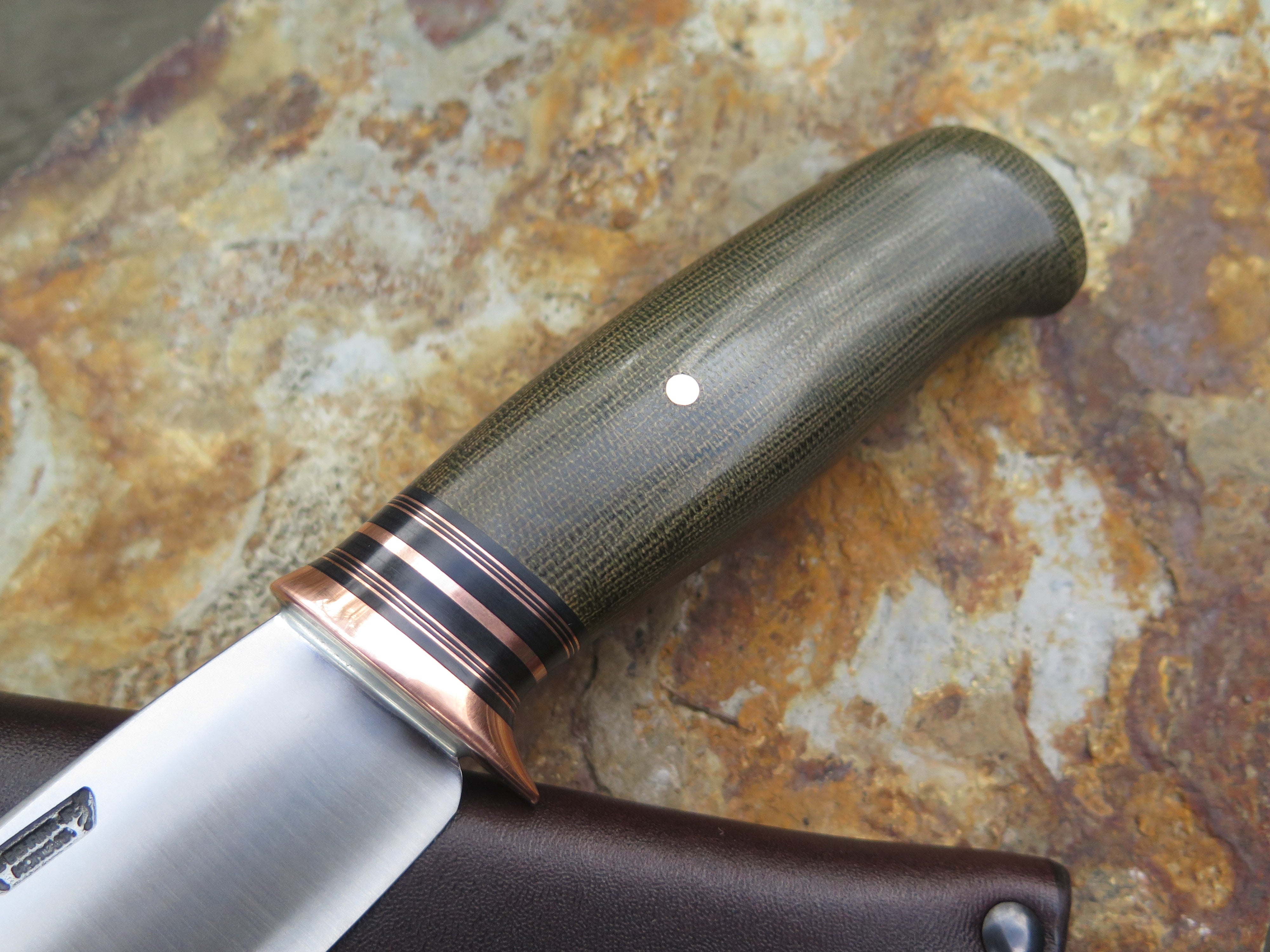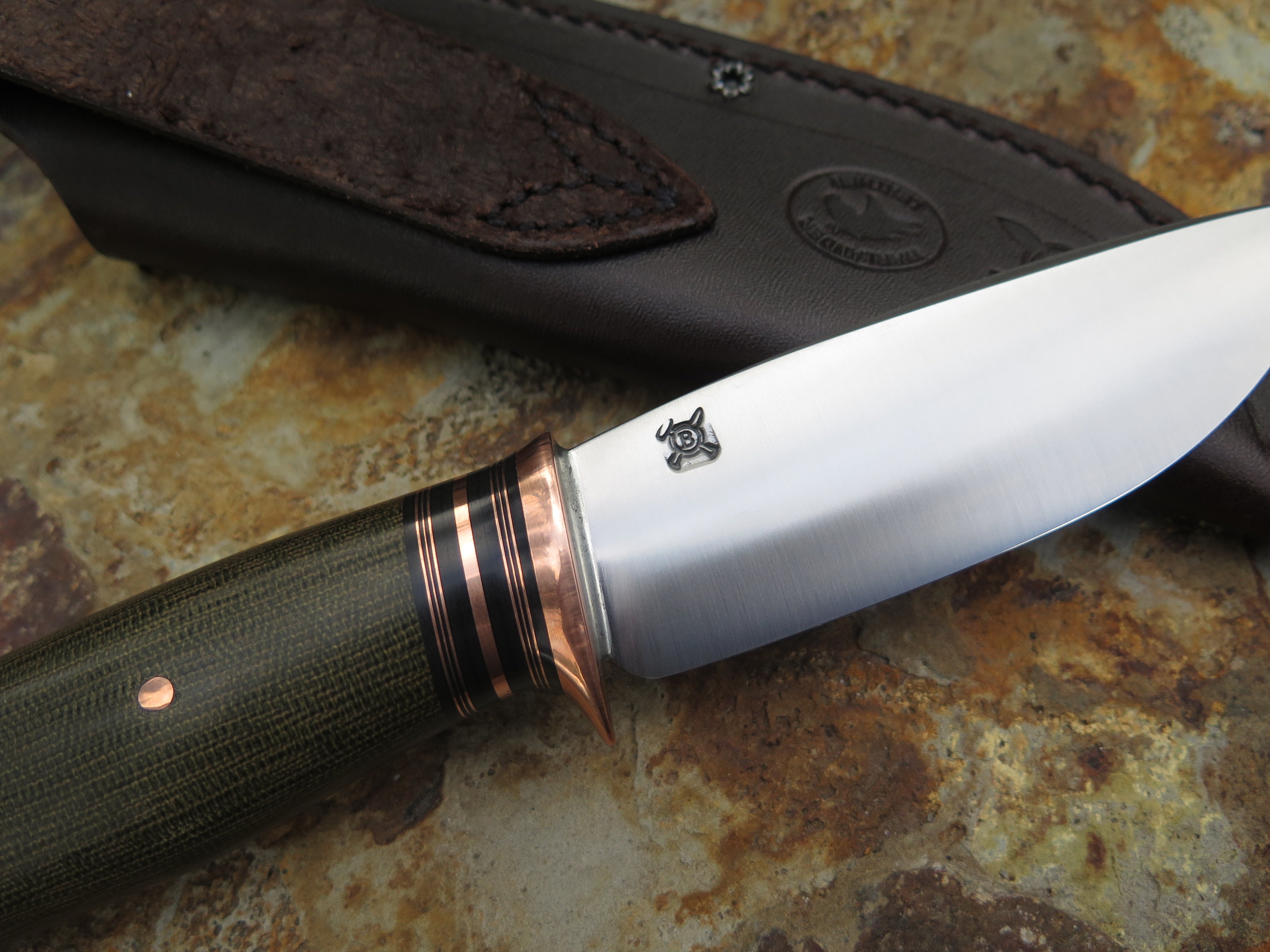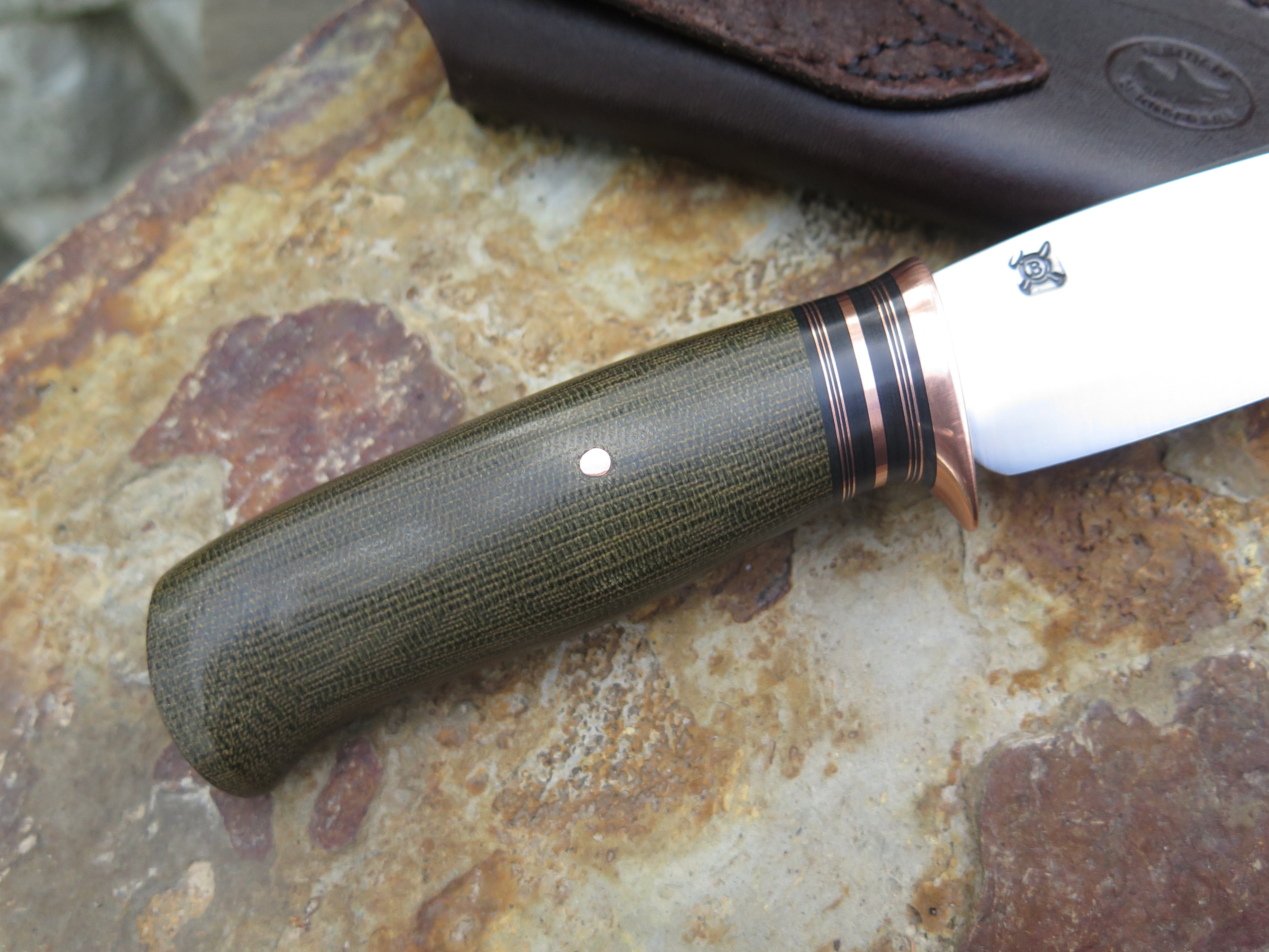 This ideal new Drop Point from Behring Made© is hand forged from 3/16" thick high carbon 01 tool steel and it measures 4 1/2" from tip to guard with a razor sharp convex grind. The copper guard is soldered to the tang above black fiber and copper spacers with a beautiful canvas micarta handle that's pinned through that tang with copper. Overall it measures 9" and it comes ready for the camp jobs in a classic leather belt pouch sheath.