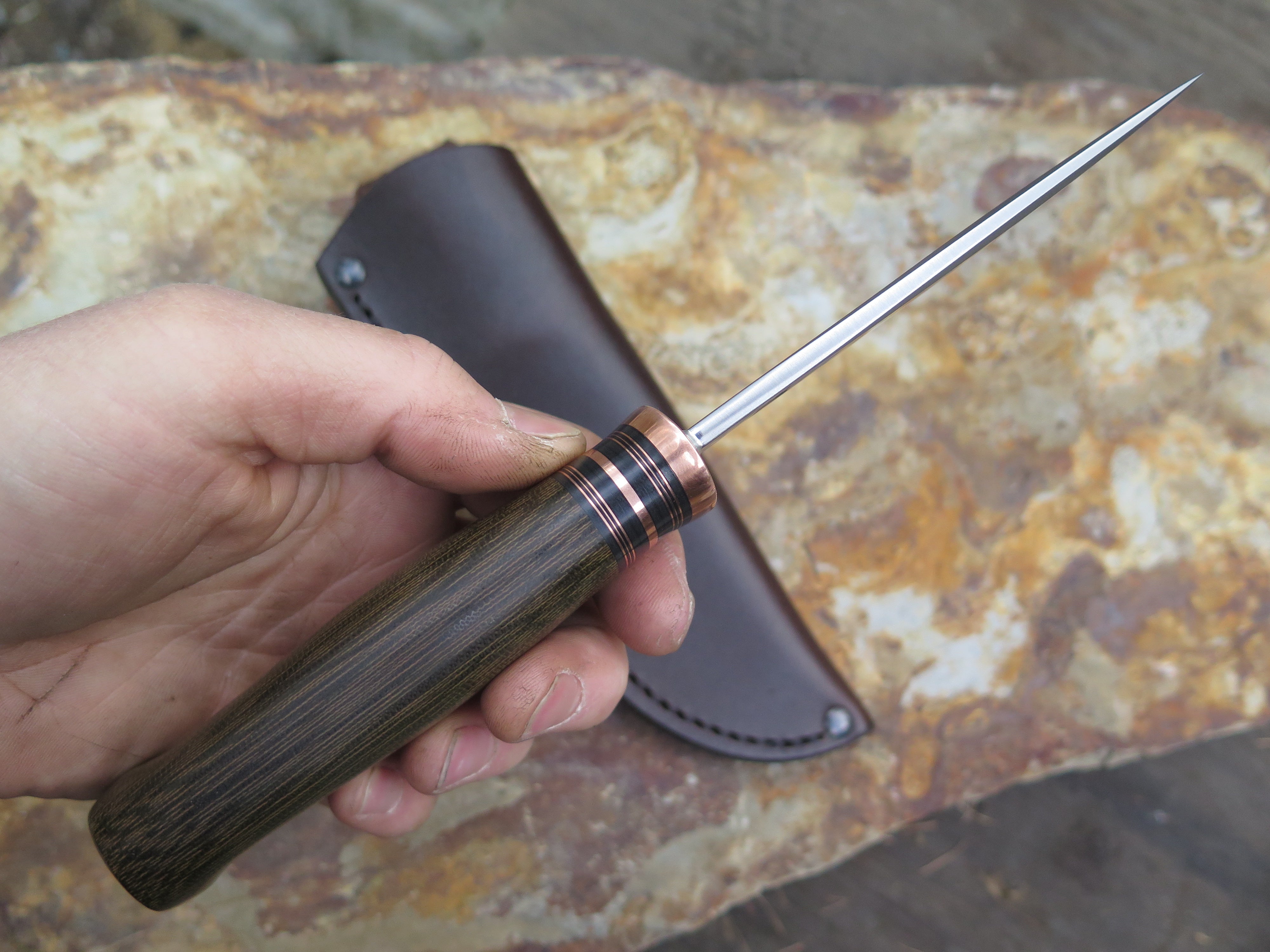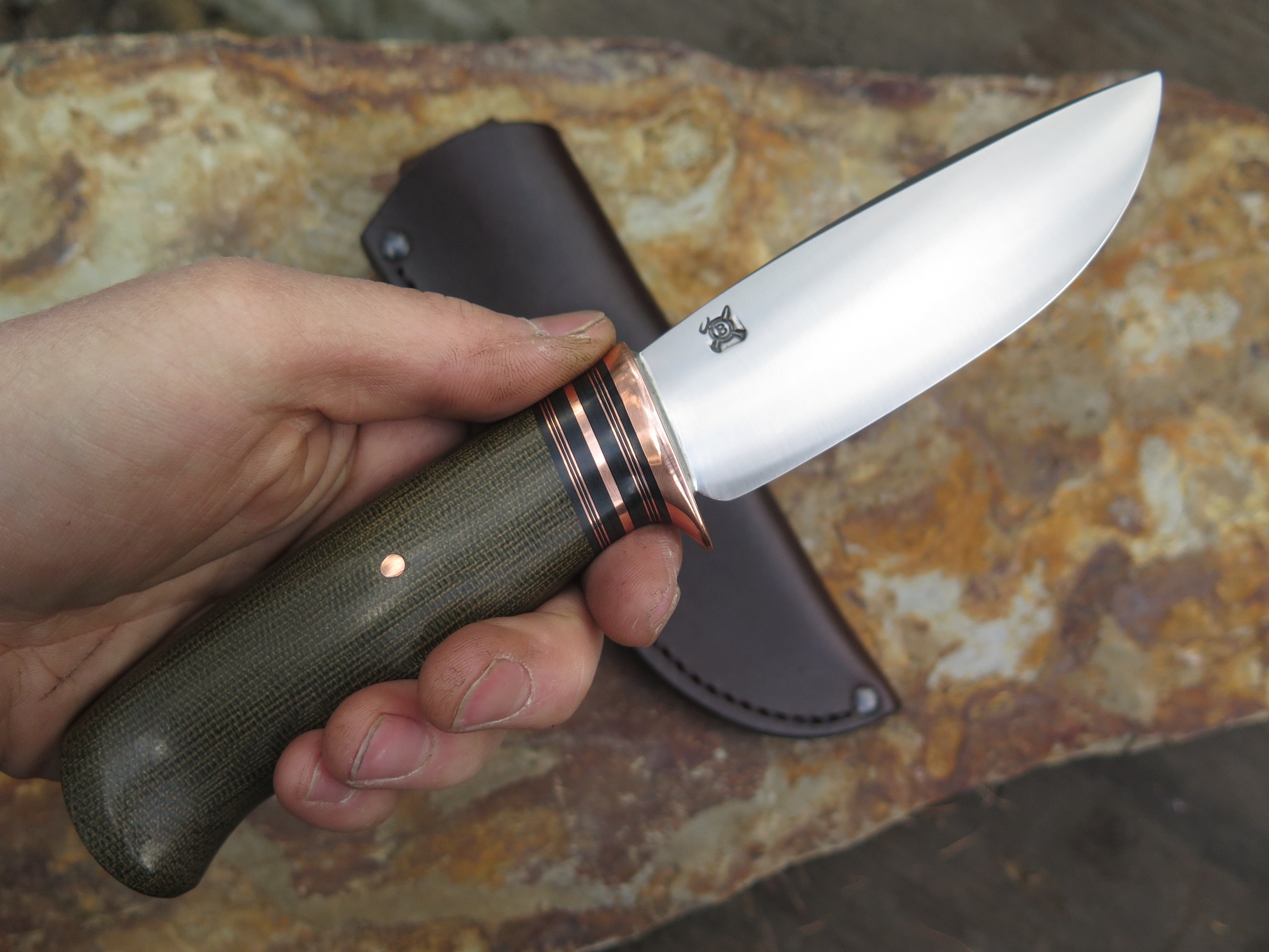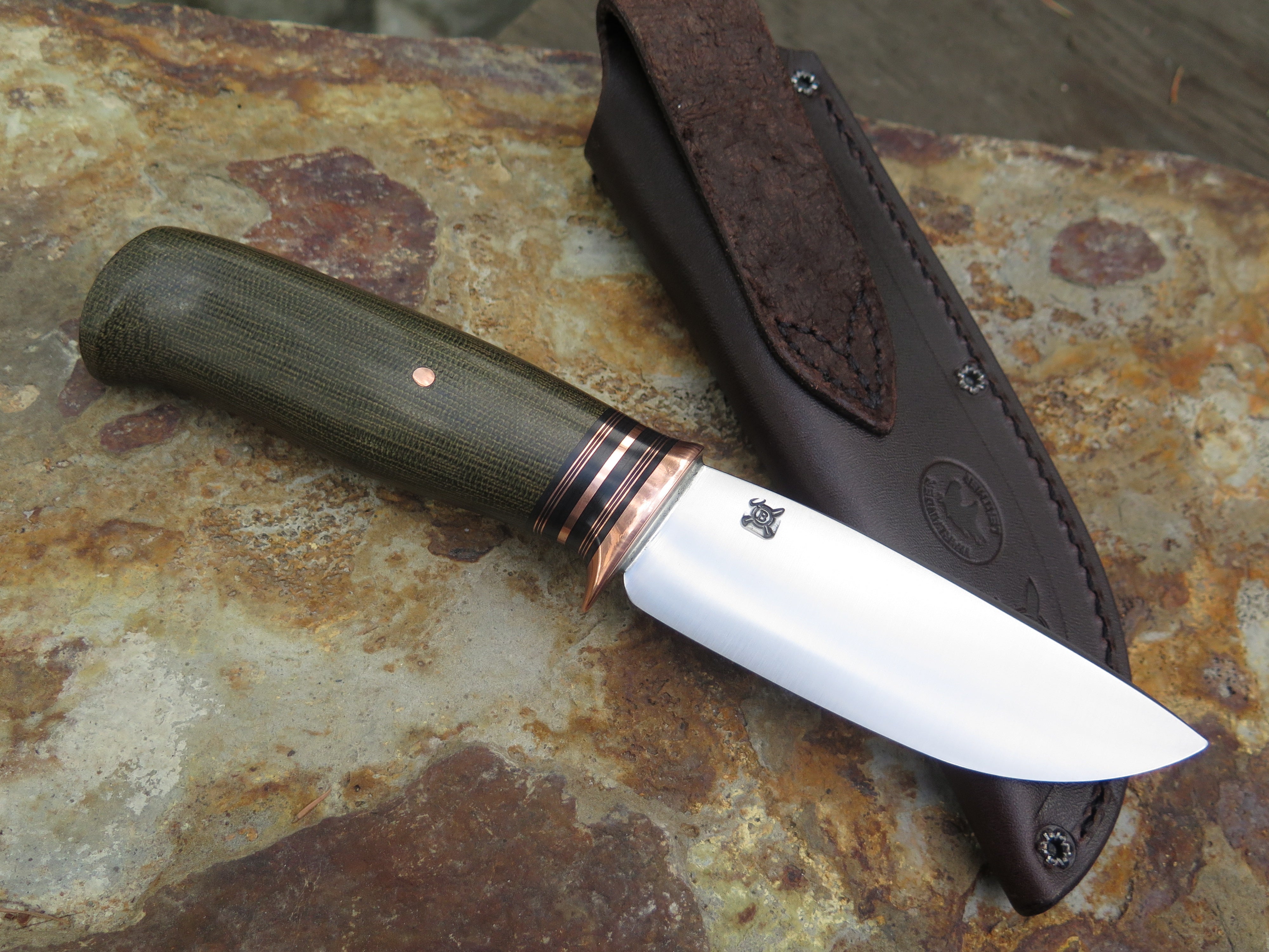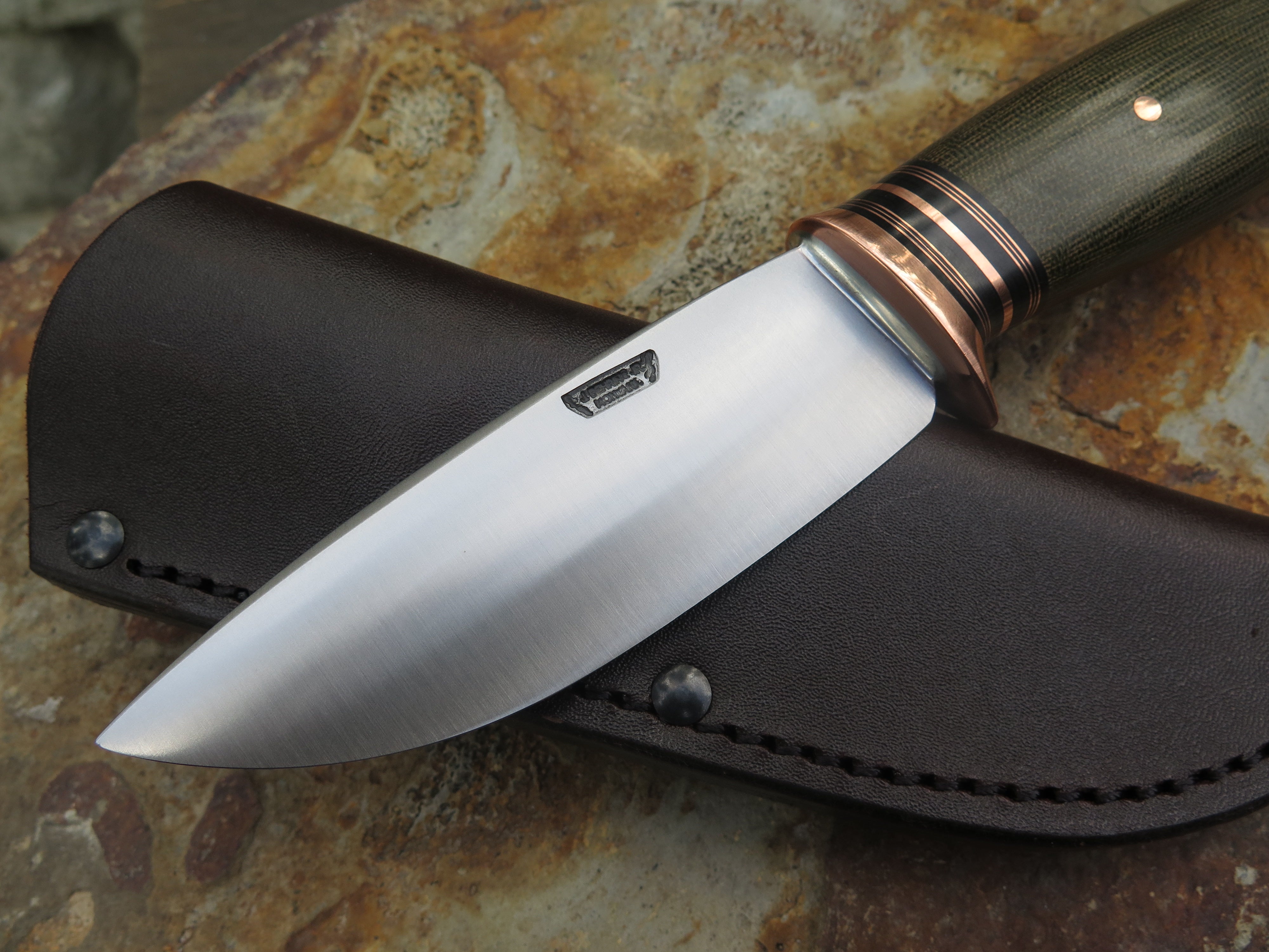 This ideal new Drop Point from Behring Made© is hand forged from 3/16" thick high carbon 01 tool steel and it measures 4 1/2" from tip to guard with a razor sharp convex grind. The copper guard is soldered to the tang above black fiber and copper spacers with a beautiful canvas micarta handle that's pinned through that tang with copper. Overall it measures 9" and it comes ready for the camp jobs in a classic leather belt pouch sheath.