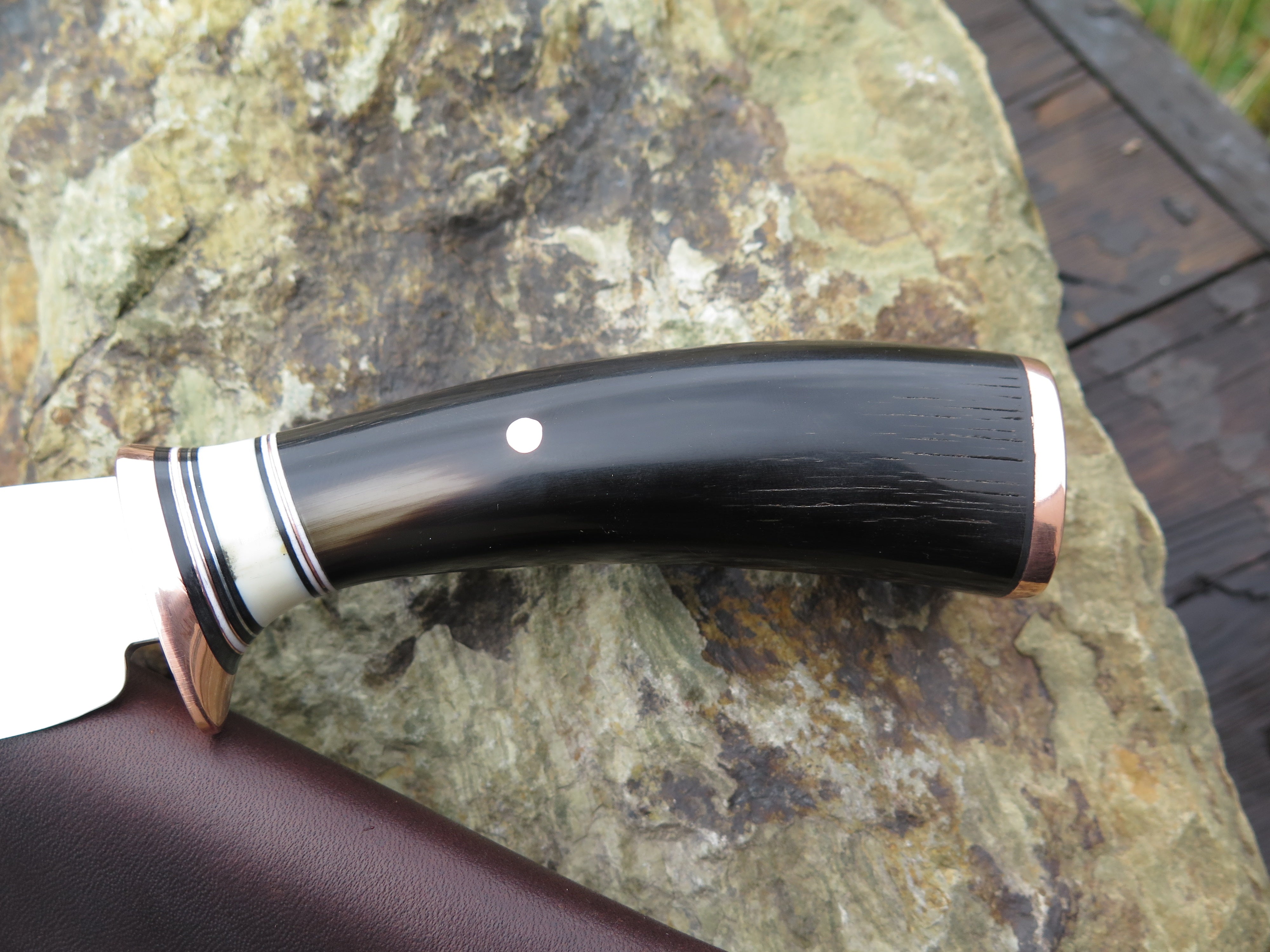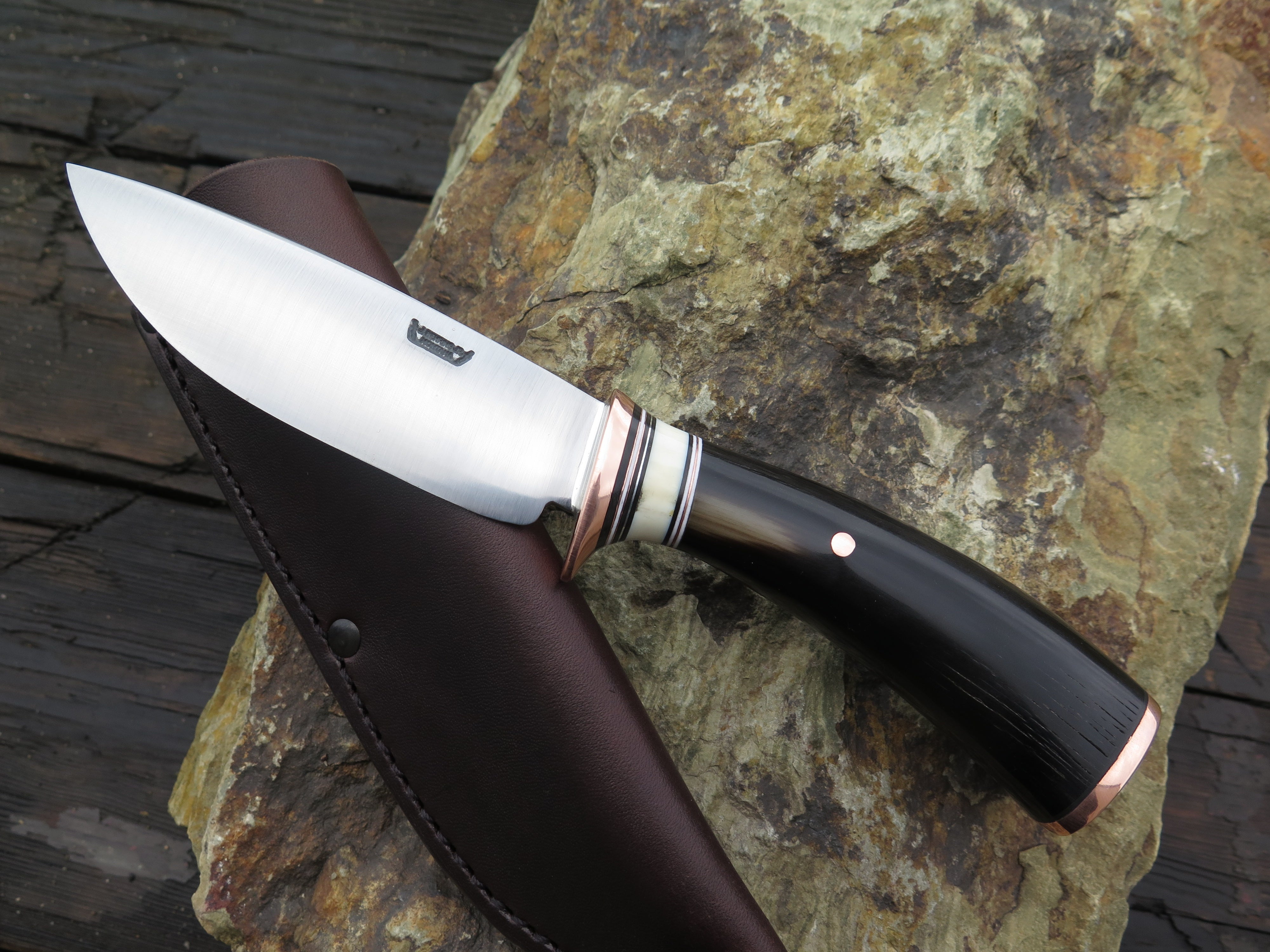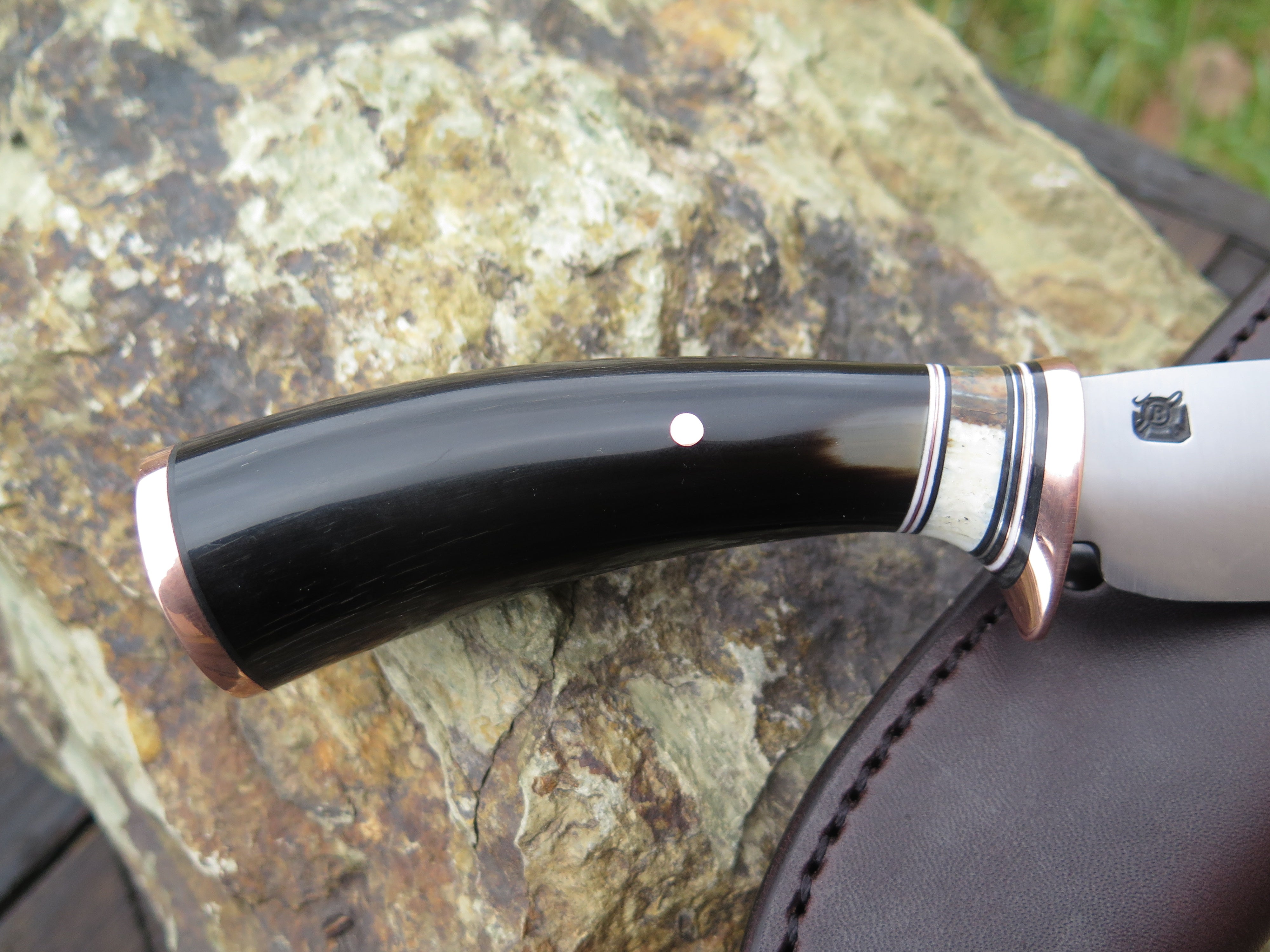 This incredible new Drop Point from Behring Made© is hand forged from 3/16" thick high carbon 01 tool steel and it measures 4 1/2" from tip to guard with a razor sharp convex grind. The copper guard is soldered in place above black fiber, copper and fossil walrus ivory spacers as well as a premium kudu horn handle that's both pinned through the tang and capped with copper. The overall length measures 9 1/8" and we've it coming in a Warlander Leather belt pouch sheath.