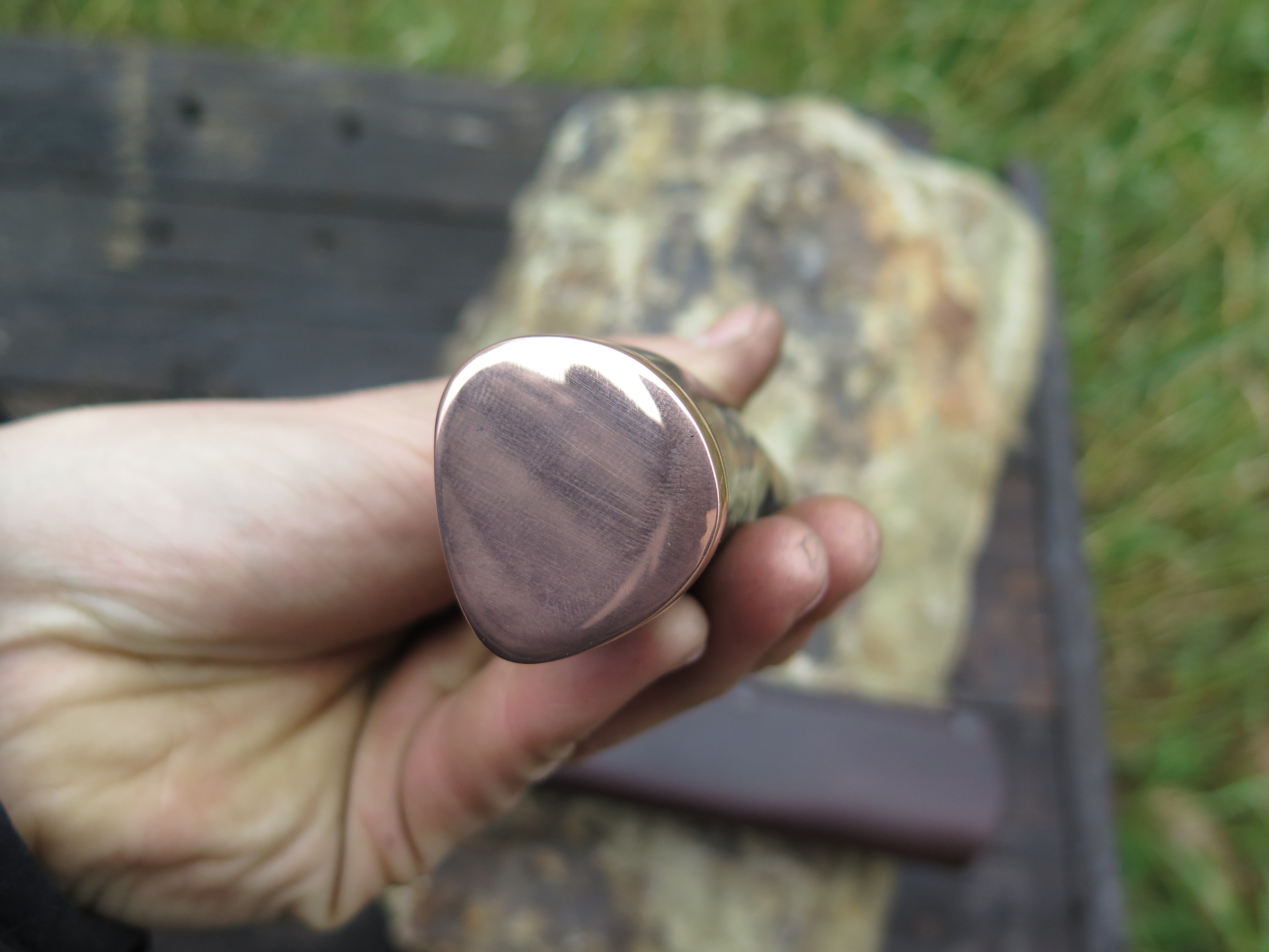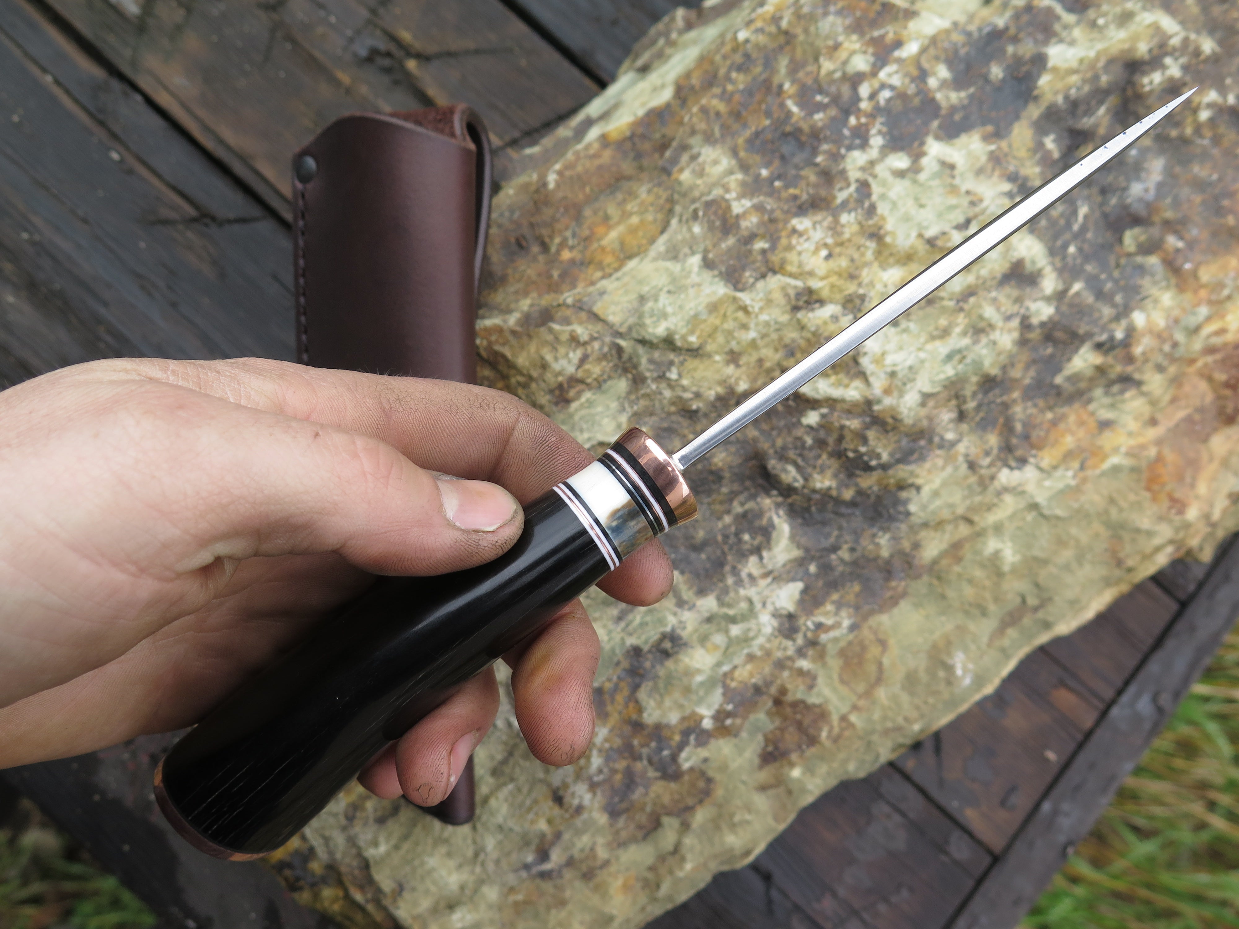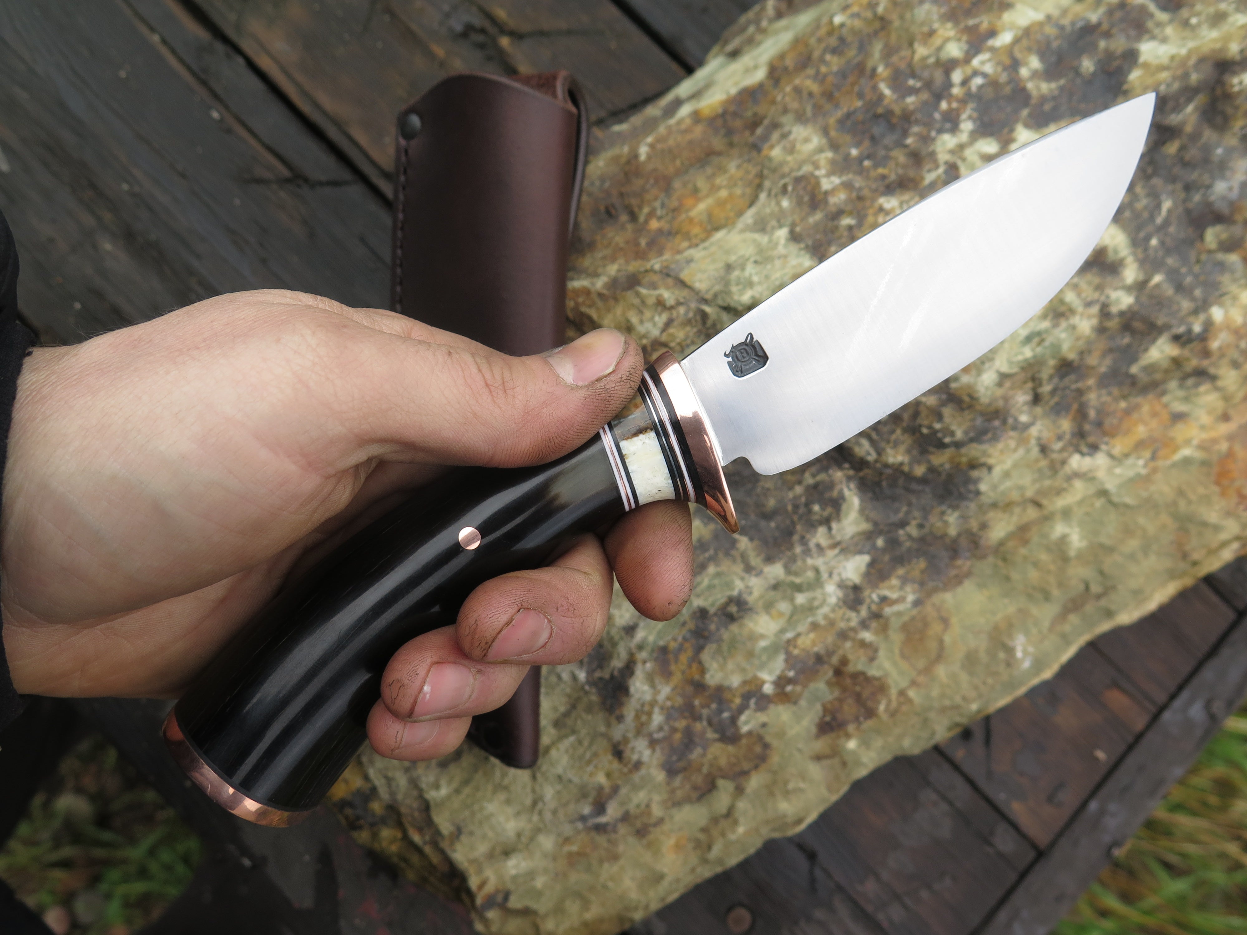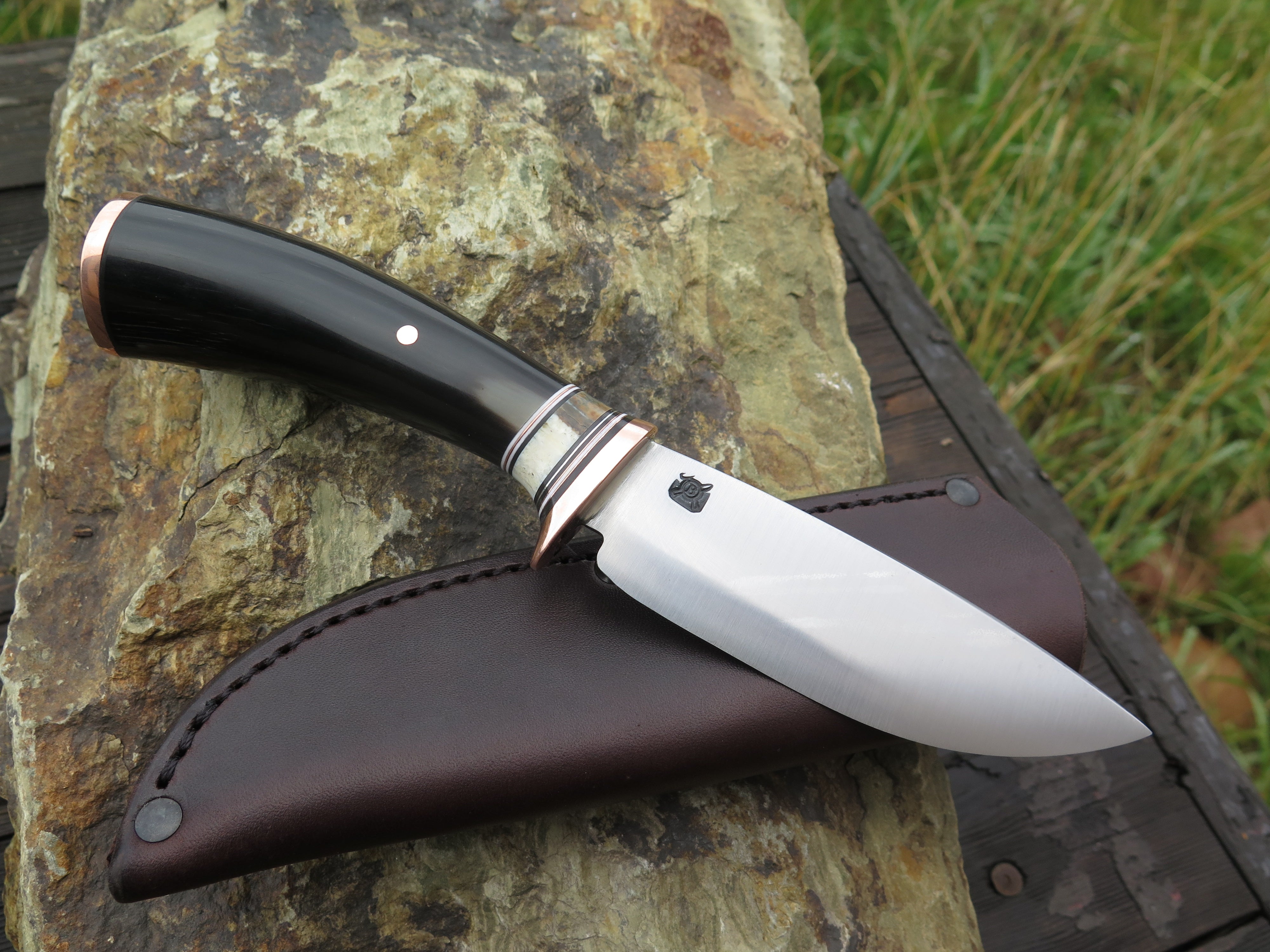 This incredible new Drop Point from Behring Made© is hand forged from 3/16" thick high carbon 01 tool steel and it measures 4 1/2" from tip to guard with a razor sharp convex grind. The copper guard is soldered in place above black fiber, copper and fossil walrus ivory spacers as well as a premium kudu horn handle that's both pinned through the tang and capped with copper. The overall length measures 9 1/8" and we've it coming in a Warlander Leather belt pouch sheath.
