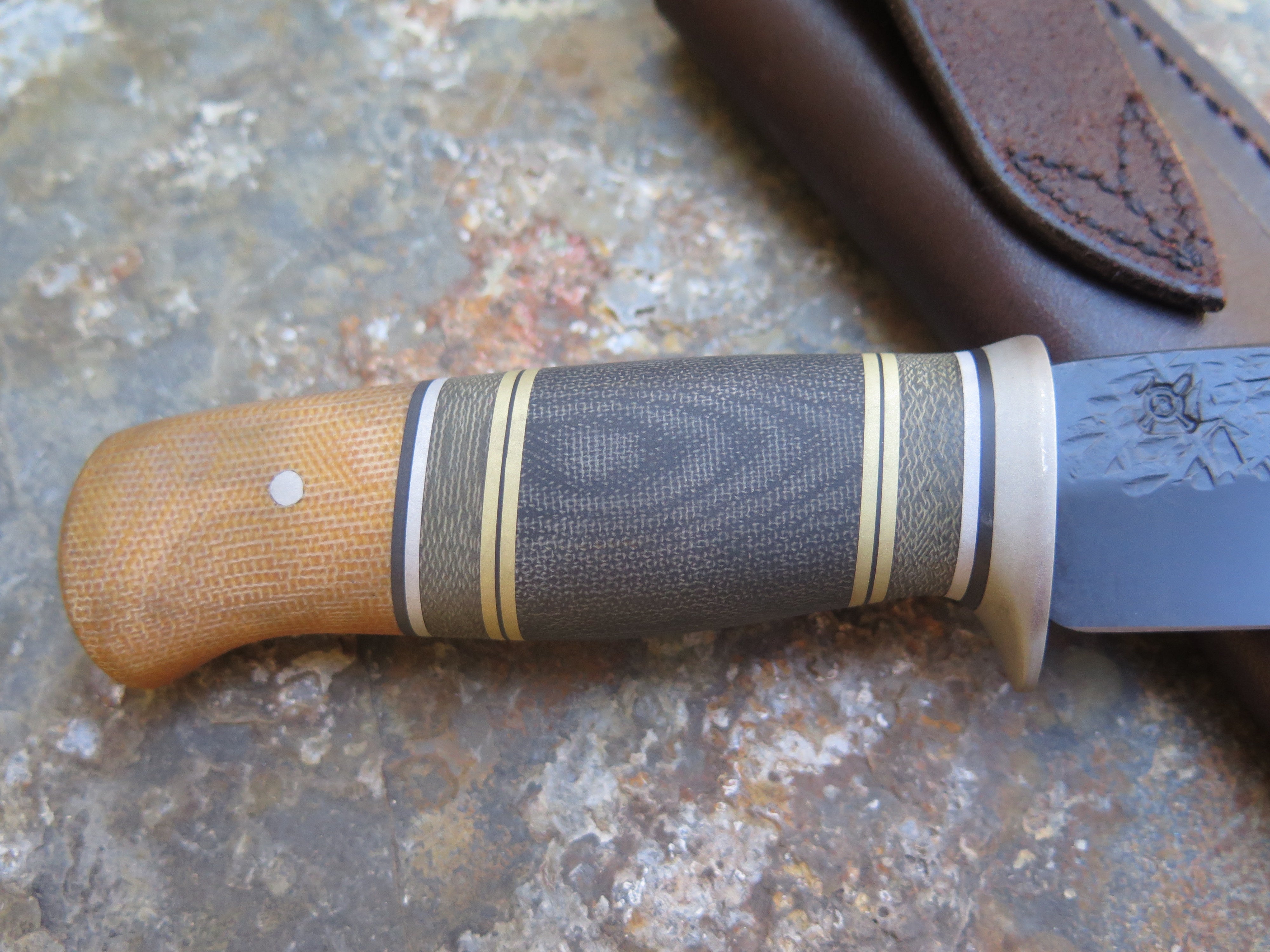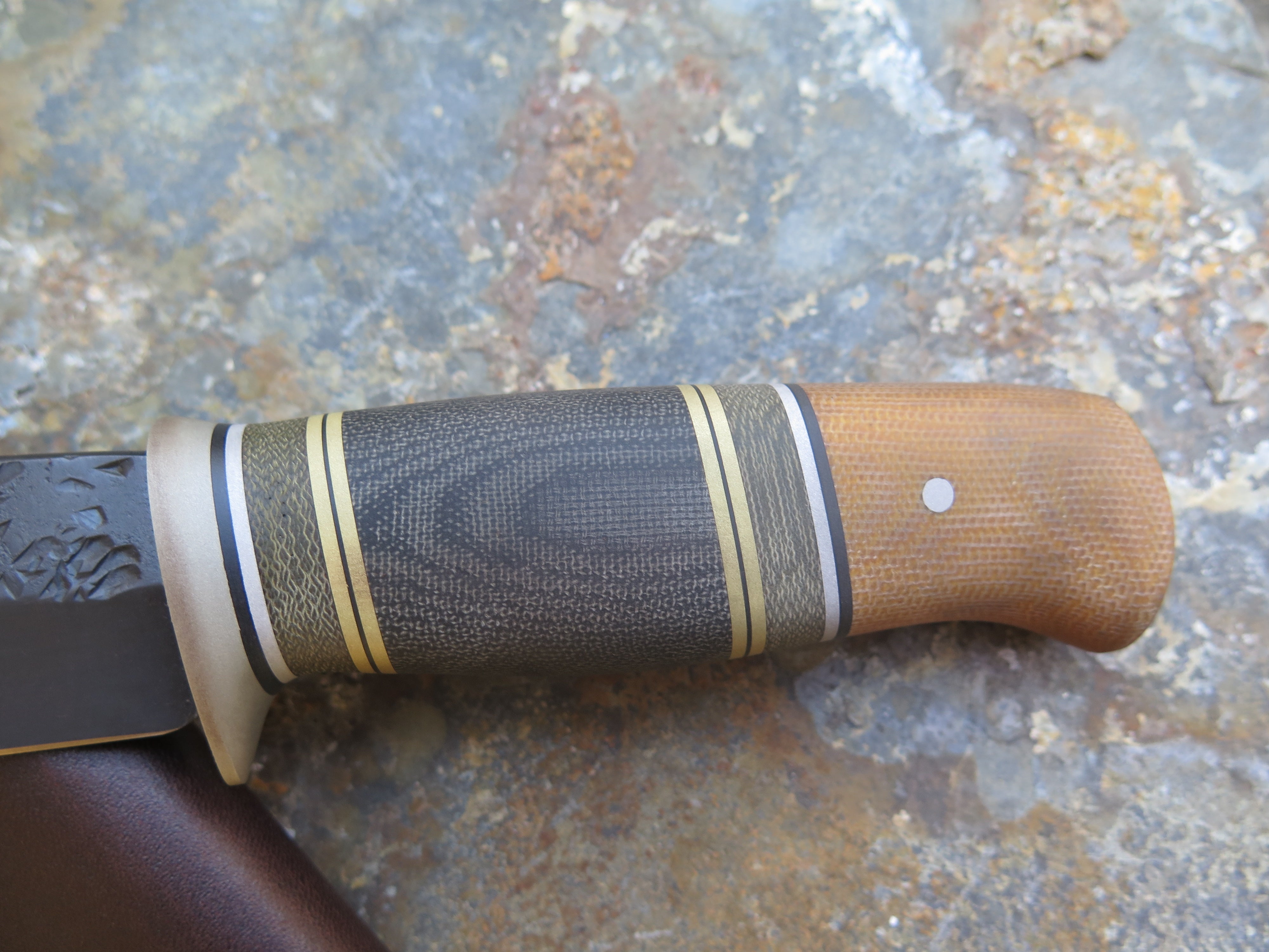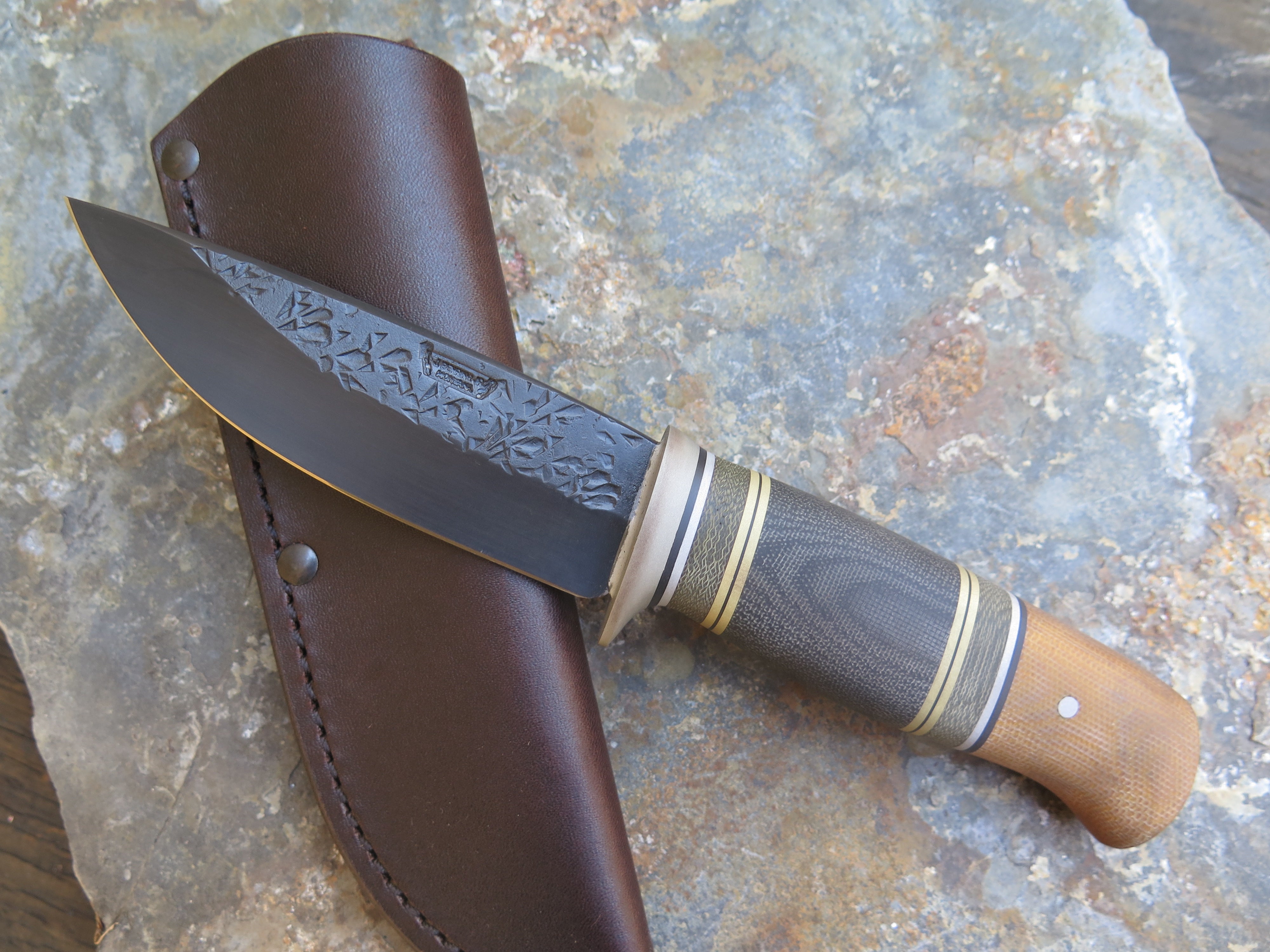 This incredible new Drop Point from Behring Made© is hand forged from 3/16" thick high carbon 01 tool steel and it measures 4 1/2" from tip to guard with a razor sharp hollow grind, hammermarks and our forced patina blued finish. The nickel silver guard is soldered in place above a handle construction of black fiber, aluminum, brass, green micarta, black micarta and natural canvas micarta which is pinned with aluminum. The handle features a bead blasted finish and measures 9" overall, and it comes in a classic leather belt pouch sheath.