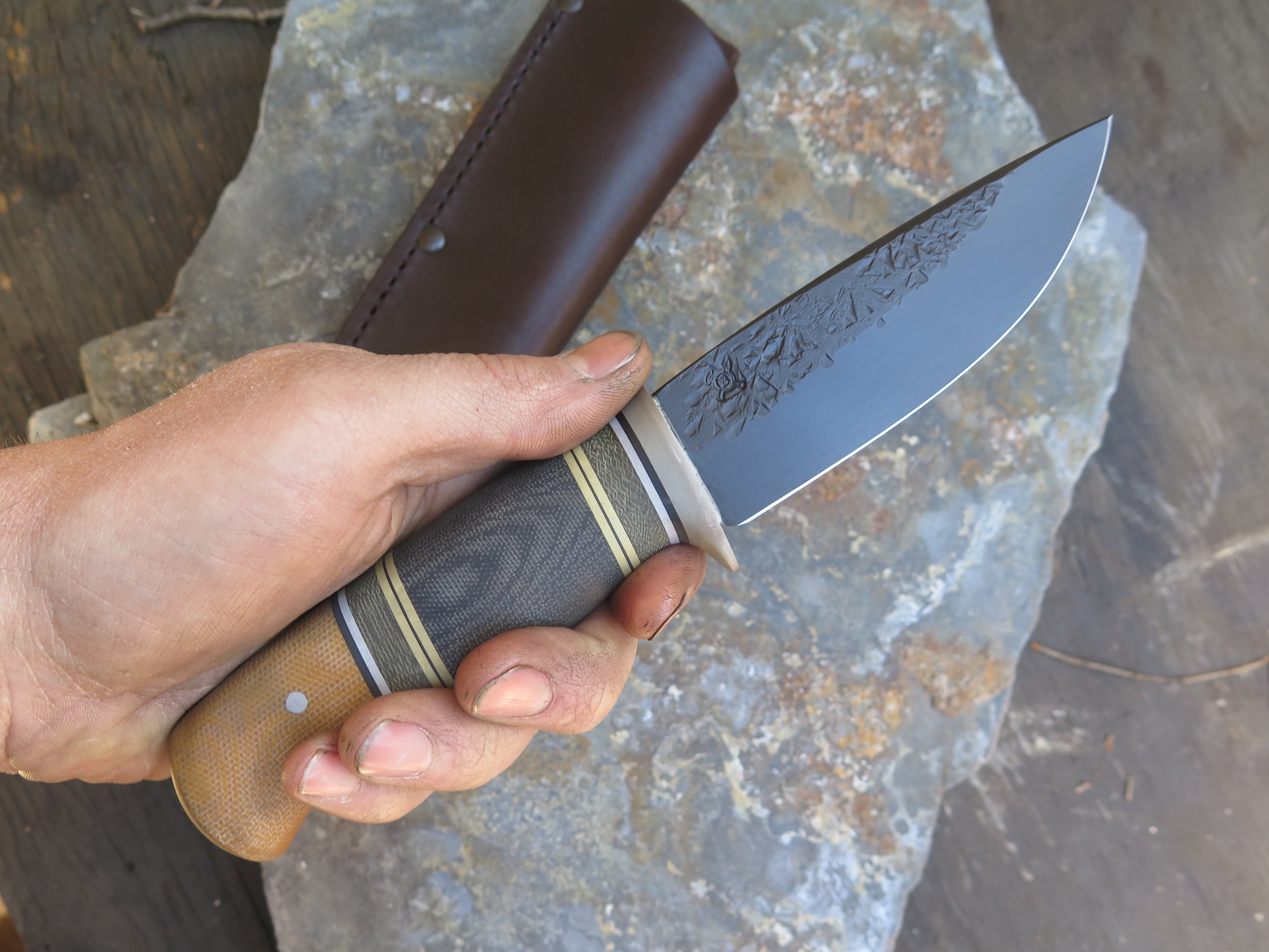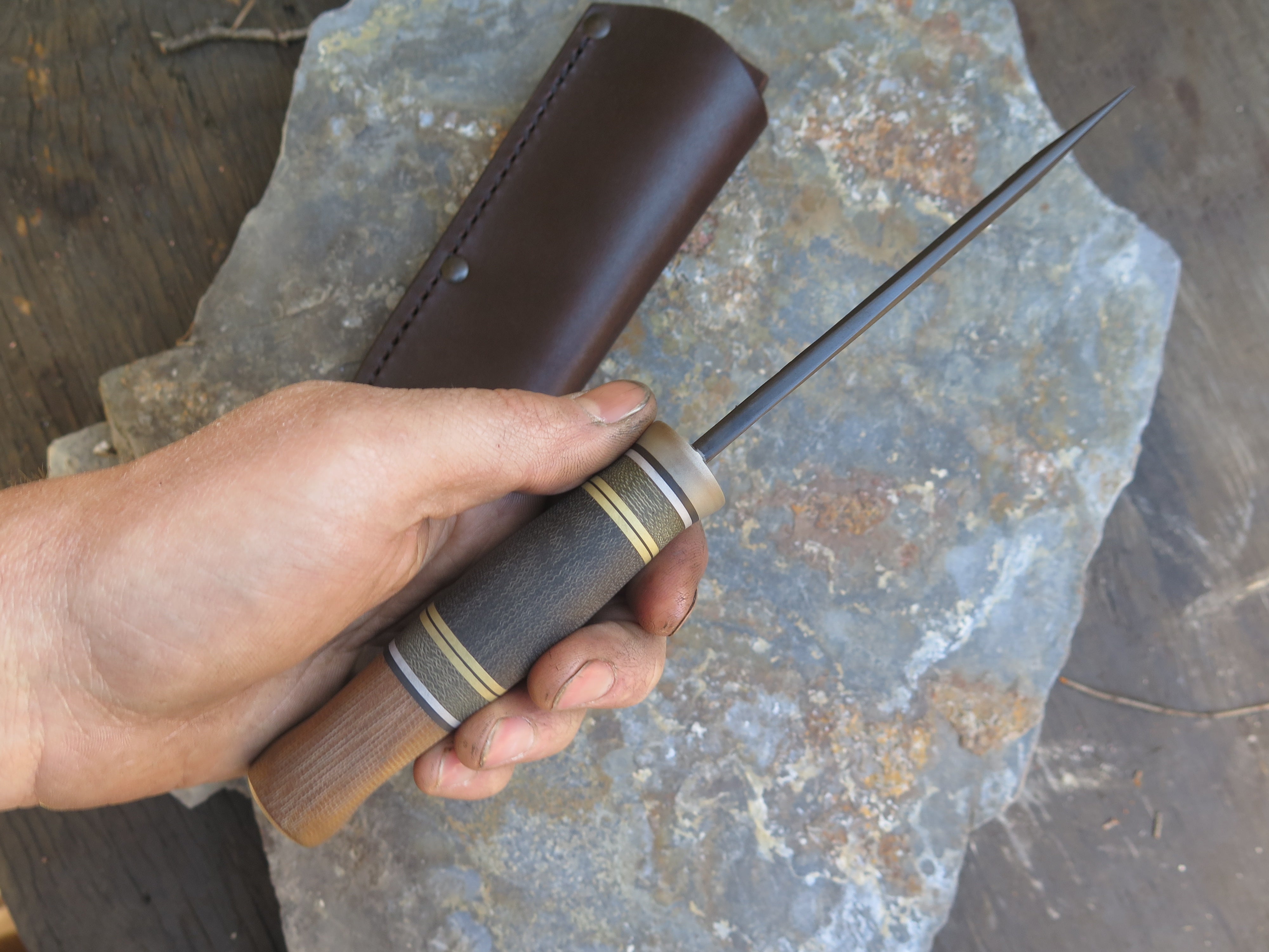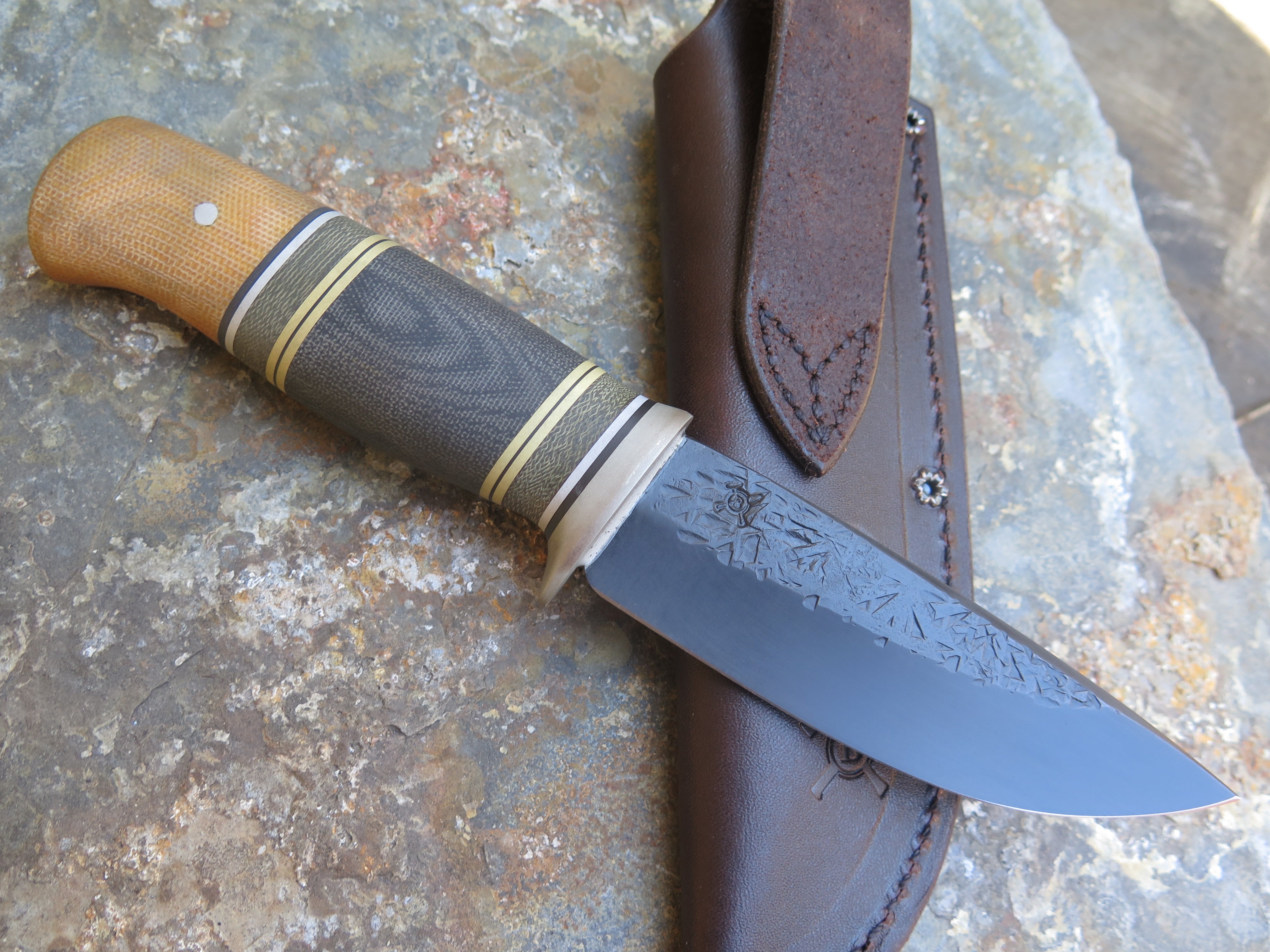 This incredible new Drop Point from Behring Made© is hand forged from 3/16" thick high carbon 01 tool steel and it measures 4 1/2" from tip to guard with a razor sharp hollow grind, hammermarks and our forced patina blued finish. The nickel silver guard is soldered in place above a handle construction of black fiber, aluminum, brass, green micarta, black micarta and natural canvas micarta which is pinned with aluminum. The handle features a bead blasted finish and measures 9" overall, and it comes in a classic leather belt pouch sheath.