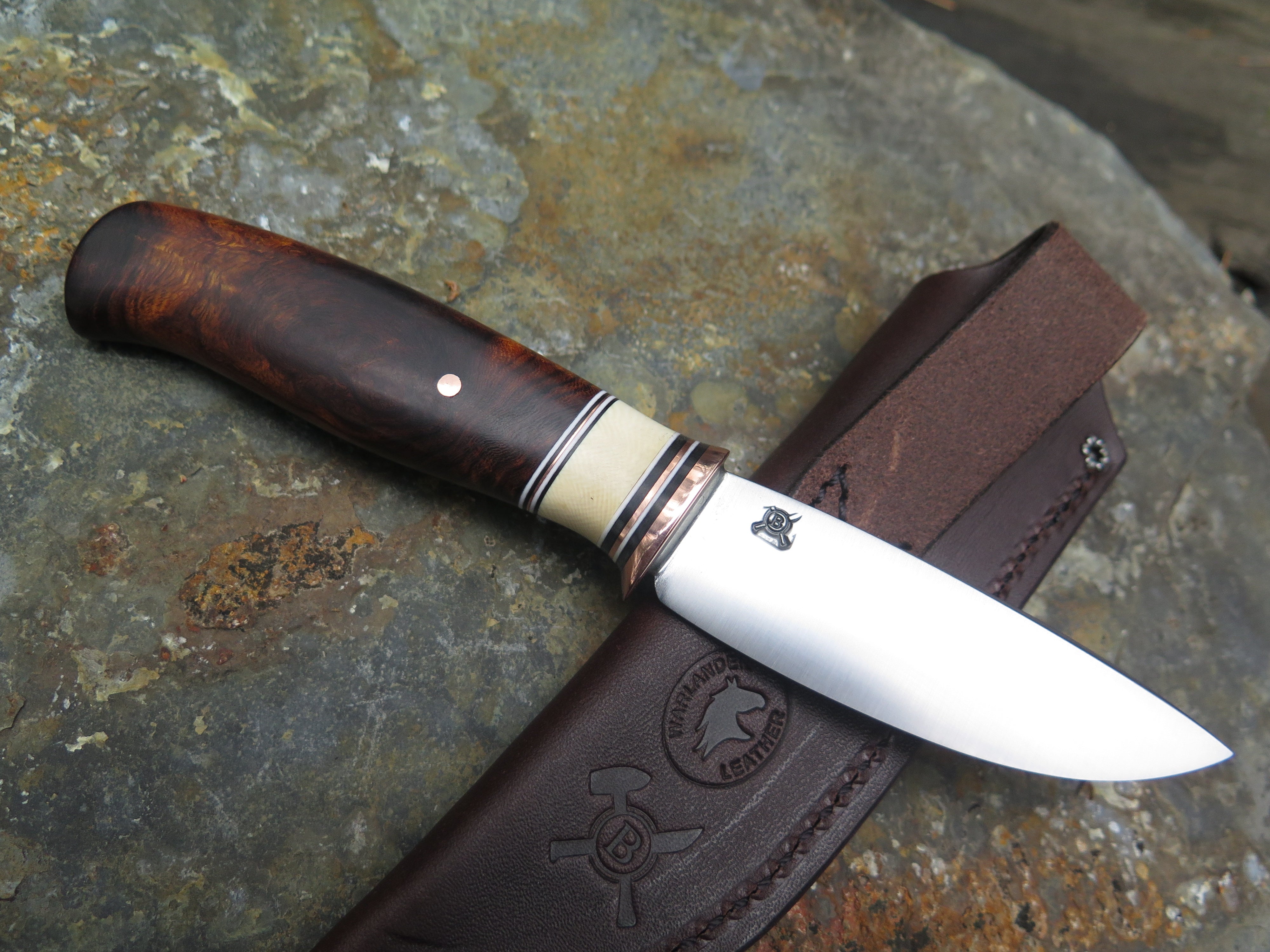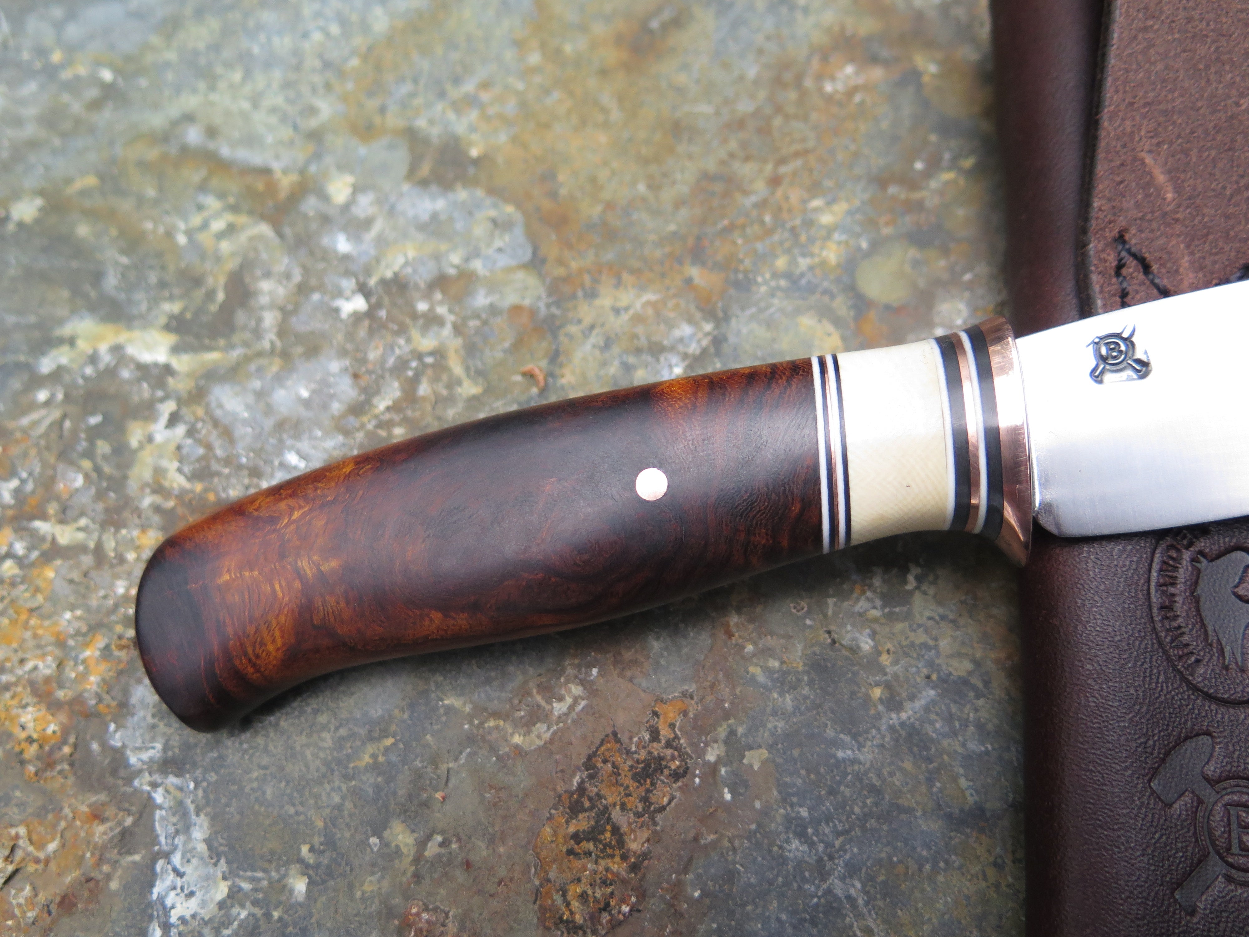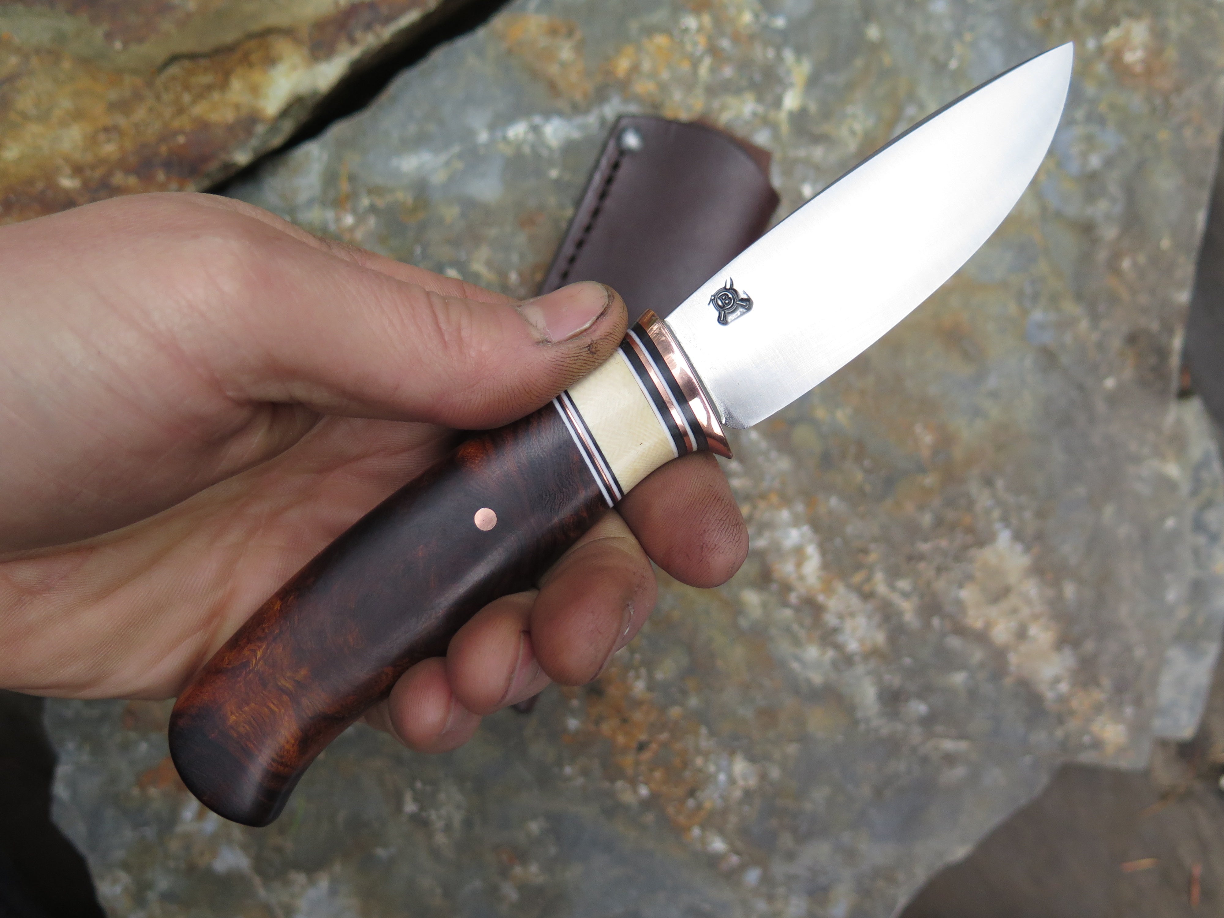 This beautiful new Drop Point from Behring Made© is hand forged from 1/8" thick high carbon 01 tool steel and it measures 3 1/2" from tip to guard with a razor sharp convex grind. The copper guard is soldered in place above black and white fiber, copper and ancient mammoth ivory spacers as well as a premium desert ironwood burl handle that's pinned through the tang with copper. The overall length measures 7 5/8" and it comes in a classic leather belt pouch sheath.