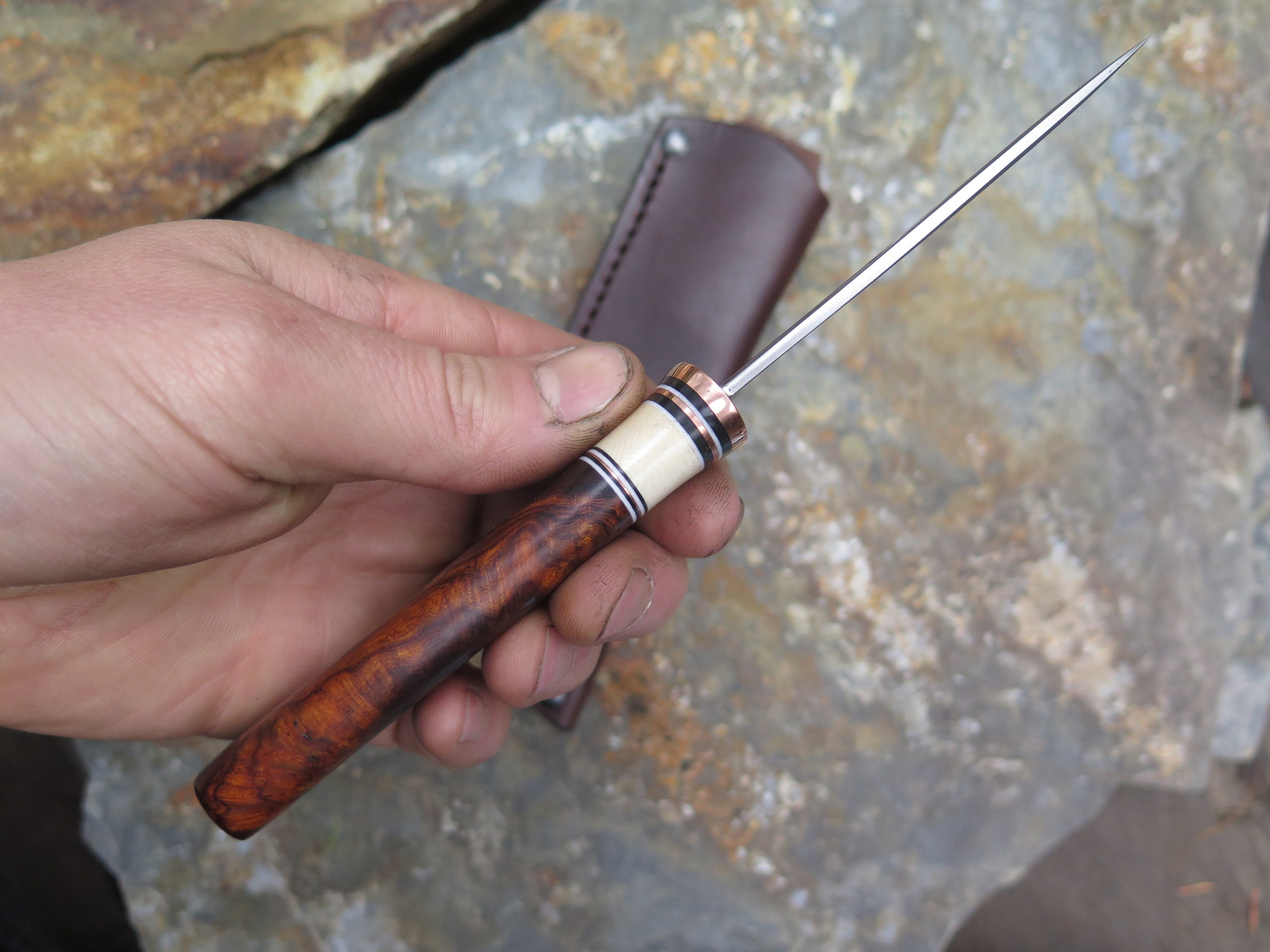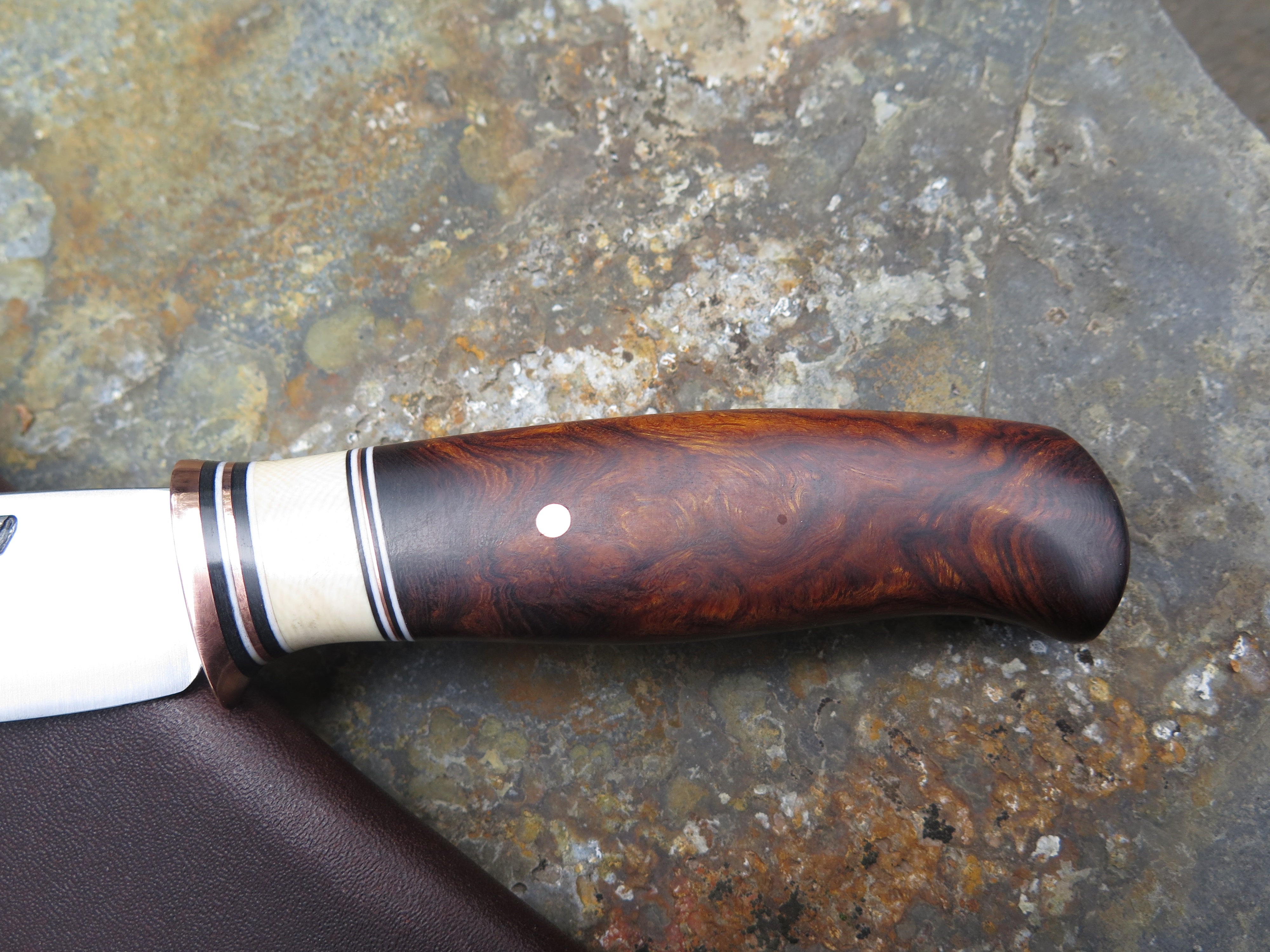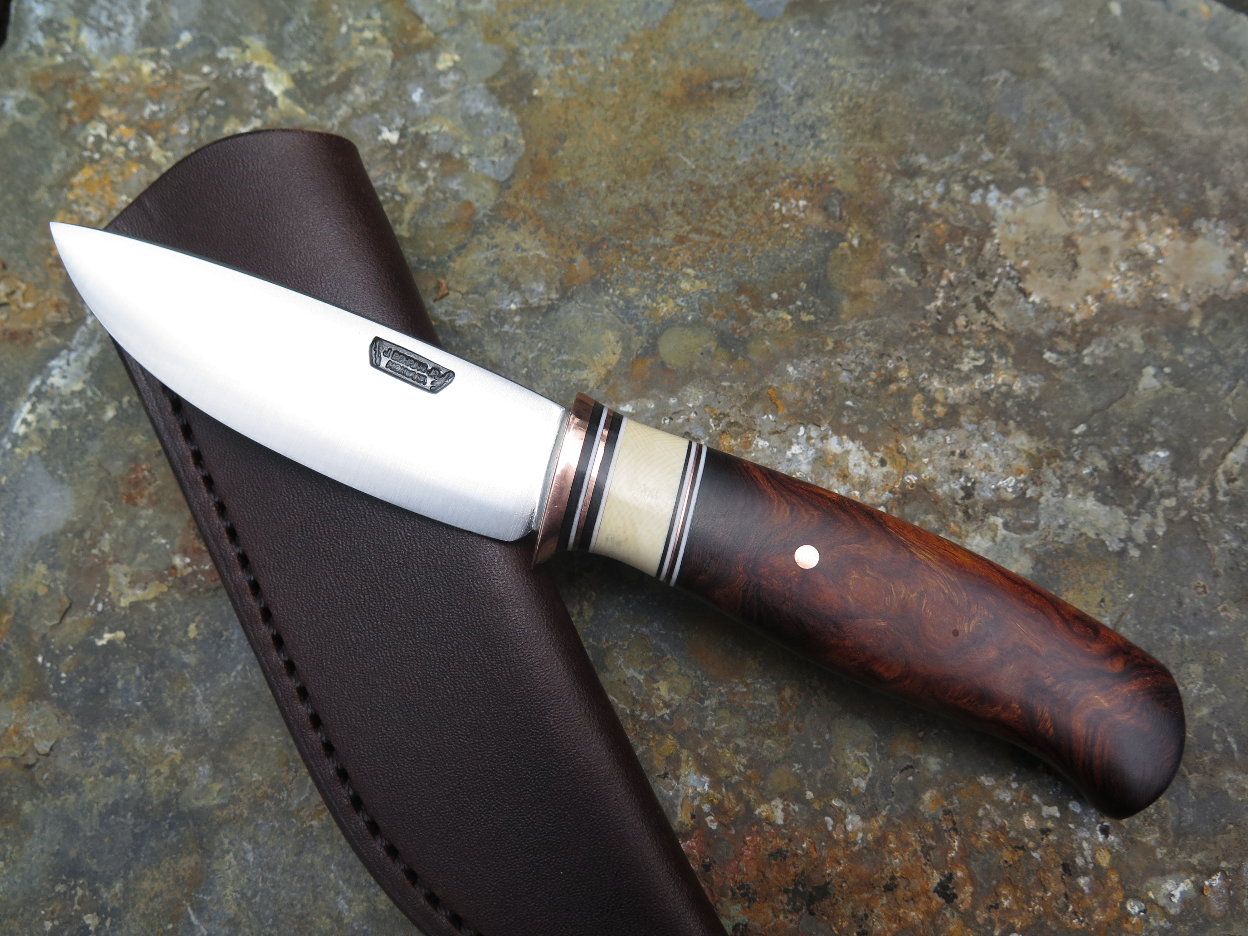 This beautiful new Drop Point from Behring Made© is hand forged from 1/8" thick high carbon 01 tool steel and it measures 3 1/2" from tip to guard with a razor sharp convex grind. The copper guard is soldered in place above black and white fiber, copper and ancient mammoth ivory spacers as well as a premium desert ironwood burl handle that's pinned through the tang with copper. The overall length measures 7 5/8" and it comes in a classic leather belt pouch sheath.