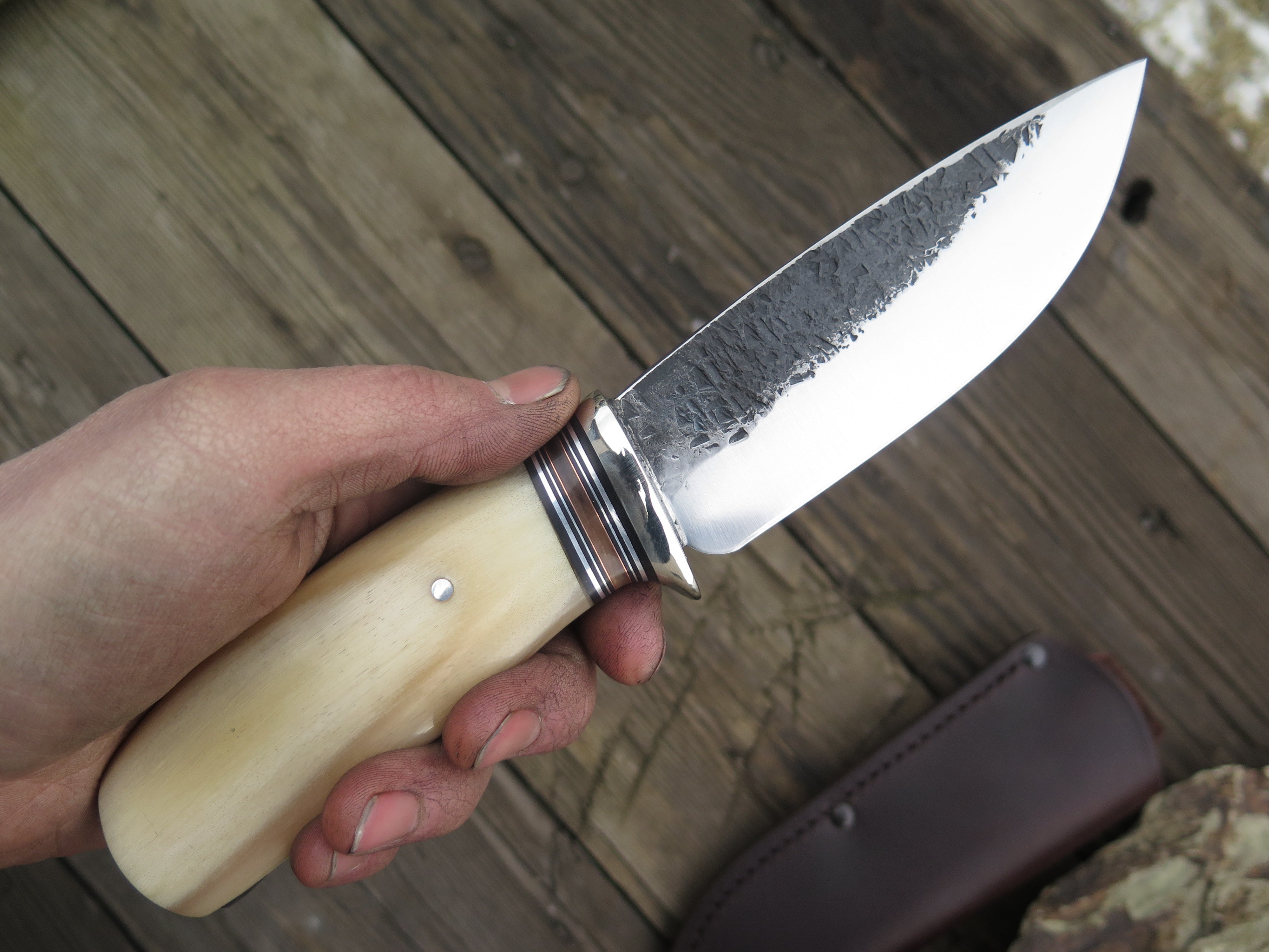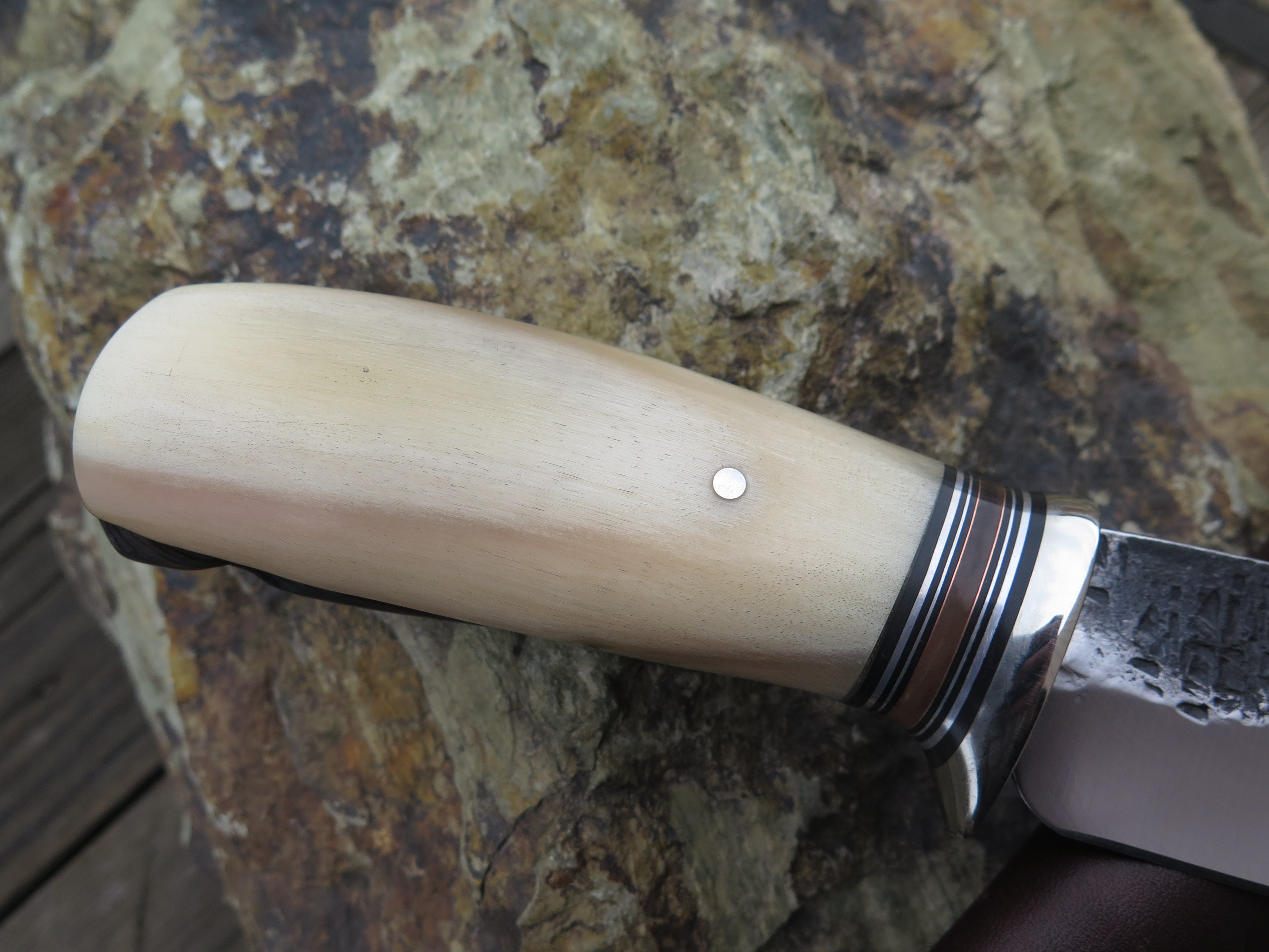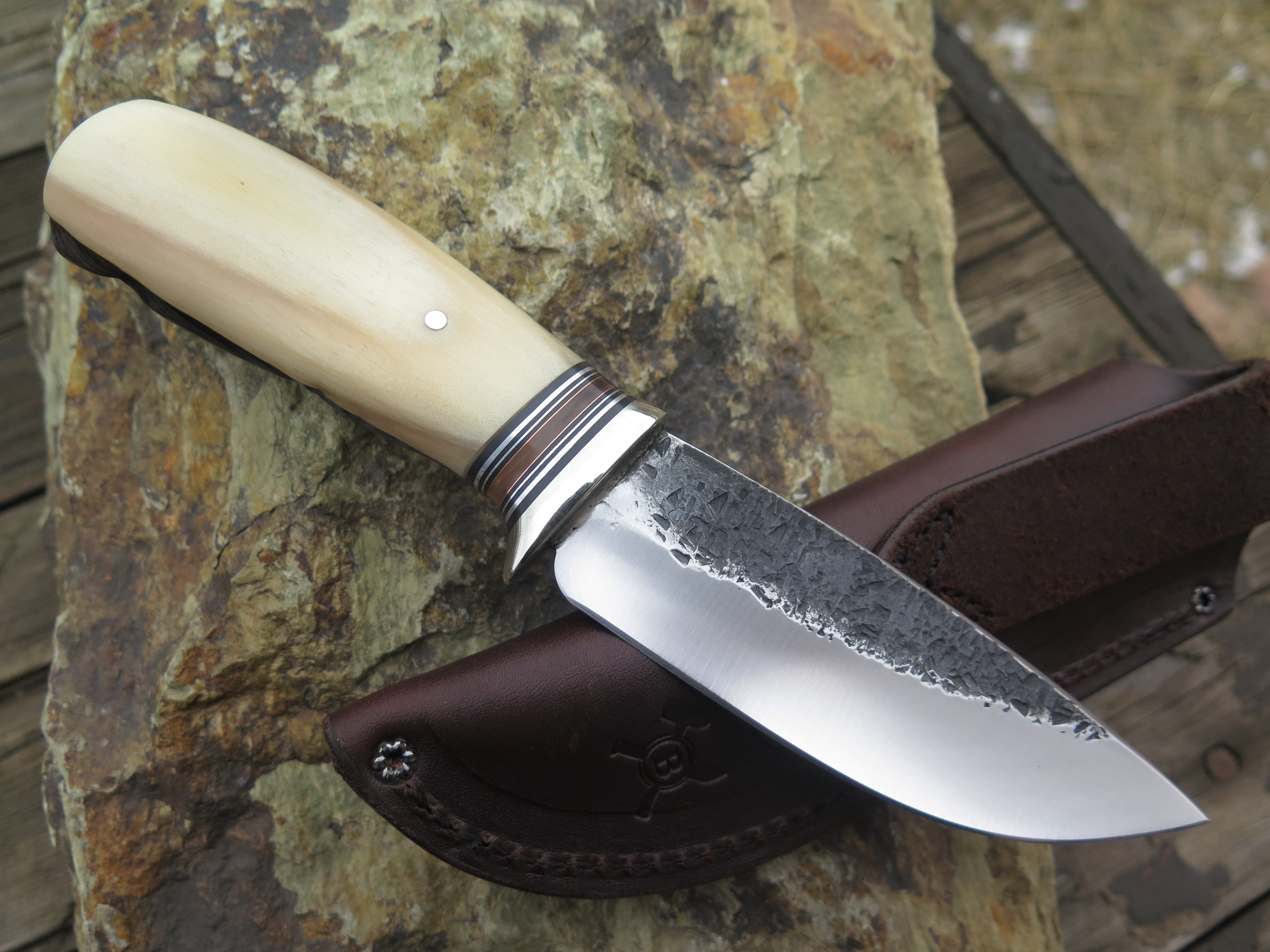 This outstanding new Drop Point from Behring Made© is hand forged from 3/16" thick high carbon 01 tool steel and it measures 5" from tip to guard with a razor sharp hollow grind and our hammermark finish. The nickel silver guard is soldered in place above black fiber, aluminum and premium fossil walrus ivory spacers in addition to a premium Dall's sheep horn handle that we pinned through the tang with aluminum. The overall length measures 9 3/8" and it comes in a classic Warlander Leather pouch sheath.