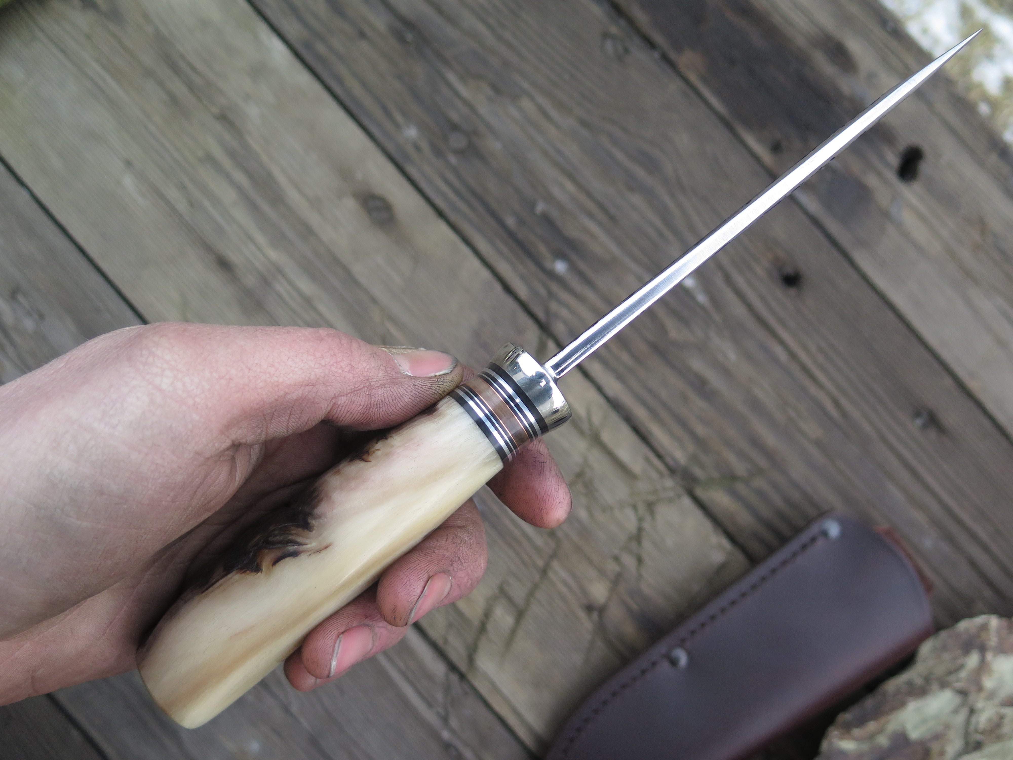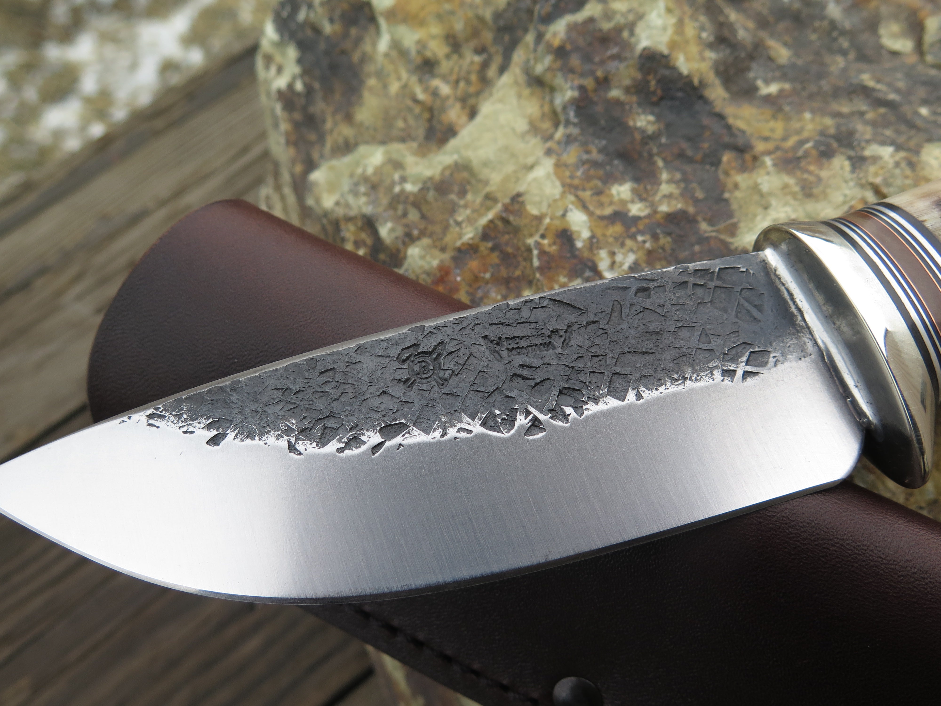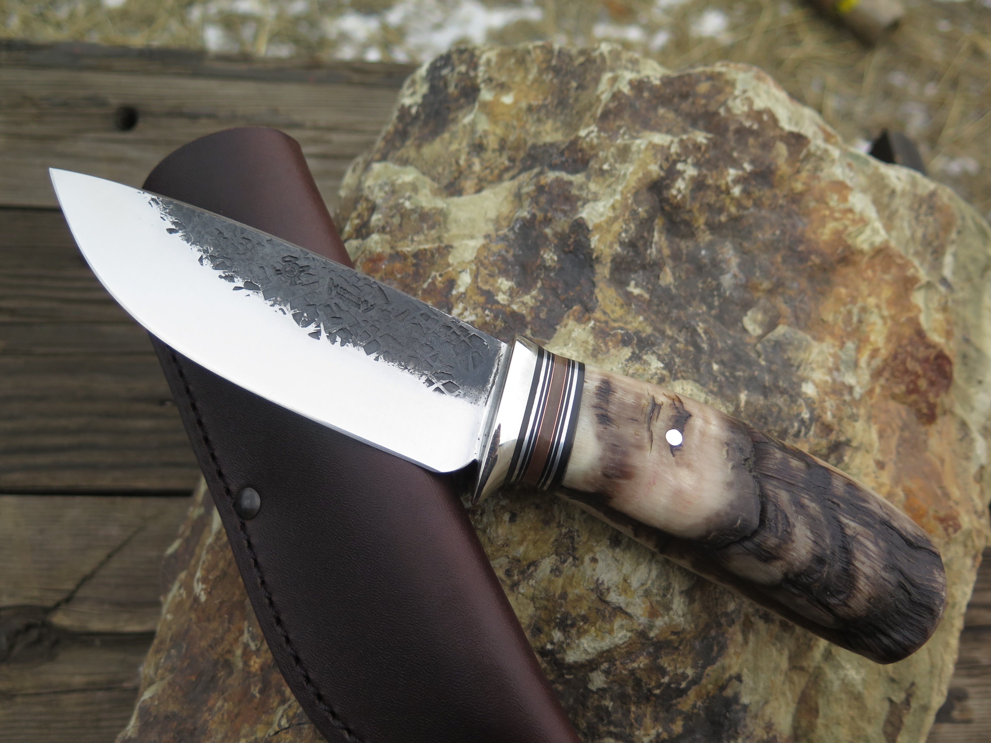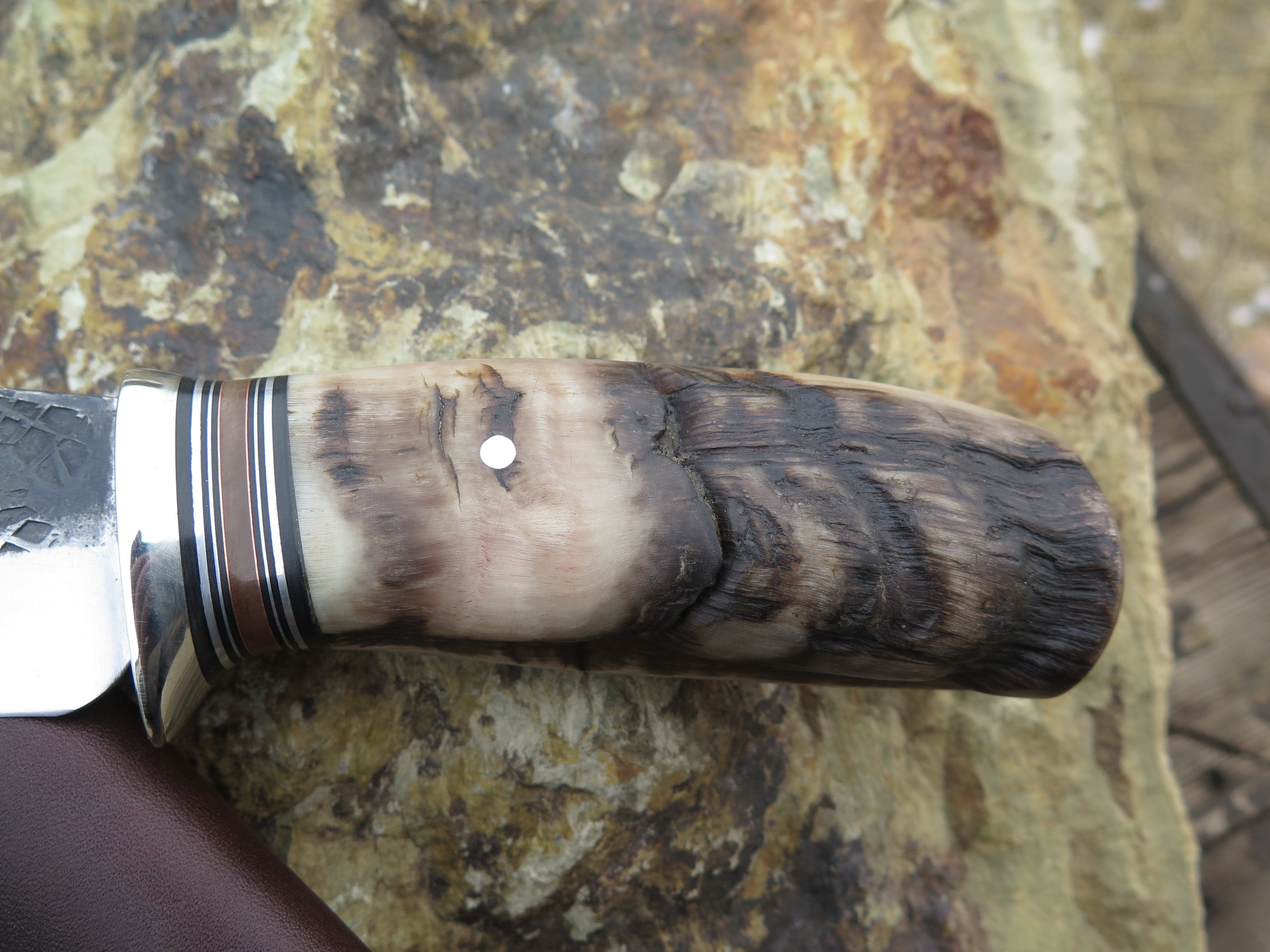 This outstanding new Drop Point from Behring Made© is hand forged from 3/16" thick high carbon 01 tool steel and it measures 5" from tip to guard with a razor sharp hollow grind and our hammermark finish. The nickel silver guard is soldered in place above black fiber, aluminum and premium fossil walrus ivory spacers in addition to a premium Dall's sheep horn handle that we pinned through the tang with aluminum. The overall length measures 9 3/8" and it comes in a classic Warlander Leather pouch sheath.