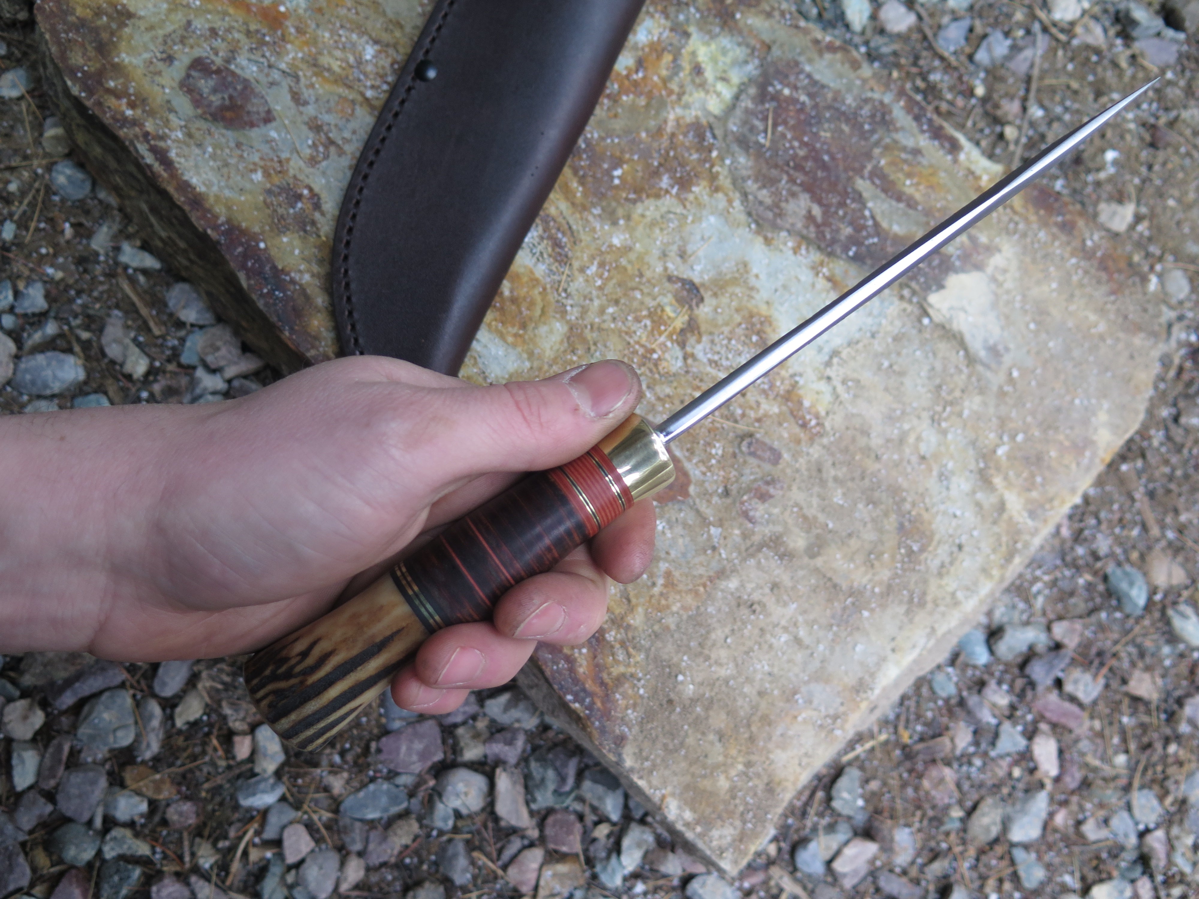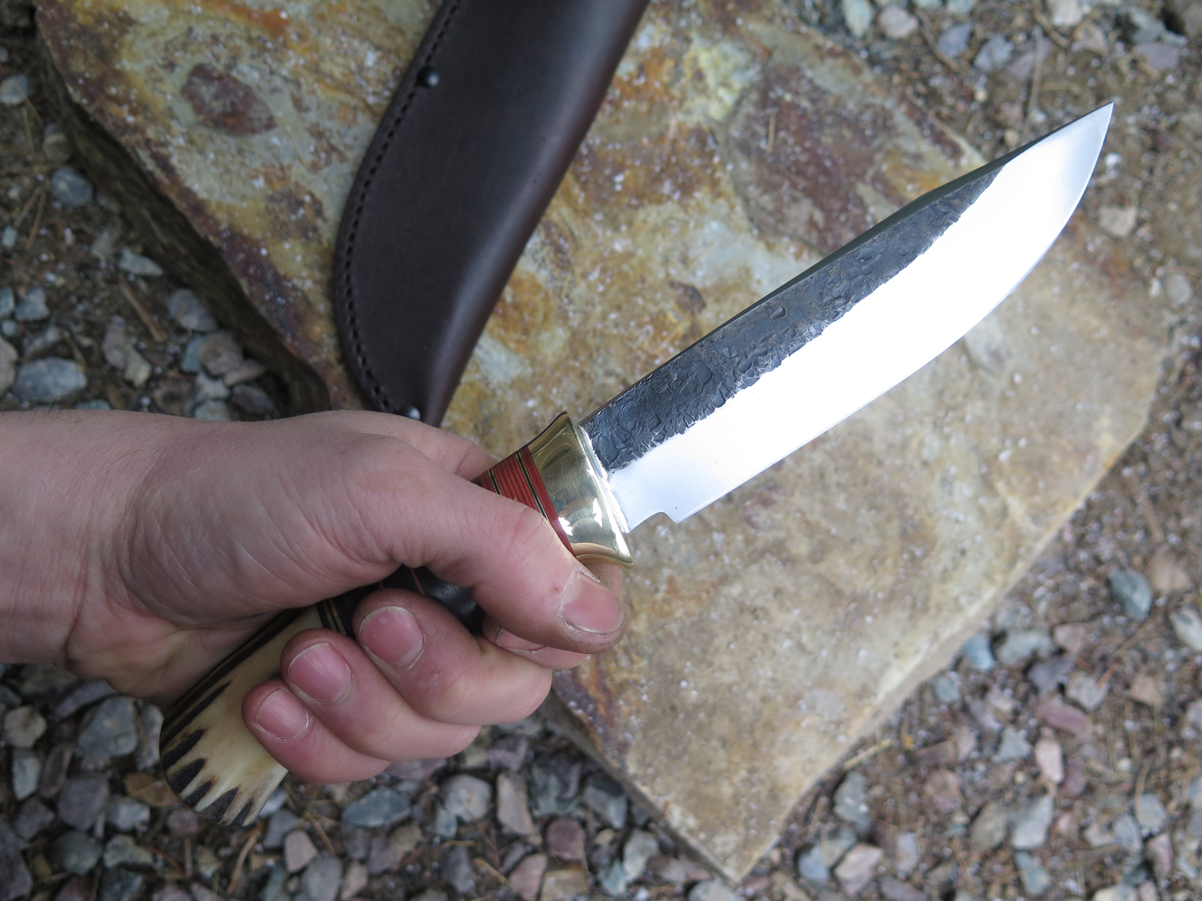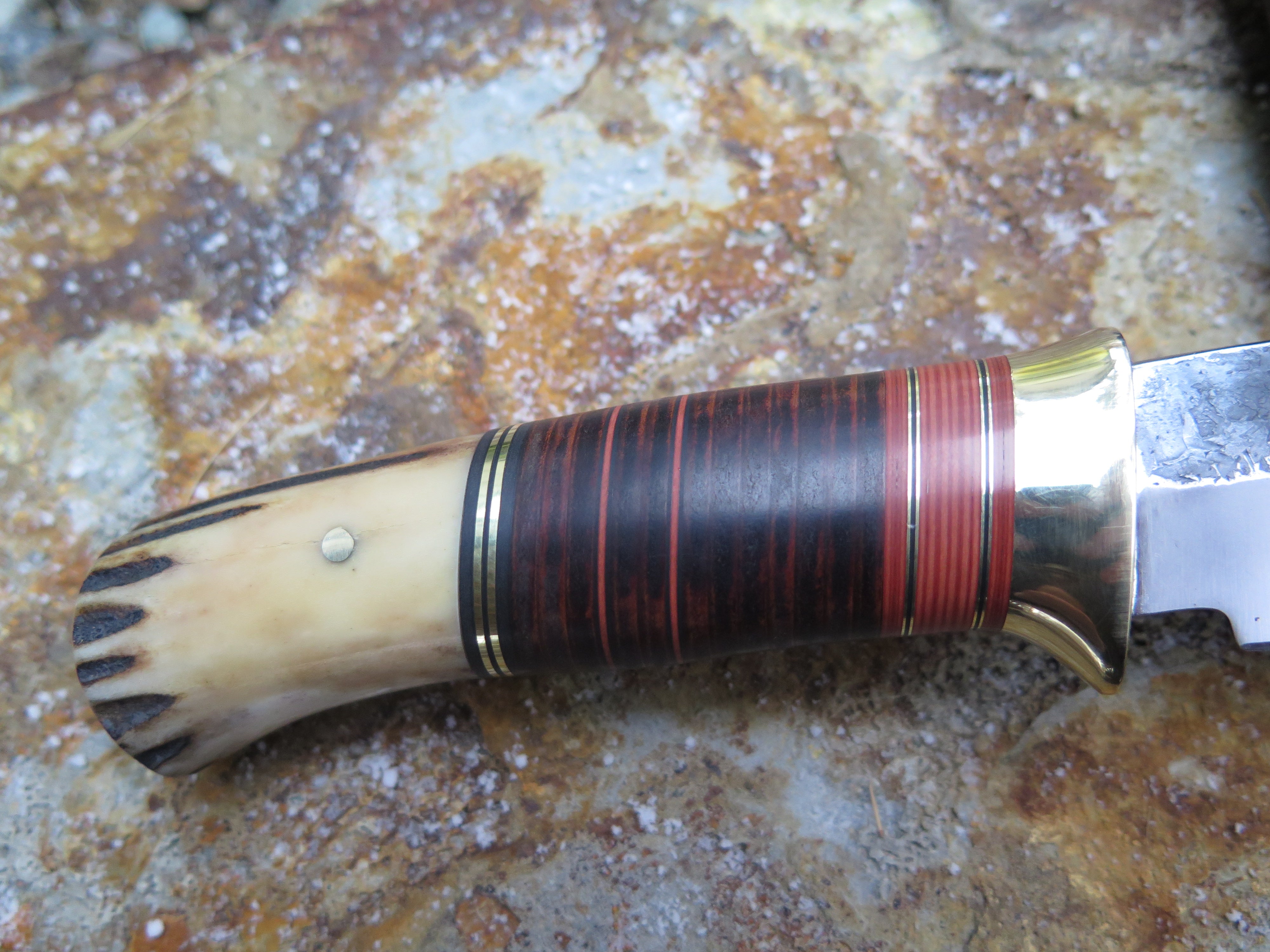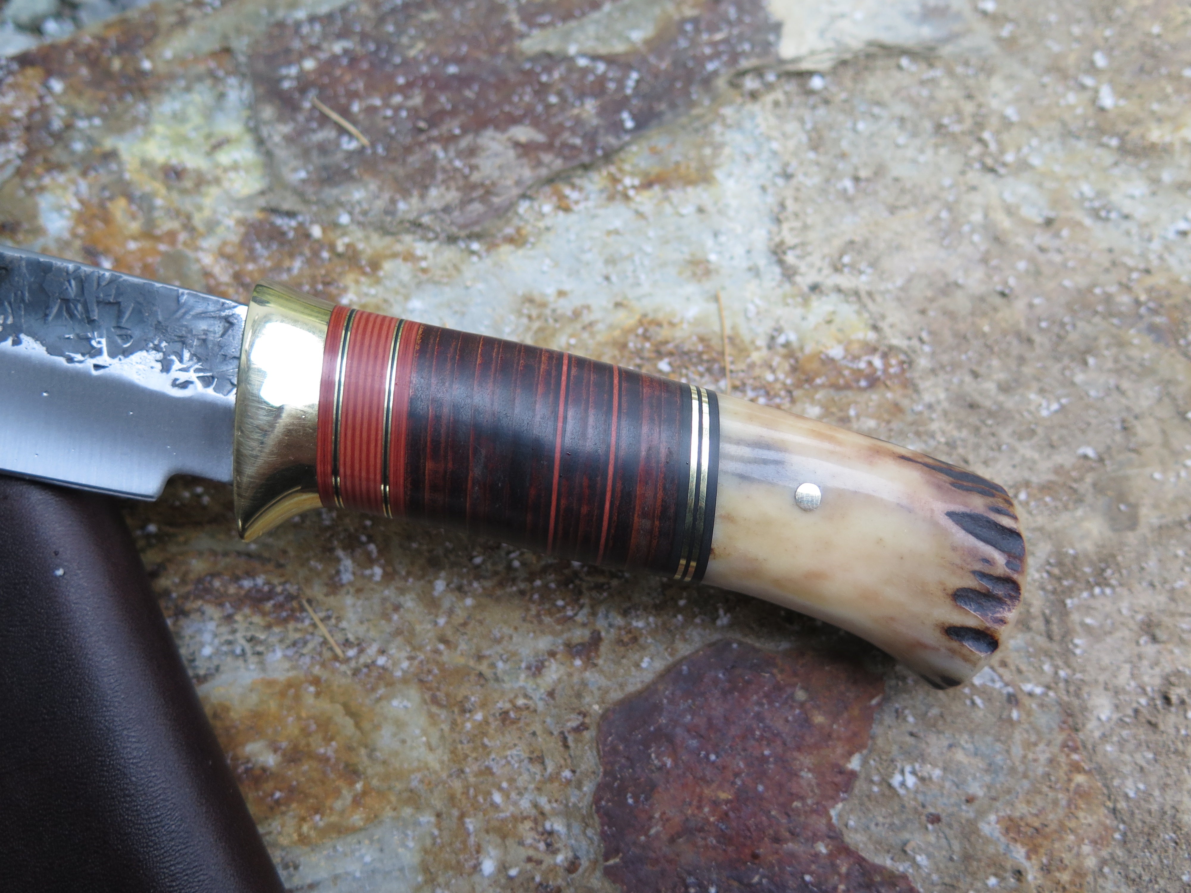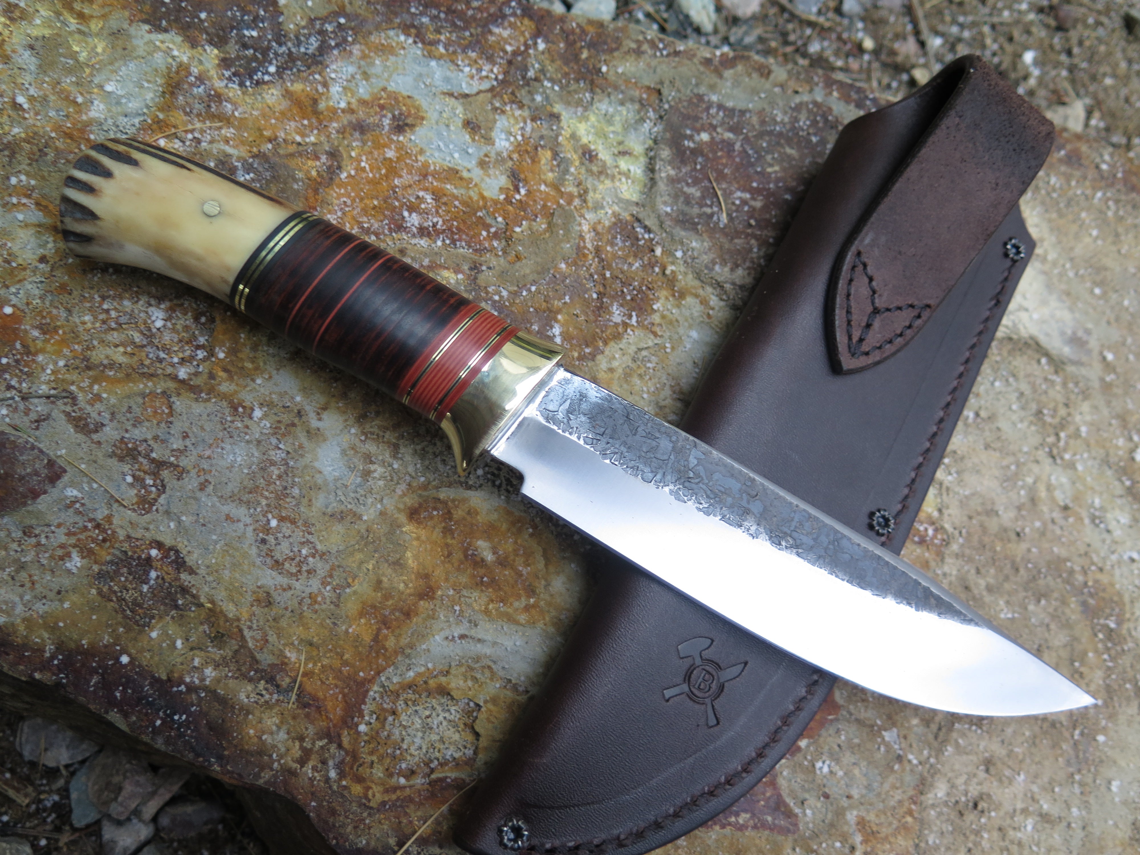 This beastly Drop Point from Behring Made© is hand forged from 3/16" thick high carbon 01 tool steel and it measures 6 1/4" from tip to guard with a razor sharp hollow grind and our hammermark finish. The brass bolster is soldered in place above black and maroon fiber, horsehide and brass spacers as well as a premium sambar stag butt that's pinned through the tang with brass. Overall length measures 11" and it comes in a classic leather belt pouch sheath.