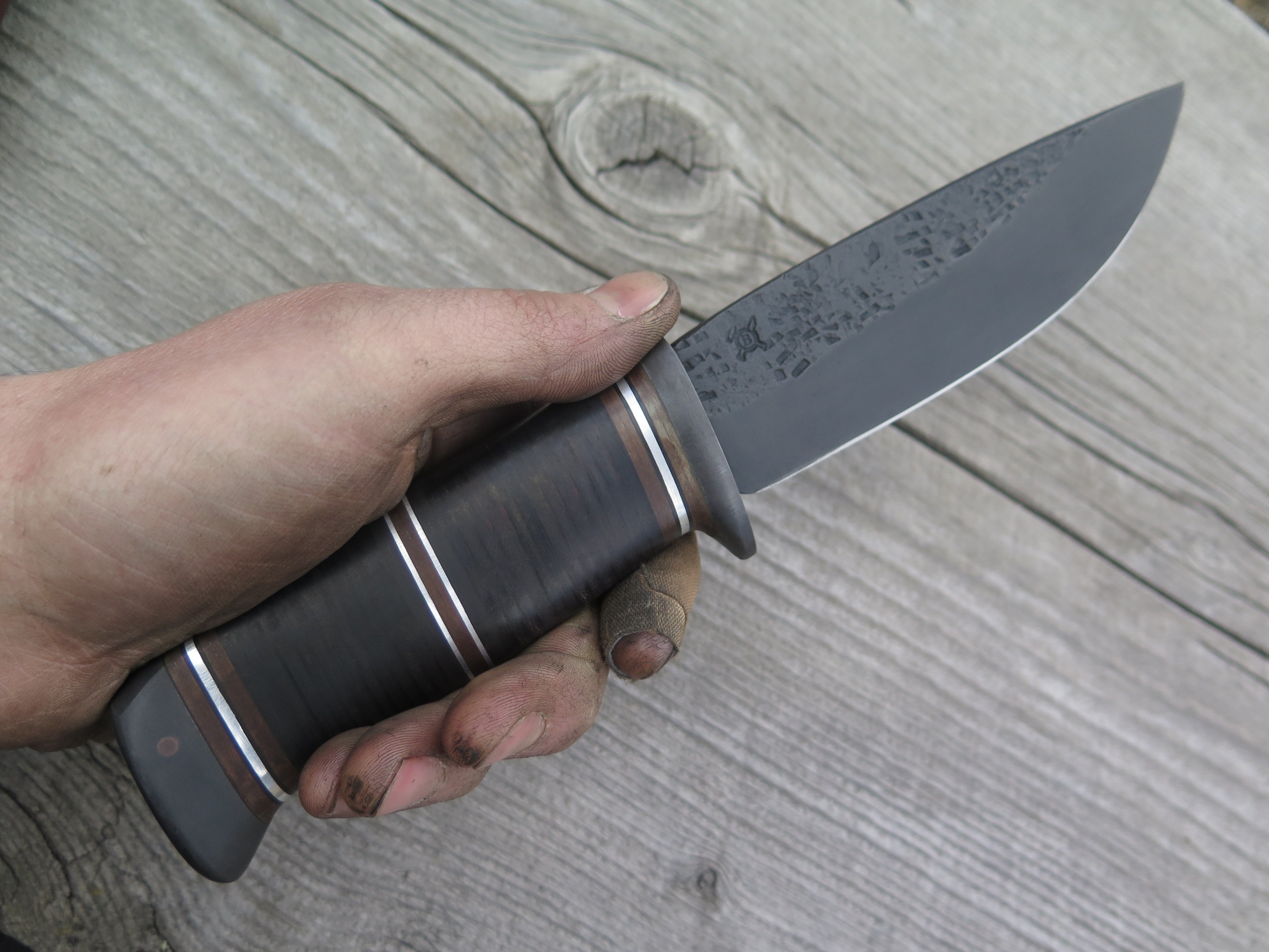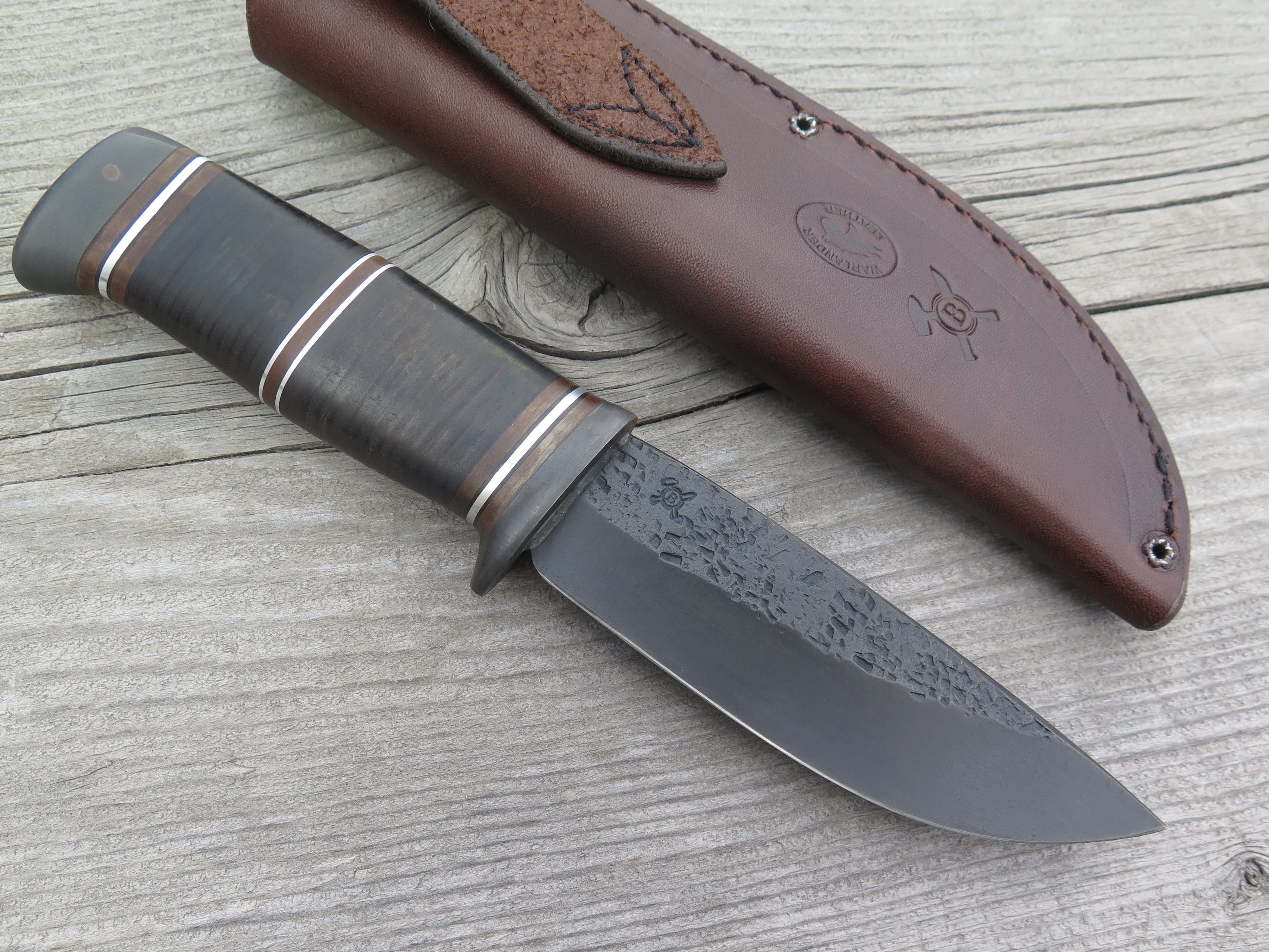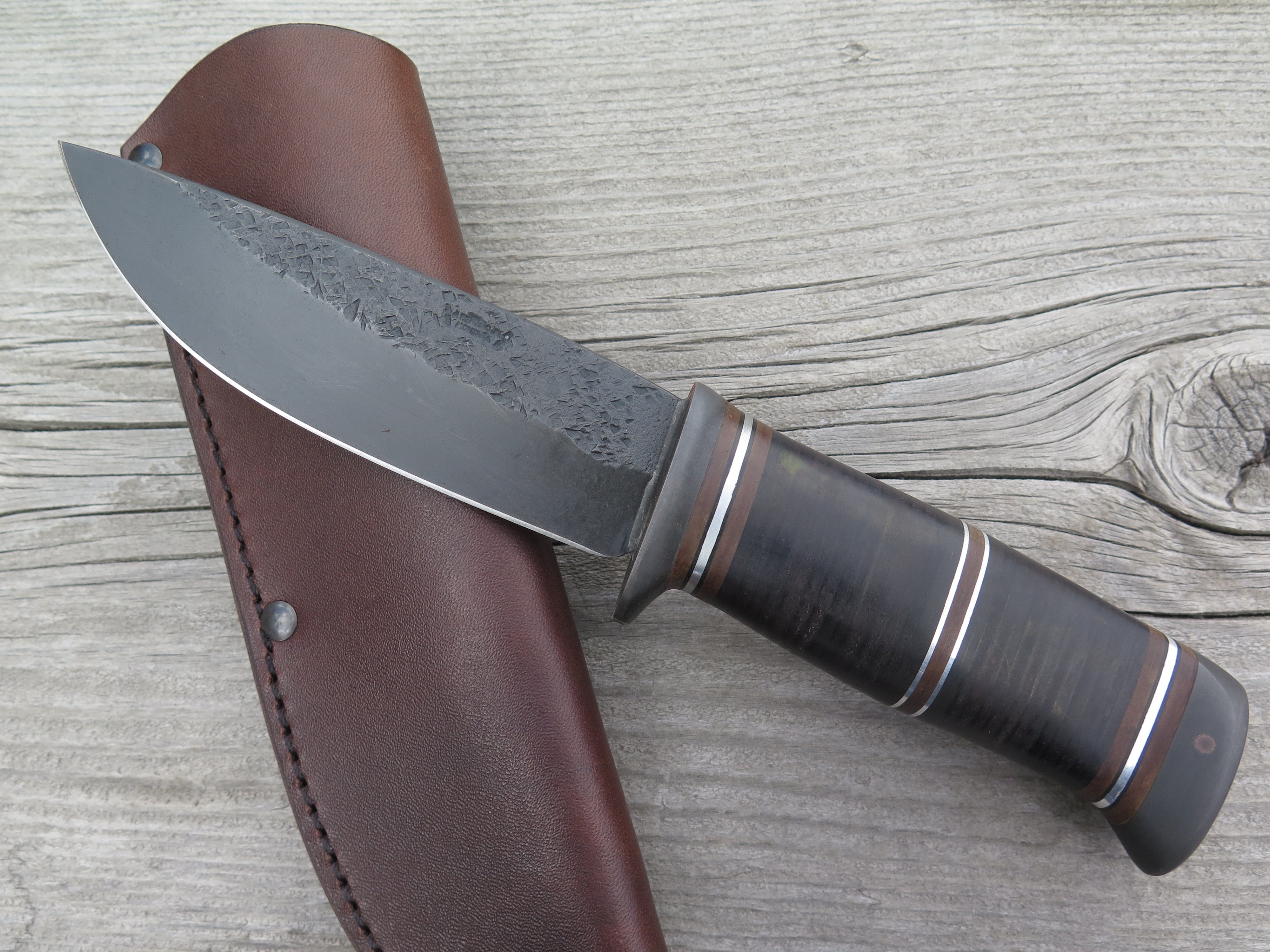 This bad ass new Drop Point from Behring Made© is hand forged from 3/16" thick high carbon 01 tool steel and it measures 5" from tip to guard with a razor sharp hollow grind with hammermarks and our forced patina blued finish. The blued steel guard is soldered in place above black and gray fiber with aluminum spacers as well as a comfortable stack of chocolate stained horsehide that is capped with blued steel and pinned with copper. The overall length measures 9 1/2" and it comes in the shown classic belt pouch sheath.