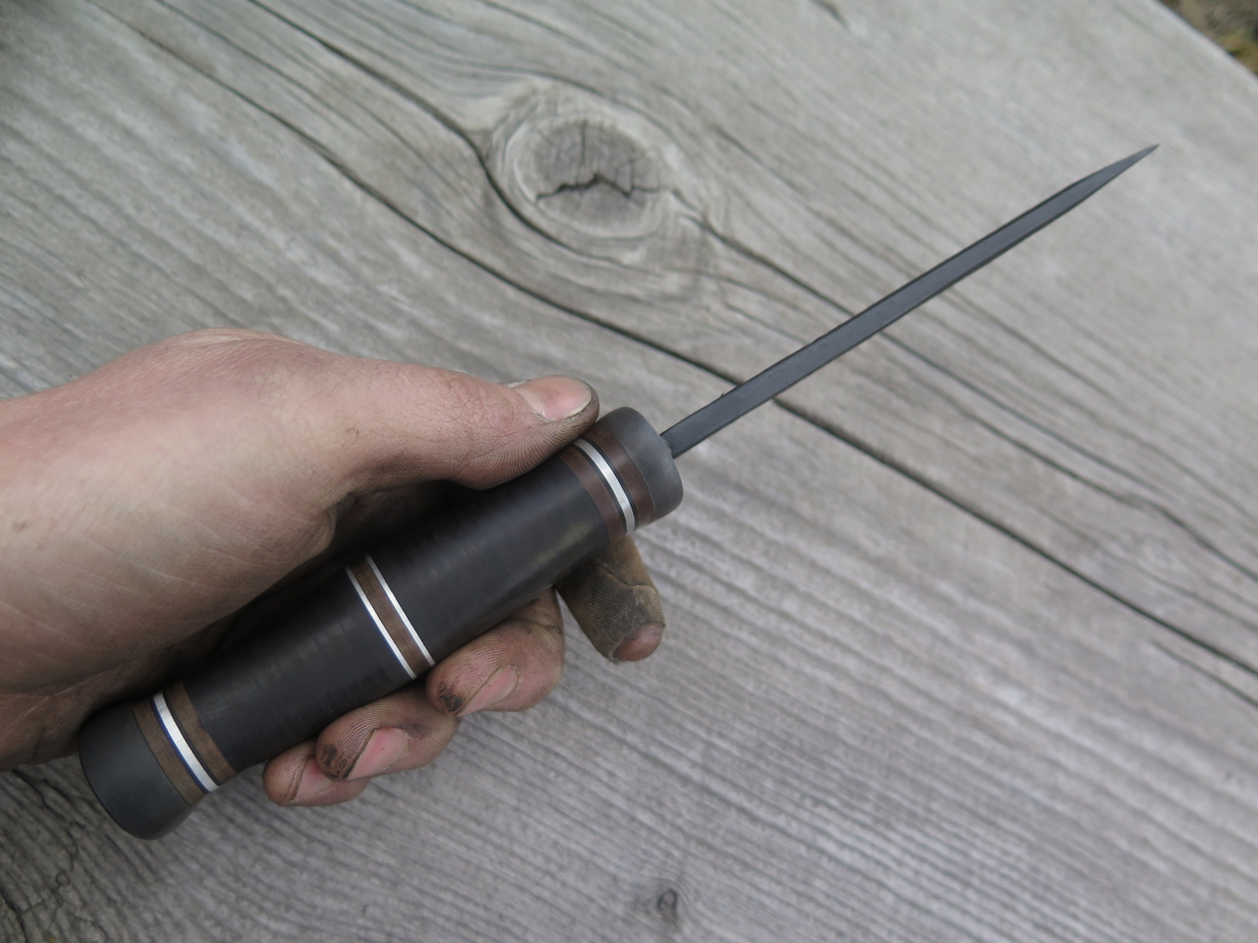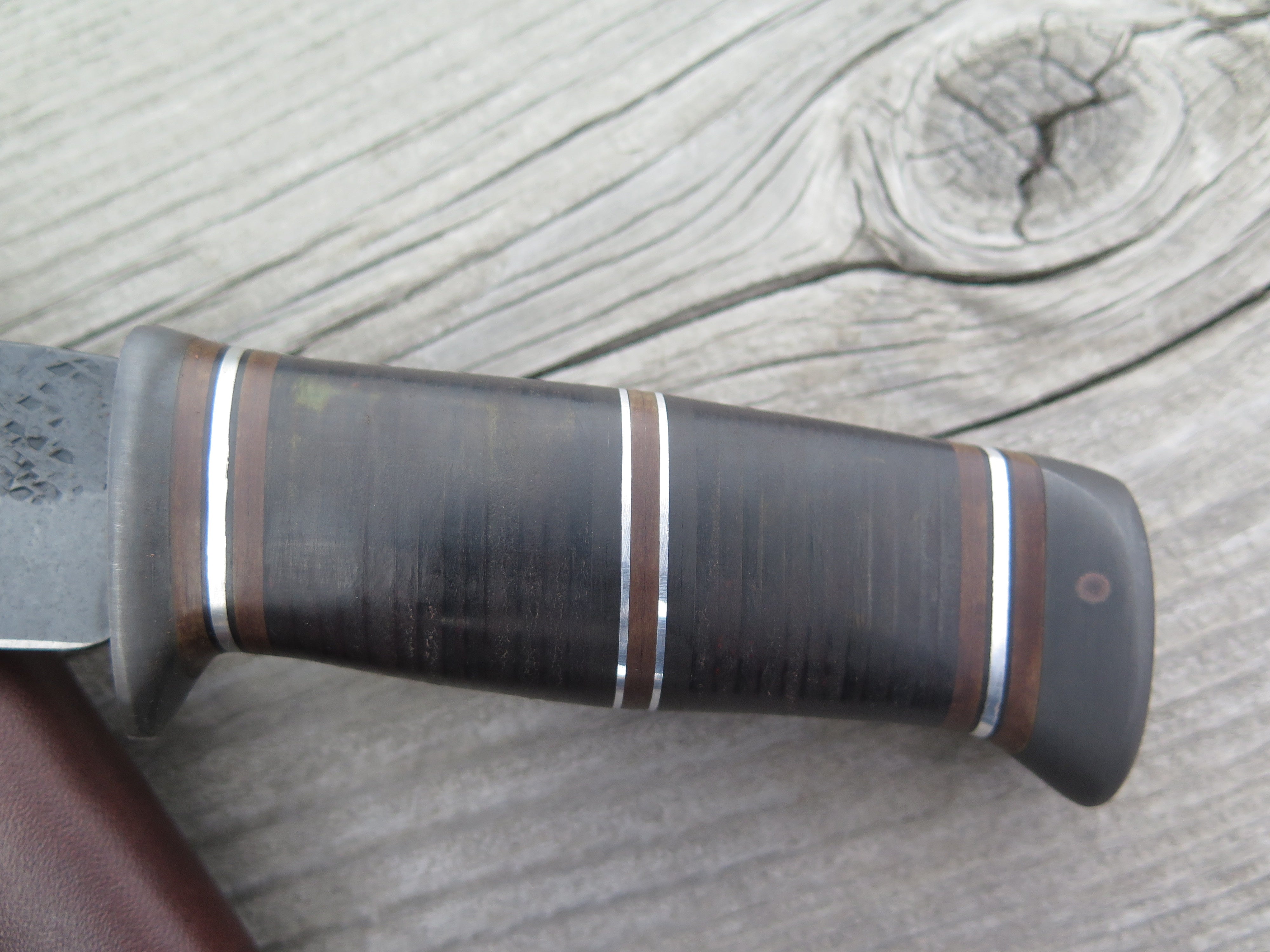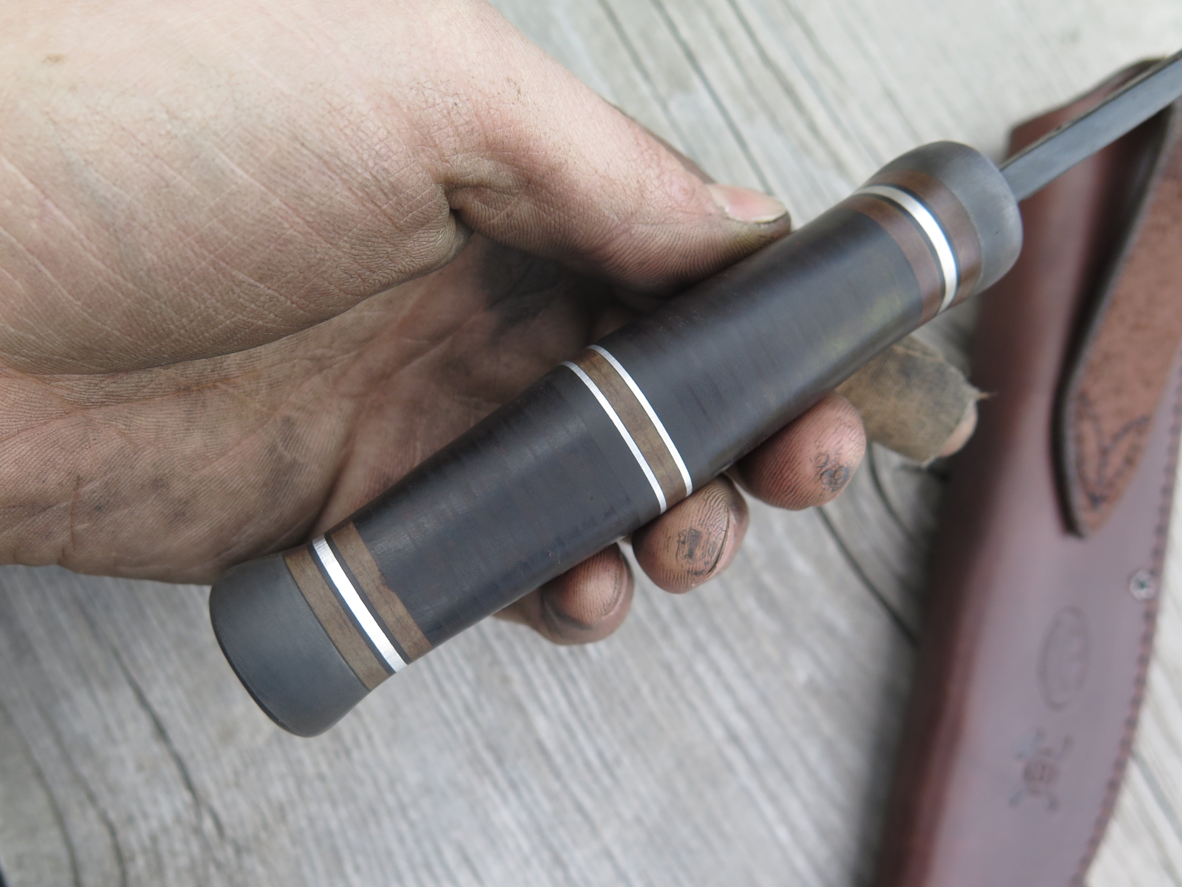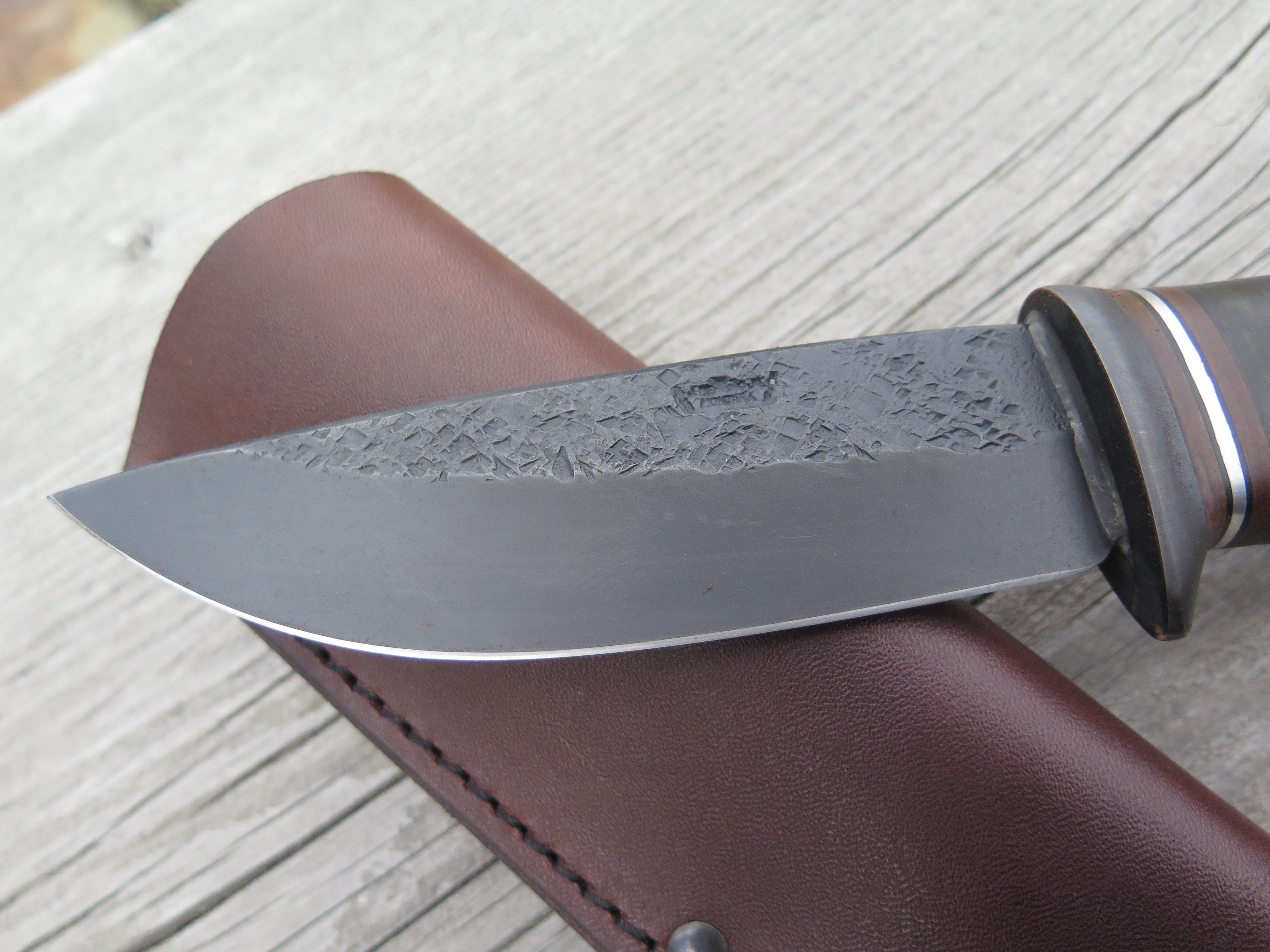 This bad ass new Drop Point from Behring Made© is hand forged from 3/16" thick high carbon 01 tool steel and it measures 5" from tip to guard with a razor sharp hollow grind with hammermarks and our forced patina blued finish. The blued steel guard is soldered in place above black and gray fiber with aluminum spacers as well as a comfortable stack of chocolate stained horsehide that is capped with blued steel and pinned with copper. The overall length measures 9 1/2" and it comes in the shown classic belt pouch sheath.
