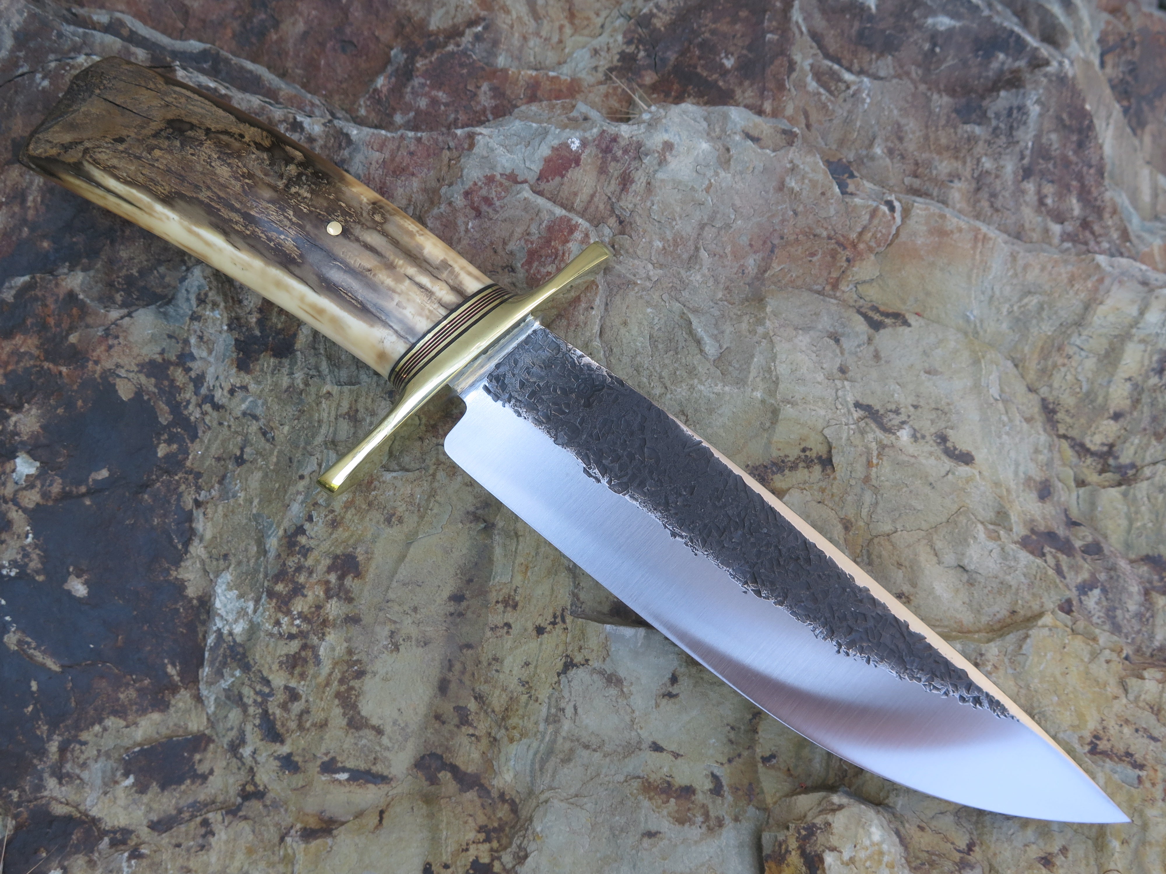 This outstanding new Camp Knife from Behring Made© is a stepped up drop point that'll tackle your camp jobs like a linebacker on a kicker. The blade is forged from 5160 spring steel and it measures 7 1/2" from tip to guard with a razor sharp hollow grind and our hammermark finish. The tall brass guard is soldered in place above black fiber, brass and copper spacers as well as a gorgeous artifact walrus ivory handle that we've pinned through the tang with brass. The overall length of this beast measures 12 1/4" and it comes in a custom sheath from Warlander Leather. *CONTACT TO ORDER
