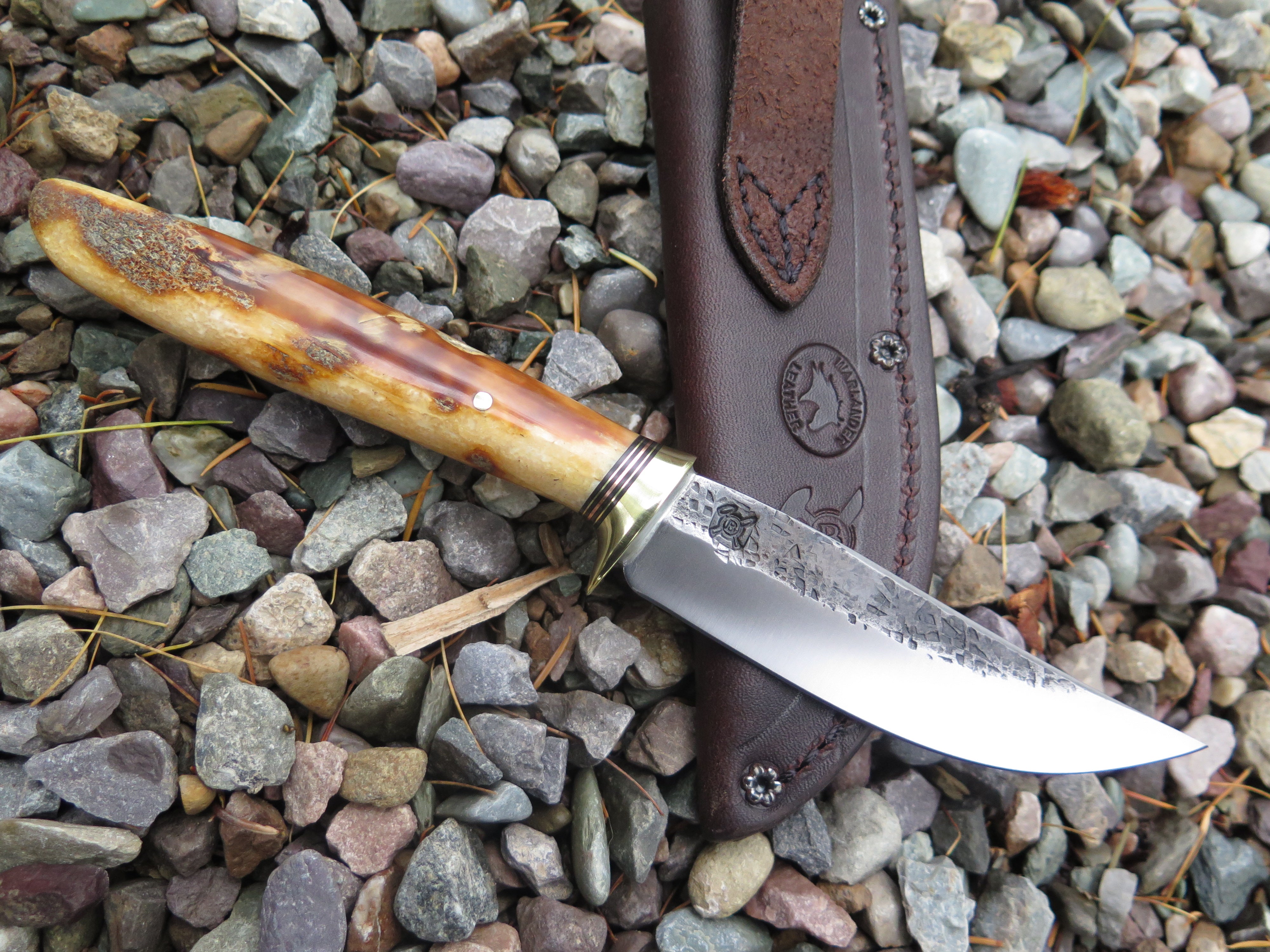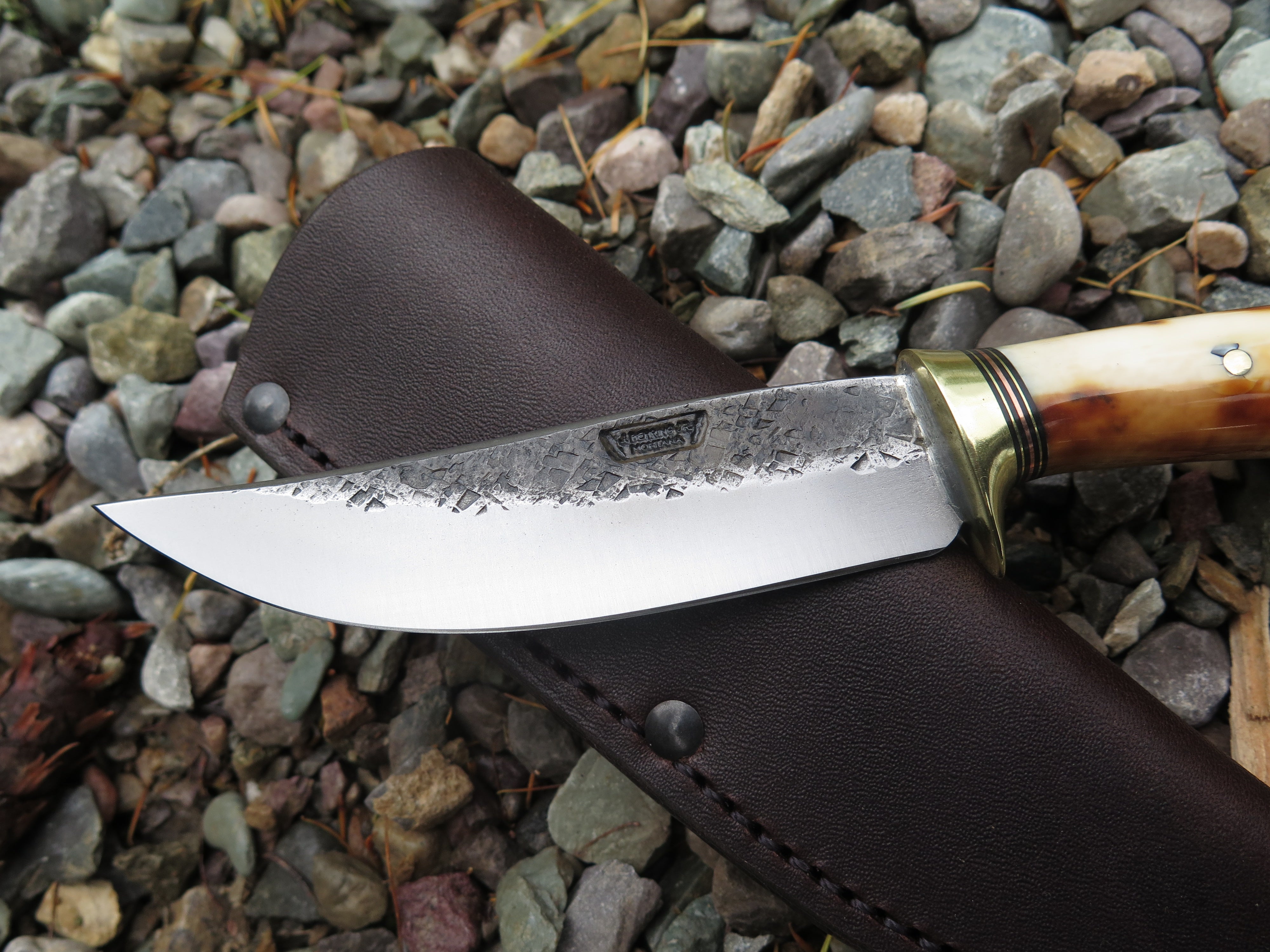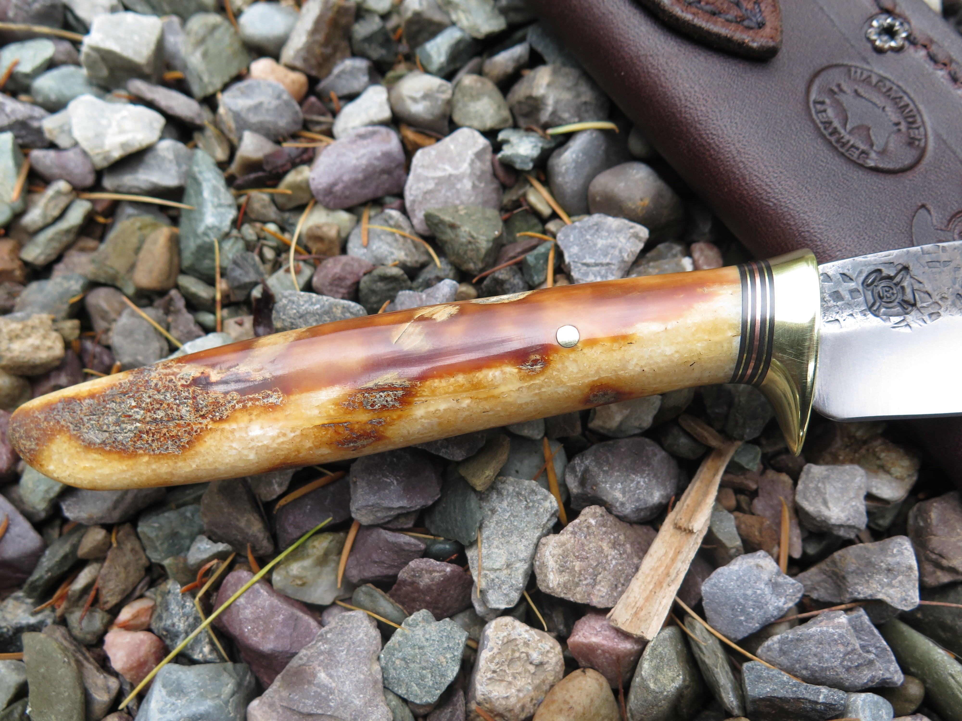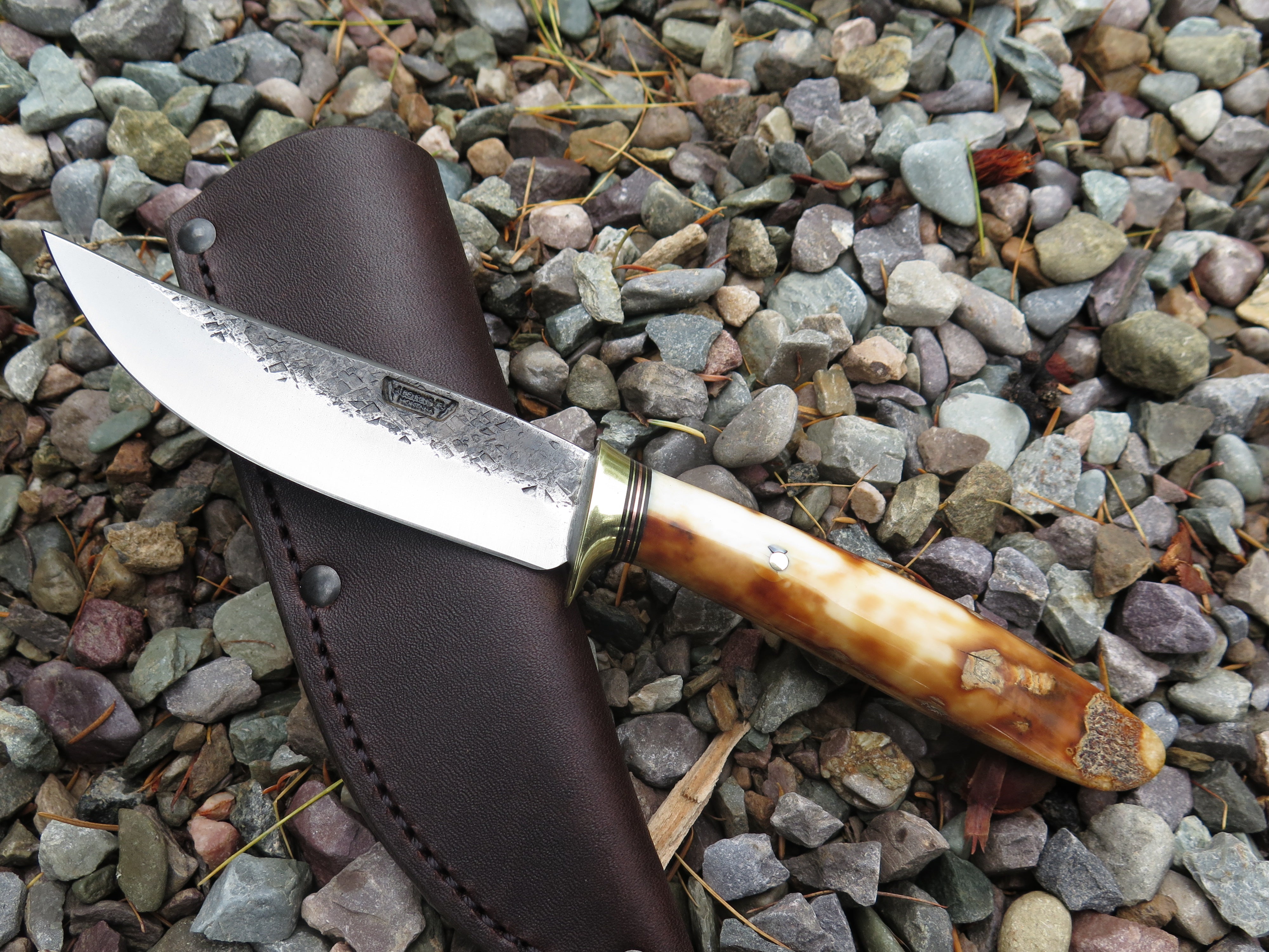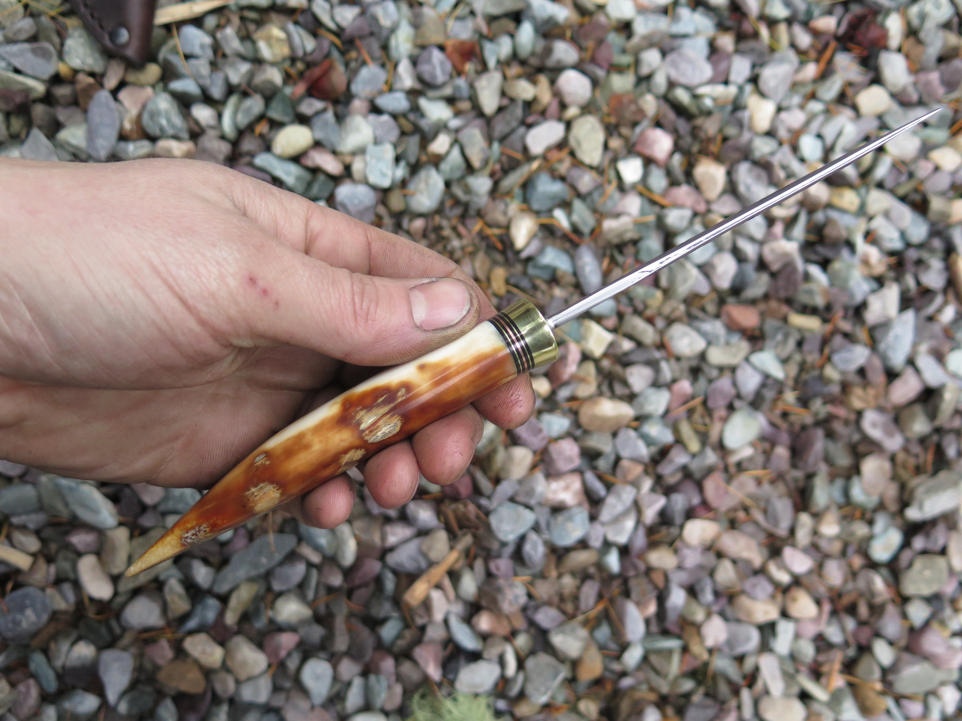 This beautiful Trout and Bird from Behring Made© is hand forged from 1/8" thick high carbon 01 tool steel and it measures 4 1/2" from tip to guard with a razor sharp hollow grind and a hammermark finish. The brass guard is soldered in place above black fiber, copper and brass spacers while the handle is an outstanding walrus ivory artifact ice chisel with a brass pin. The overall length measures 9 1/4" and it comes in a classic pouch sheath that rides on the belt. *Due to material availability, please contact to order.