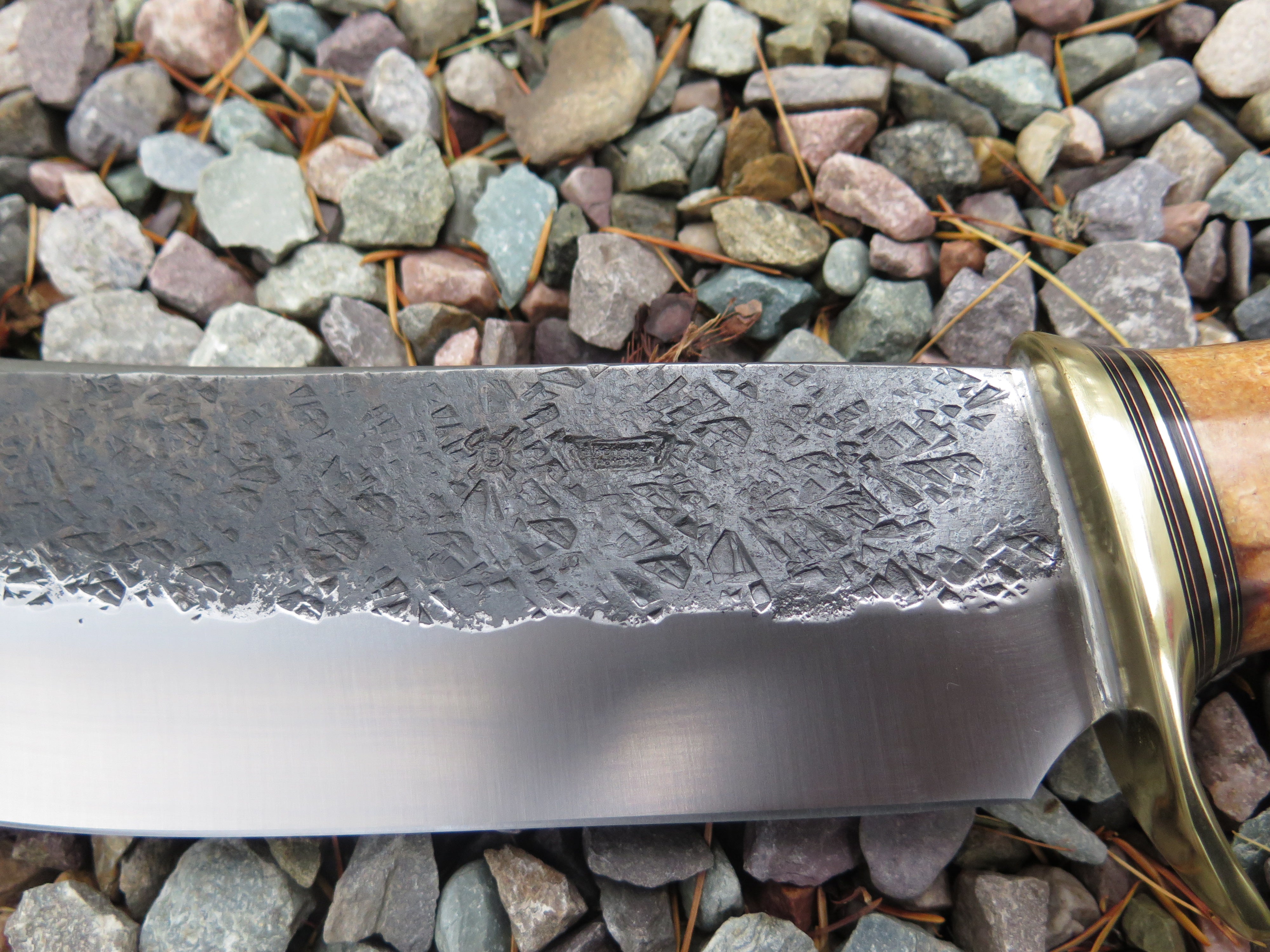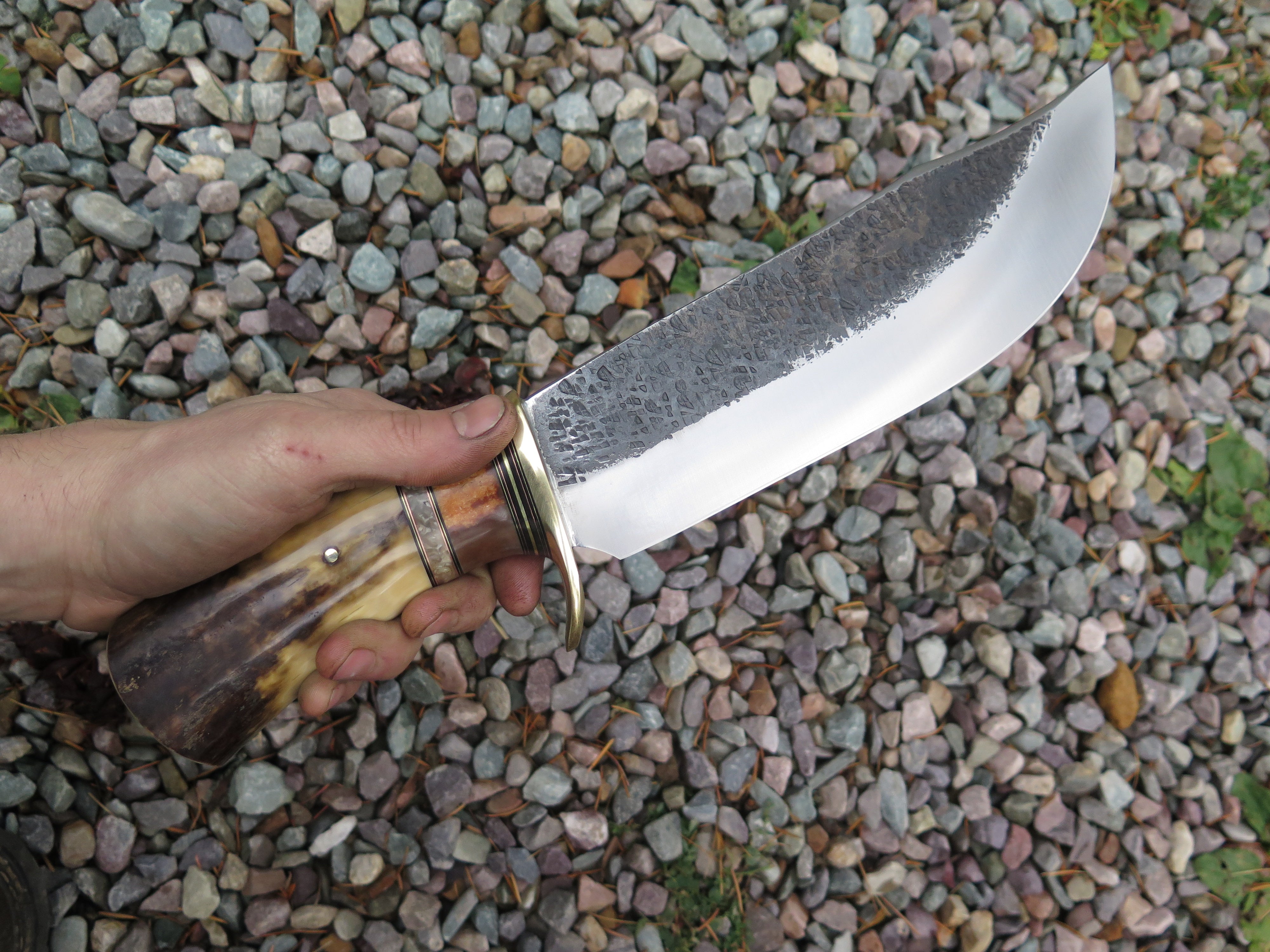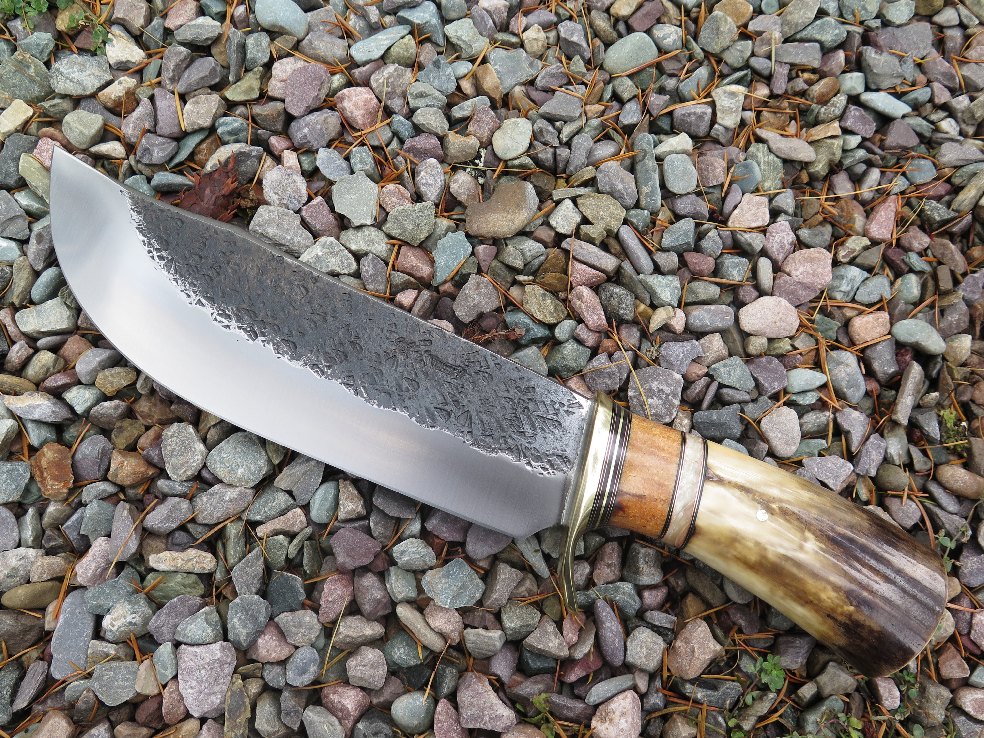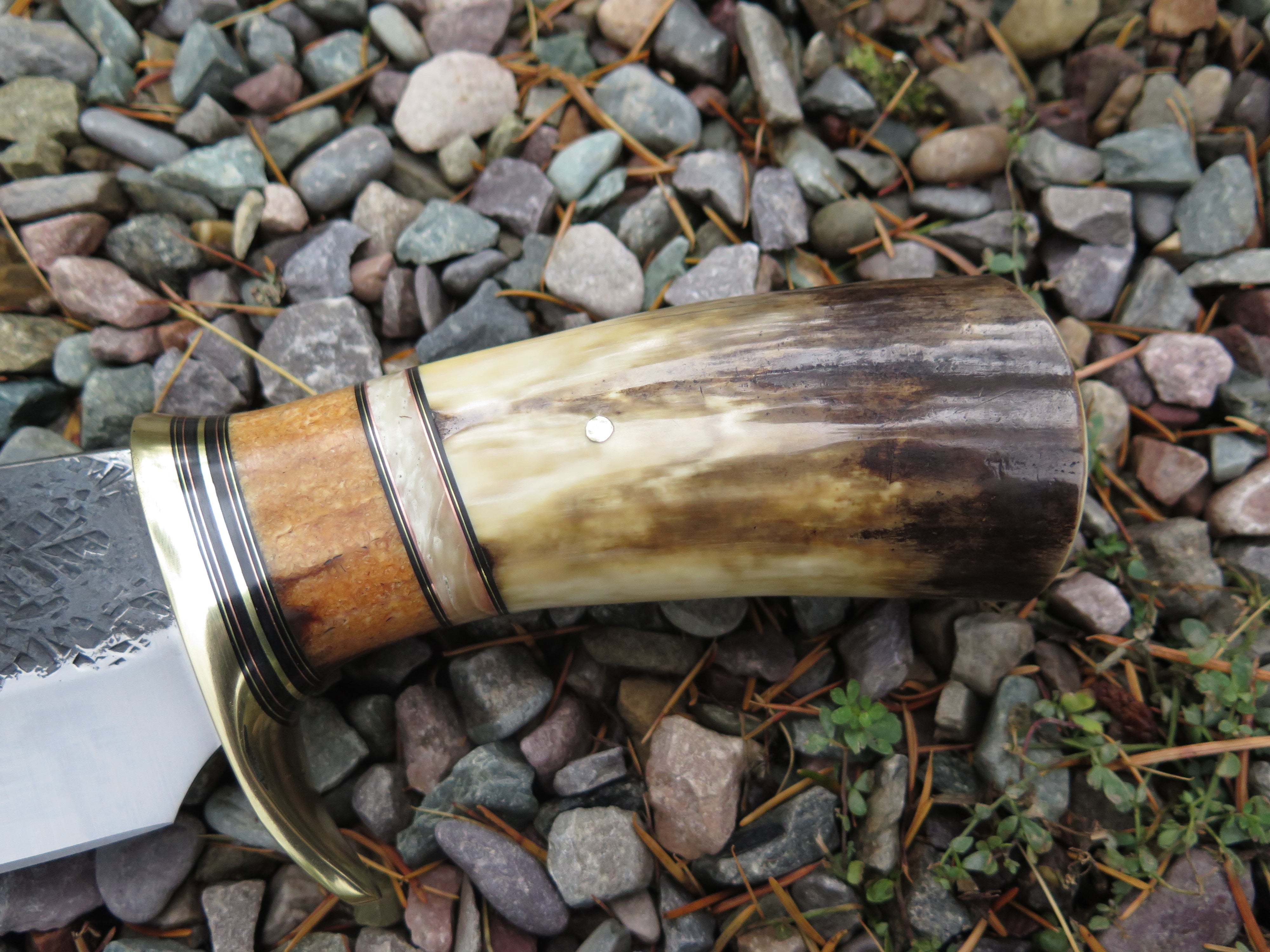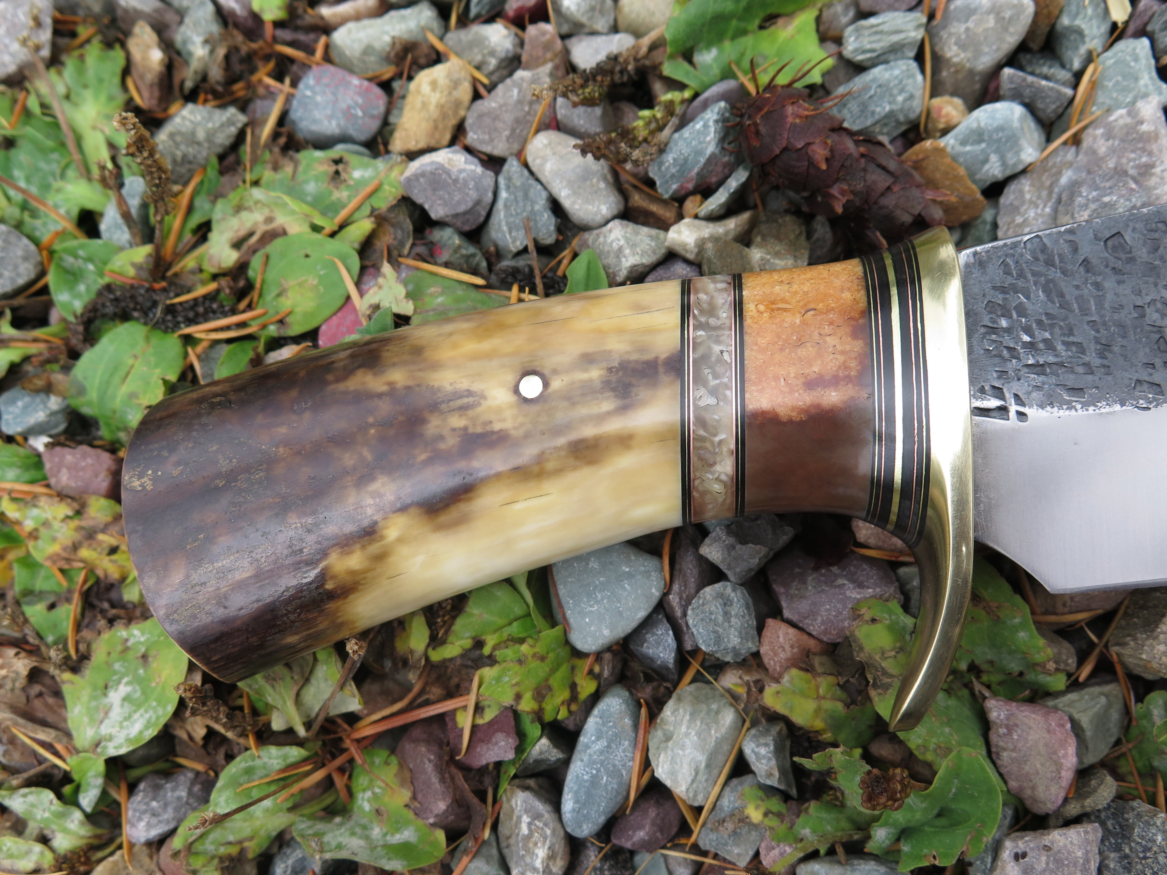 This beast of a Bowie from Behring Made© is hand forged from 1/4" thick high carbon 01 tool steel and it measures 9" from tip to guard with a razor sharp hollow grind and our hammermark finish. The forged brass s-guard is soldered in place above black fiber, brass, copper, premium fossil walrus ivory and musk ox boss spacers with a remarkable handle of an equally high figured fossil walrus tusk. The overall length measures 14 1/4" and it comes in a custom sheath from Warlander Leather.