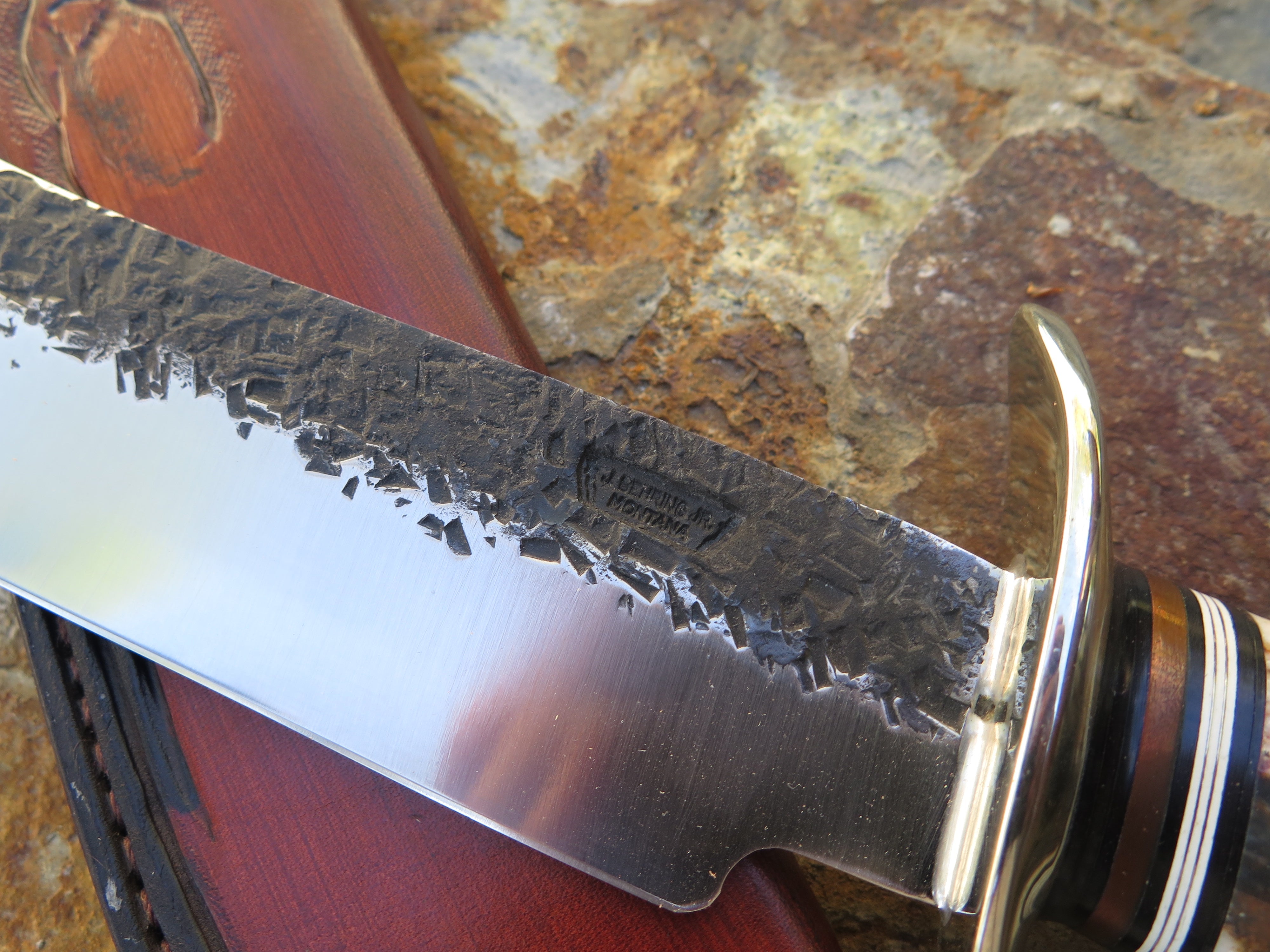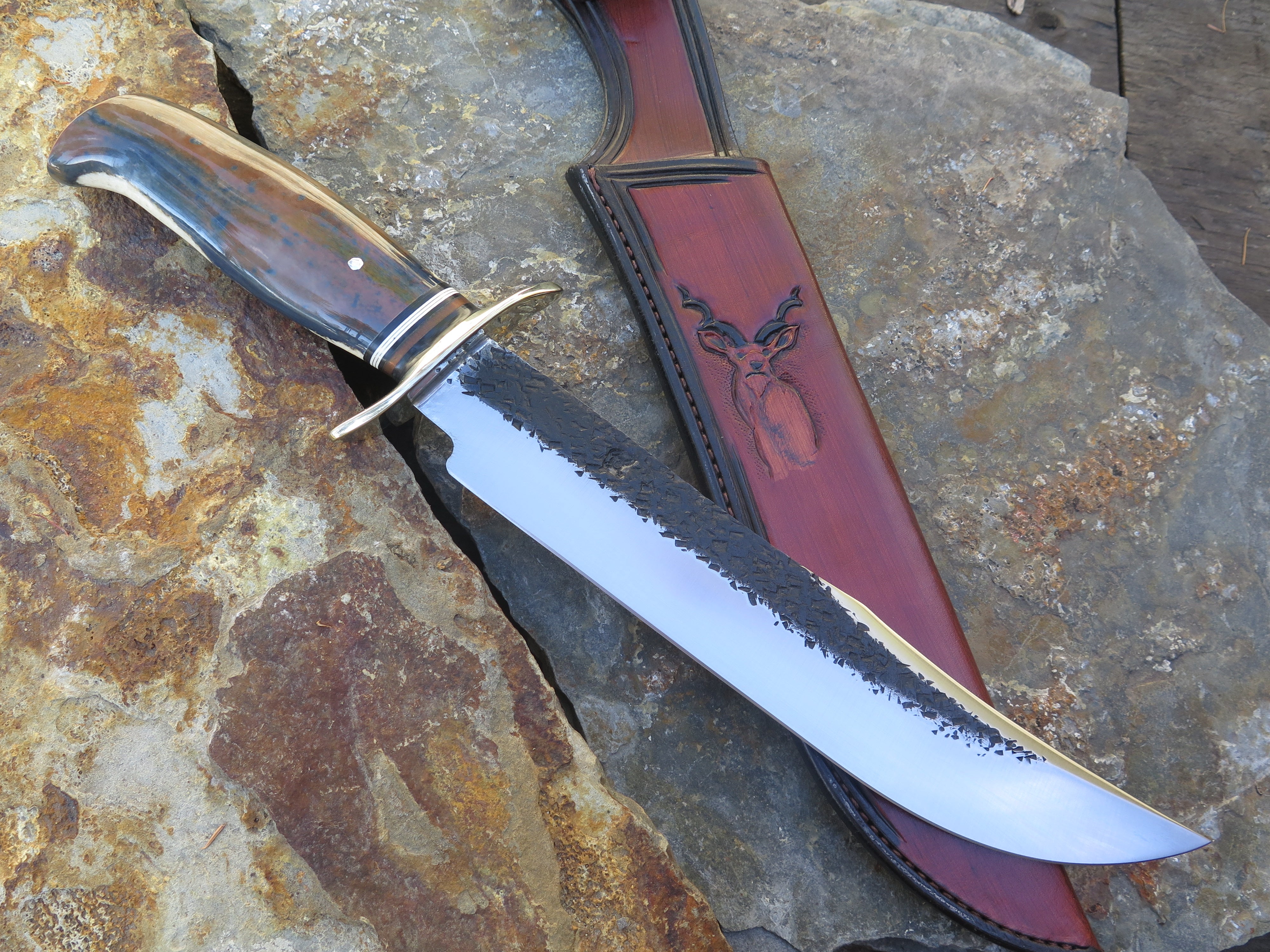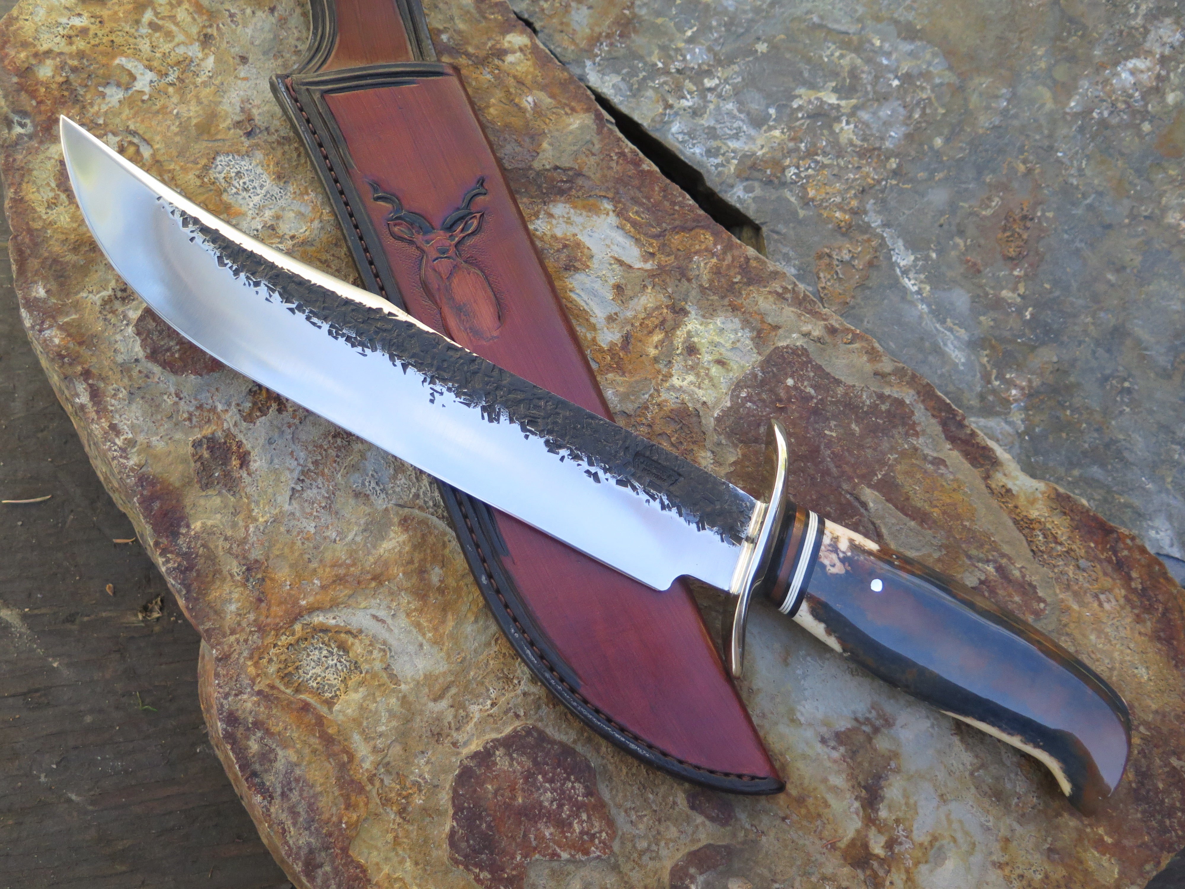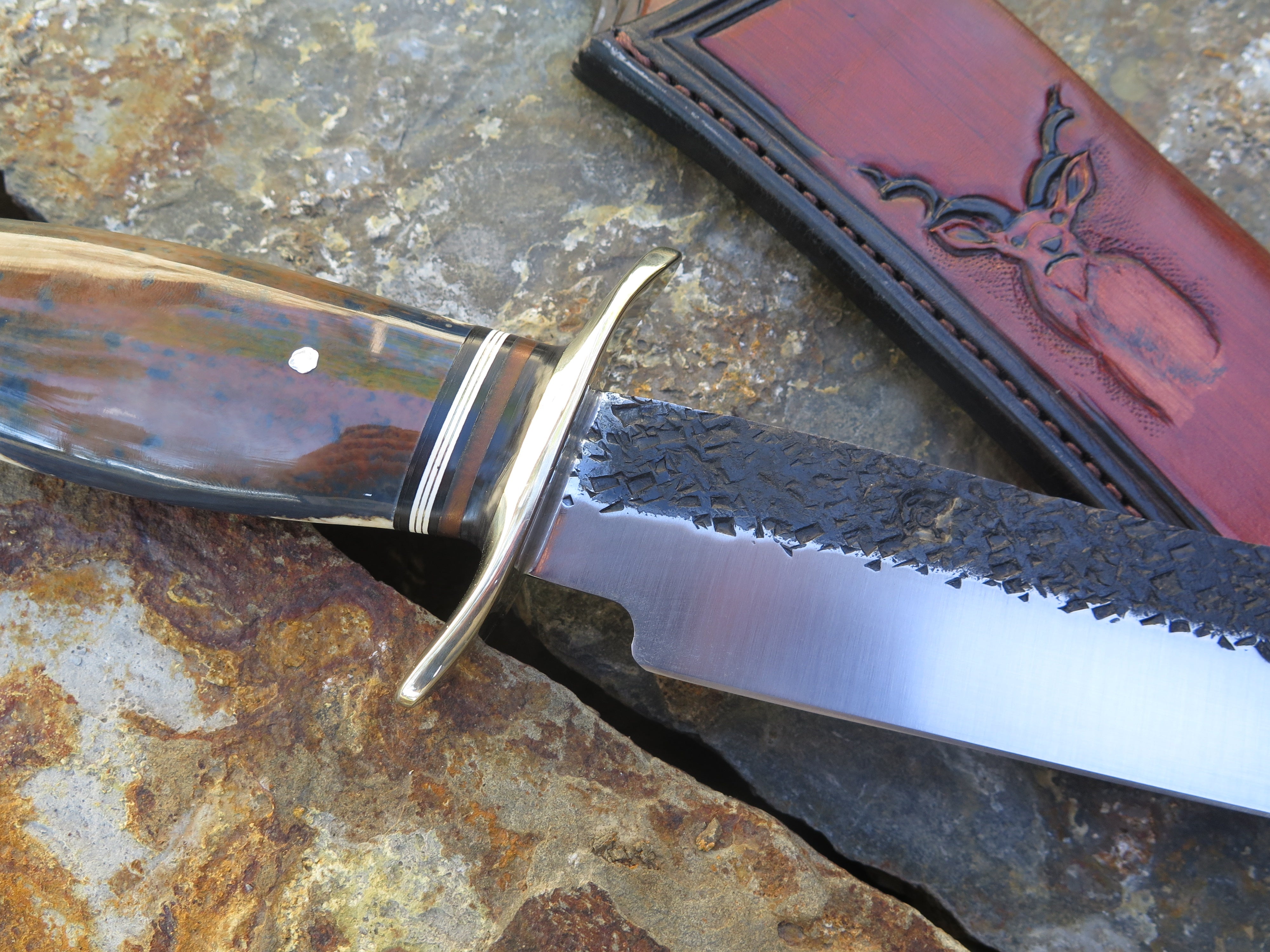 This beautiful Behring Made© Bowie is hand forged from 13/64" thick 5160 spring steel and it measures a whopping 10 1/2" from tip to guard with a razor sharp hollow grind and our hammermark finish. The forged nickel silver s-guard is soldered in place above black and white fiber, copper and brass spacers which top a high figure premium fossil walrus ivory handle that is also pinned through the tang with aluminum. The overall length measures 16" and it comes in custom sheath from Treestump Leather with a kudu tooled on the face.