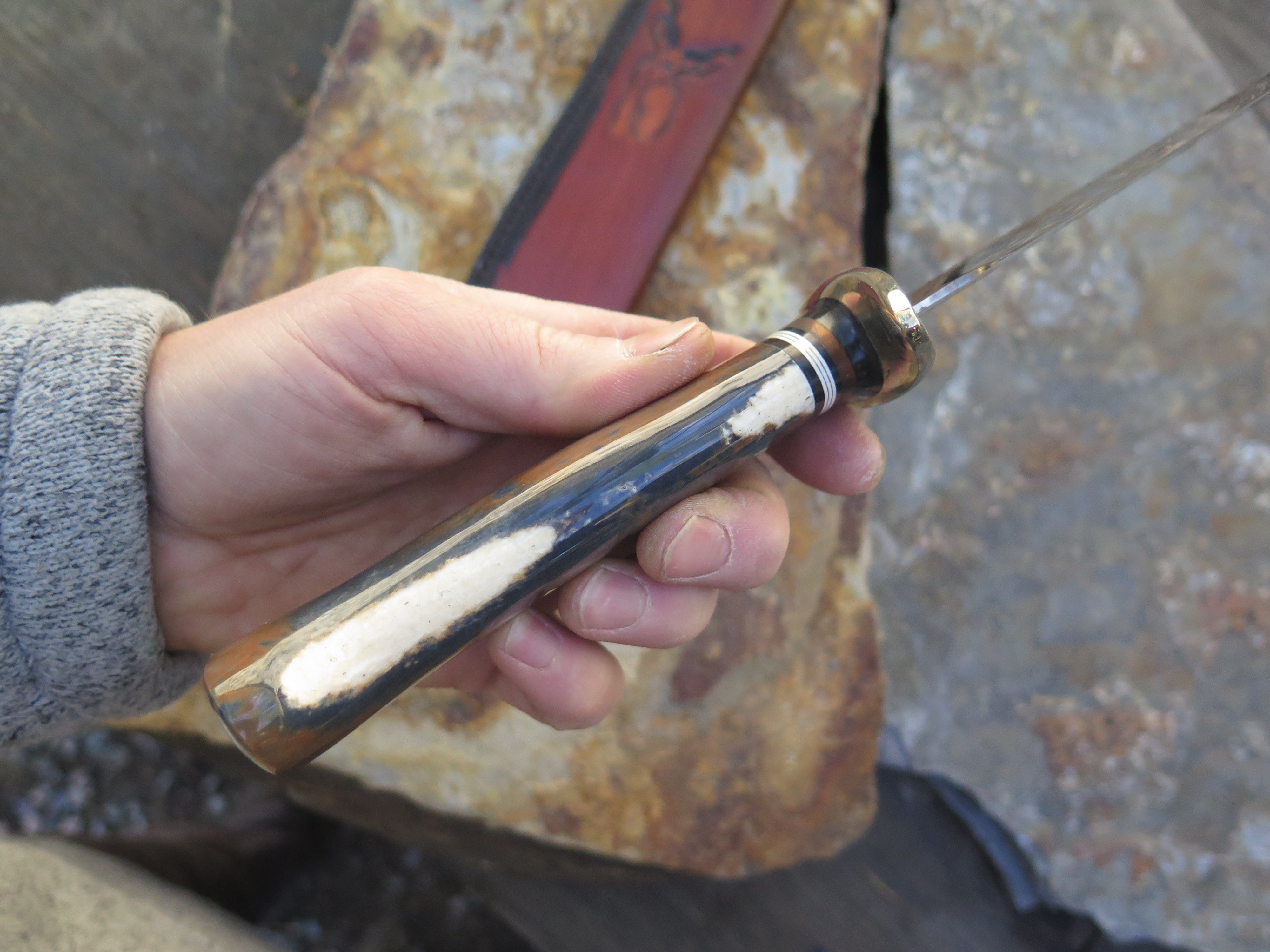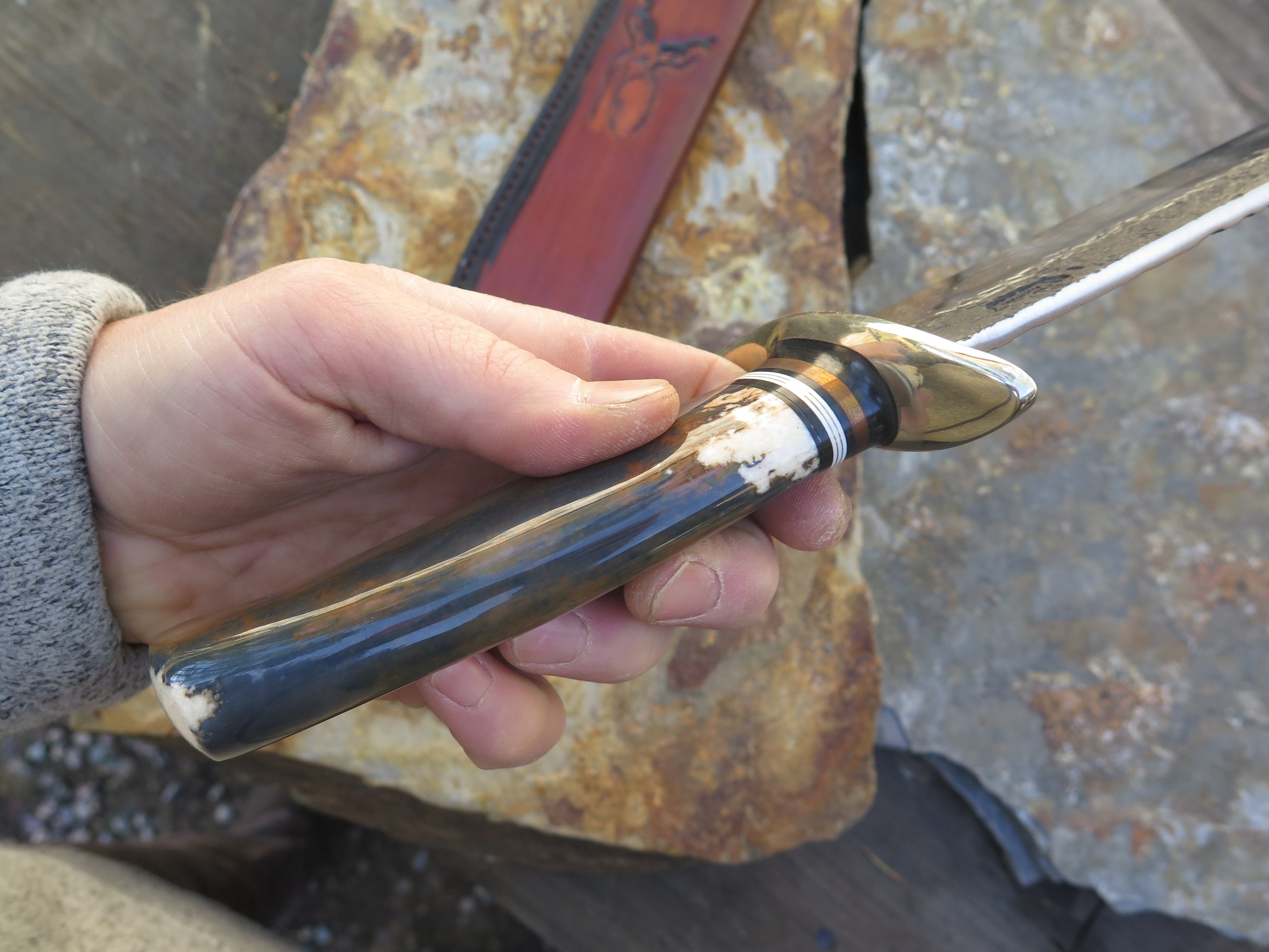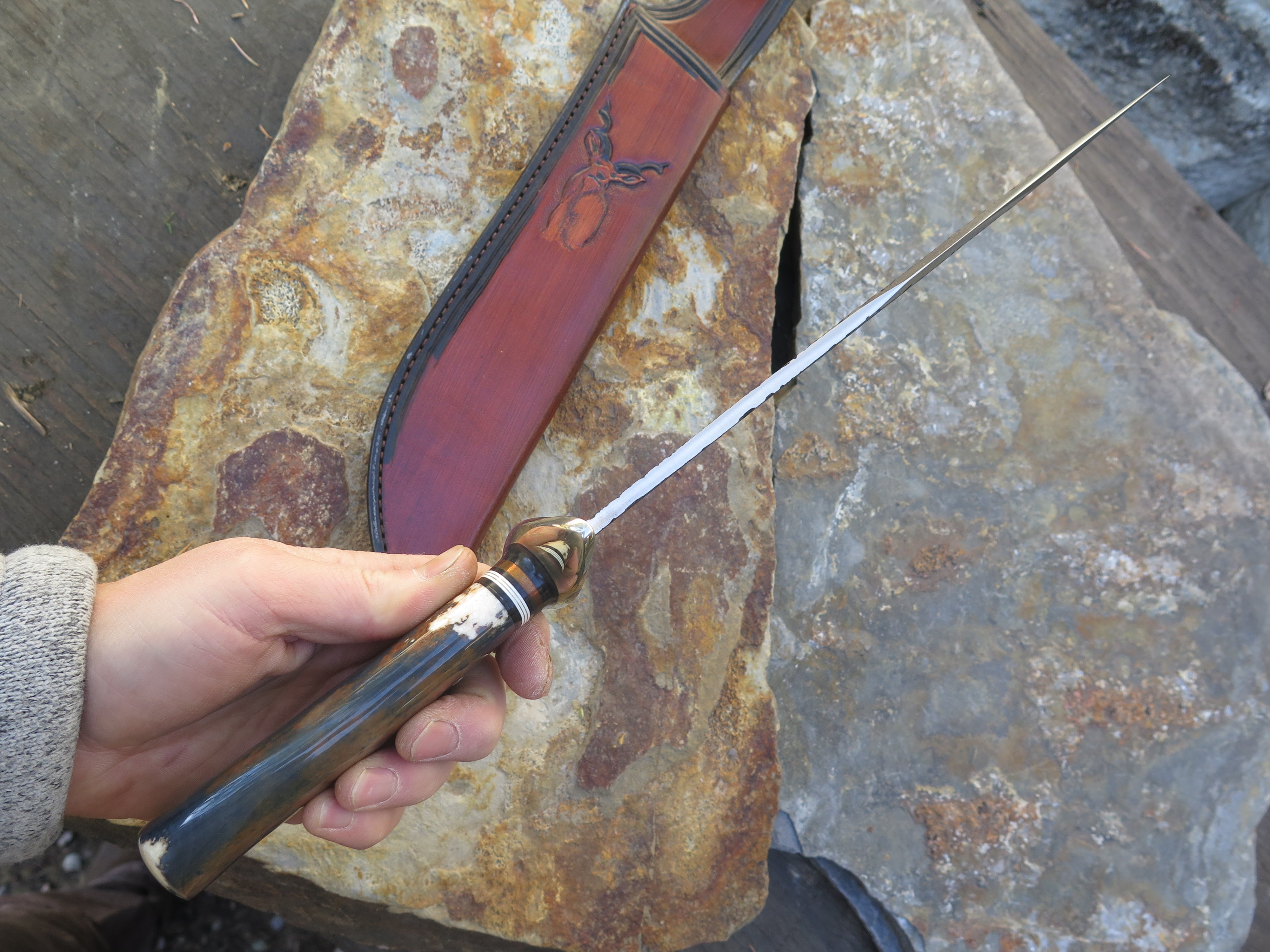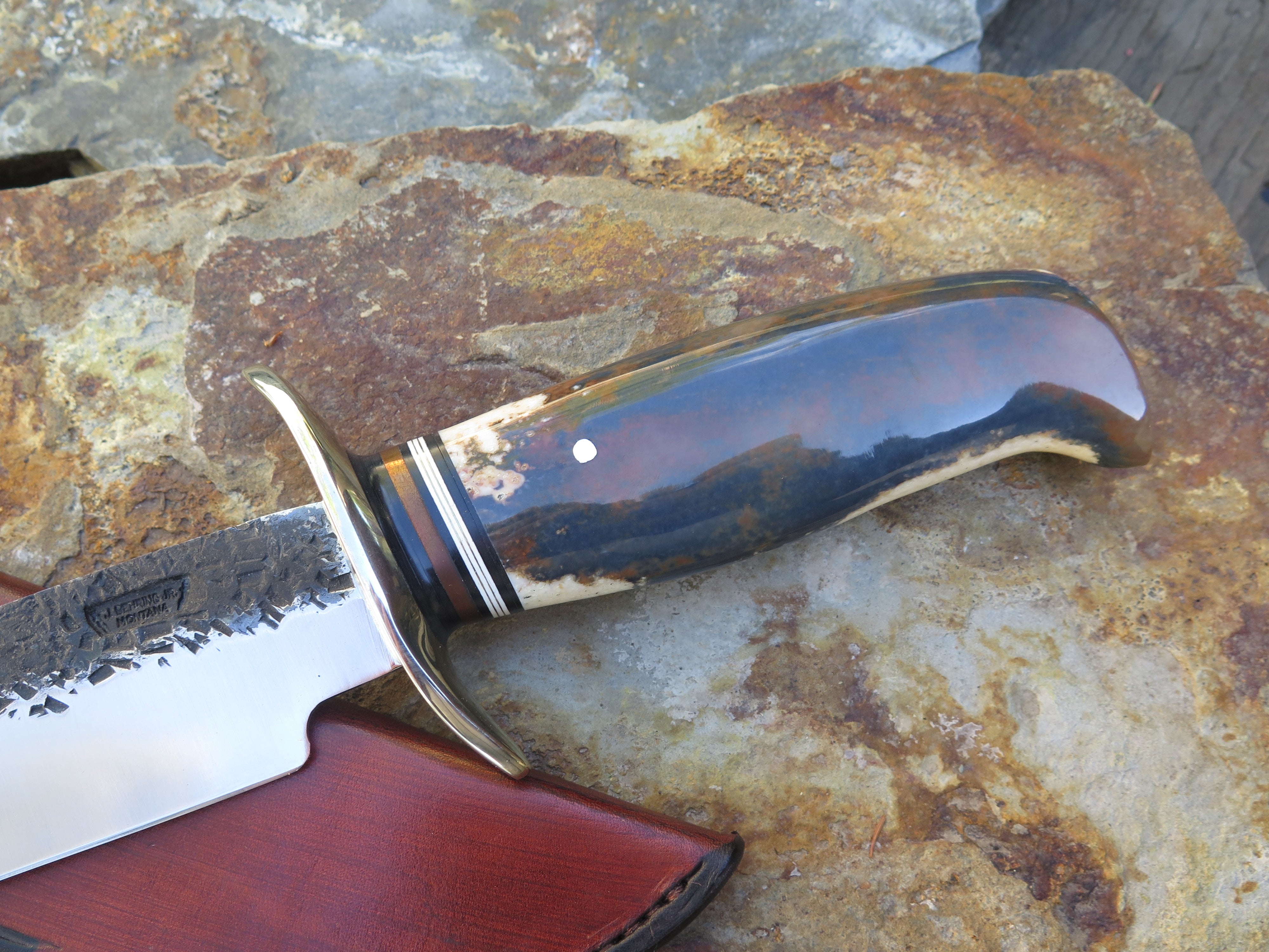 This beautiful Behring Made© Bowie is hand forged from 13/64" thick 5160 spring steel and it measures a whopping 10 1/2" from tip to guard with a razor sharp hollow grind and our hammermark finish. The forged nickel silver s-guard is soldered in place above black and white fiber, copper and brass spacers which top a high figure premium fossil walrus ivory handle that is also pinned through the tang with aluminum. The overall length measures 16" and it comes in custom sheath from Treestump Leather with a kudu tooled on the face.