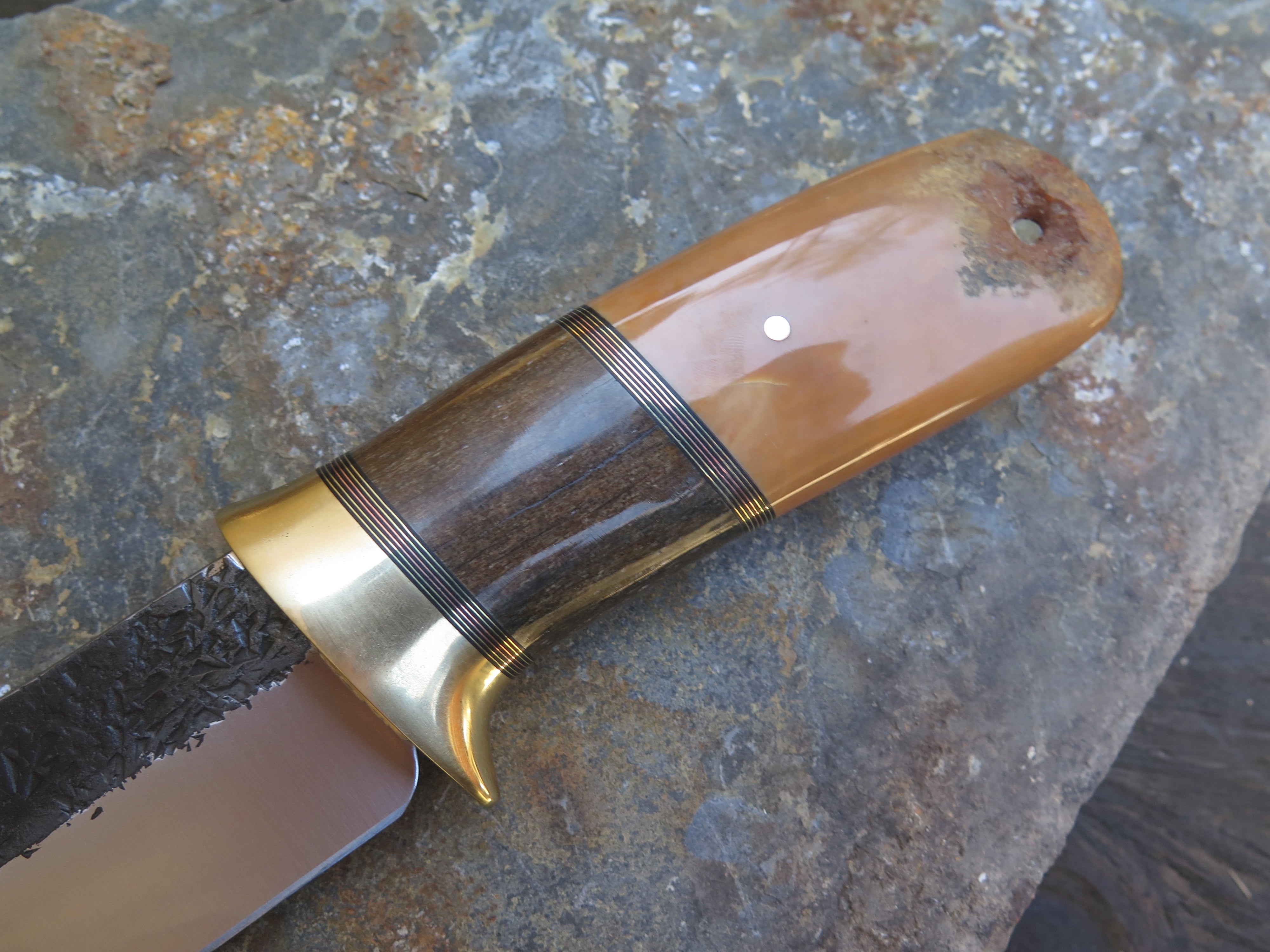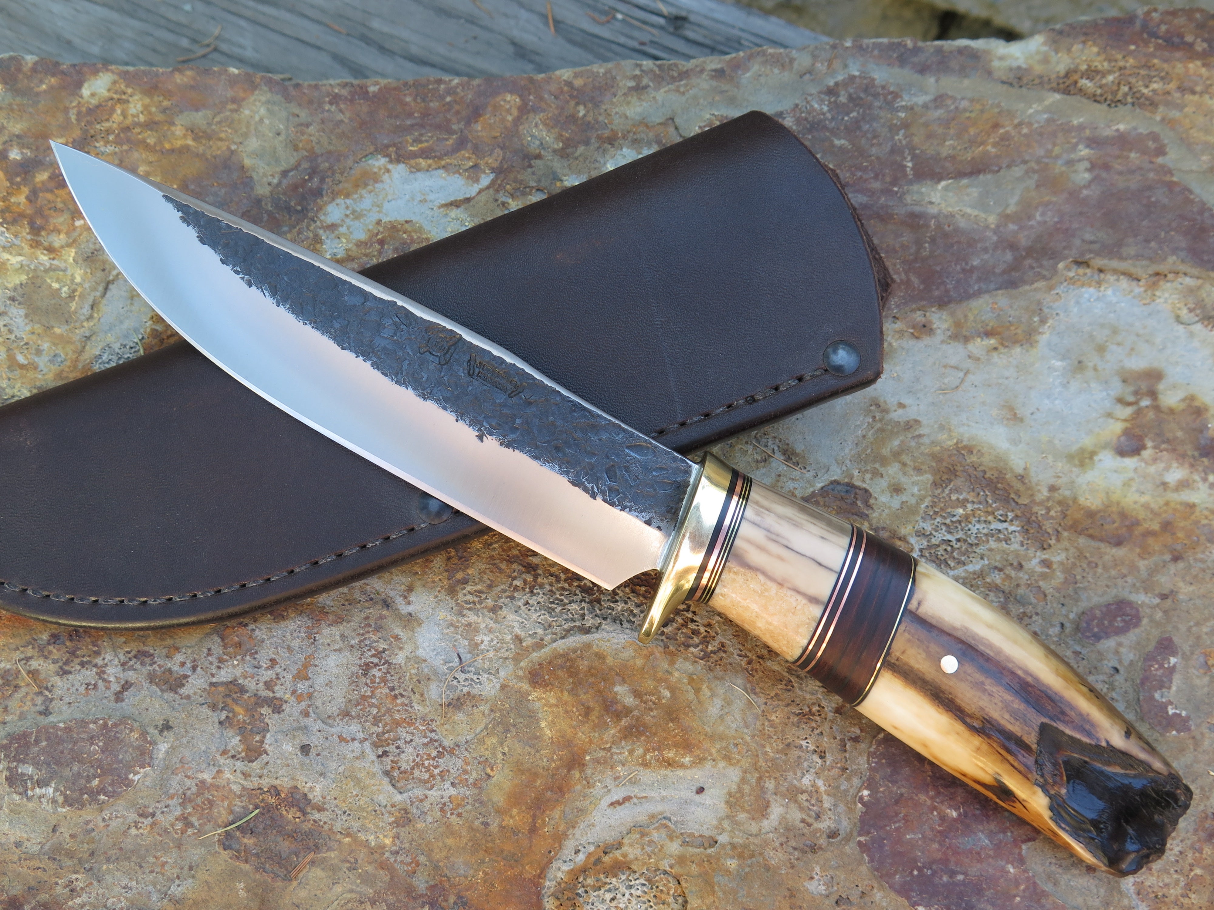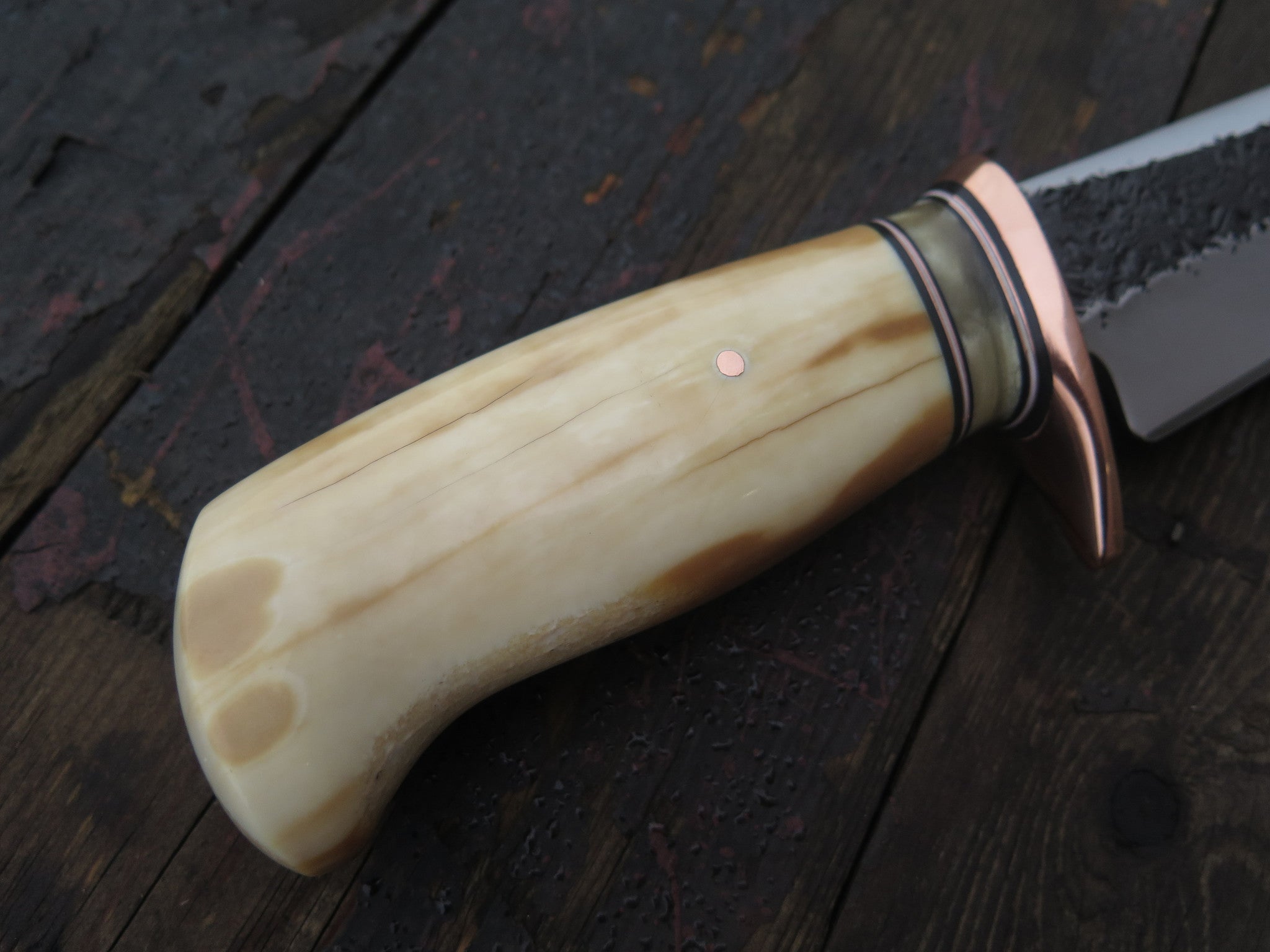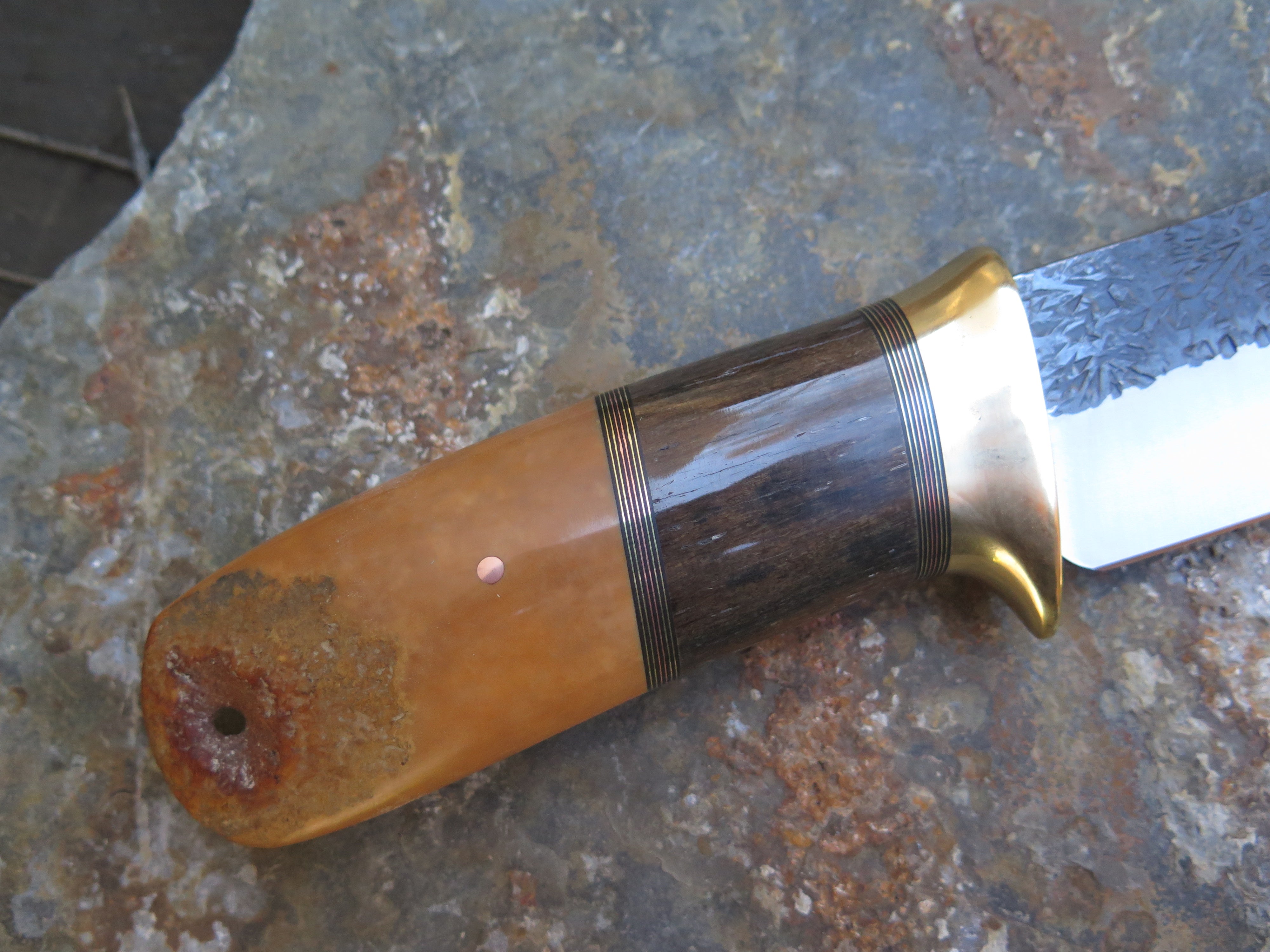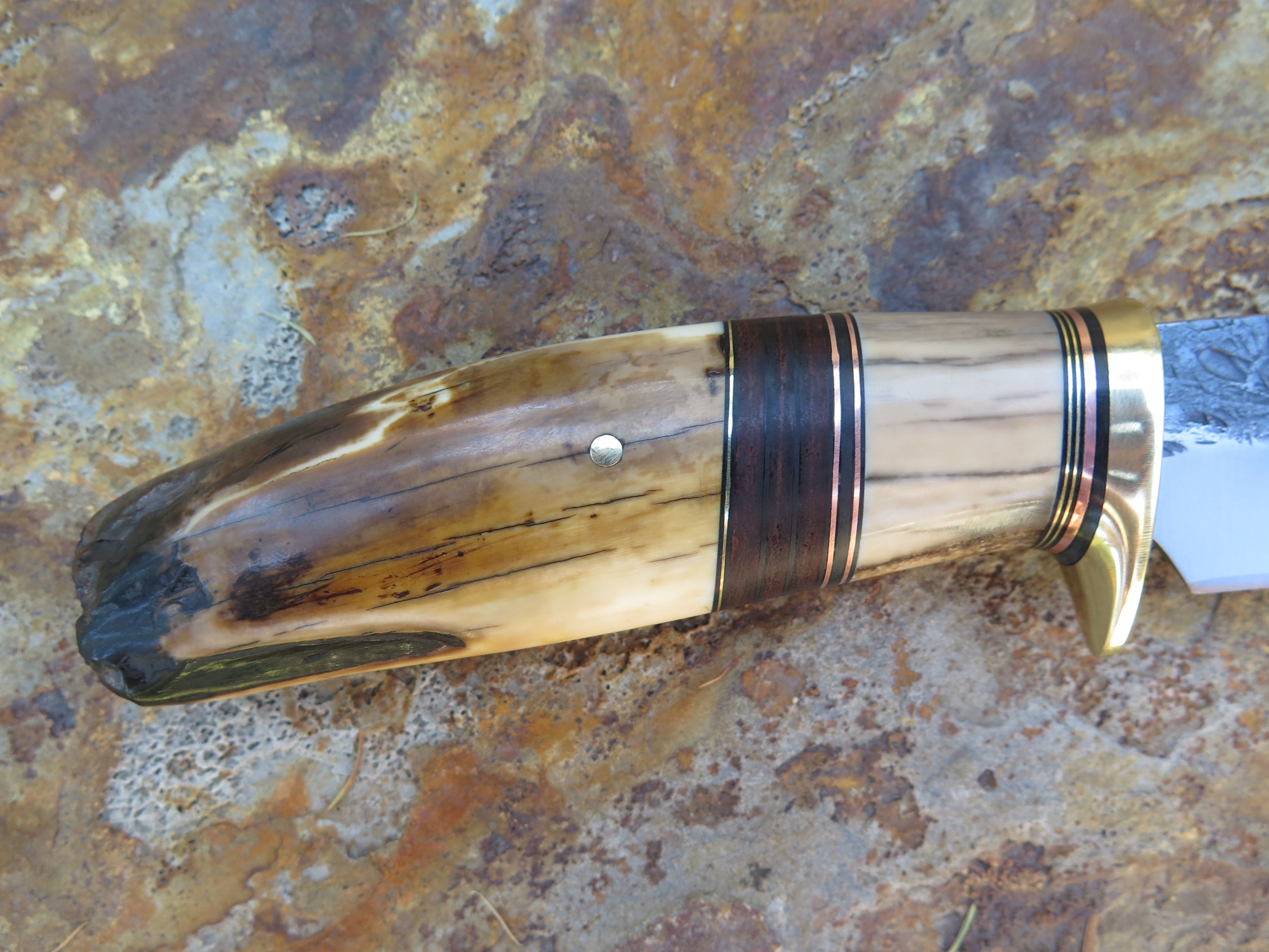 This outstanding new Camp Knife from Behring Made© is a stepped up drop point that'll tackle your camp jobs like a linebacker on a kicker. The blade is forged from 5160 spring steel and it measures 7 1/2" from tip to guard with a razor sharp hollow grind and our hammermark finish. The tall brass guard is soldered in place above black fiber, brass and copper spacers as well as a gorgeous artifact walrus ivory handle that we've pinned through the tang with brass. The overall length of this beast measures 12 1/4" and it comes in a custom sheath from Warlander Leather. *CONTACT TO ORDER