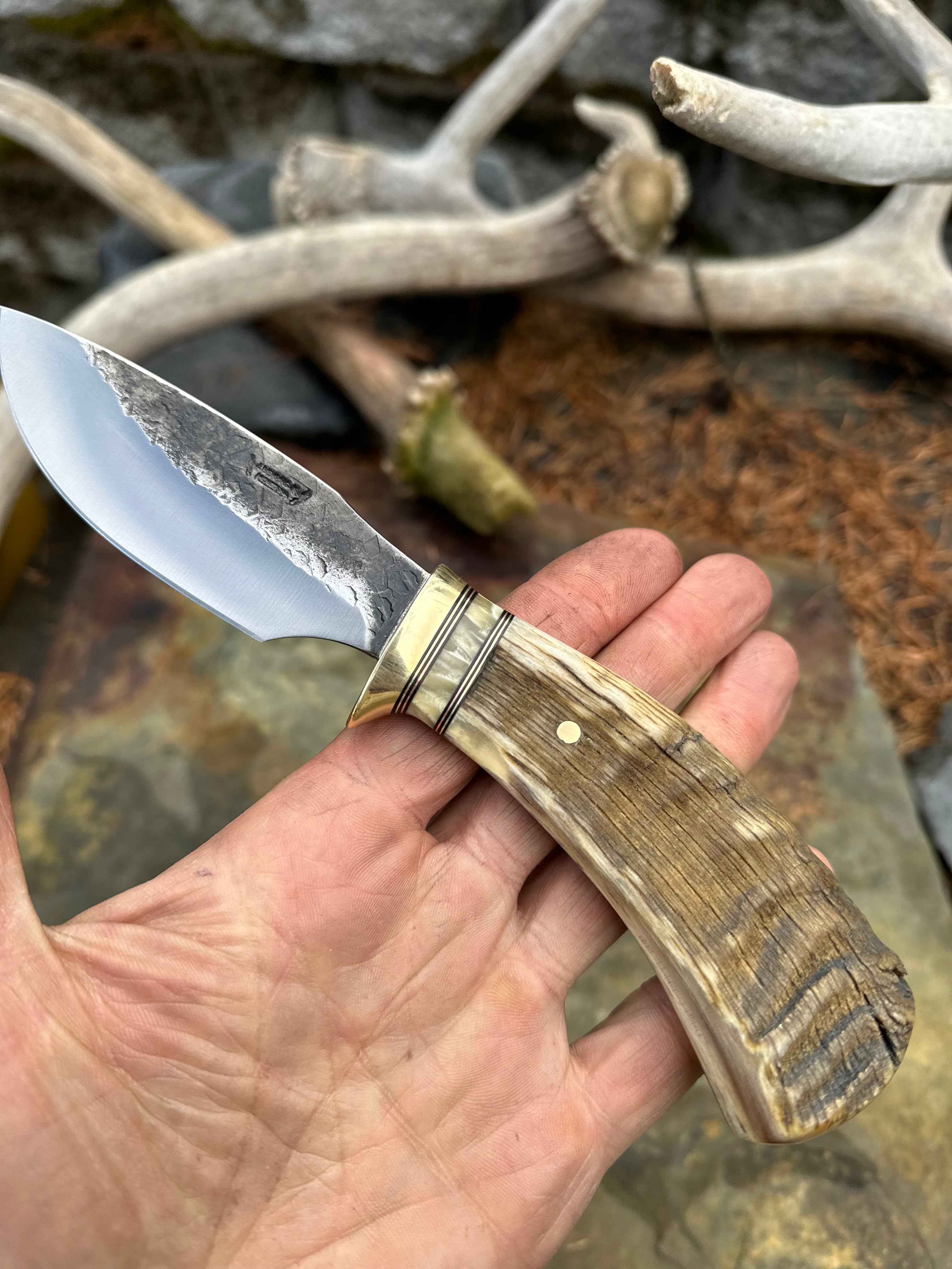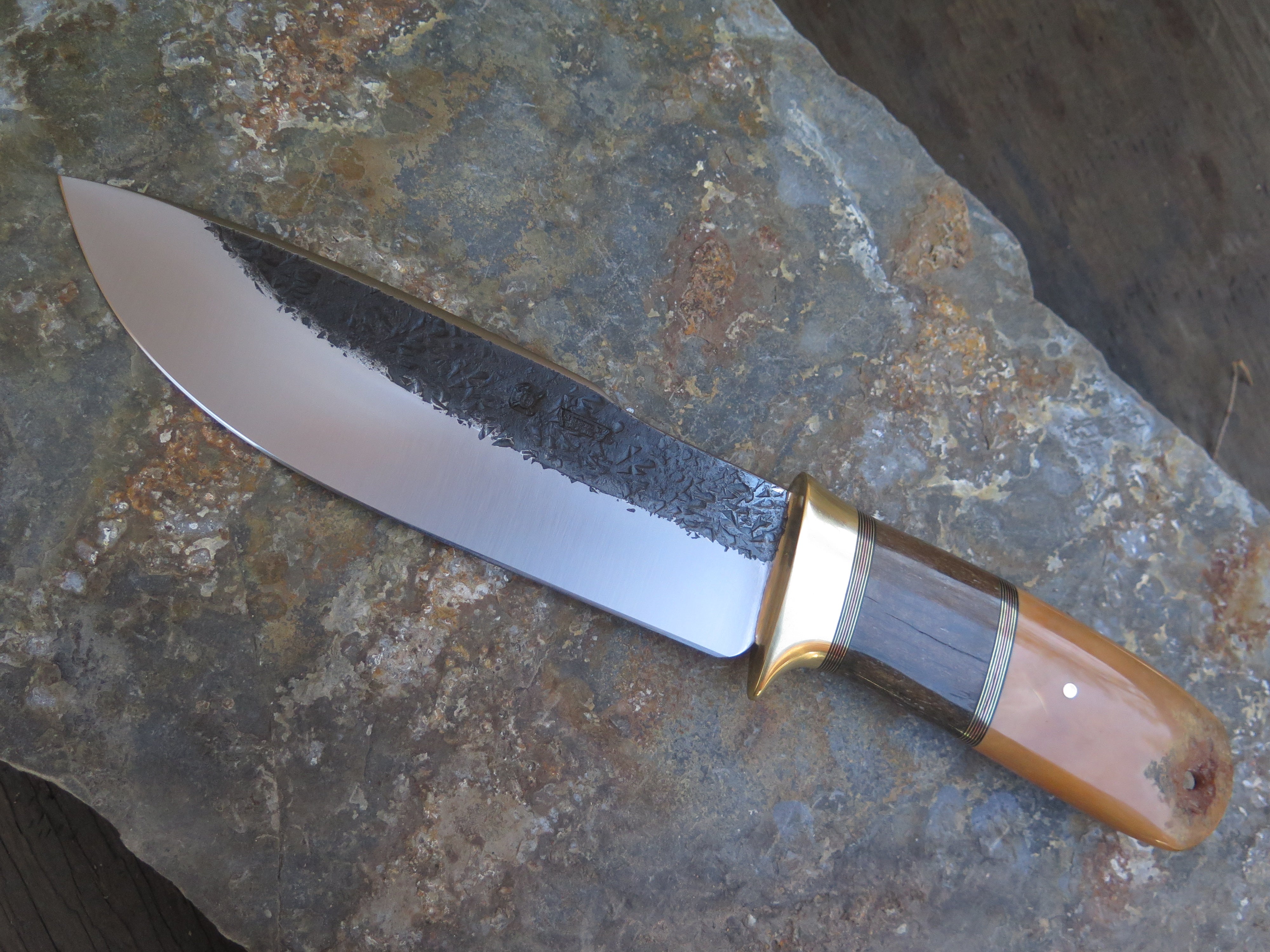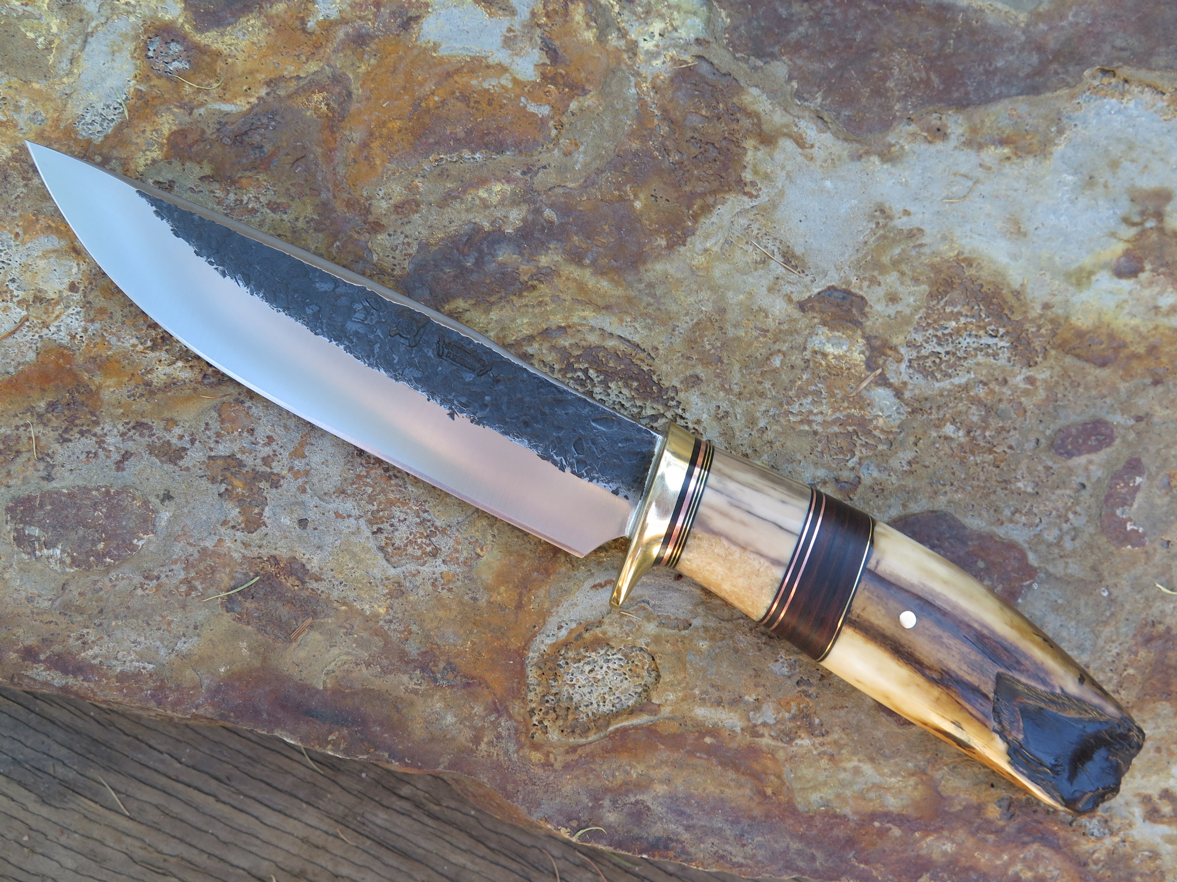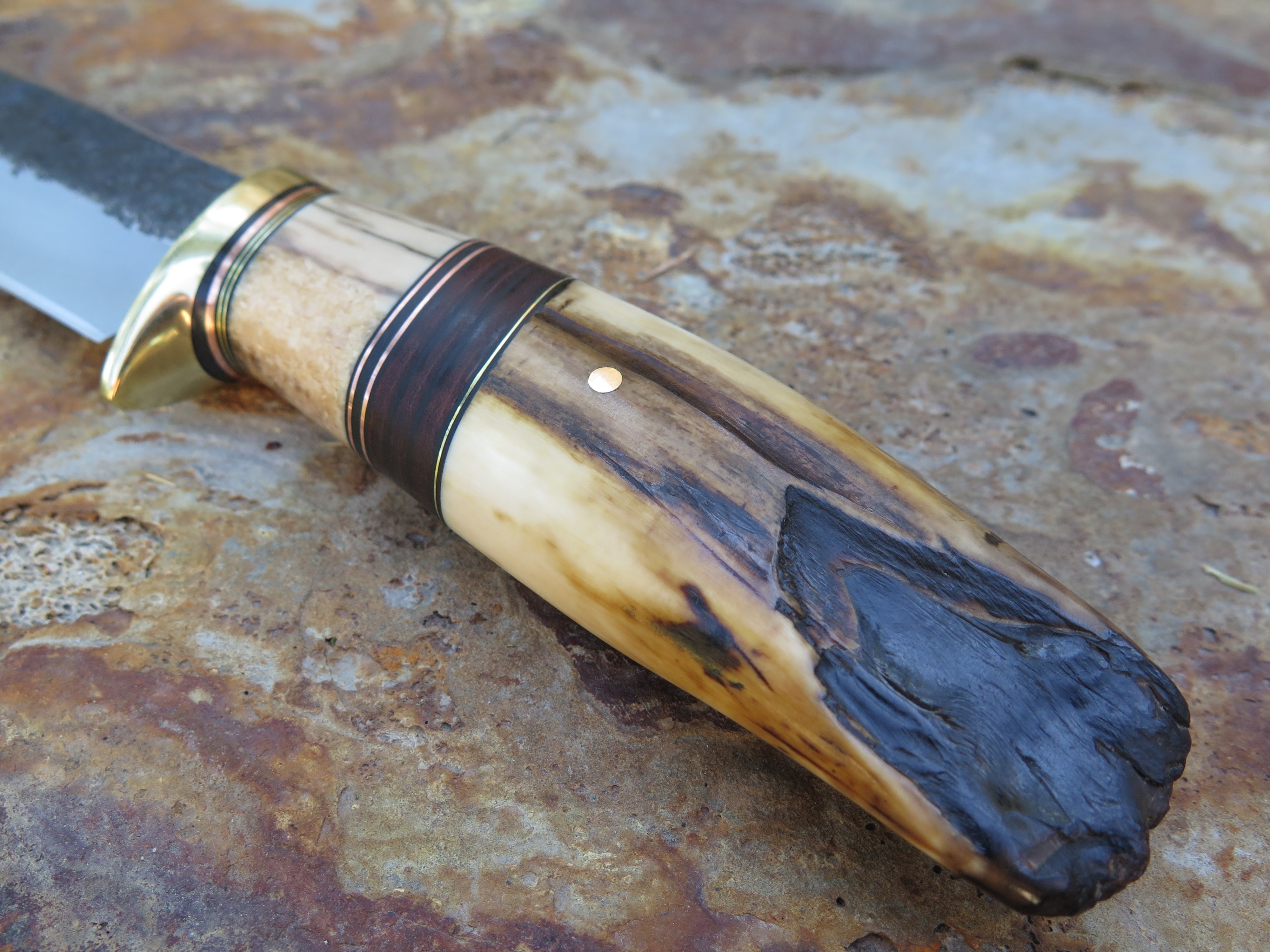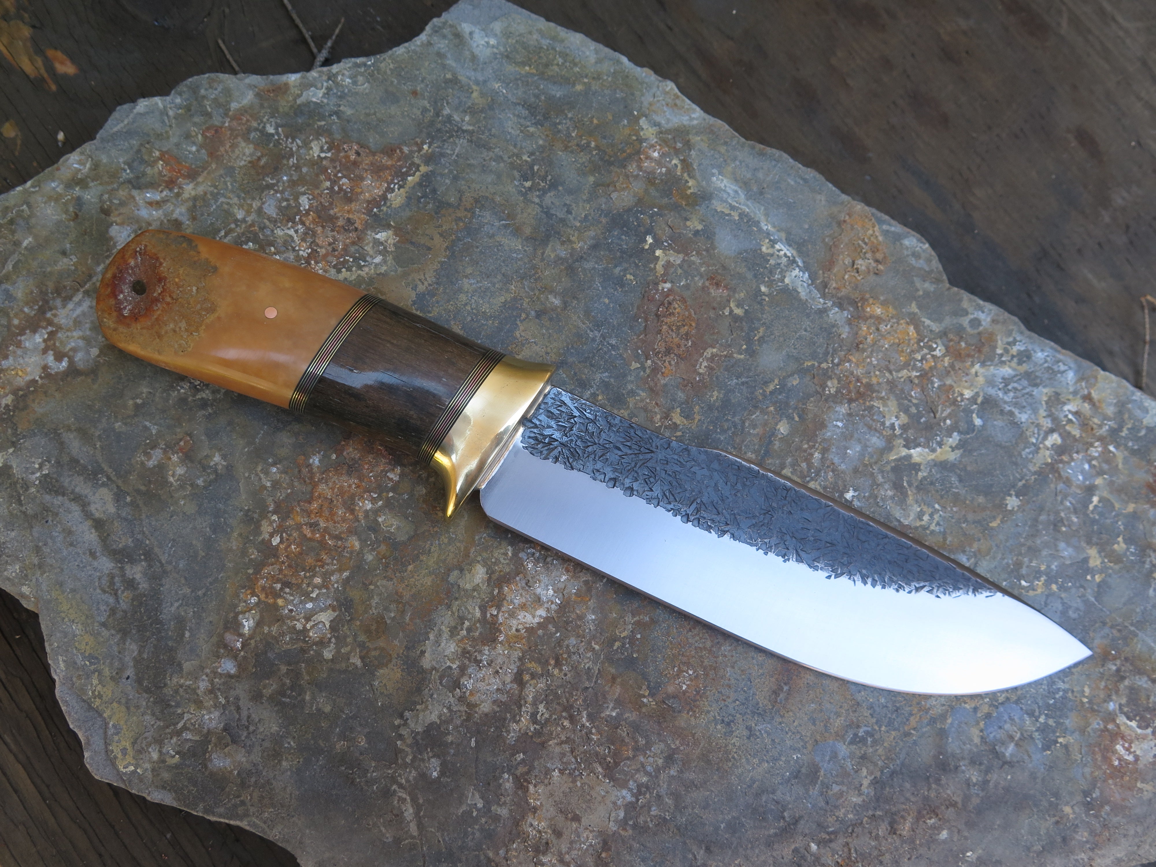 This outstanding new Camp Knife from Behring Made© is a stepped up drop point that'll tackle your camp jobs like a linebacker on a kicker. The blade is forged from 5160 spring steel and it measures 7 1/2" from tip to guard with a razor sharp hollow grind and our hammermark finish. The tall brass guard is soldered in place above black fiber, brass and copper spacers as well as a gorgeous artifact walrus ivory handle that we've pinned through the tang with brass. The overall length of this beast measures 12 1/4" and it comes in a custom sheath from Warlander Leather. *CONTACT TO ORDER
