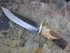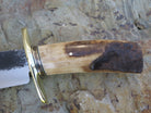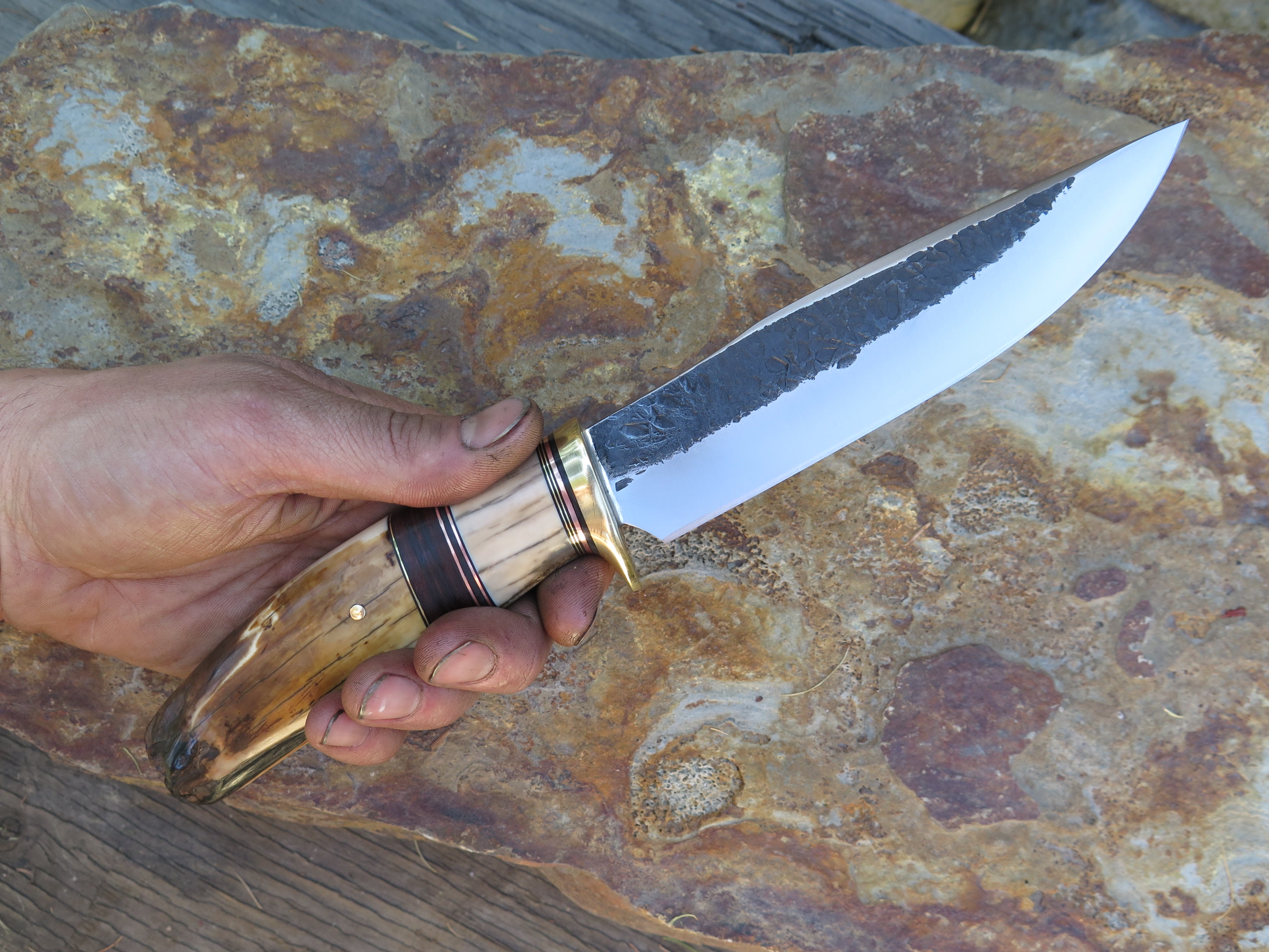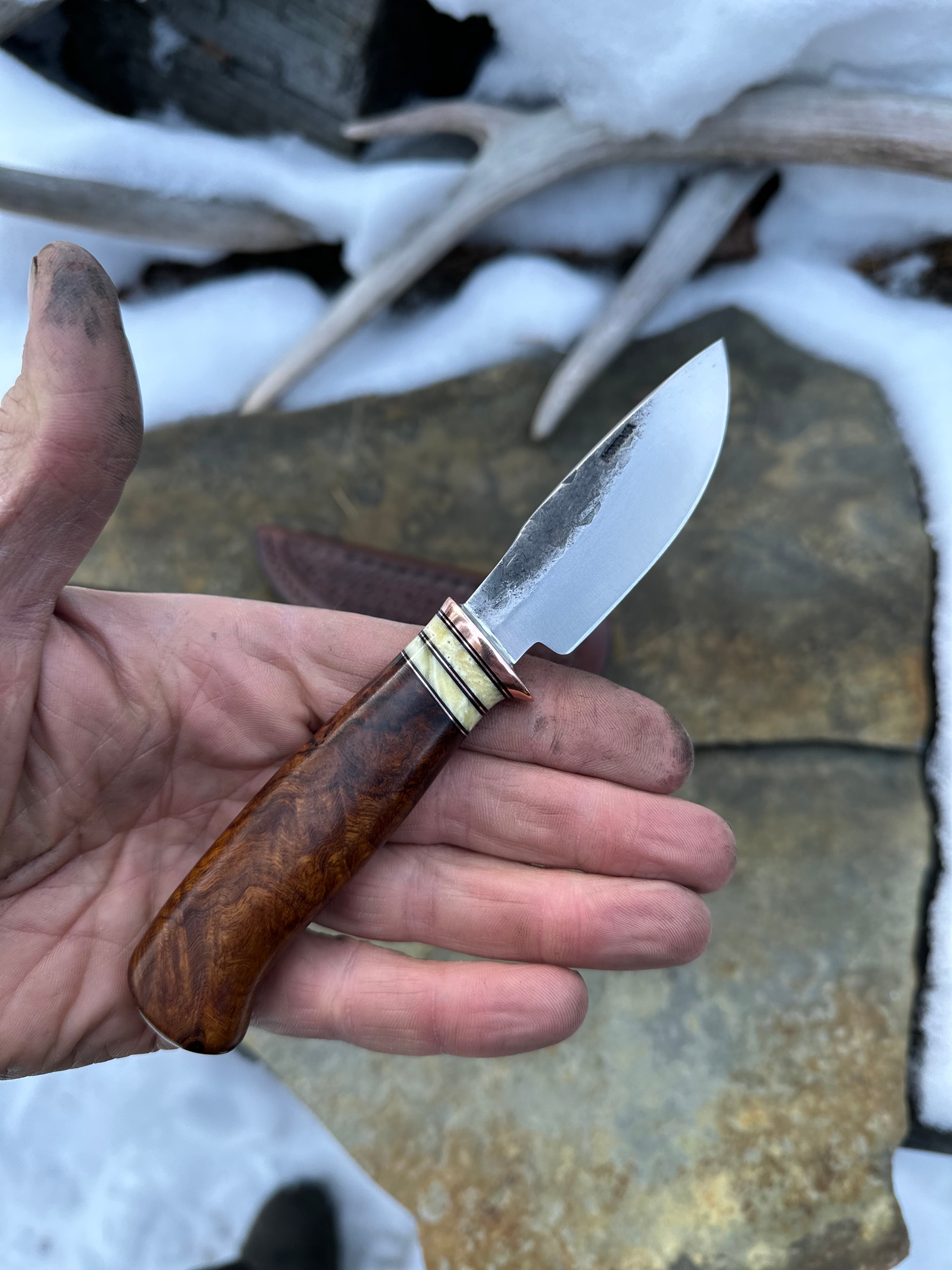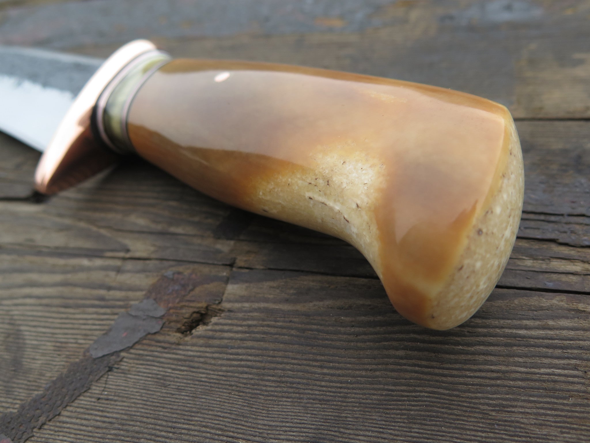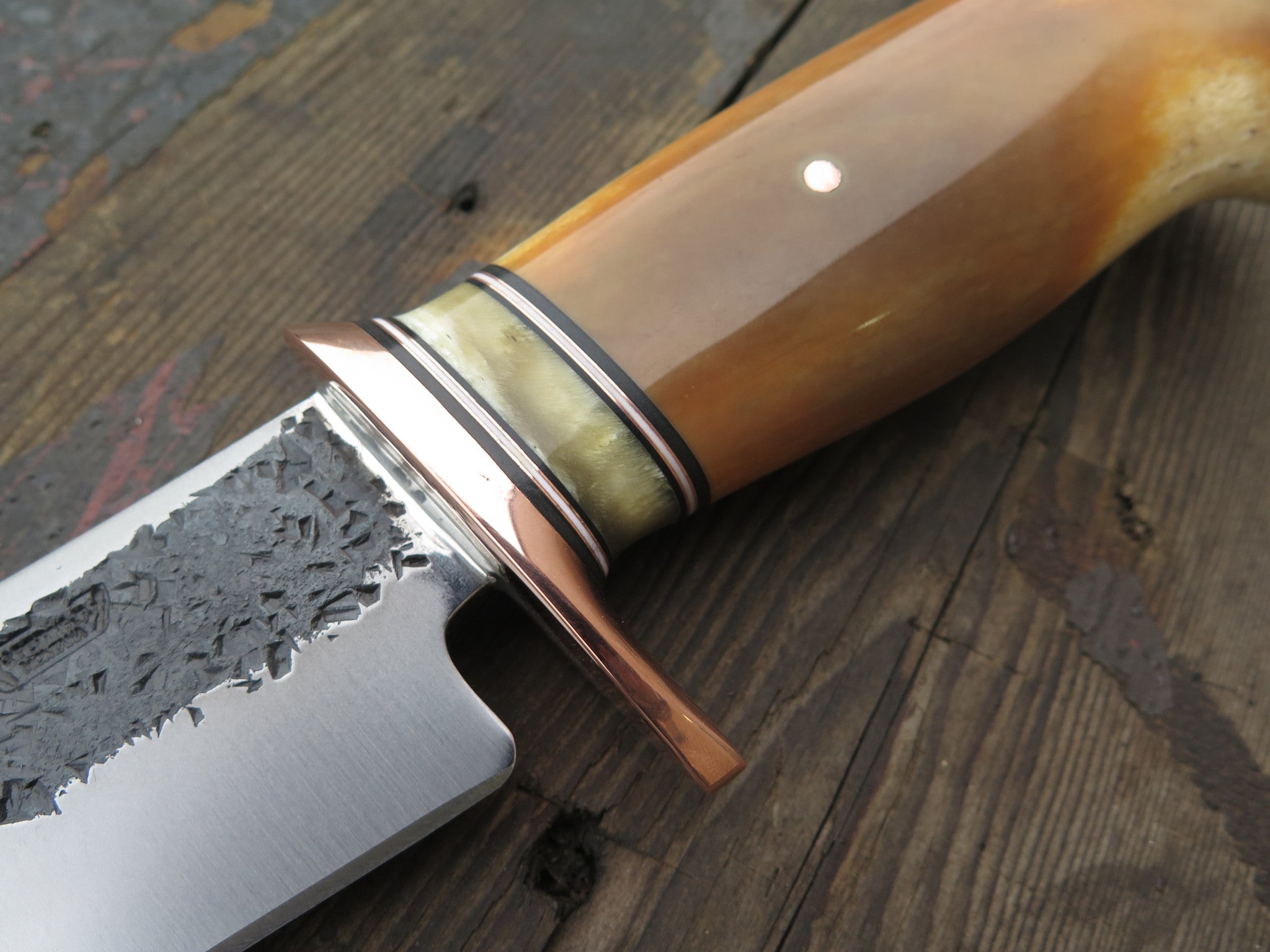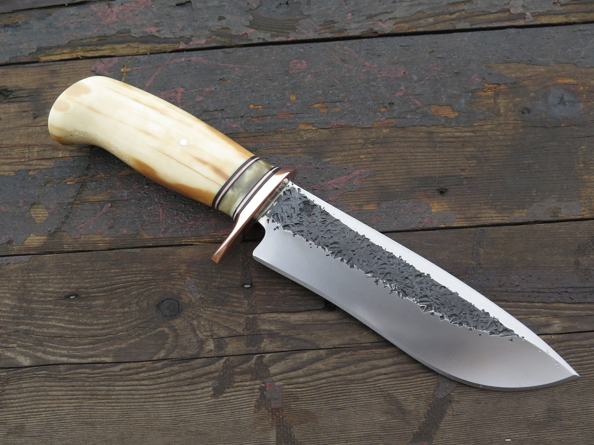 This outstanding new Camp Knife from Behring Made© is a stepped up drop point that'll tackle your camp jobs like a linebacker on a kicker. The blade is forged from 5160 spring steel and it measures 7 1/2" from tip to guard with a razor sharp hollow grind and our hammermark finish. The tall brass guard is soldered in place above black fiber, brass and copper spacers as well as a gorgeous artifact walrus ivory handle that we've pinned through the tang with brass. The overall length of this beast measures 12 1/4" and it comes in a custom sheath from Warlander Leather. *CONTACT TO ORDER