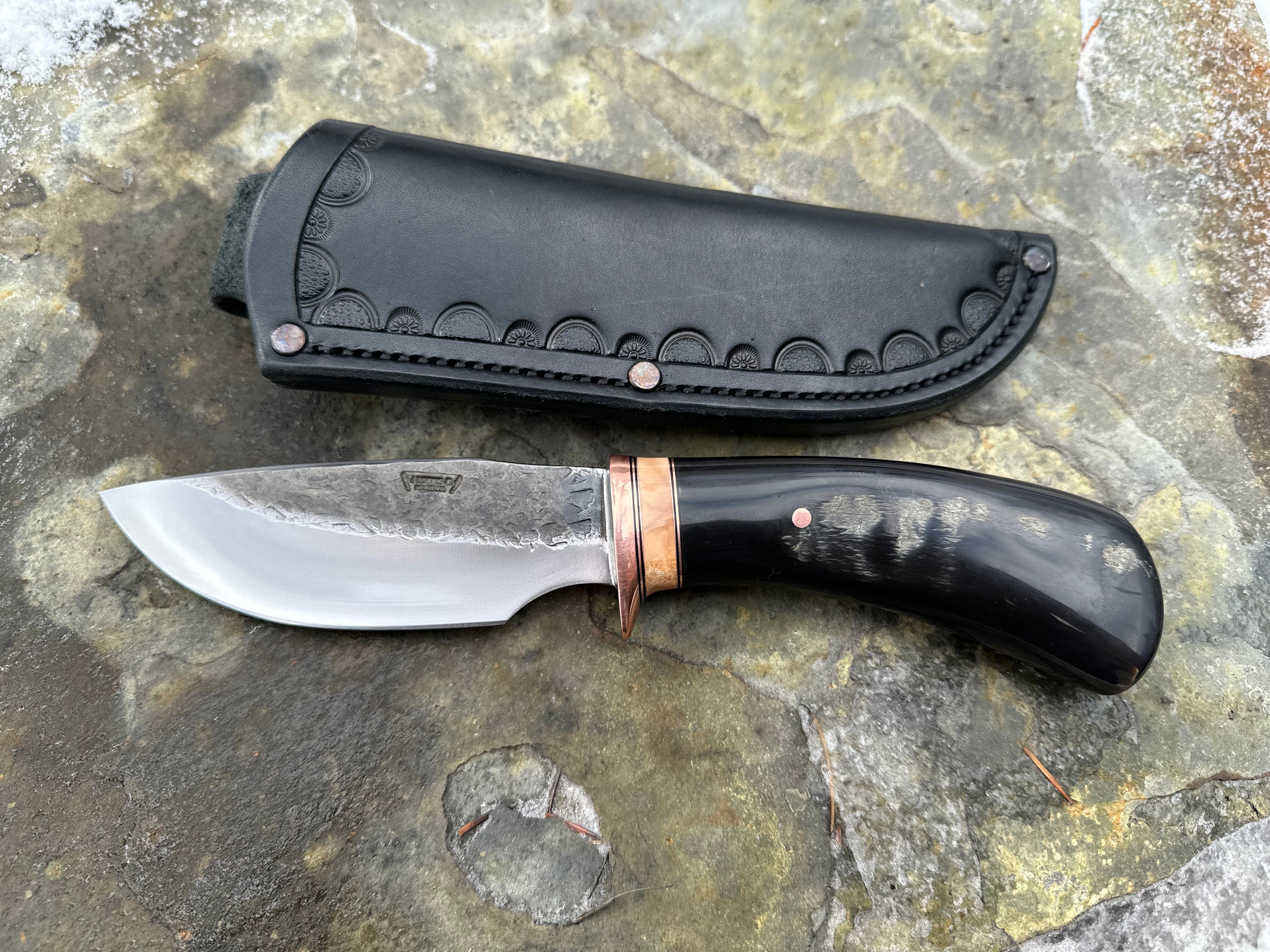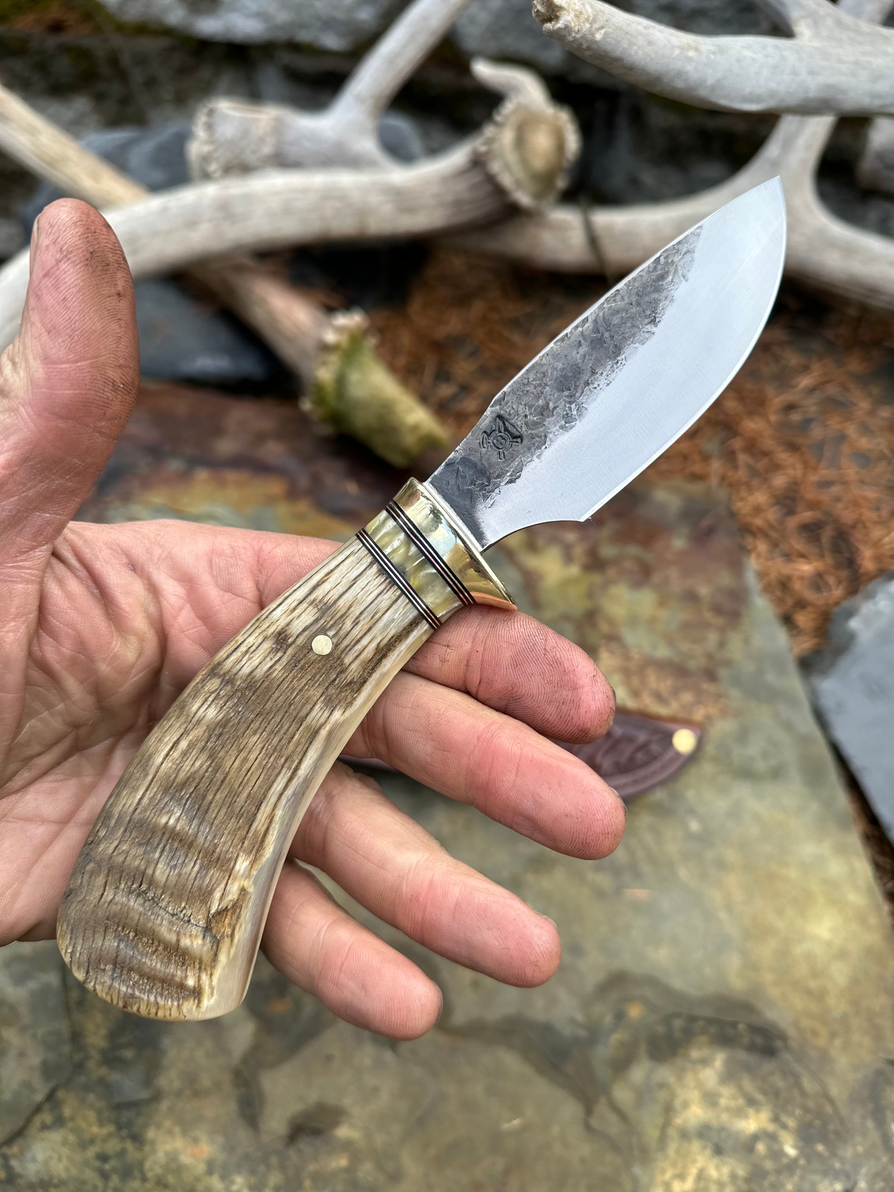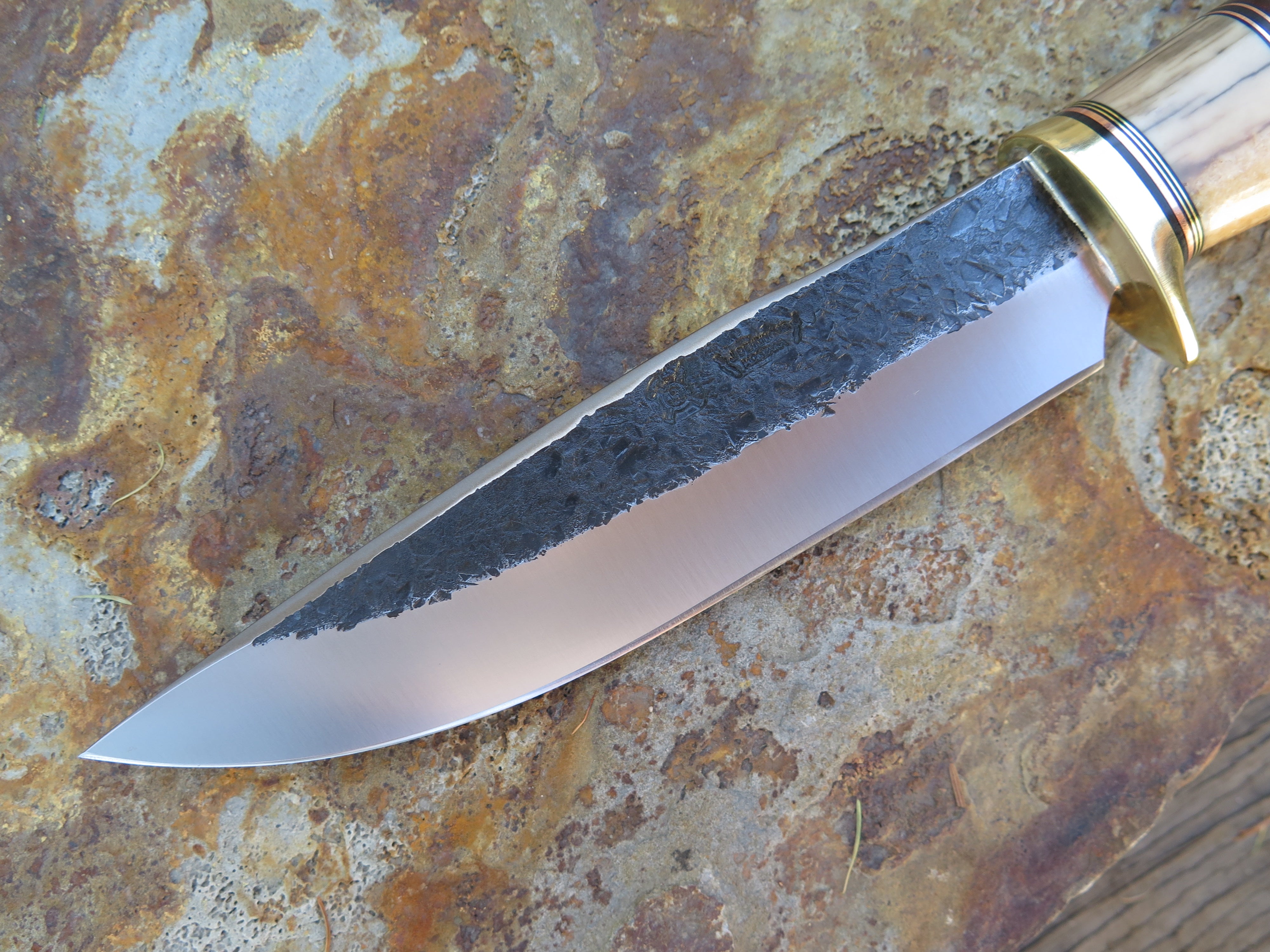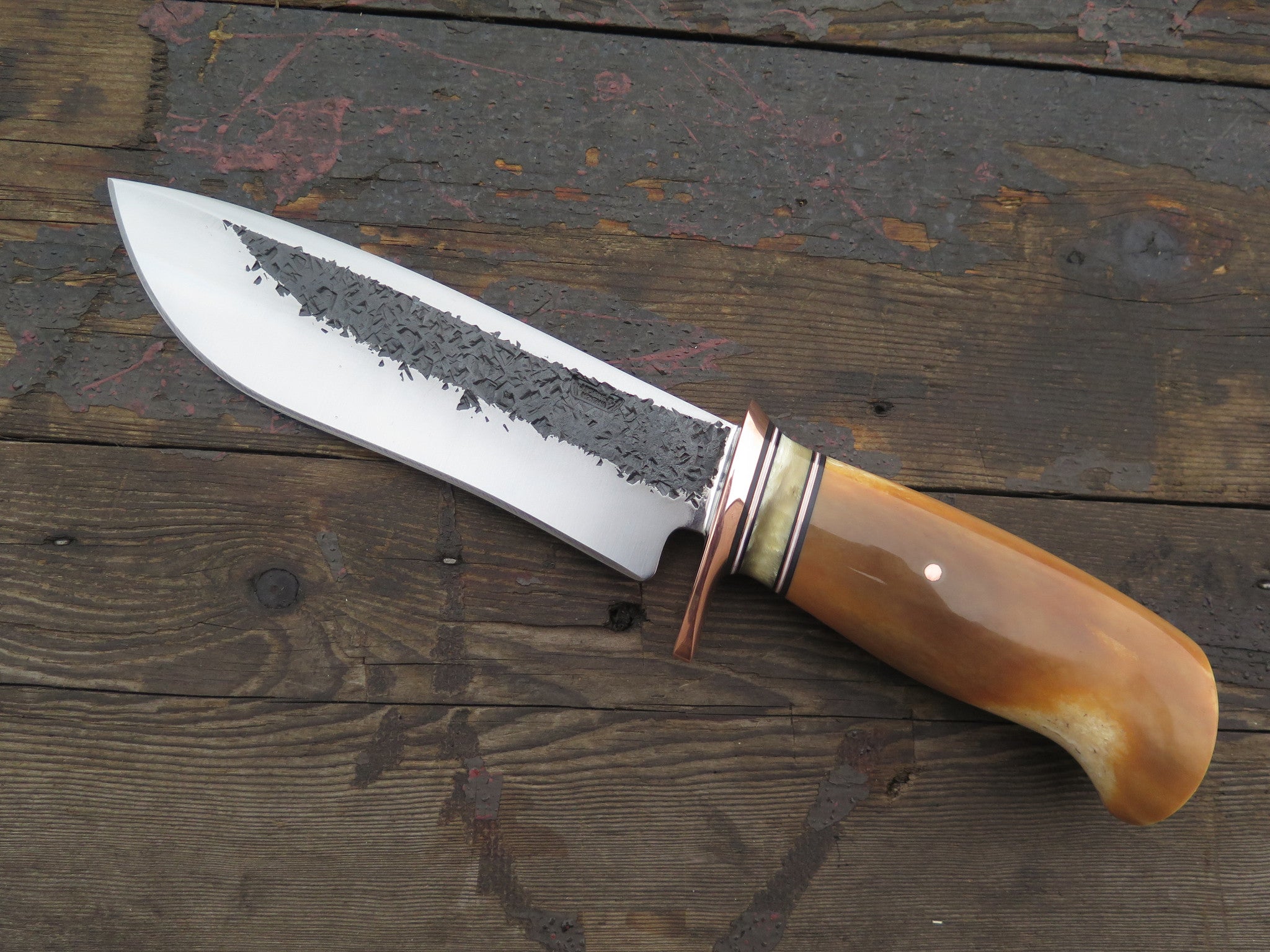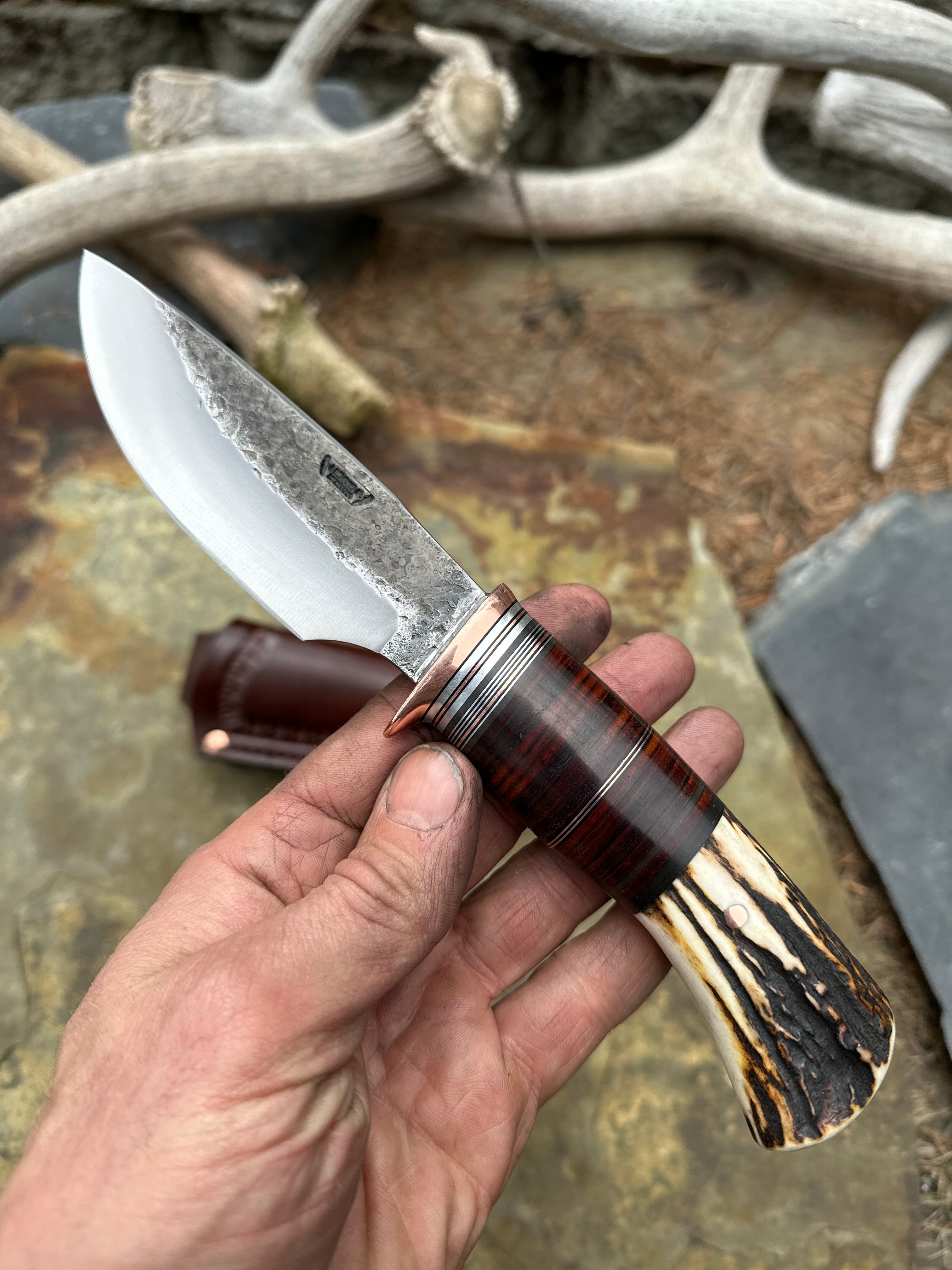 This outstanding new Camp Knife from Behring Made© is a stepped up drop point that'll tackle your camp jobs like a linebacker on a kicker. The blade is forged from 5160 spring steel and it measures 7 1/2" from tip to guard with a razor sharp hollow grind and our hammermark finish. The tall brass guard is soldered in place above black fiber, brass and copper spacers as well as a gorgeous artifact walrus ivory handle that we've pinned through the tang with brass. The overall length of this beast measures 12 1/4" and it comes in a custom sheath from Warlander Leather. *CONTACT TO ORDER
