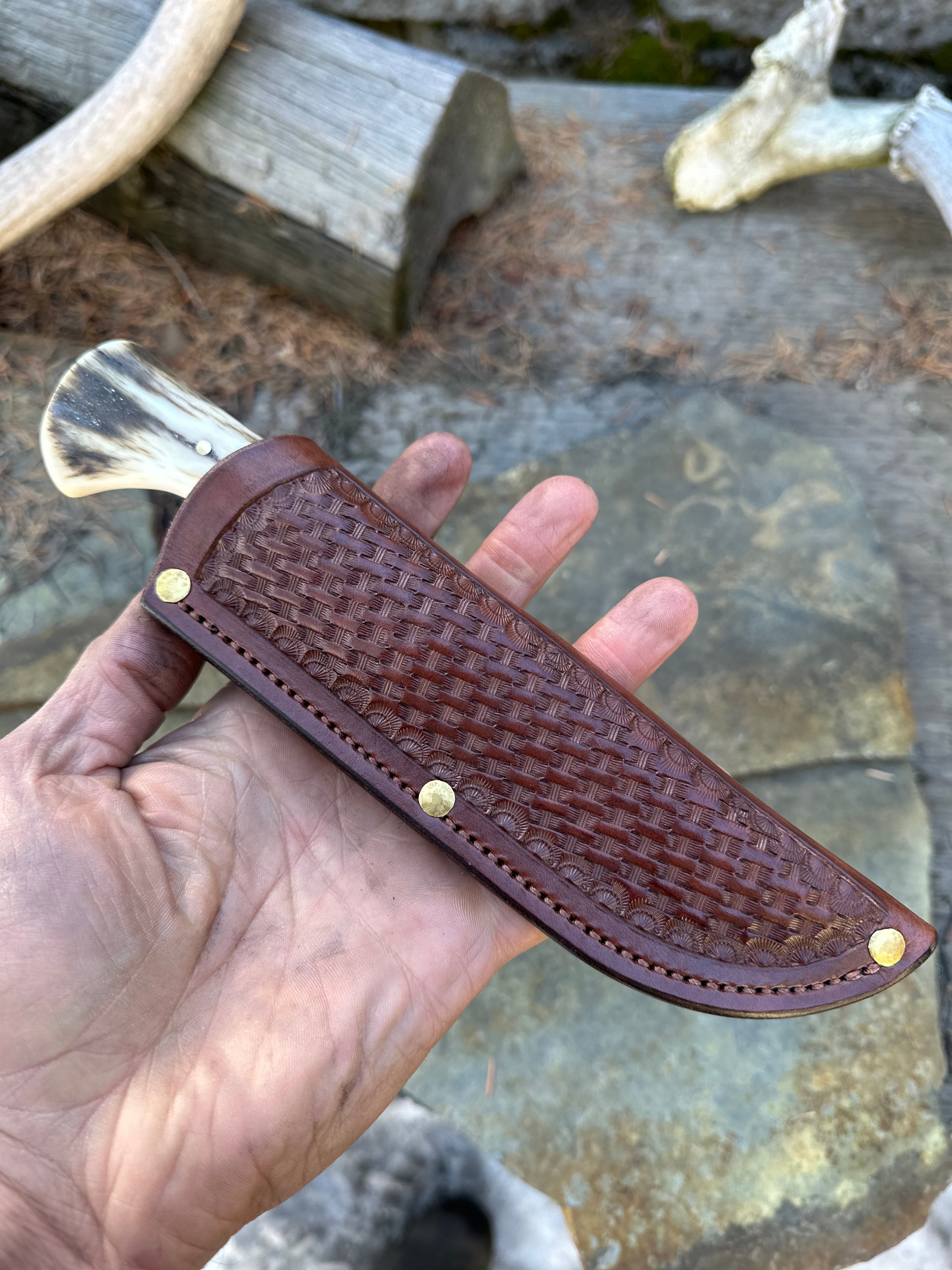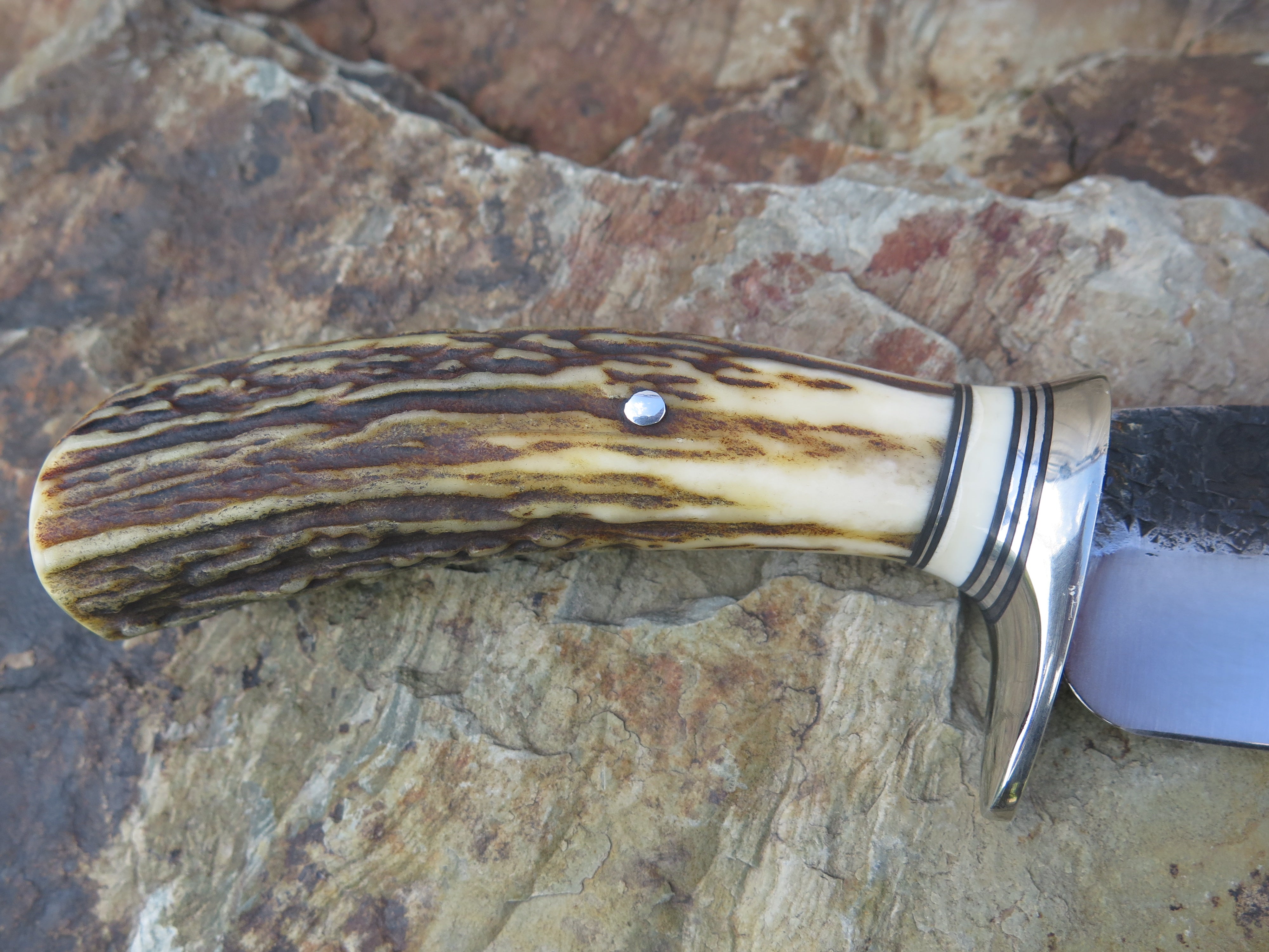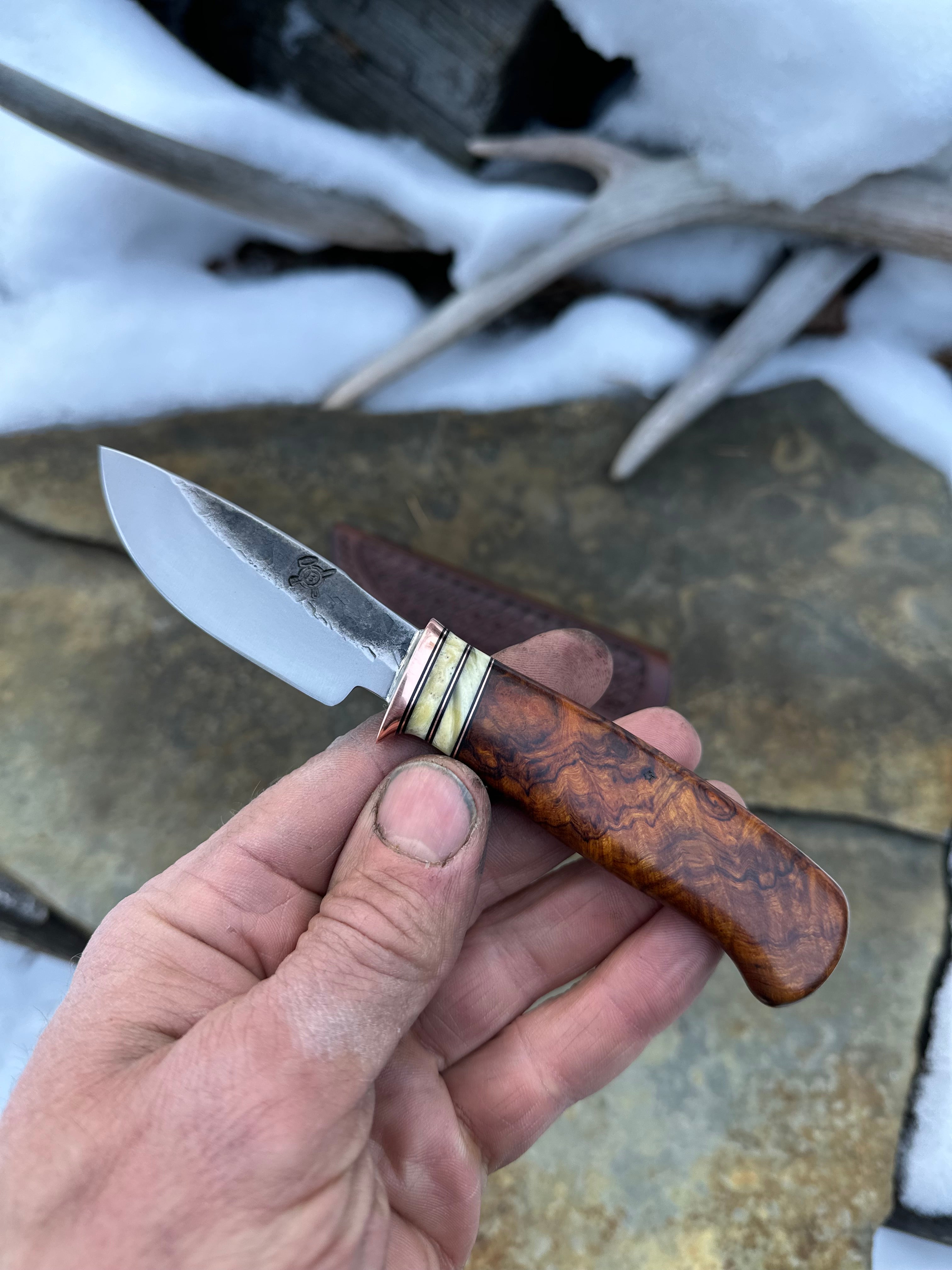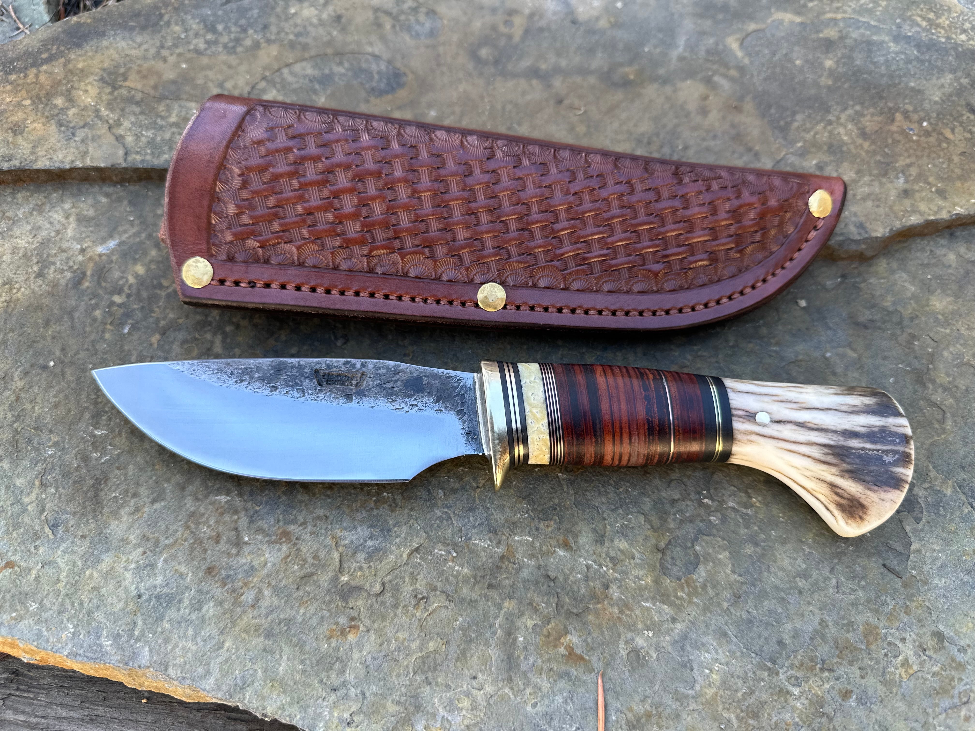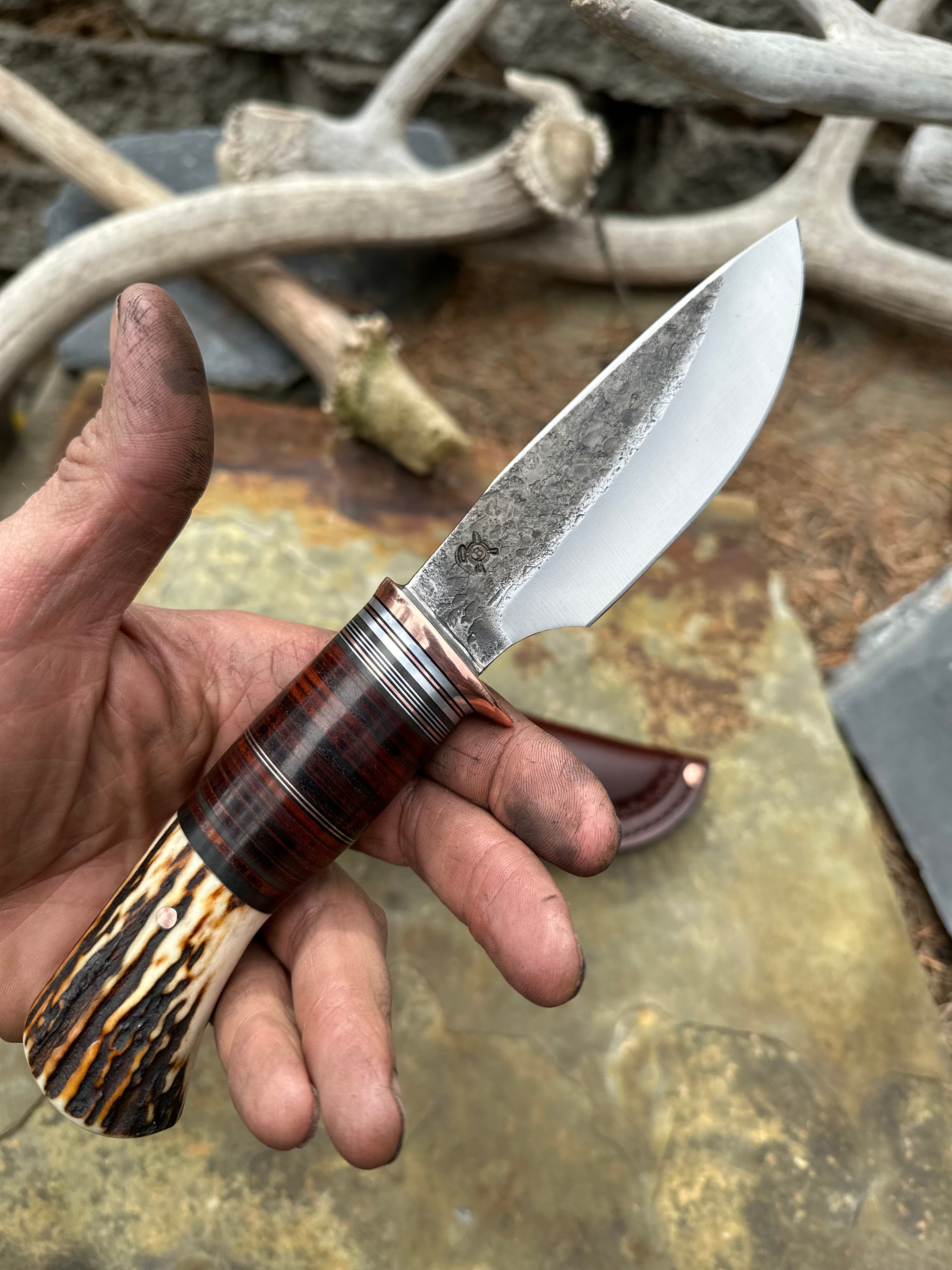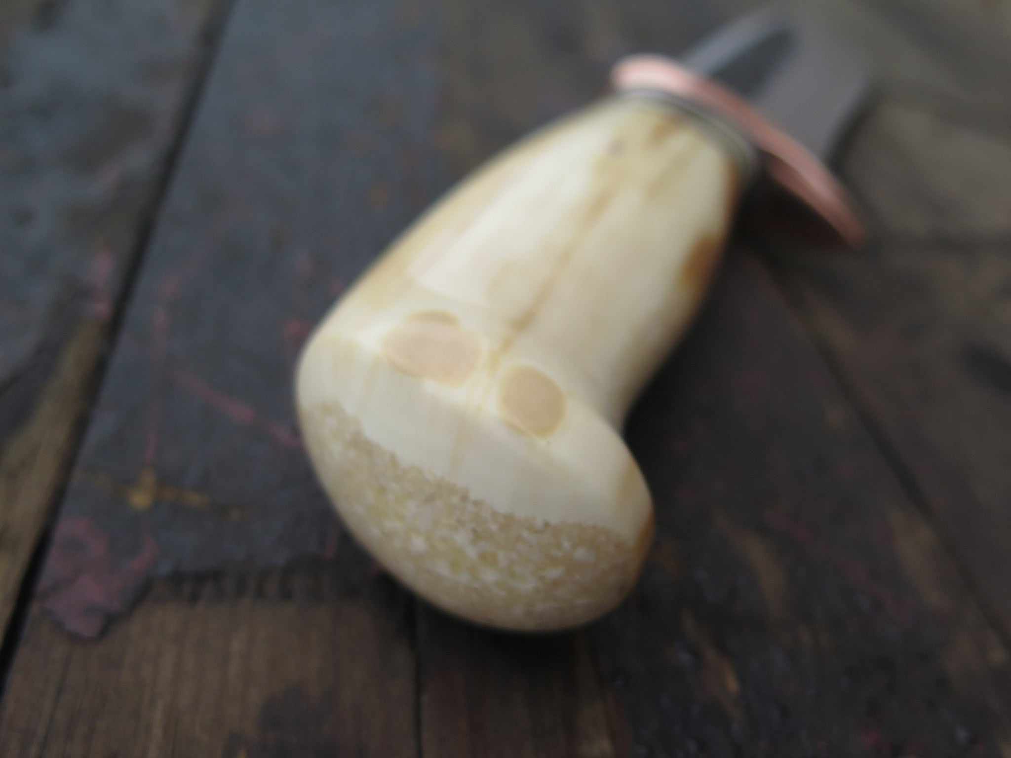 This outstanding new Camp Knife from Behring Made© is a stepped up drop point that'll tackle your camp jobs like a linebacker on a kicker. The blade is forged from 5160 spring steel and it measures 7 1/2" from tip to guard with a razor sharp hollow grind and our hammermark finish. The tall brass guard is soldered in place above black fiber, brass and copper spacers as well as a gorgeous artifact walrus ivory handle that we've pinned through the tang with brass. The overall length of this beast measures 12 1/4" and it comes in a custom sheath from Warlander Leather. *CONTACT TO ORDER