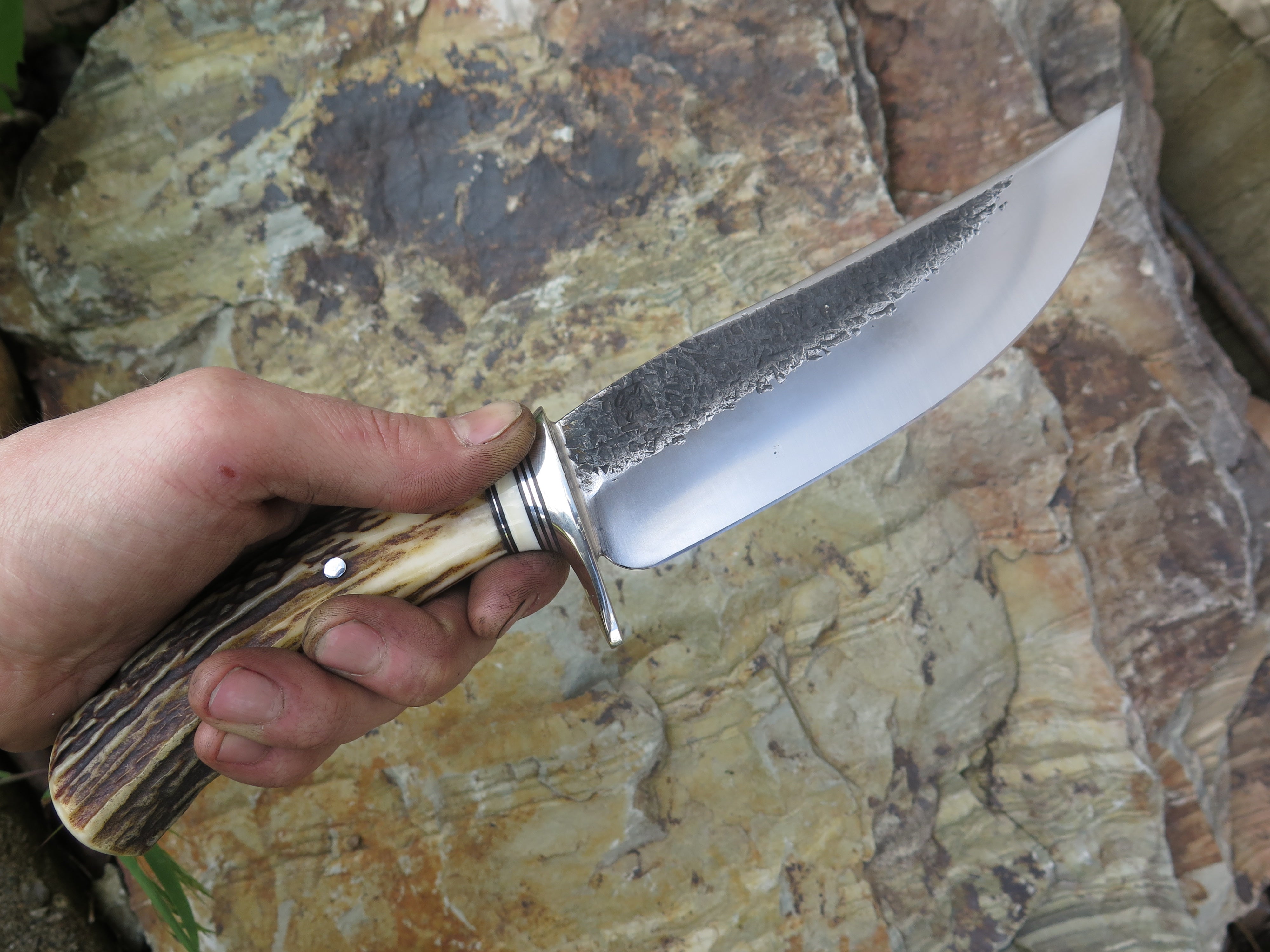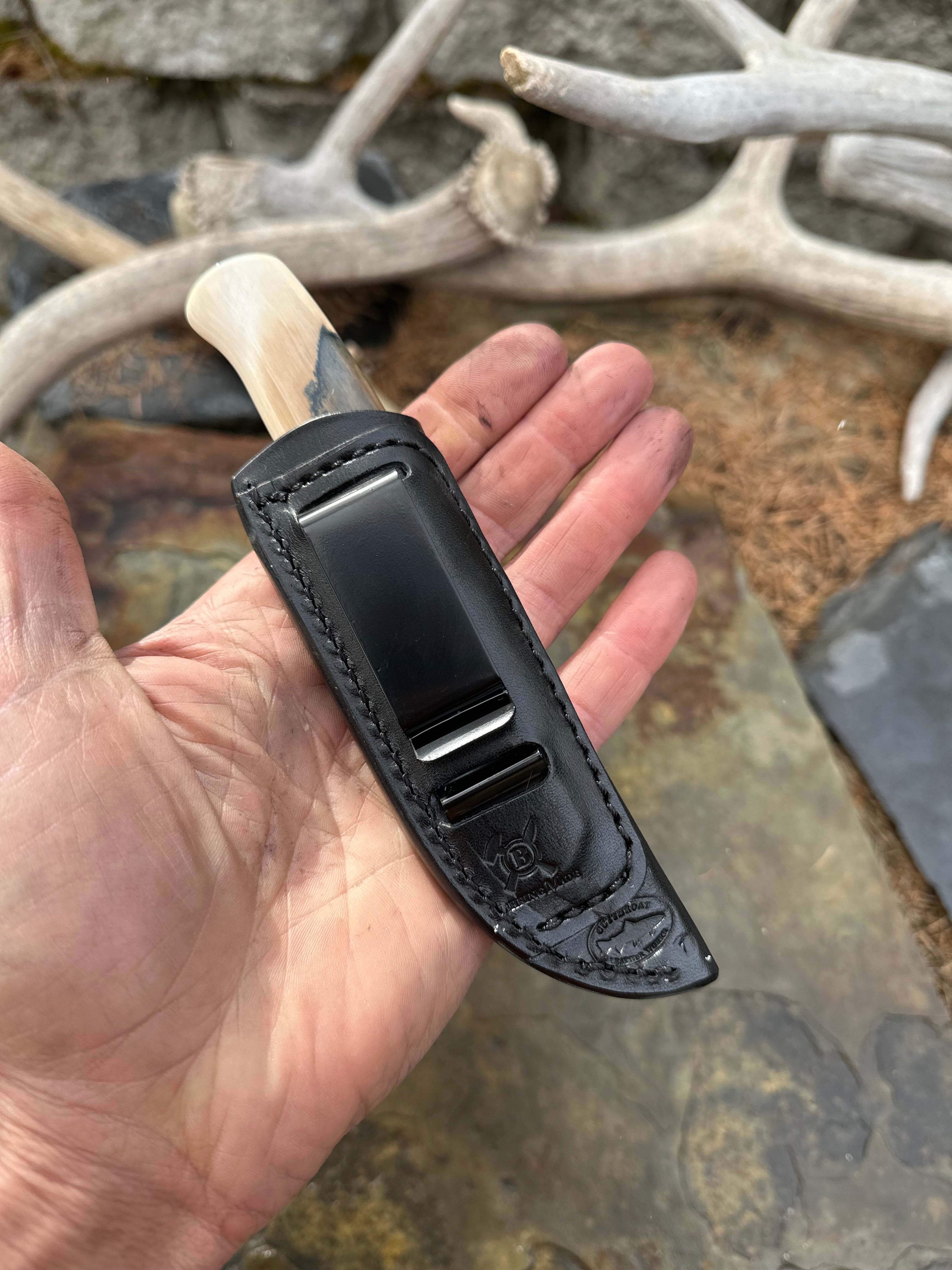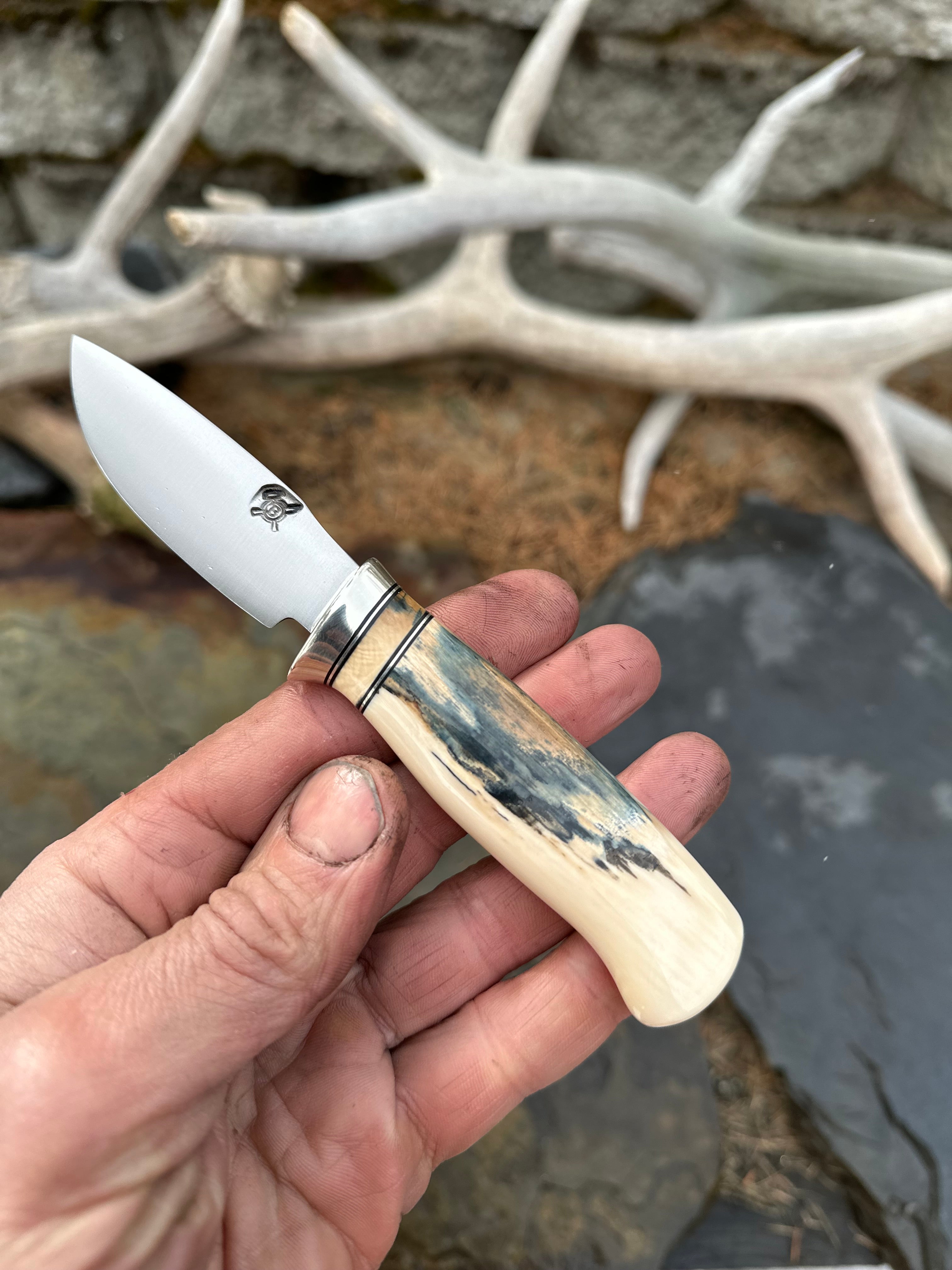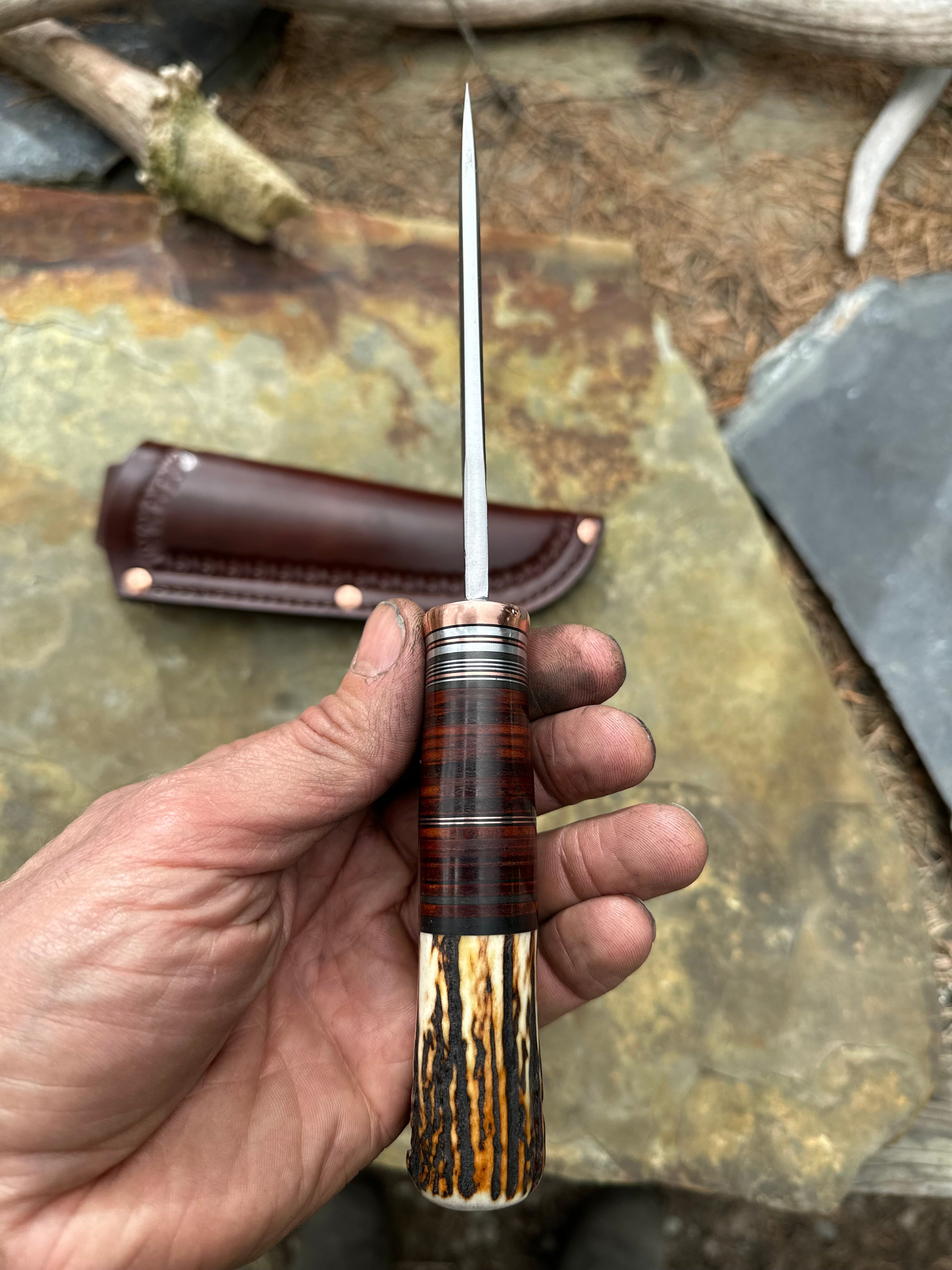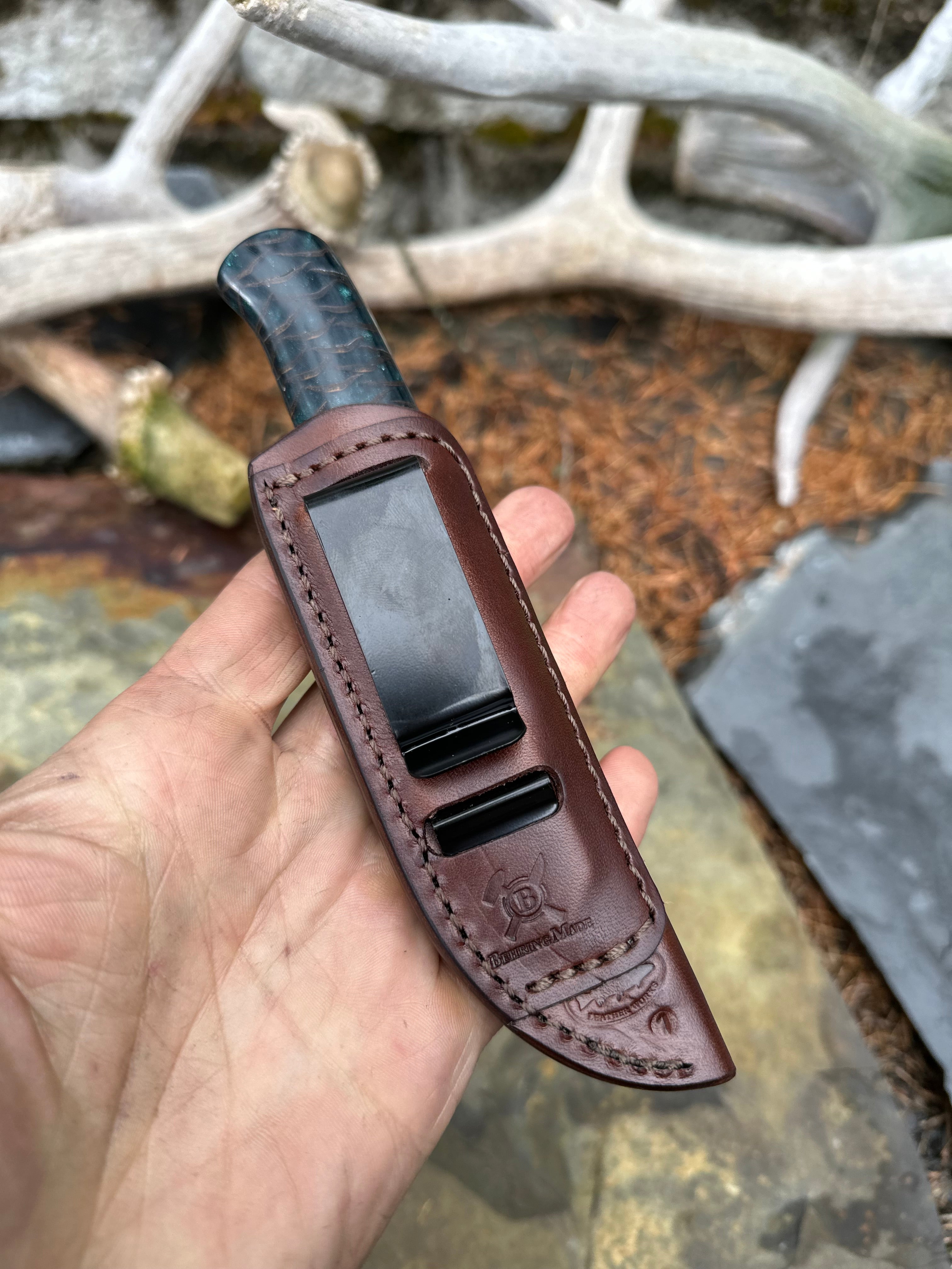 This outstanding new Camp Knife from Behring Made© is a stepped up drop point that'll tackle your camp jobs like a linebacker on a kicker. The blade is forged from 5160 spring steel and it measures 7 1/2" from tip to guard with a razor sharp hollow grind and our hammermark finish. The tall brass guard is soldered in place above black fiber, brass and copper spacers as well as a gorgeous artifact walrus ivory handle that we've pinned through the tang with brass. The overall length of this beast measures 12 1/4" and it comes in a custom sheath from Warlander Leather. *CONTACT TO ORDER