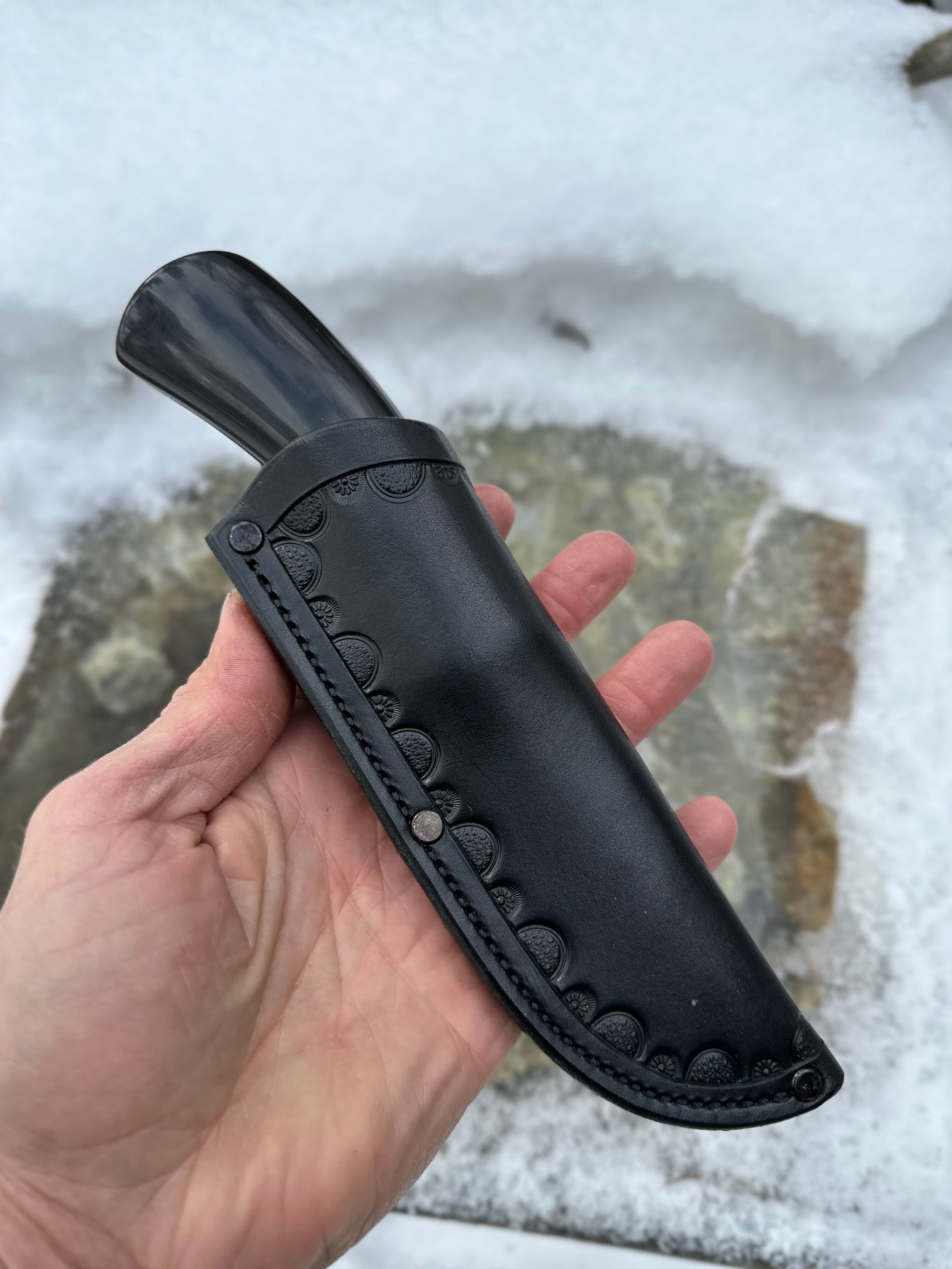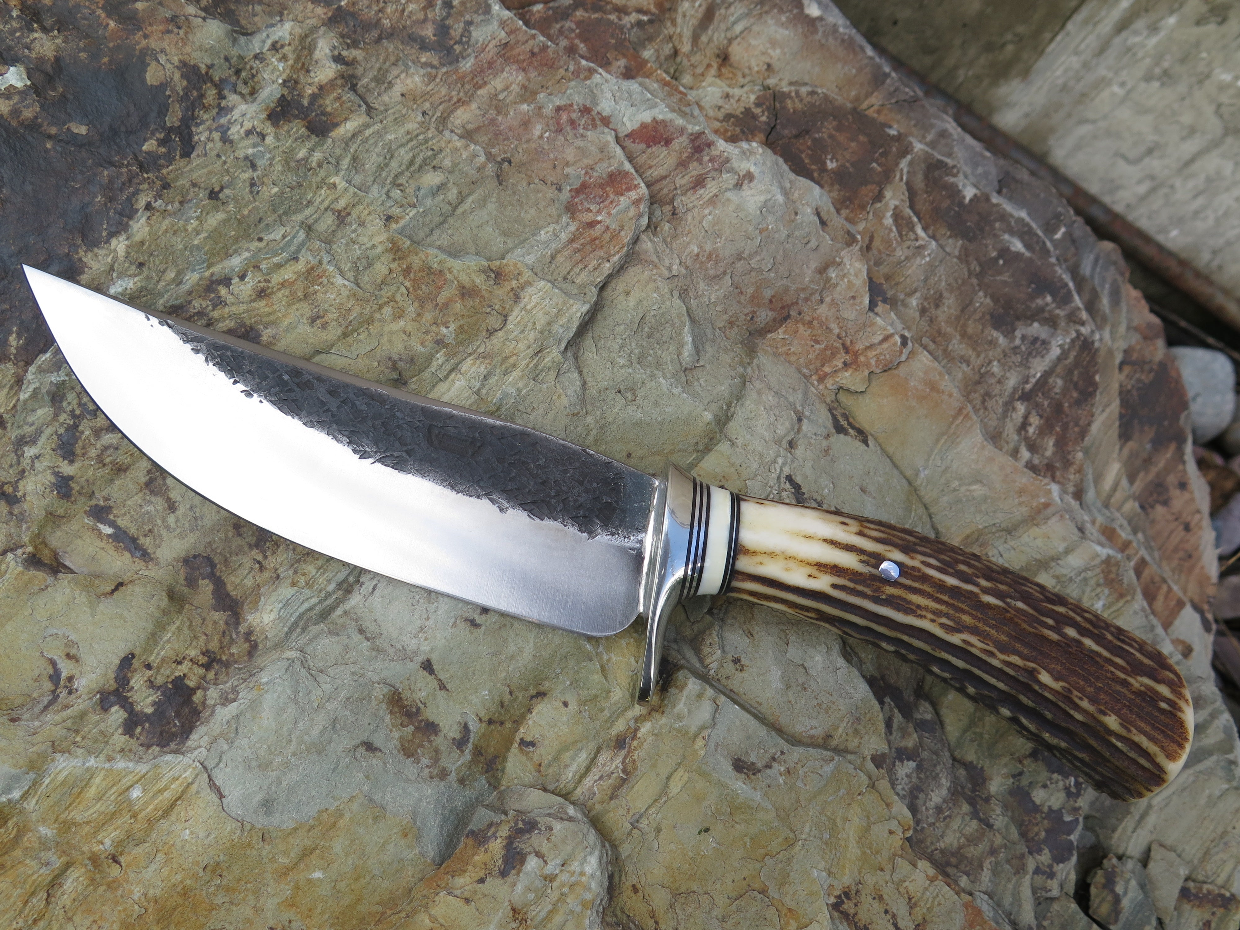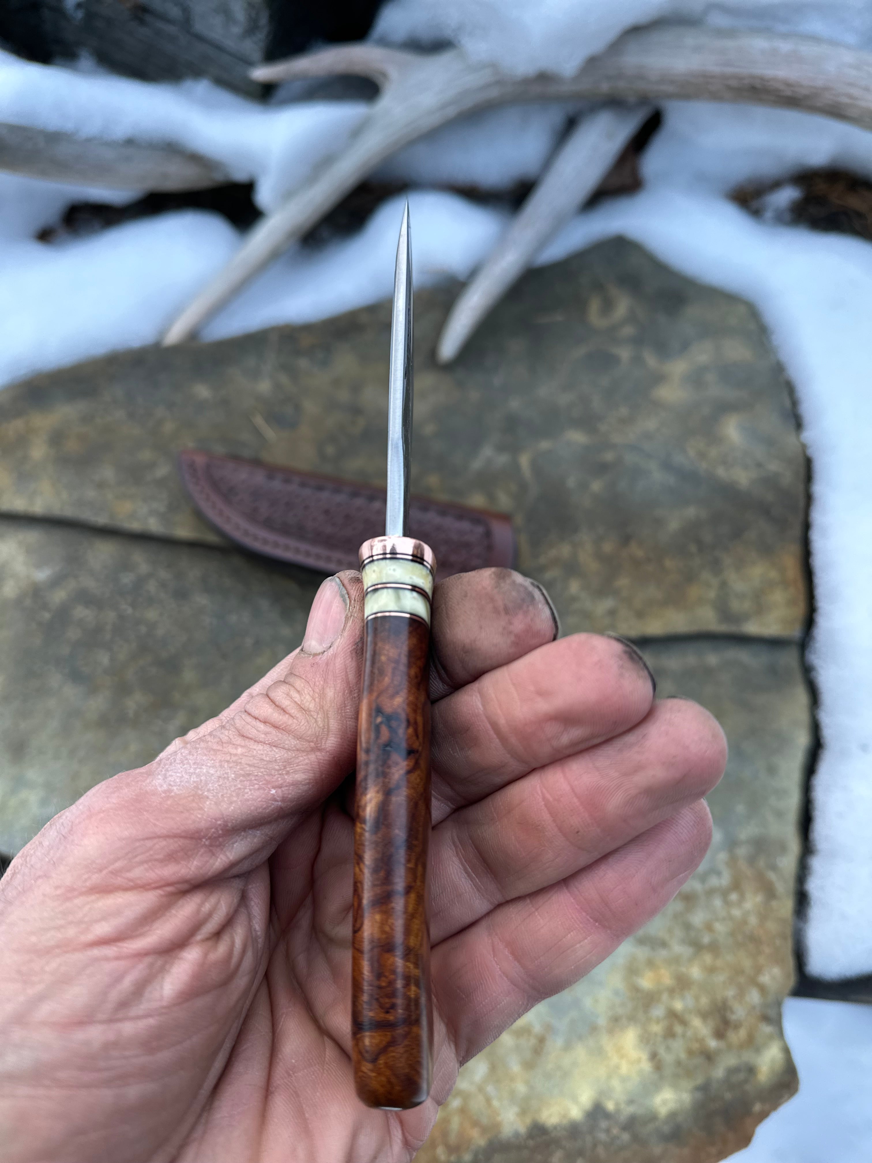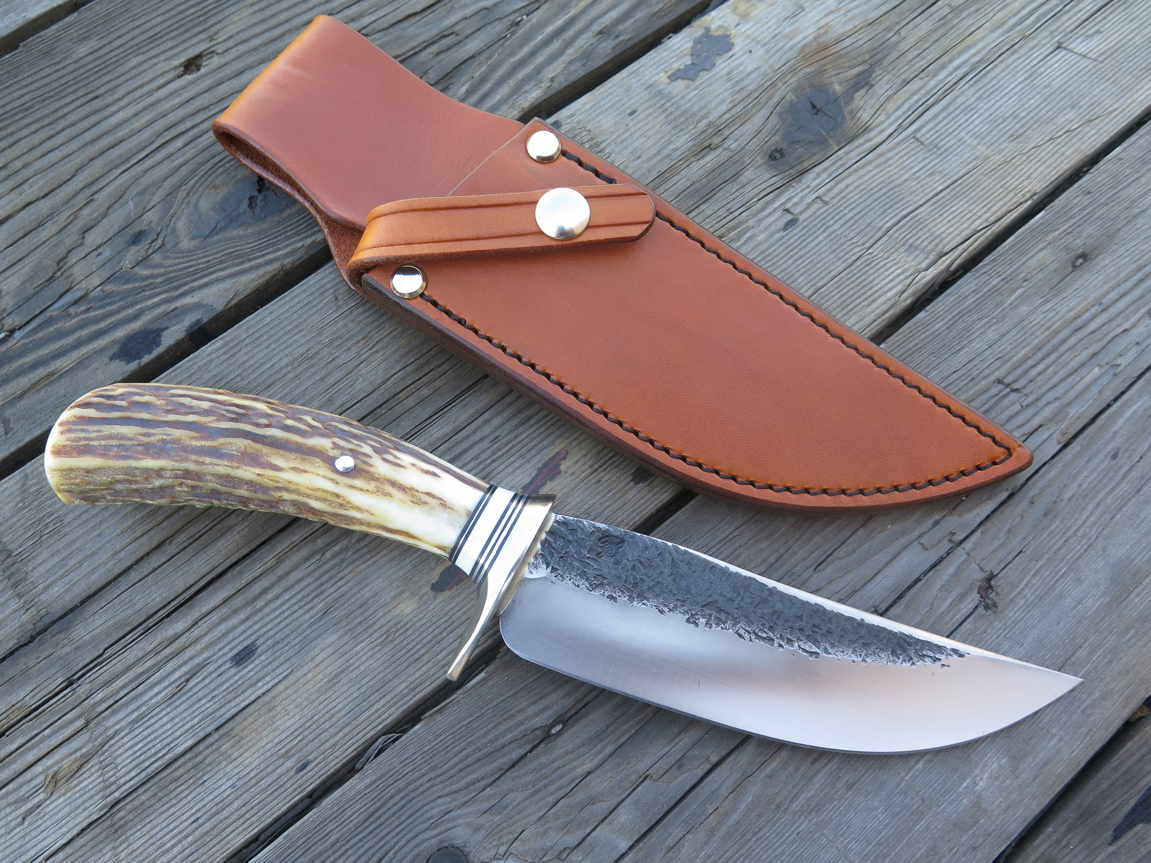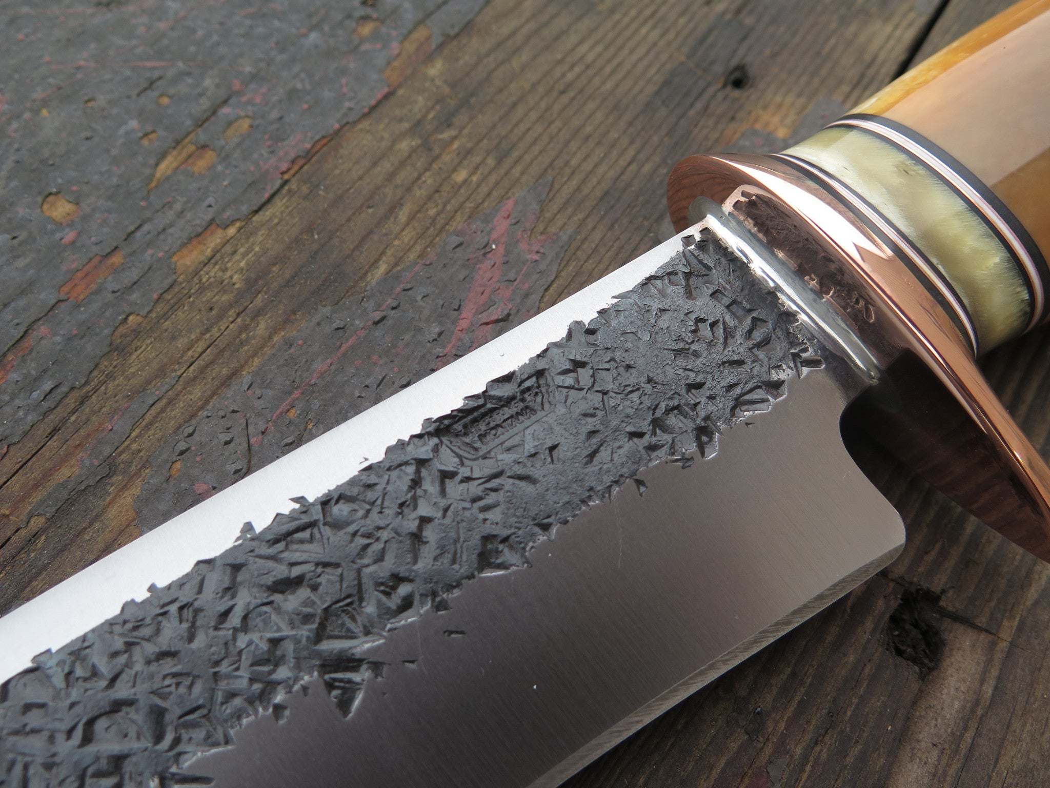 This outstanding new Camp Knife from Behring Made© is a stepped up drop point that'll tackle your camp jobs like a linebacker on a kicker. The blade is forged from 5160 spring steel and it measures 7 1/2" from tip to guard with a razor sharp hollow grind and our hammermark finish. The tall brass guard is soldered in place above black fiber, brass and copper spacers as well as a gorgeous artifact walrus ivory handle that we've pinned through the tang with brass. The overall length of this beast measures 12 1/4" and it comes in a custom sheath from Warlander Leather. *CONTACT TO ORDER