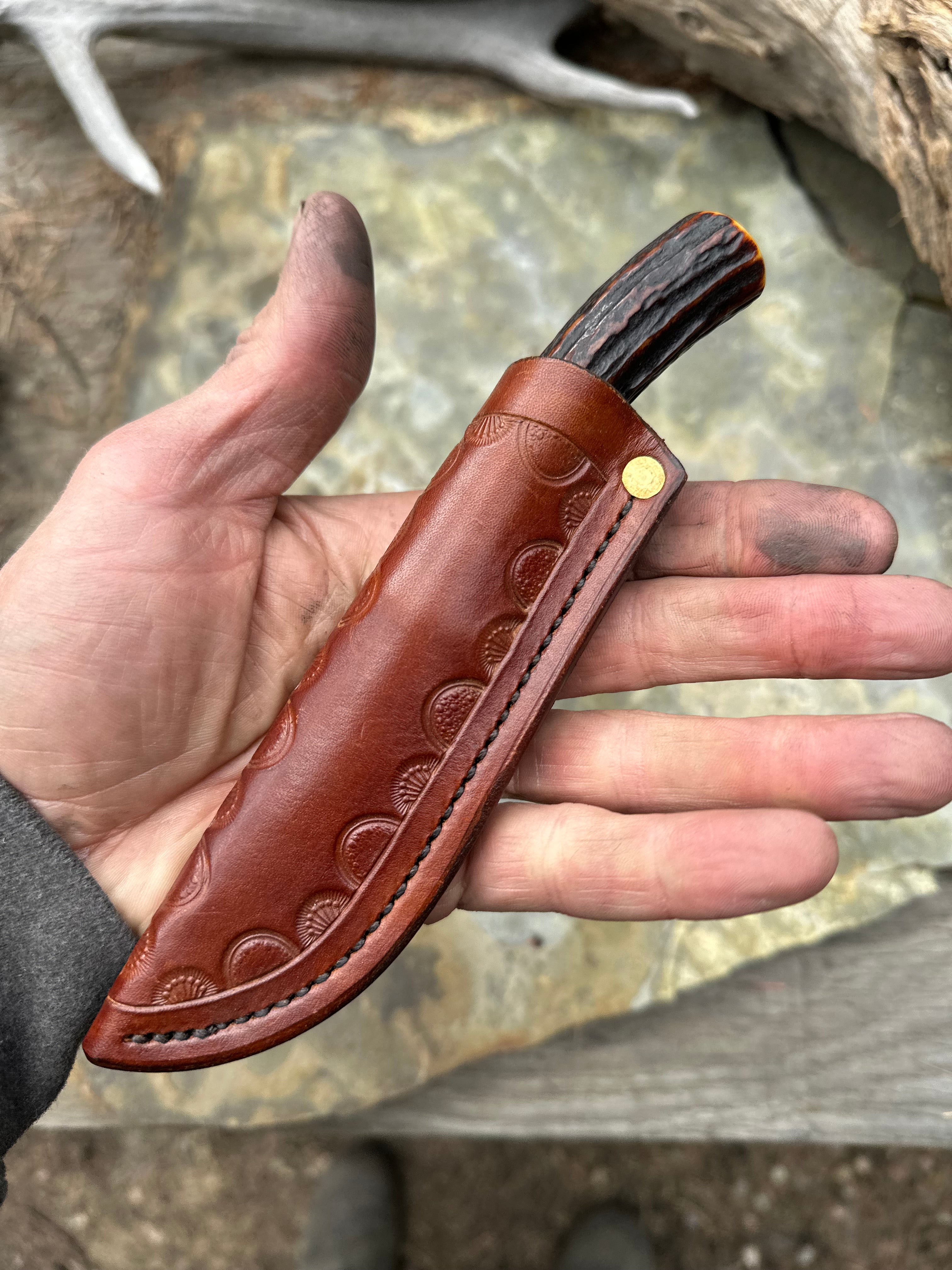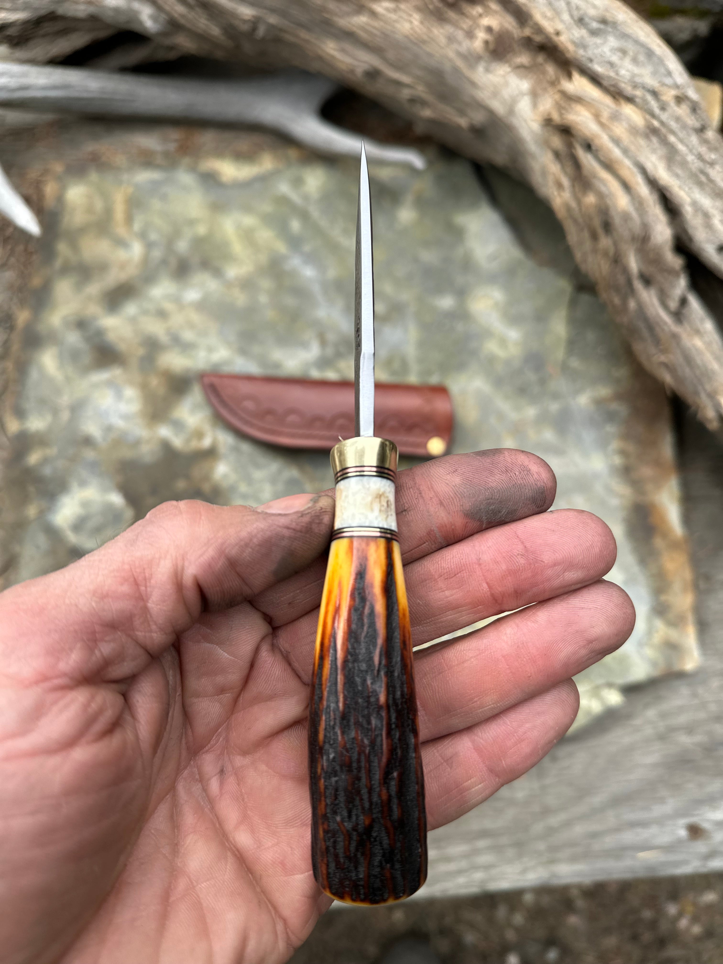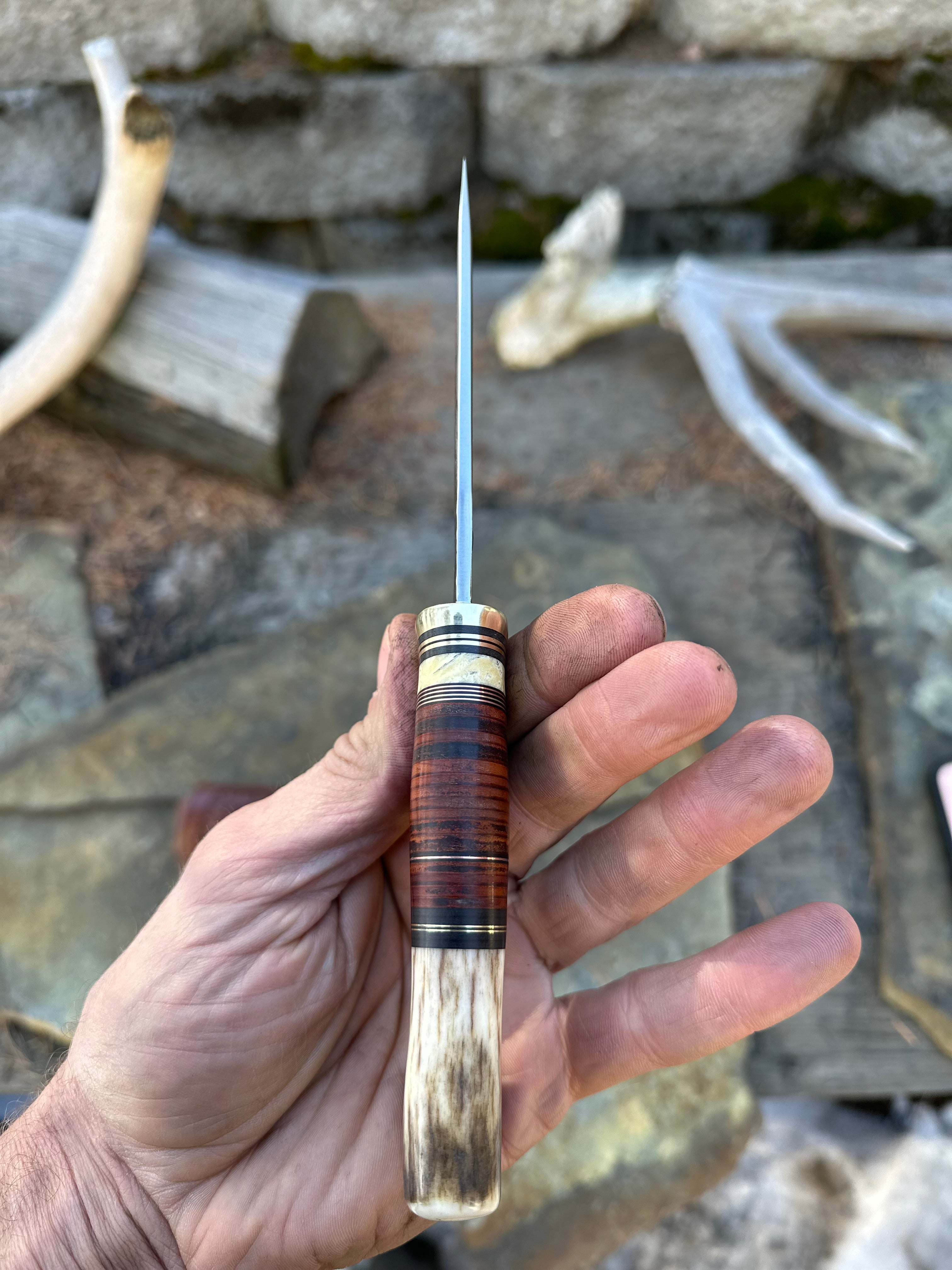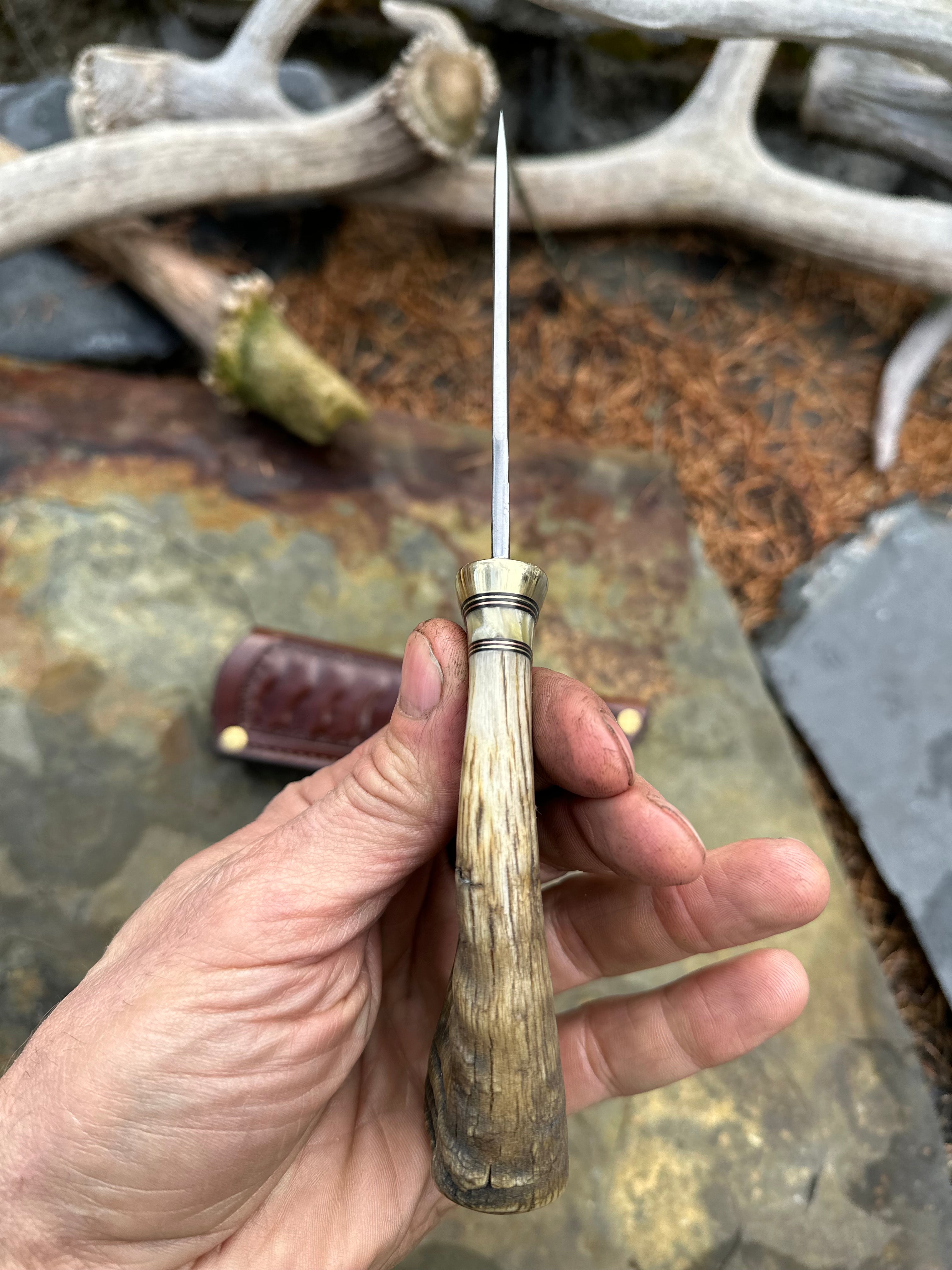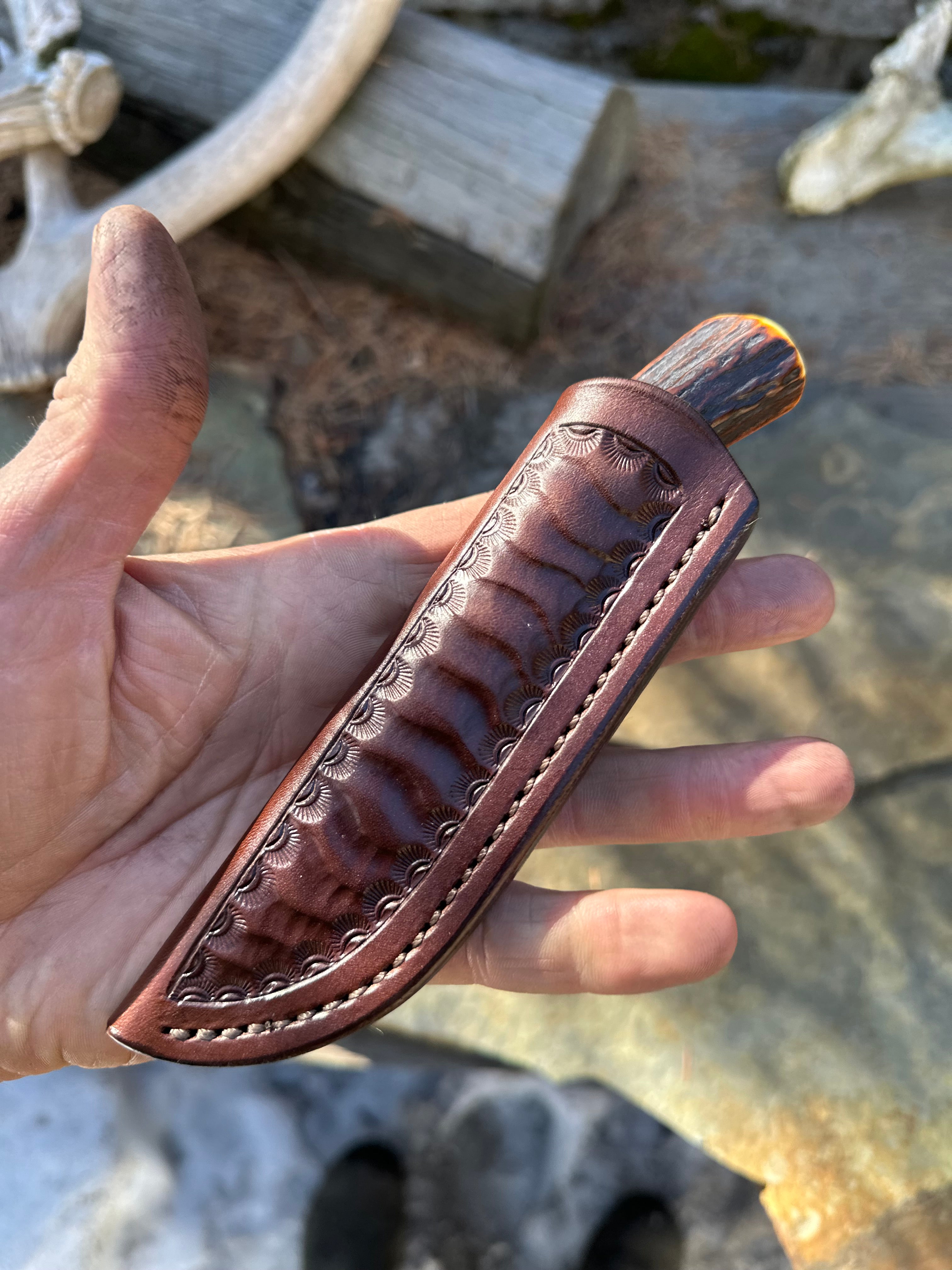 This outstanding new Camp Knife from Behring Made© is a stepped up drop point that'll tackle your camp jobs like a linebacker on a kicker. The blade is forged from 5160 spring steel and it measures 7 1/2" from tip to guard with a razor sharp hollow grind and our hammermark finish. The tall brass guard is soldered in place above black fiber, brass and copper spacers as well as a gorgeous artifact walrus ivory handle that we've pinned through the tang with brass. The overall length of this beast measures 12 1/4" and it comes in a custom sheath from Warlander Leather. *CONTACT TO ORDER