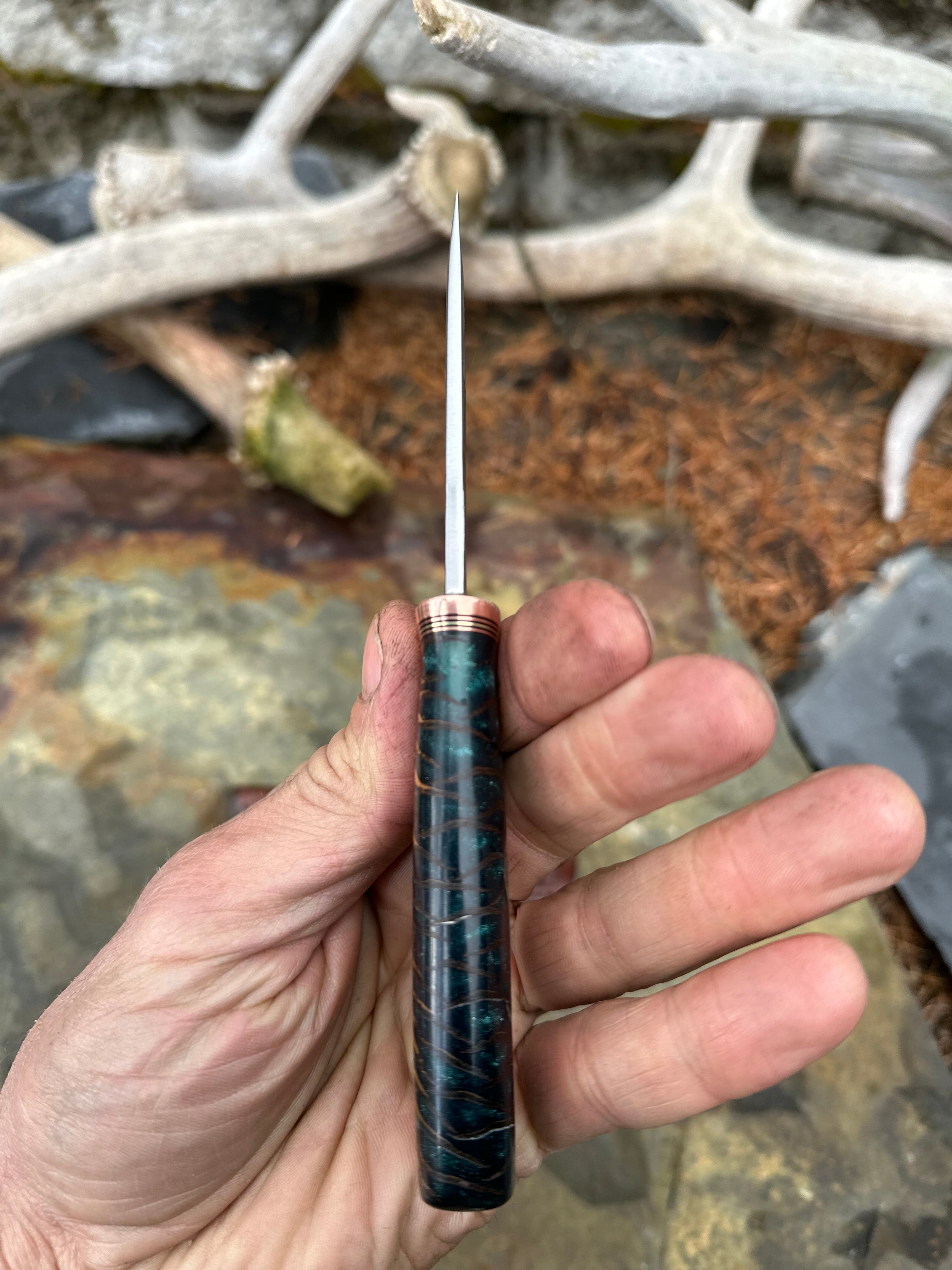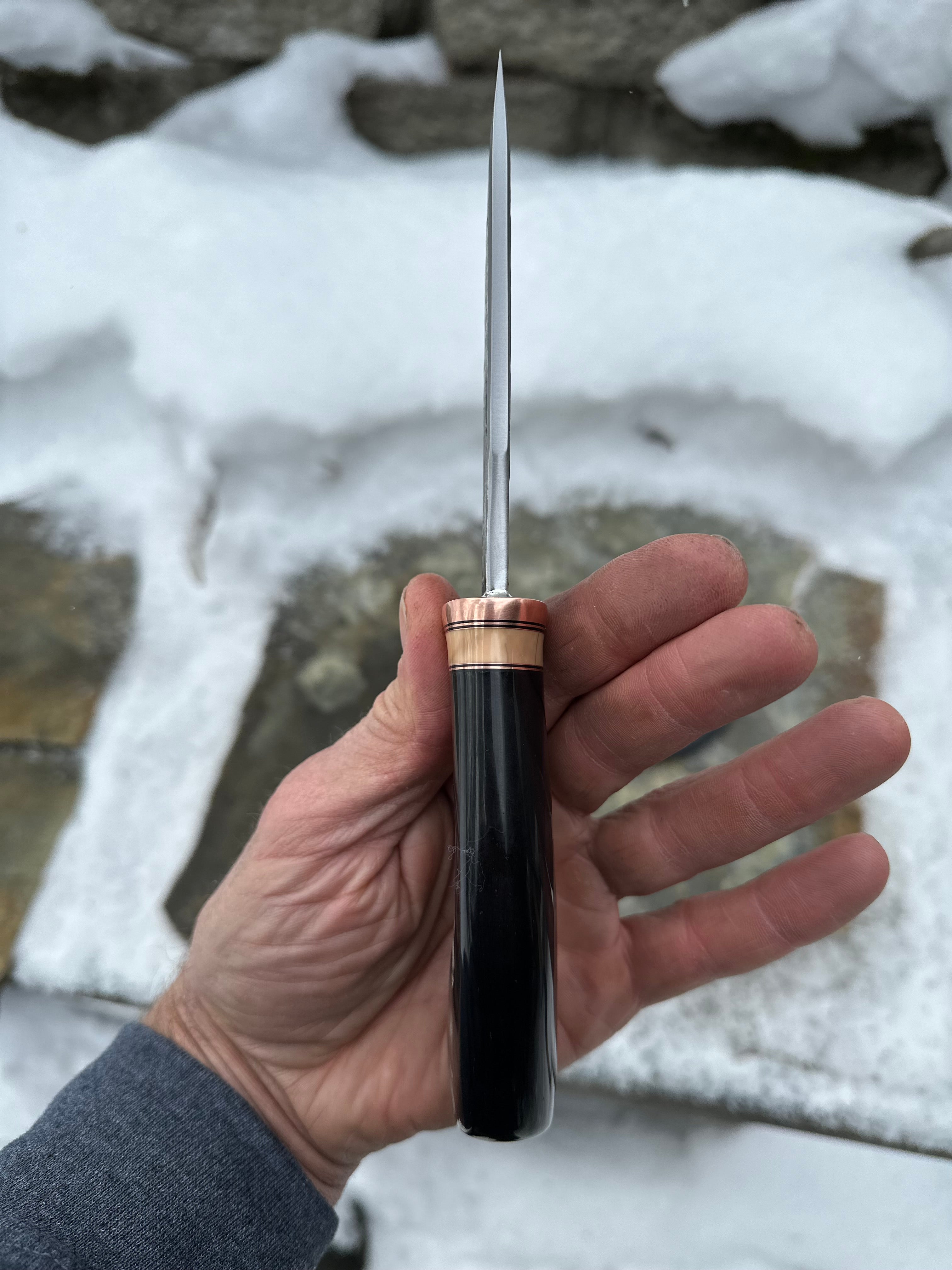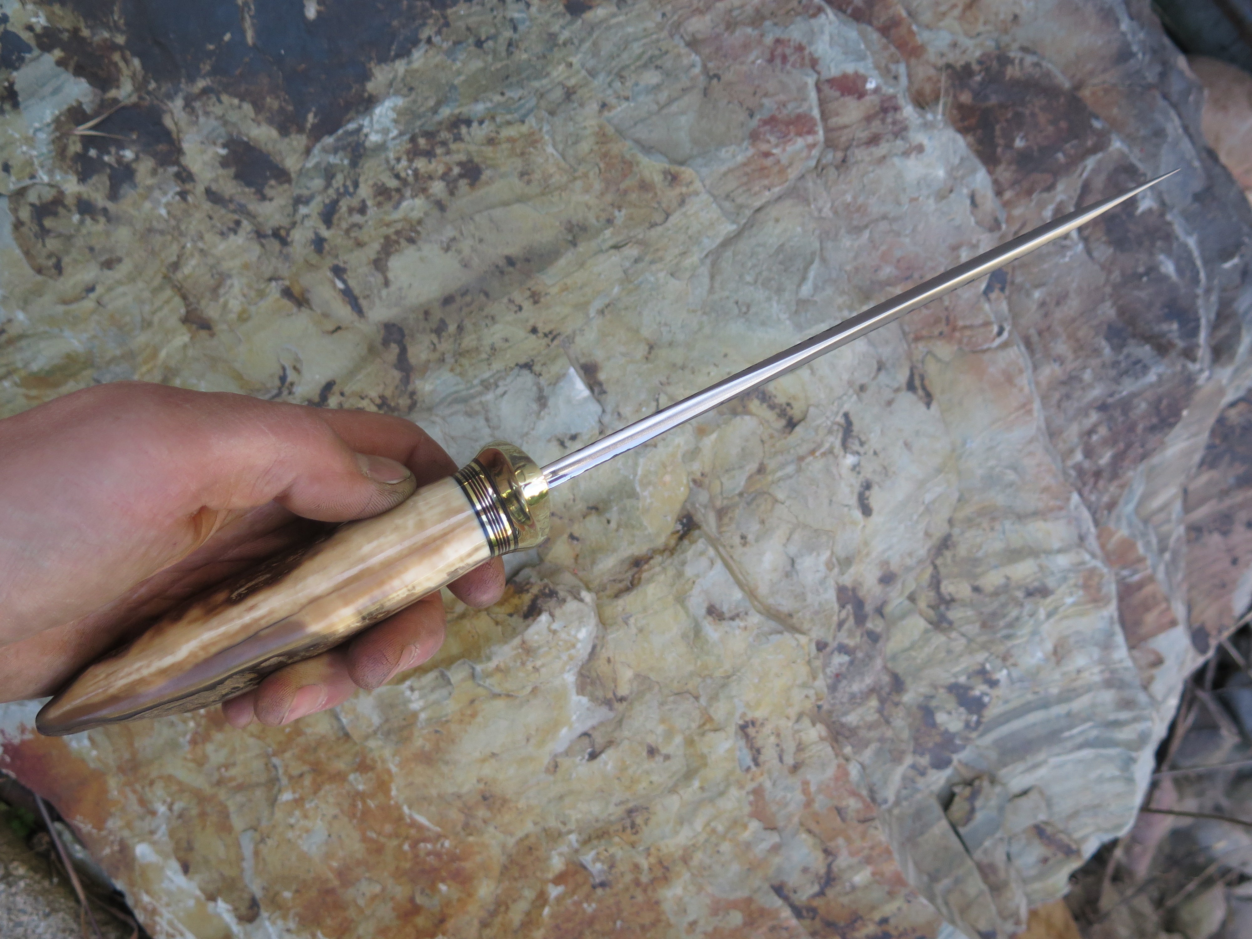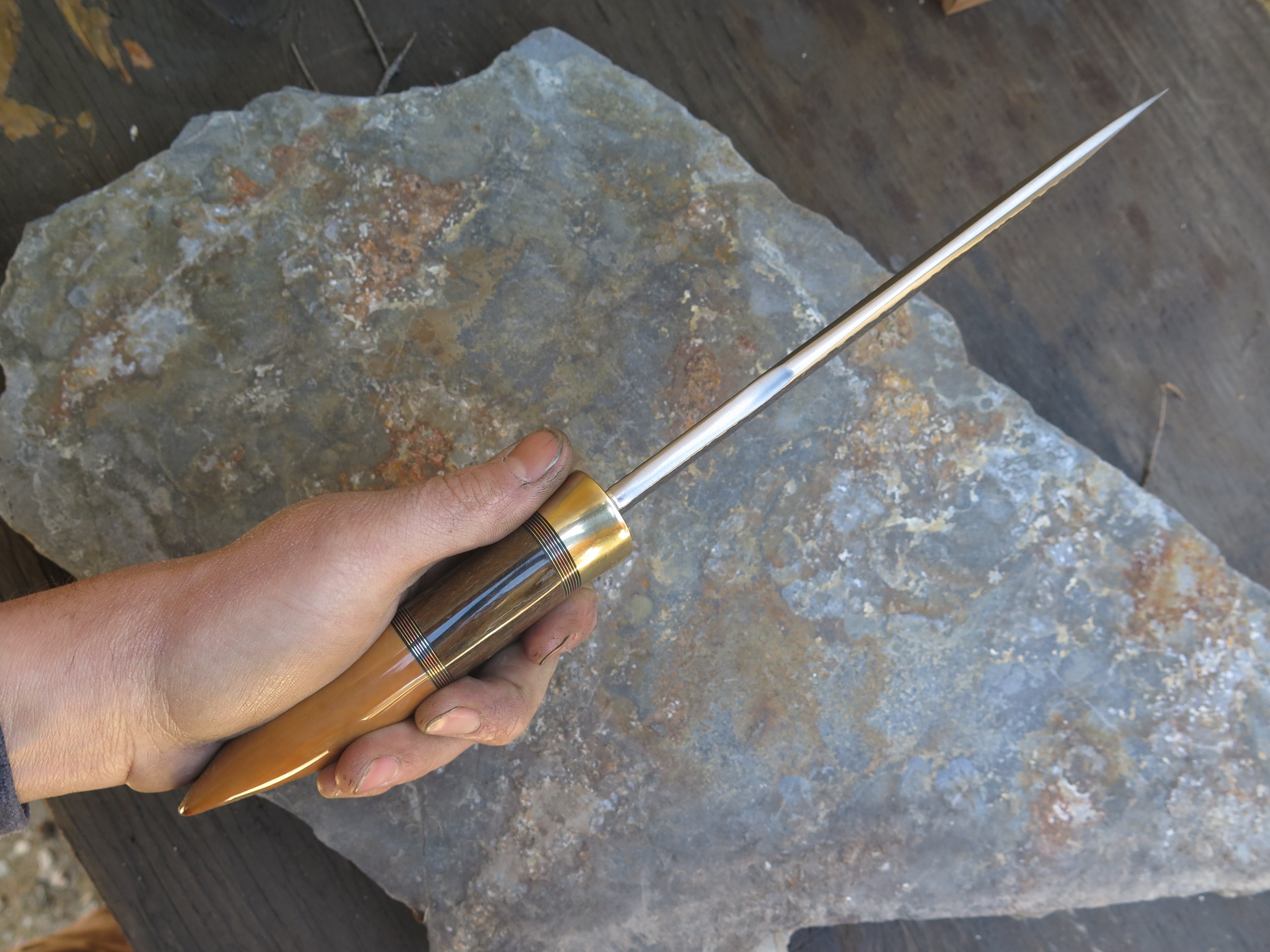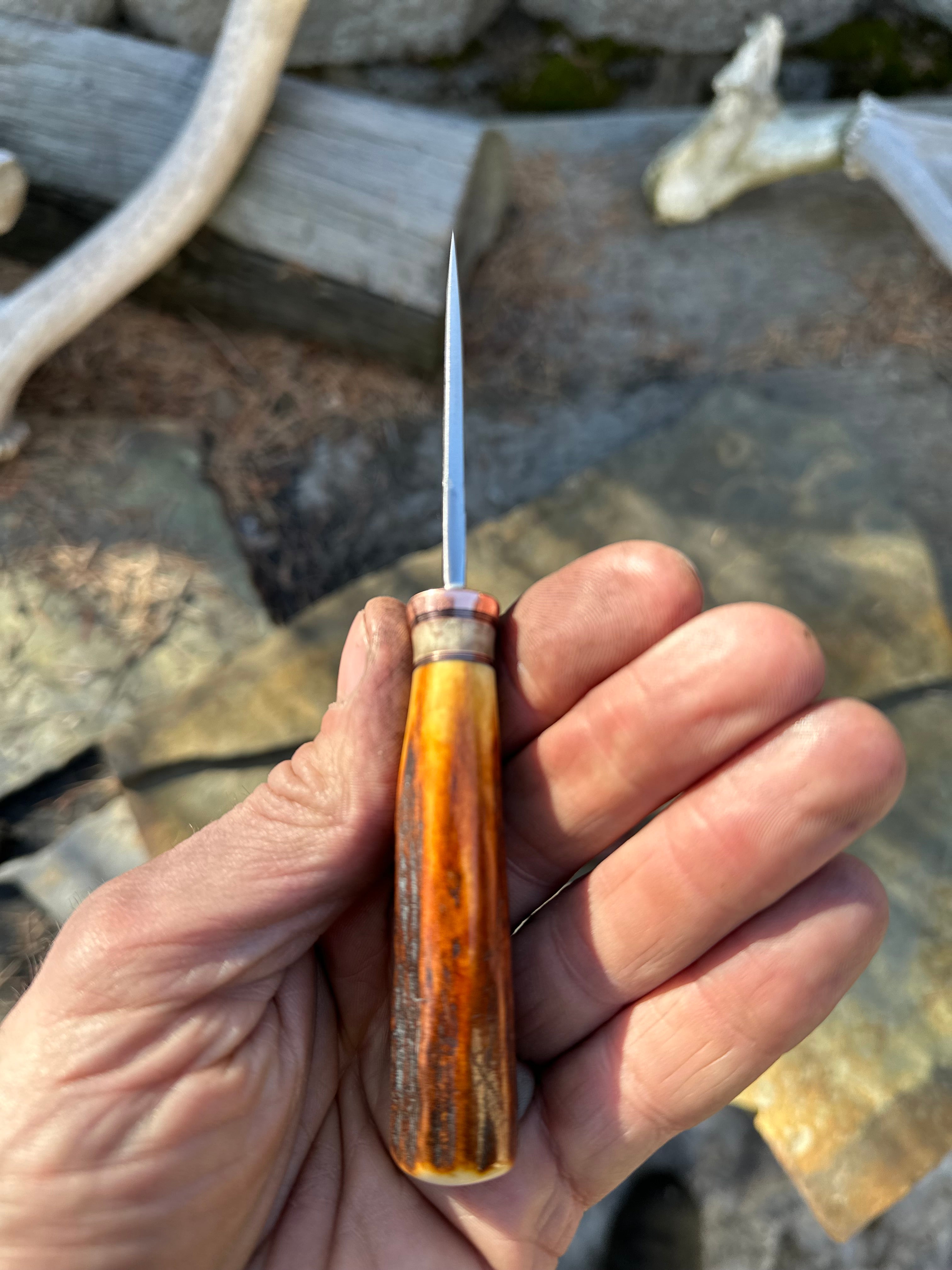 This outstanding new Camp Knife from Behring Made© is a stepped up drop point that'll tackle your camp jobs like a linebacker on a kicker. The blade is forged from 5160 spring steel and it measures 7 1/2" from tip to guard with a razor sharp hollow grind and our hammermark finish. The tall brass guard is soldered in place above black fiber, brass and copper spacers as well as a gorgeous artifact walrus ivory handle that we've pinned through the tang with brass. The overall length of this beast measures 12 1/4" and it comes in a custom sheath from Warlander Leather. *CONTACT TO ORDER