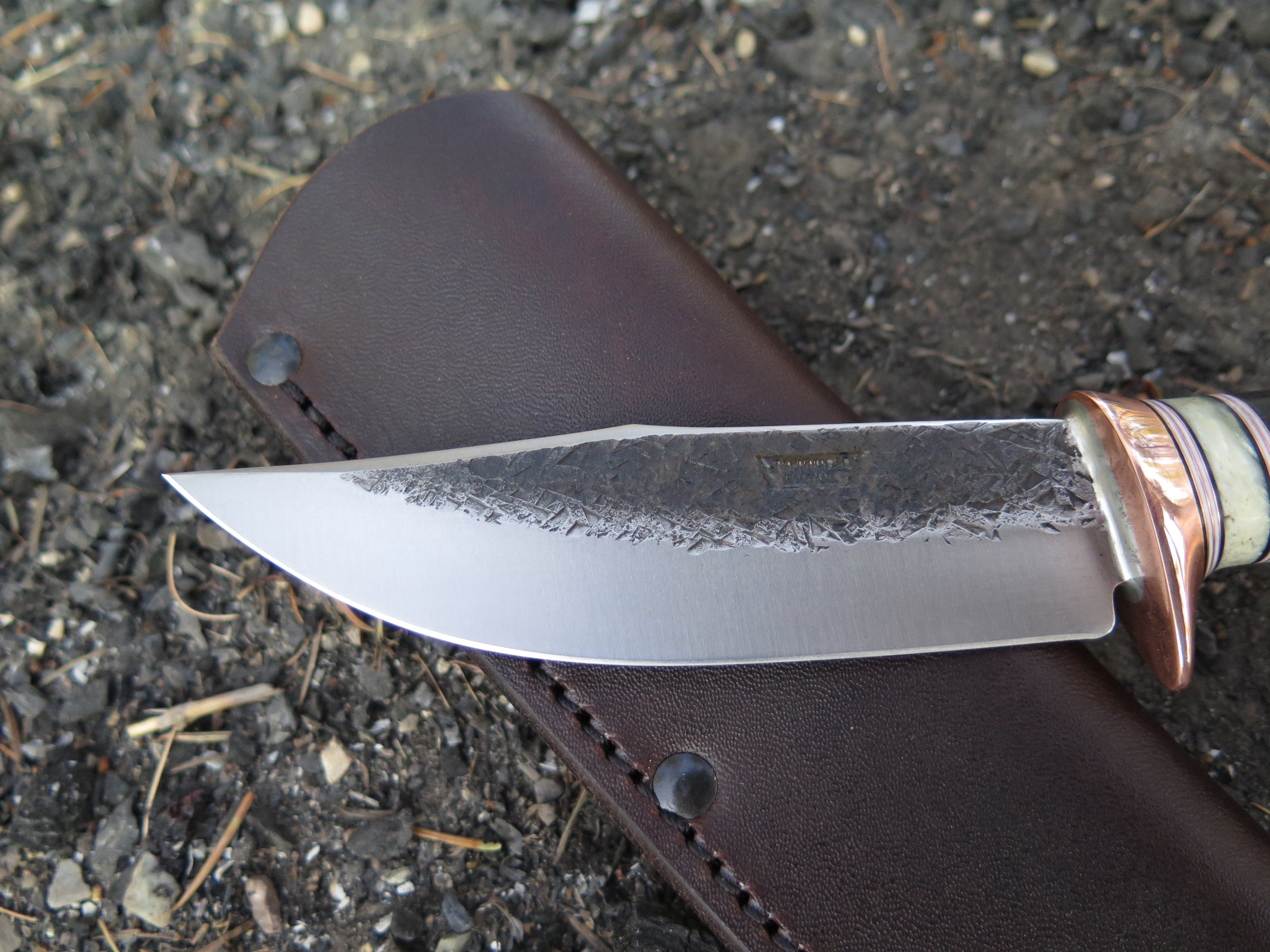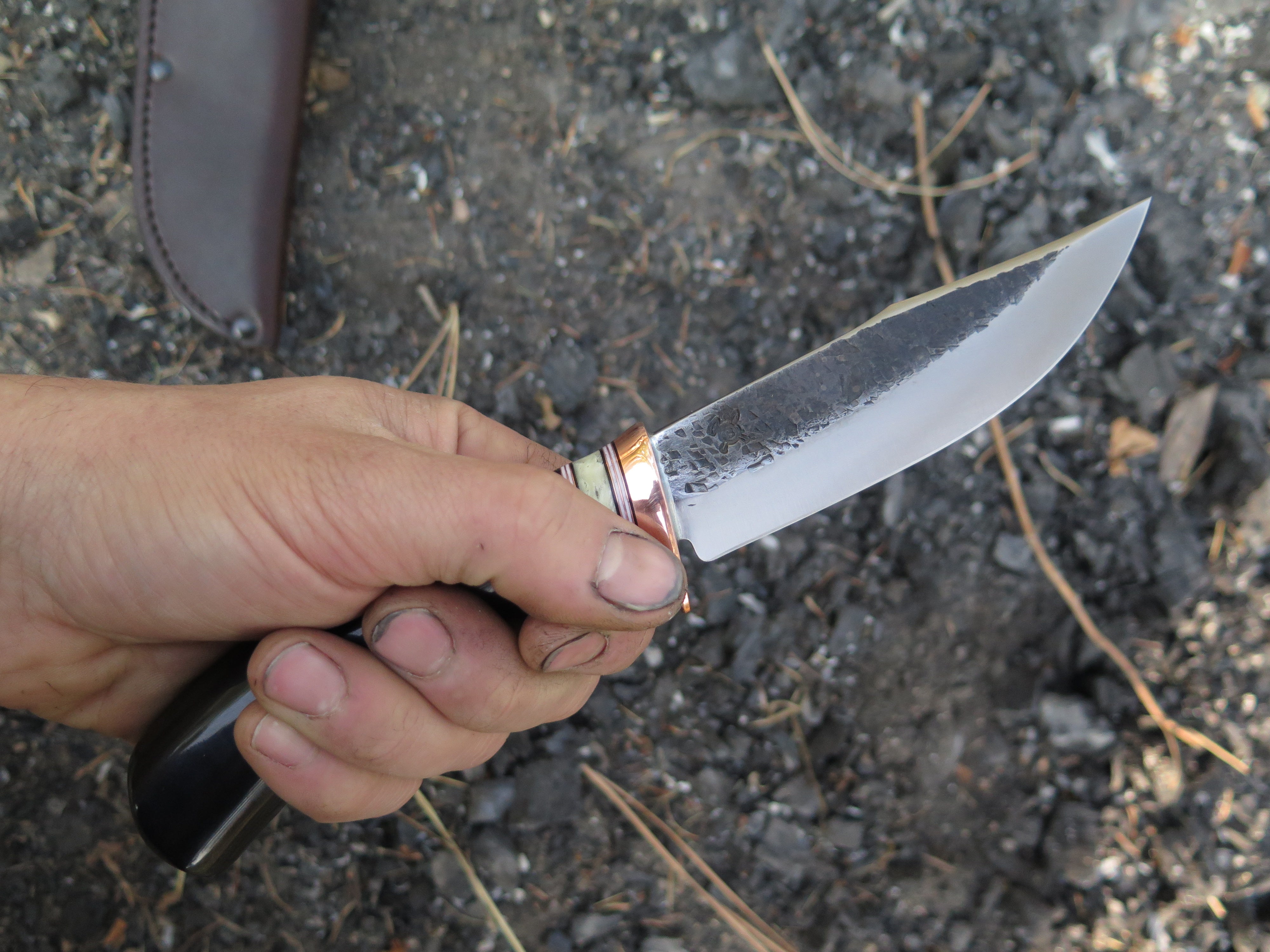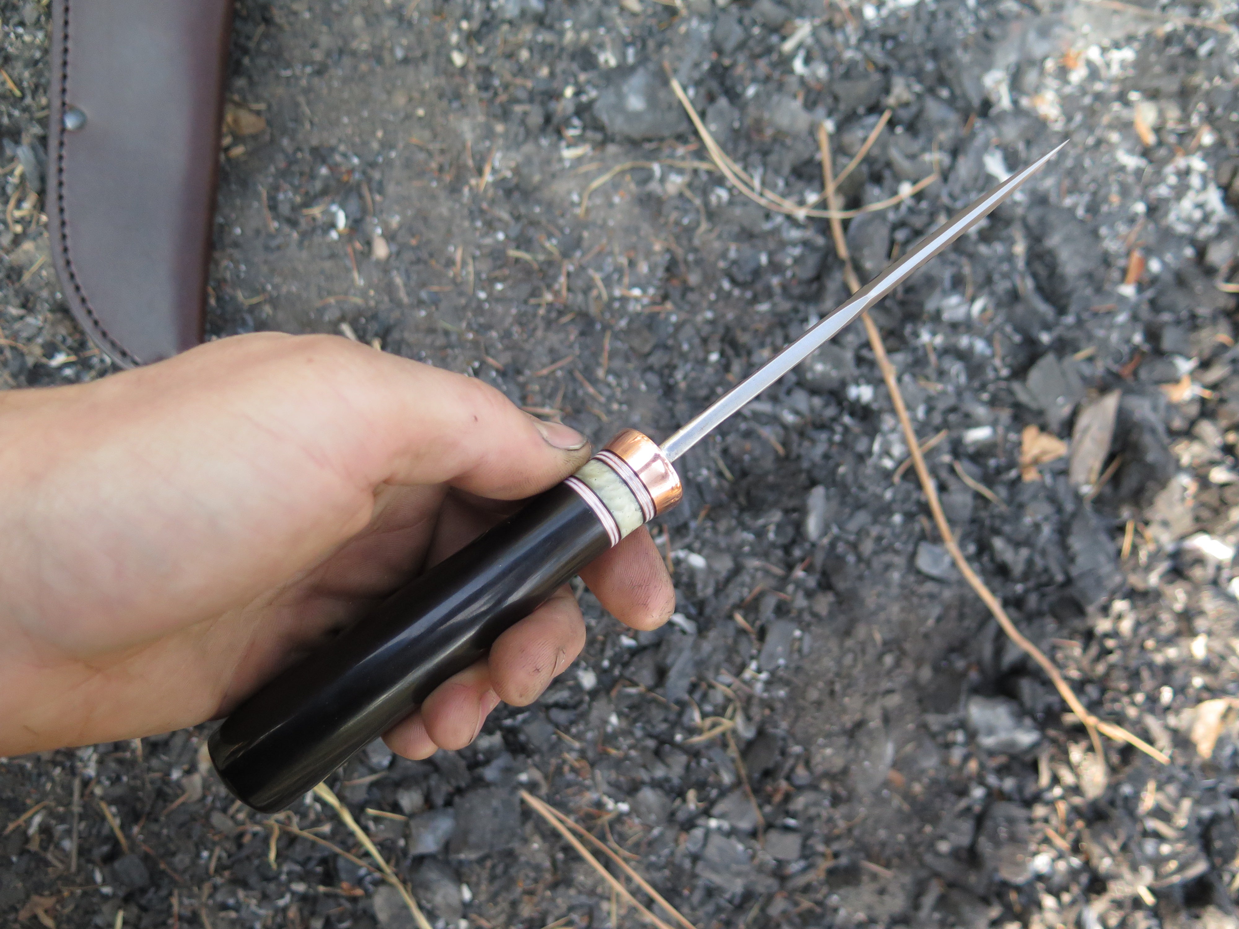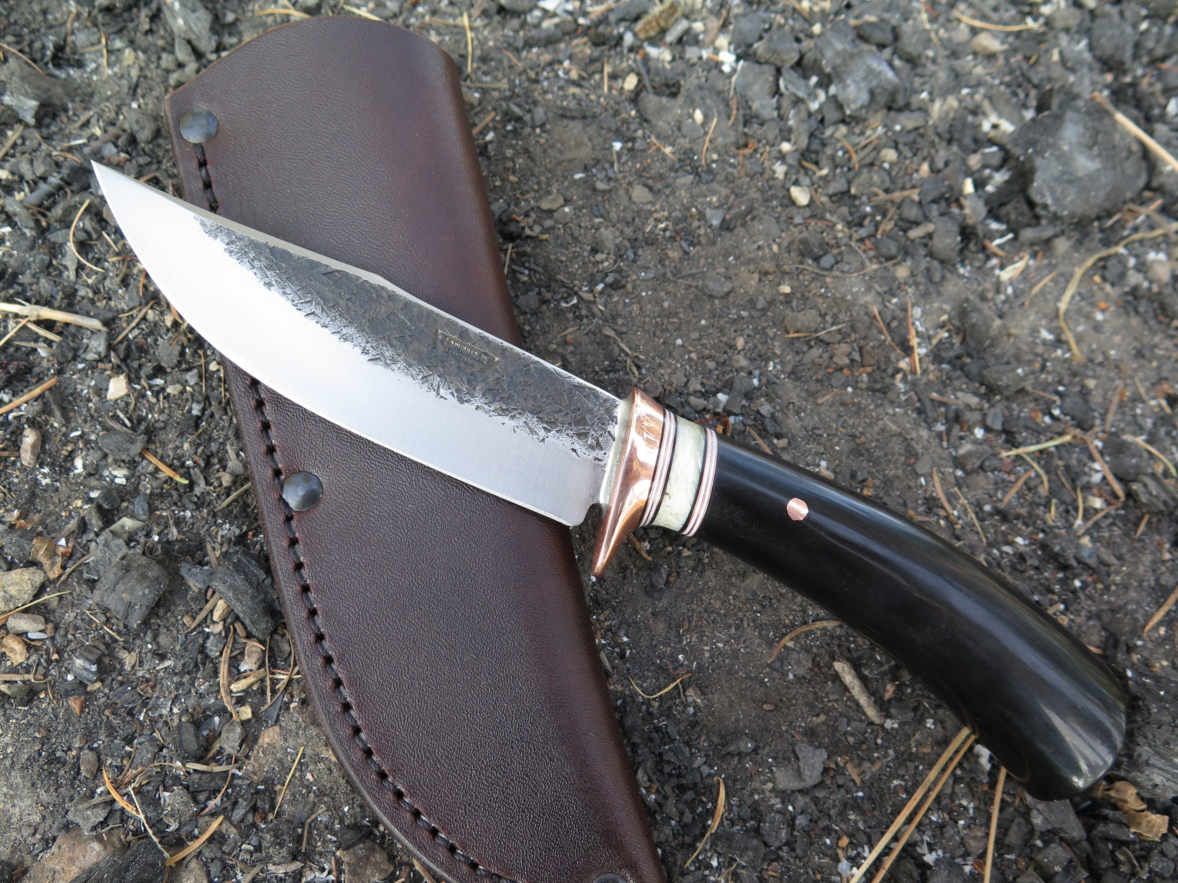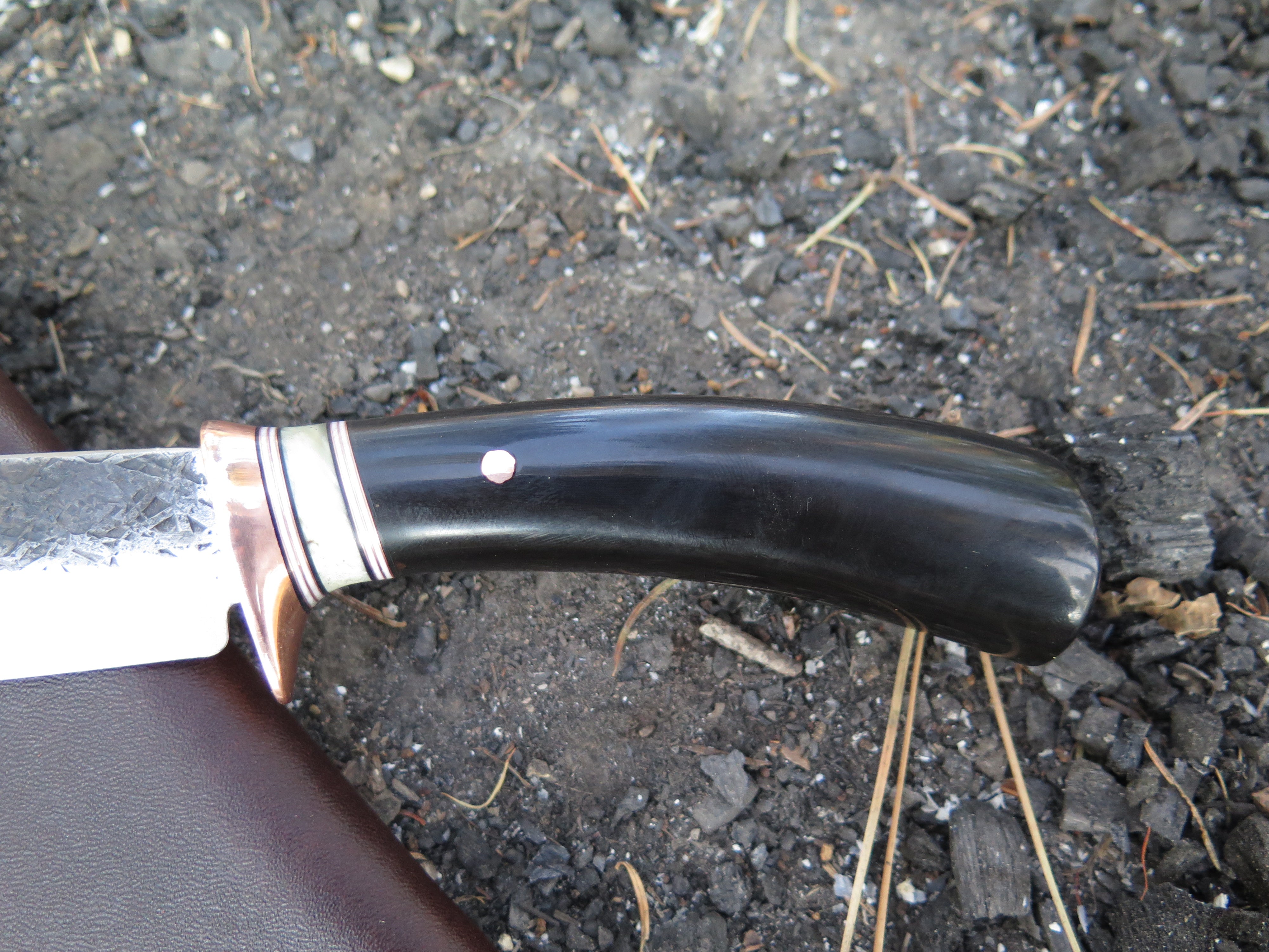 This bad ass Clip Point from Behring Made© is hand forged from 3/16" thick high carbon 01 tool steel and it measures 4 1/2" from tip to guard with a razor sharp hollow grind and our hammermark finish. The copper guard is soldered in place above black and white fiber, copper and musk ox boss spacers as well as a beautiful African water buffalo horn that's pinned with copper. The overall length measures 9 1/4" and it comes in a classic belt pouch sheath from Warlander Leather.