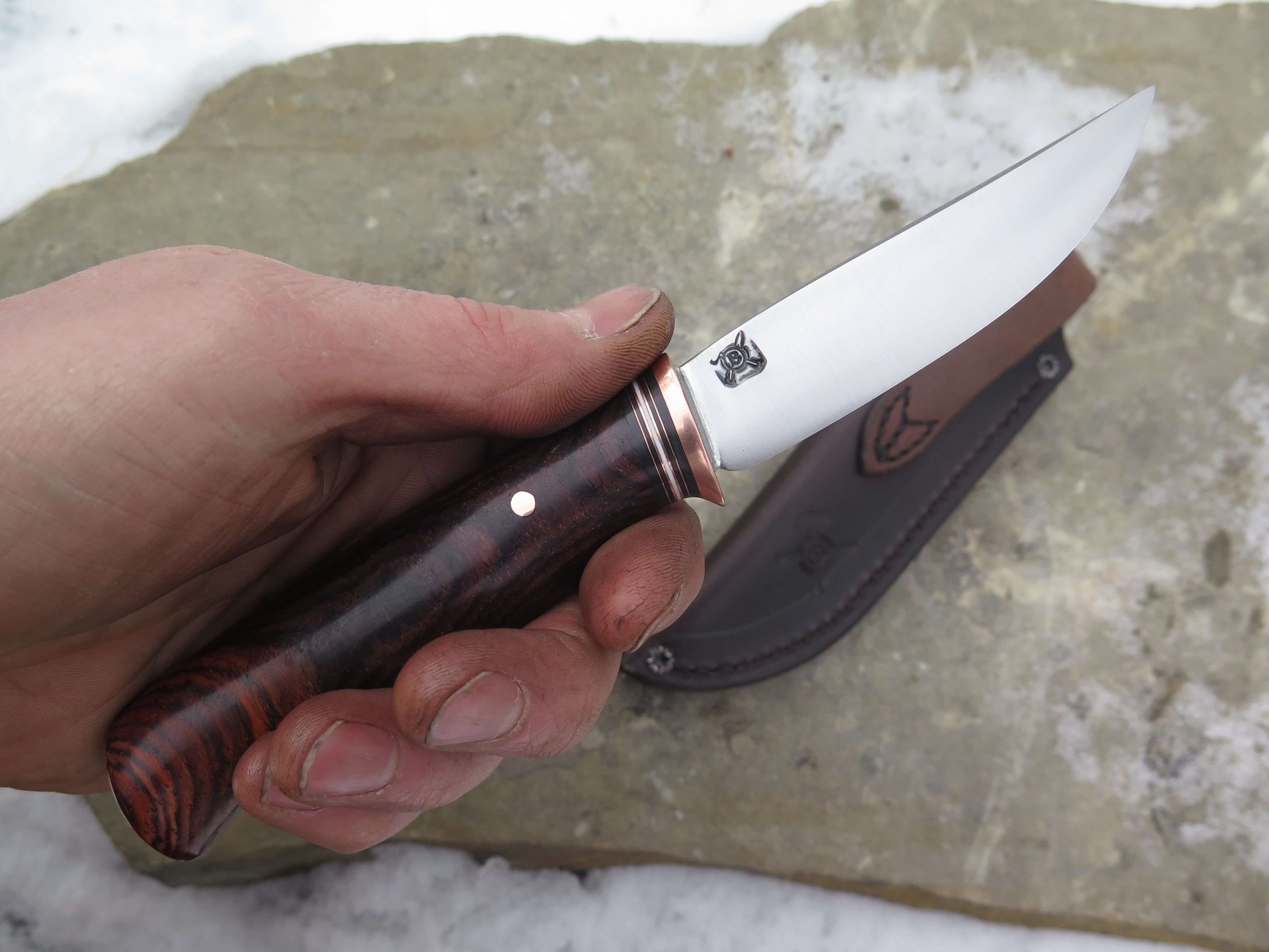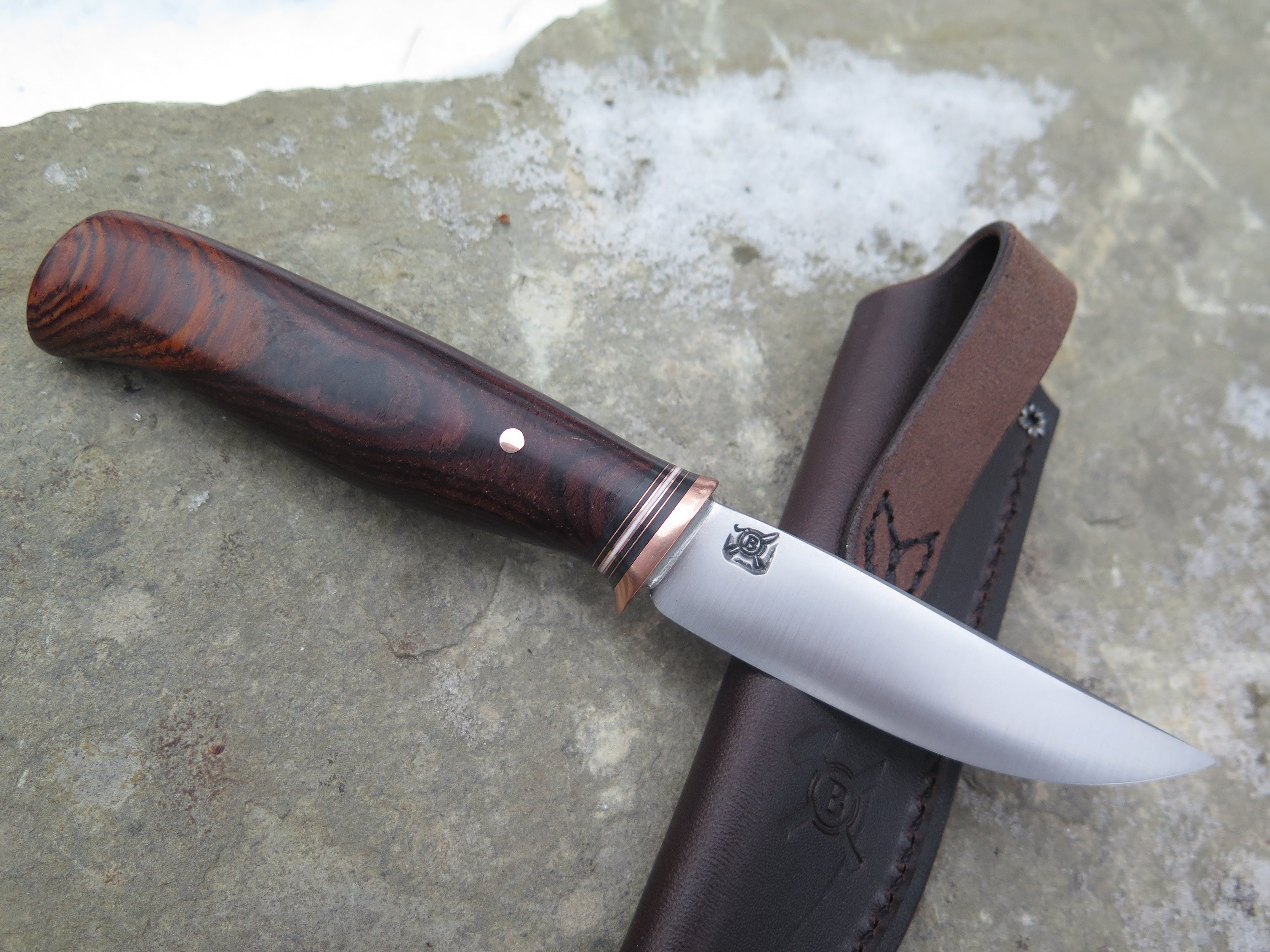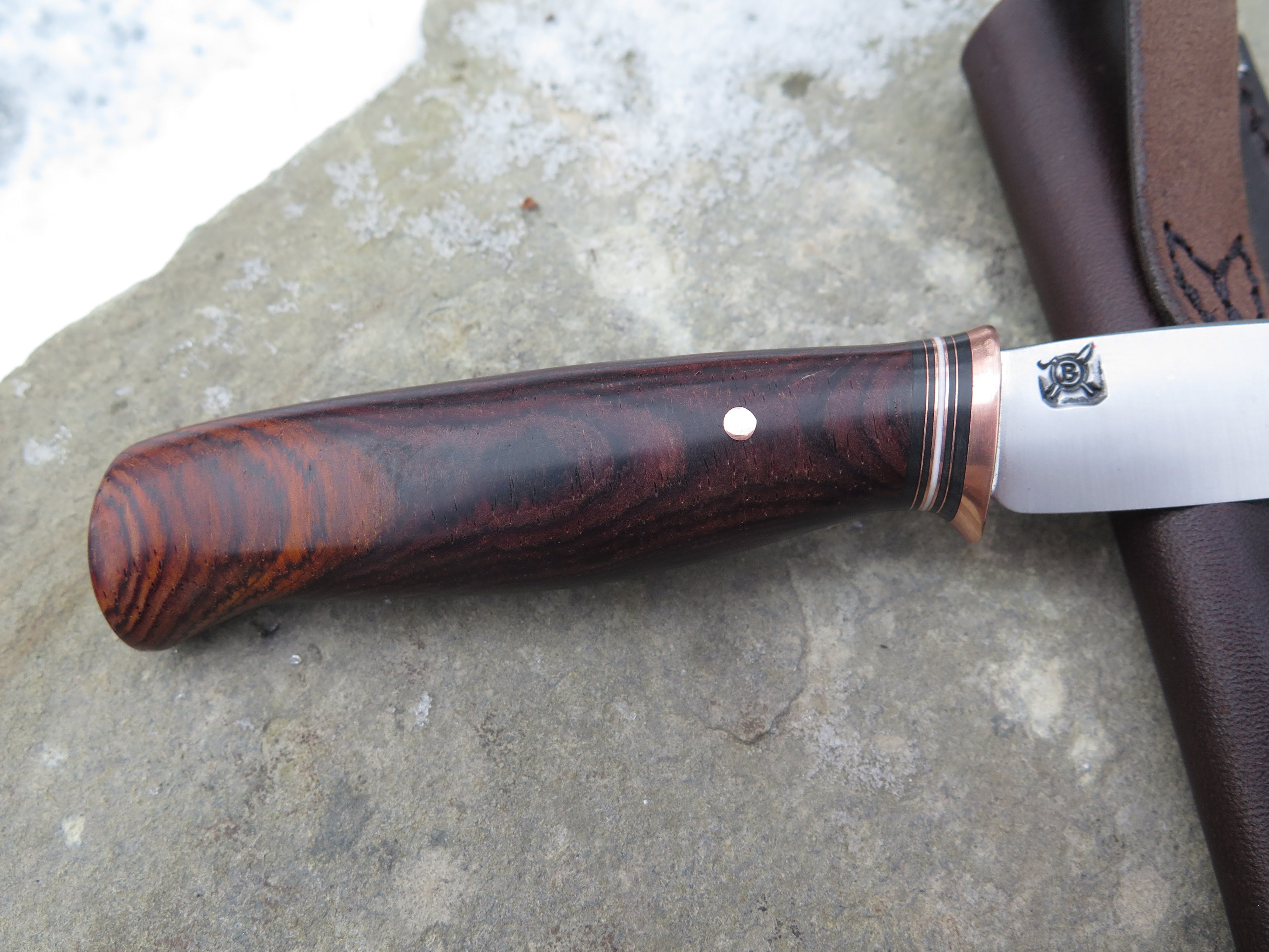 This beautiful new Pintail from Behring Made© is hand forged from 1/8" thick high carbon 01 tool steel and it measures 3 1/2" from tip to guard with a razor sharp convex grind. The copper guard is soldered in place above a simple stack of black, white and copper spacers in addition to a premium cocobolo wood handle that is also pinned with copper. The overall length measures just over 7 1/2" and it comes in a classic belt pouch sheath.