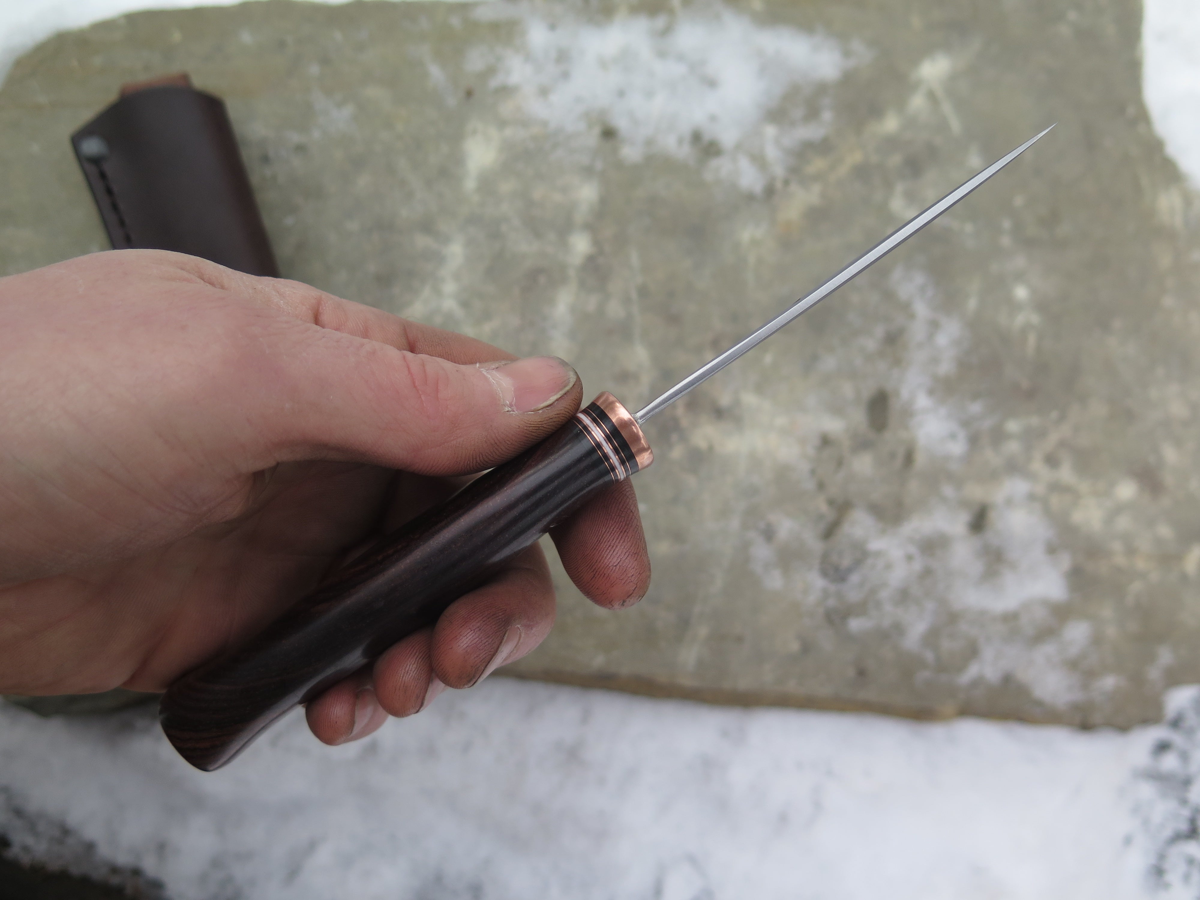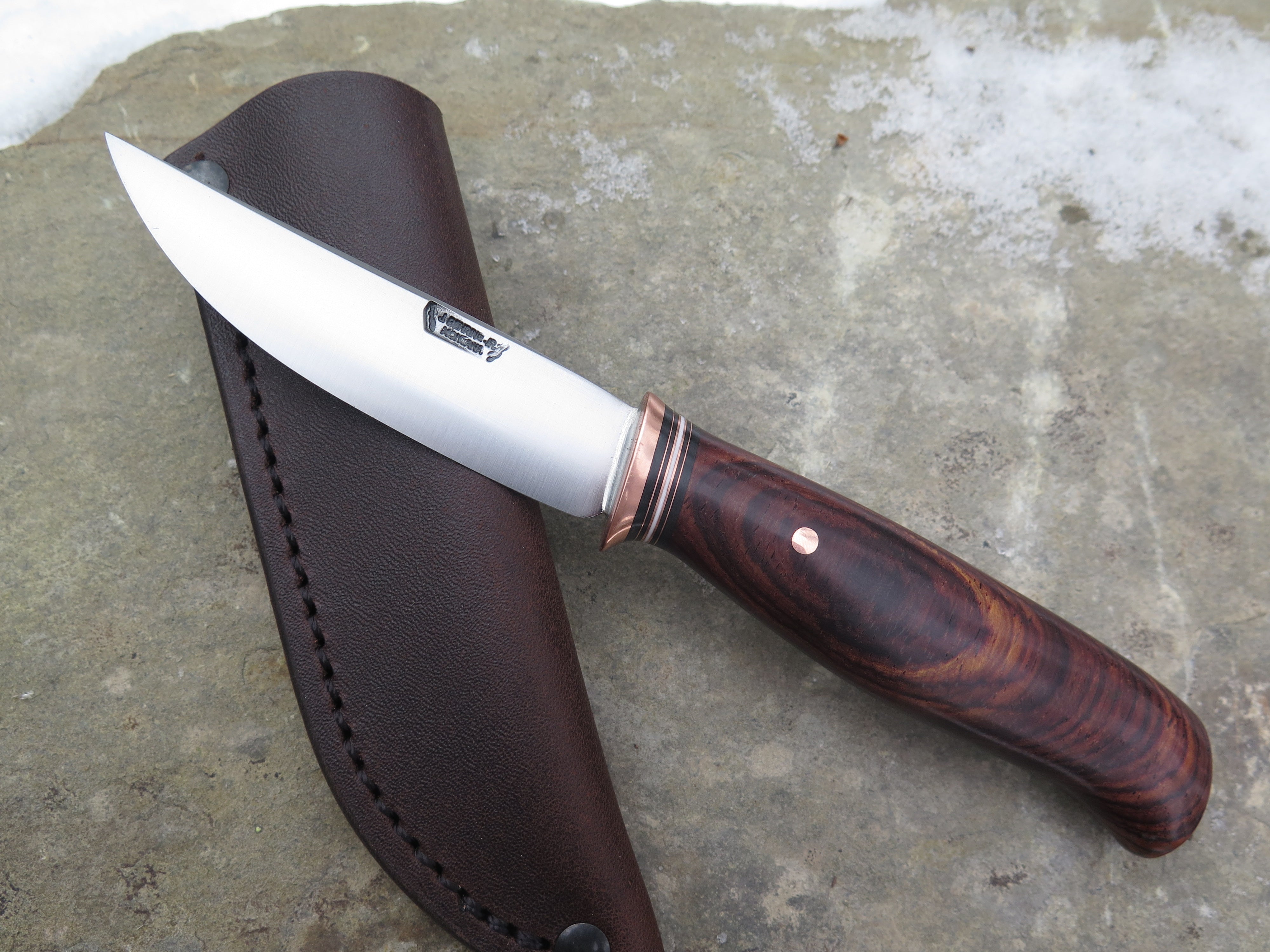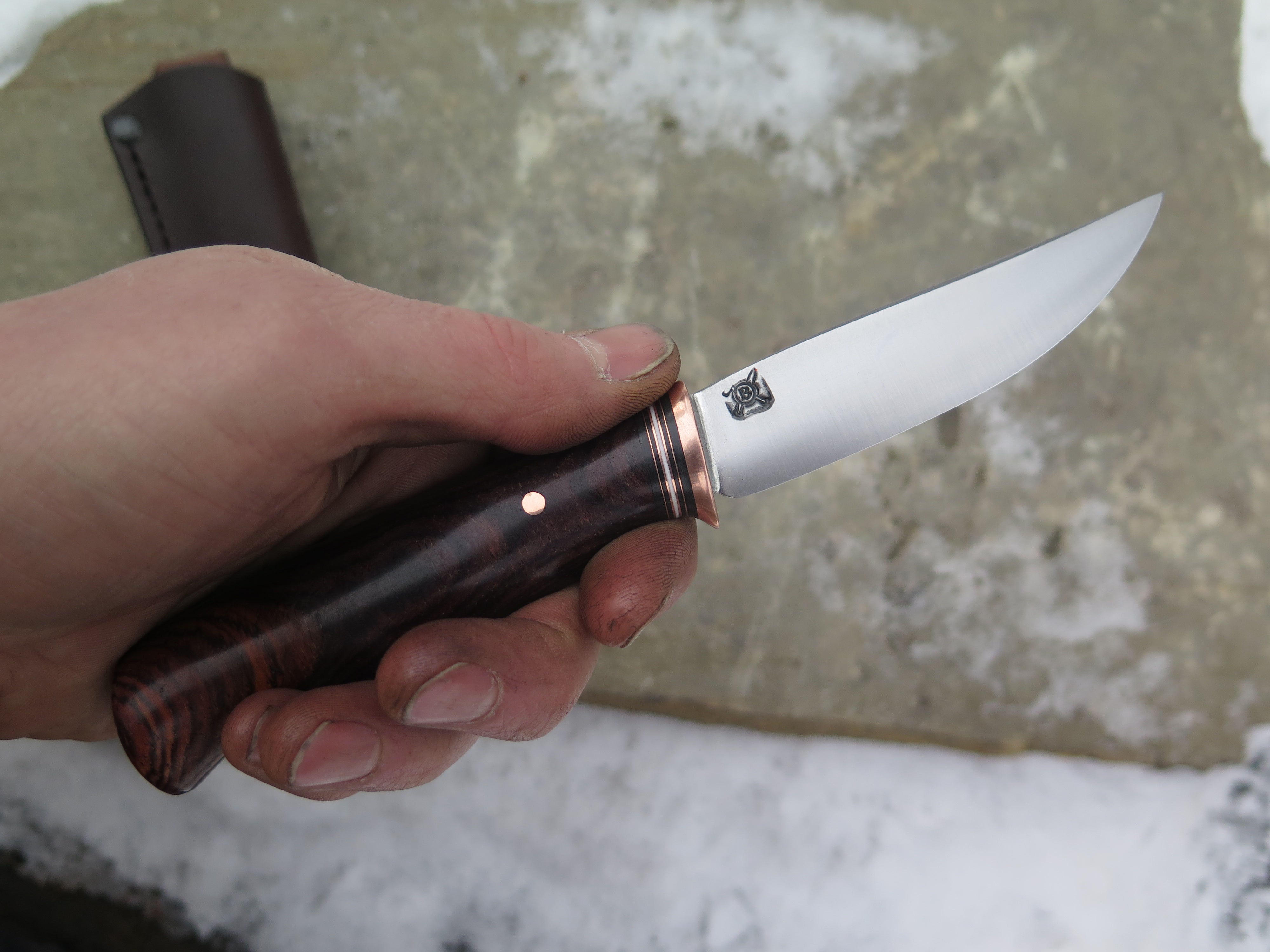 This beautiful new Pintail from Behring Made© is hand forged from 1/8" thick high carbon 01 tool steel and it measures 3 1/2" from tip to guard with a razor sharp convex grind. The copper guard is soldered in place above a simple stack of black, white and copper spacers in addition to a premium cocobolo wood handle that is also pinned with copper. The overall length measures just over 7 1/2" and it comes in a classic belt pouch sheath.
