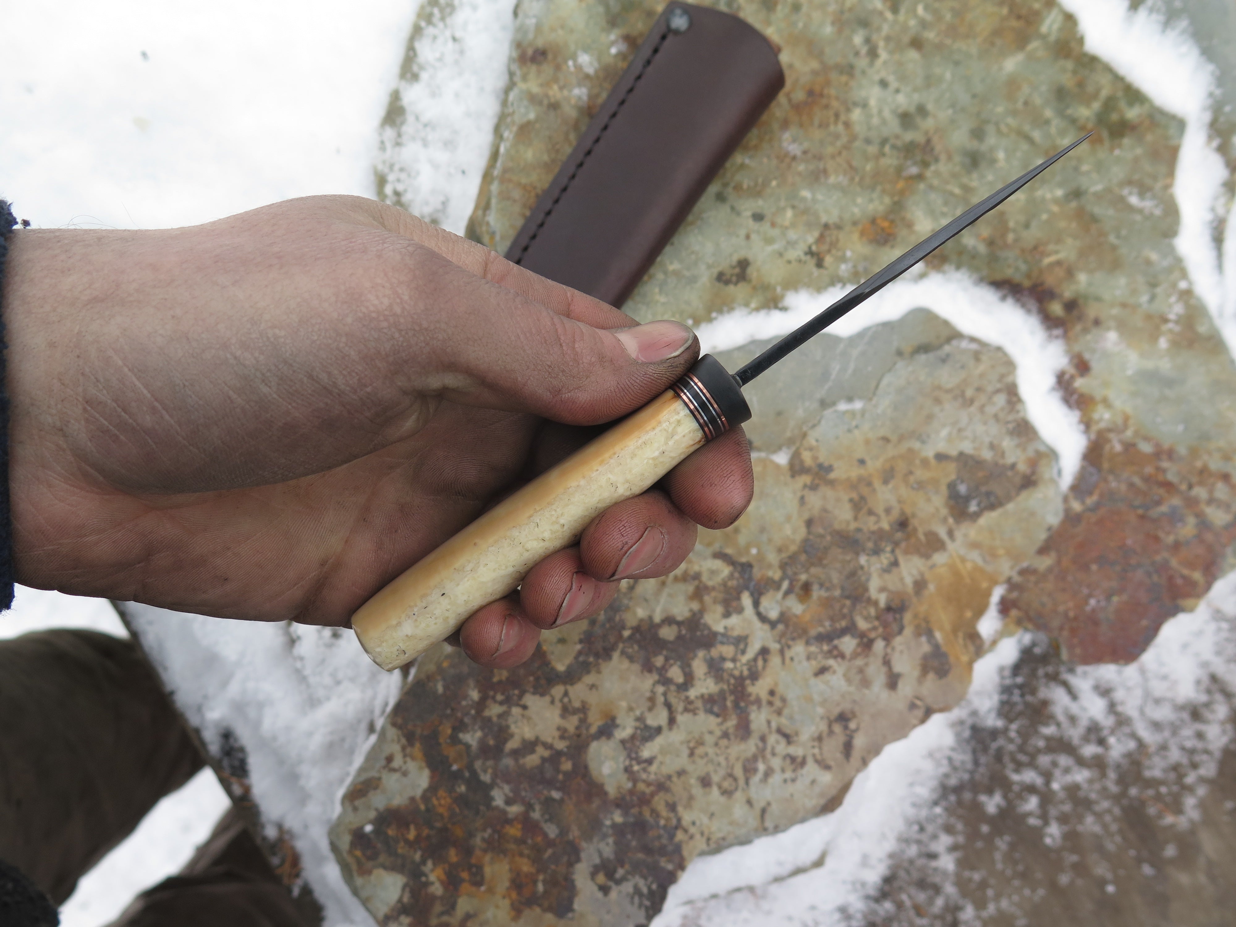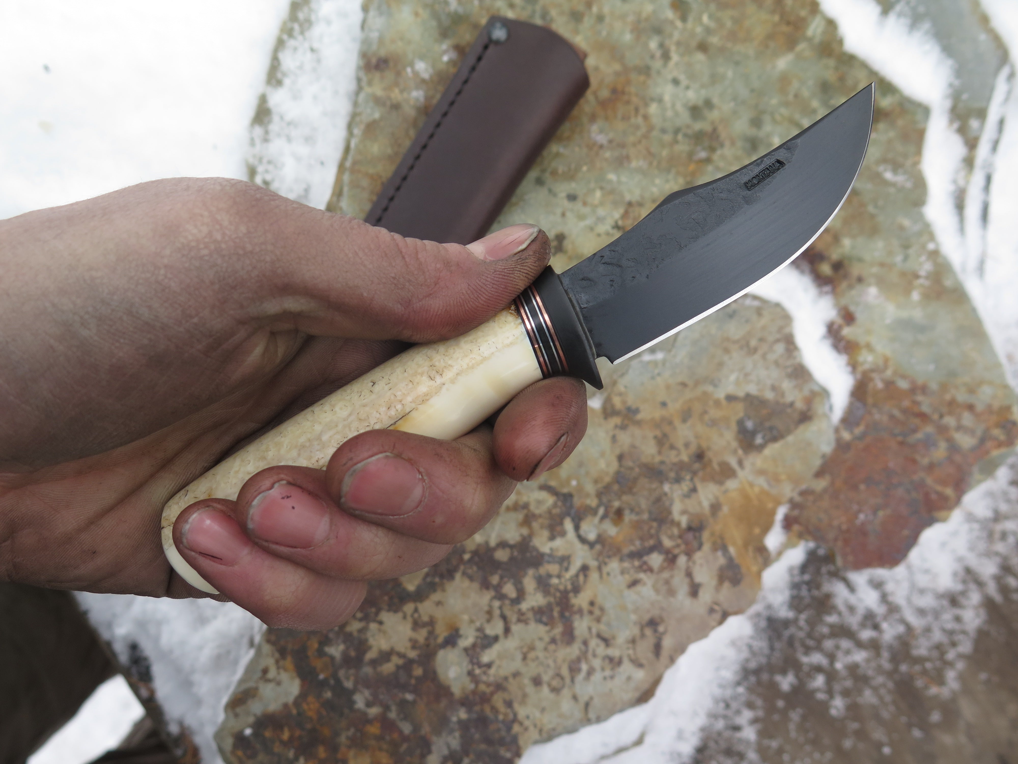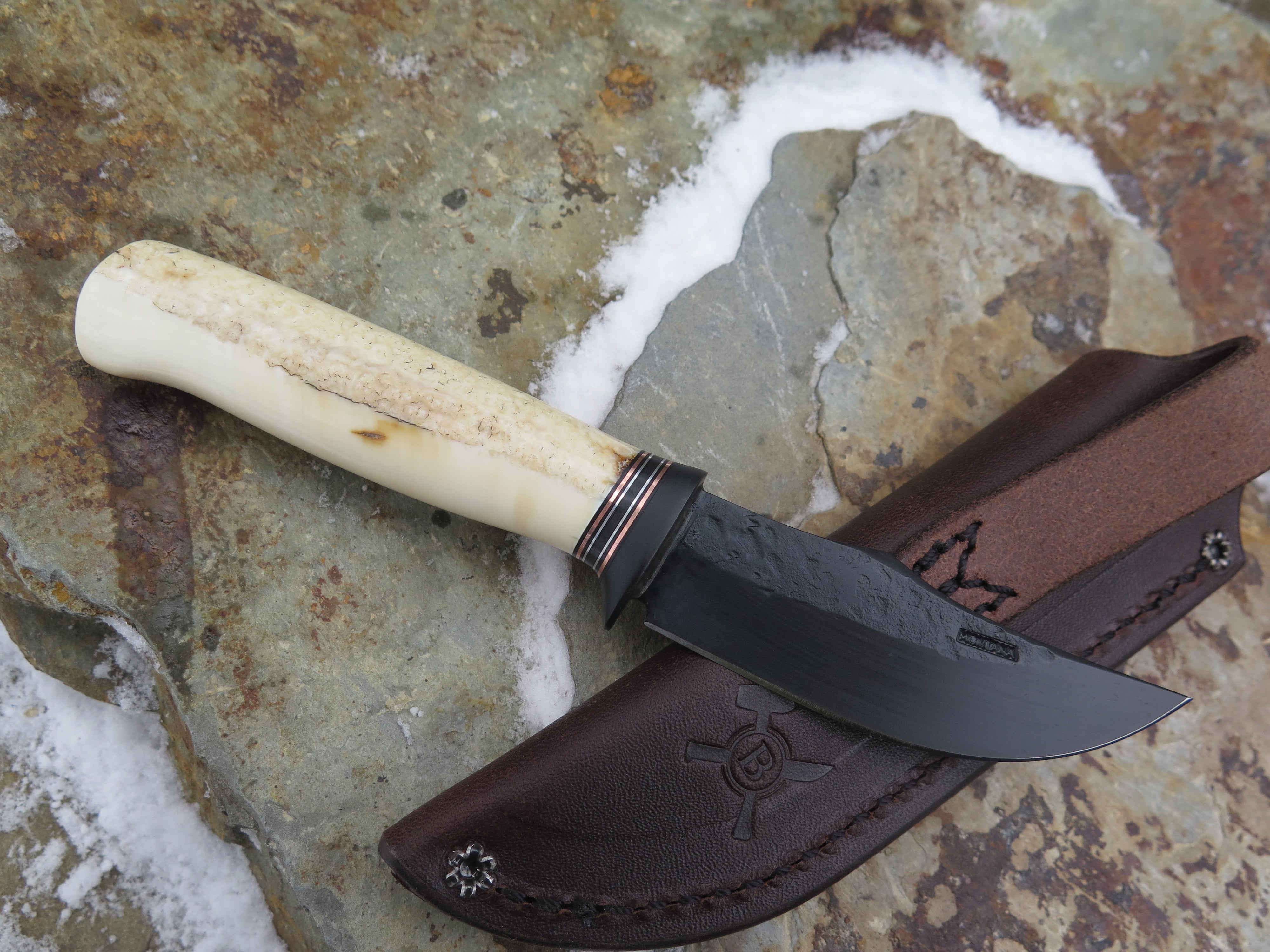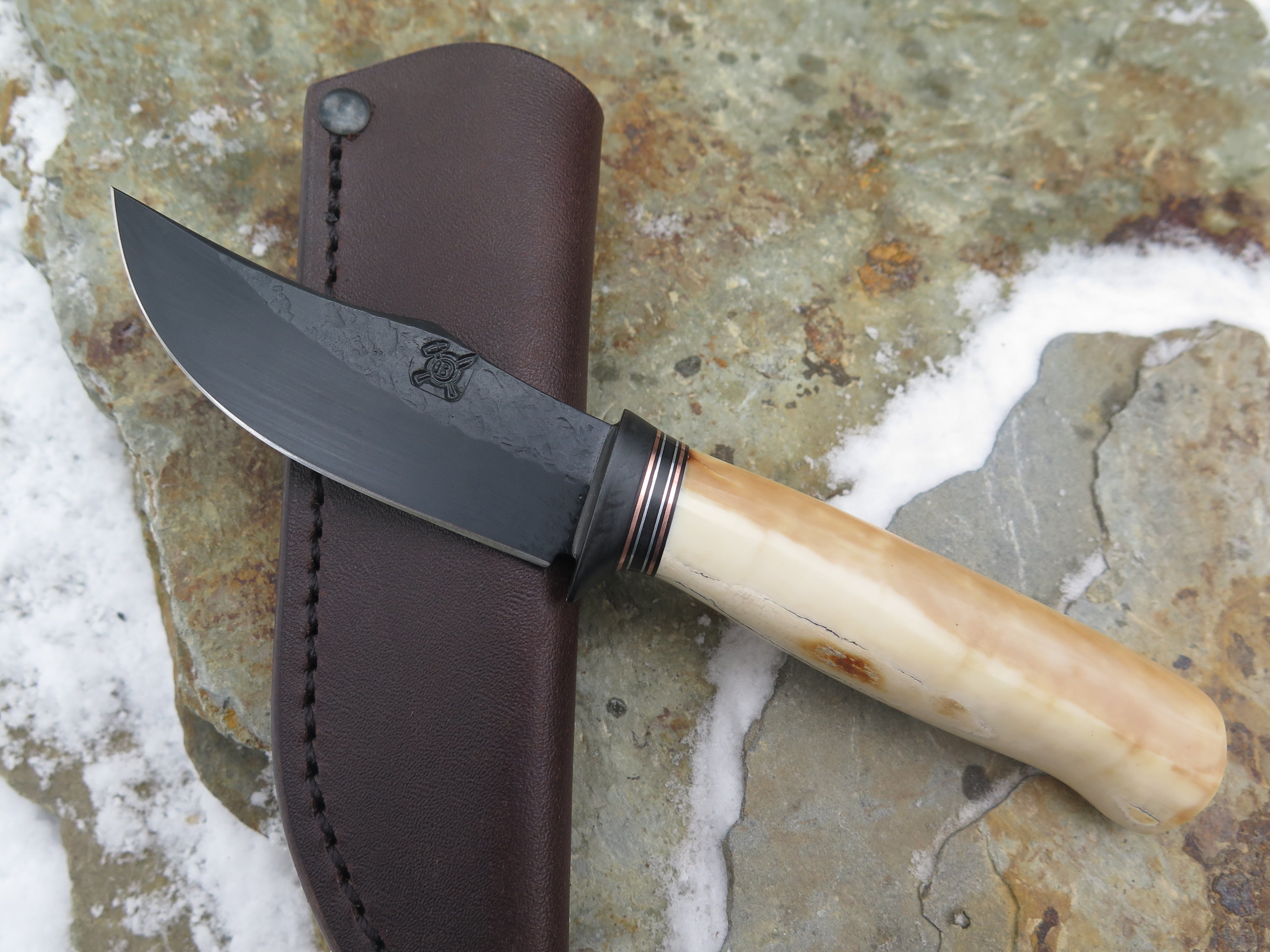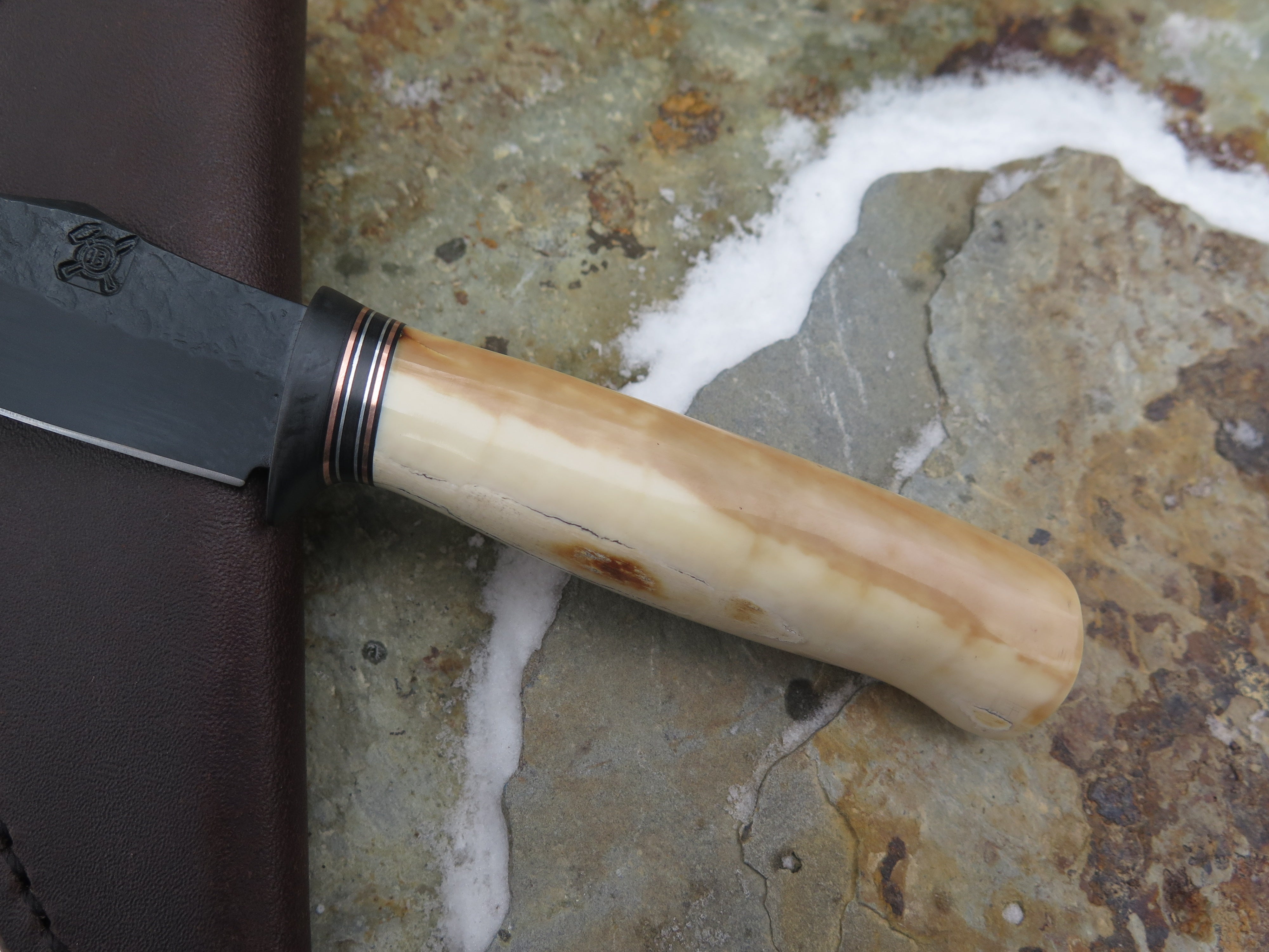 This handsome new Behring Made© Clip Point is hand forged from 1/8" thick high carbon 01 tool steel and it measures 3" from tip to guard with a razor sharp hollow grind, hammermarks, and our forced patina blued finish. The blued steel guard is soldered in place above black fiber, copper and aluminum spacers as well as a premium fossil walrus ivory handle. The overall length measures 6 3/4" and it comes in a classic leather belt sheath.