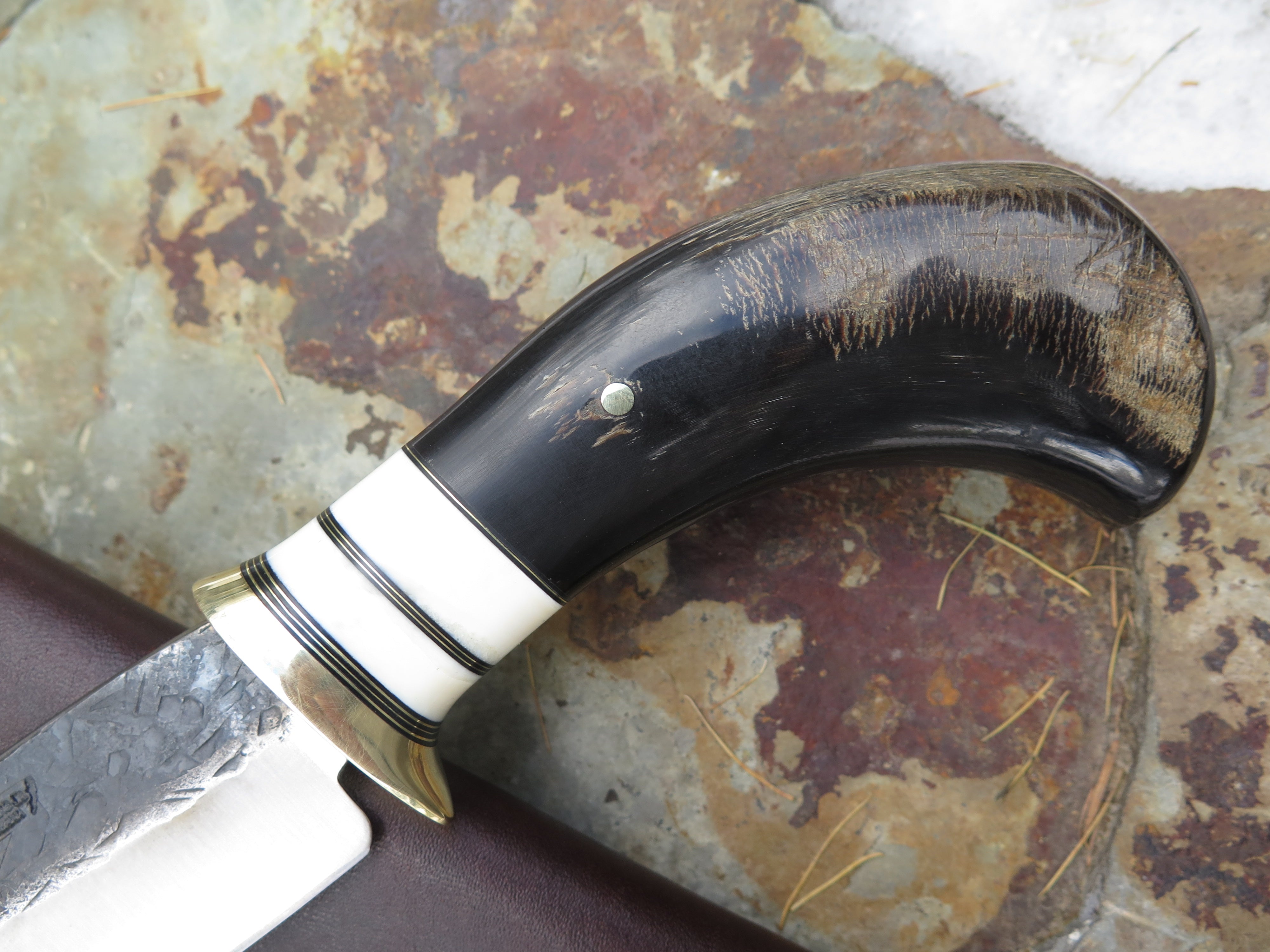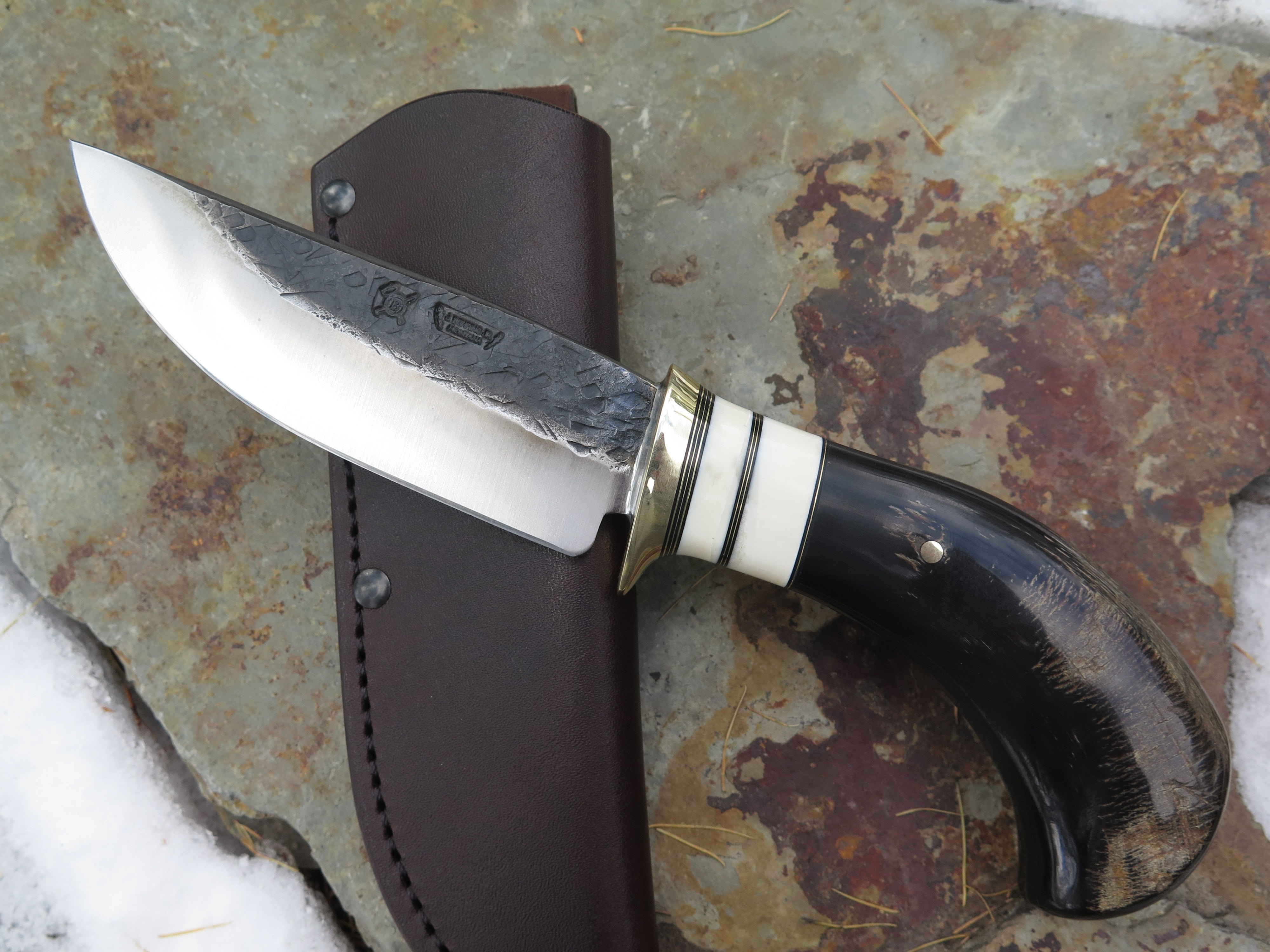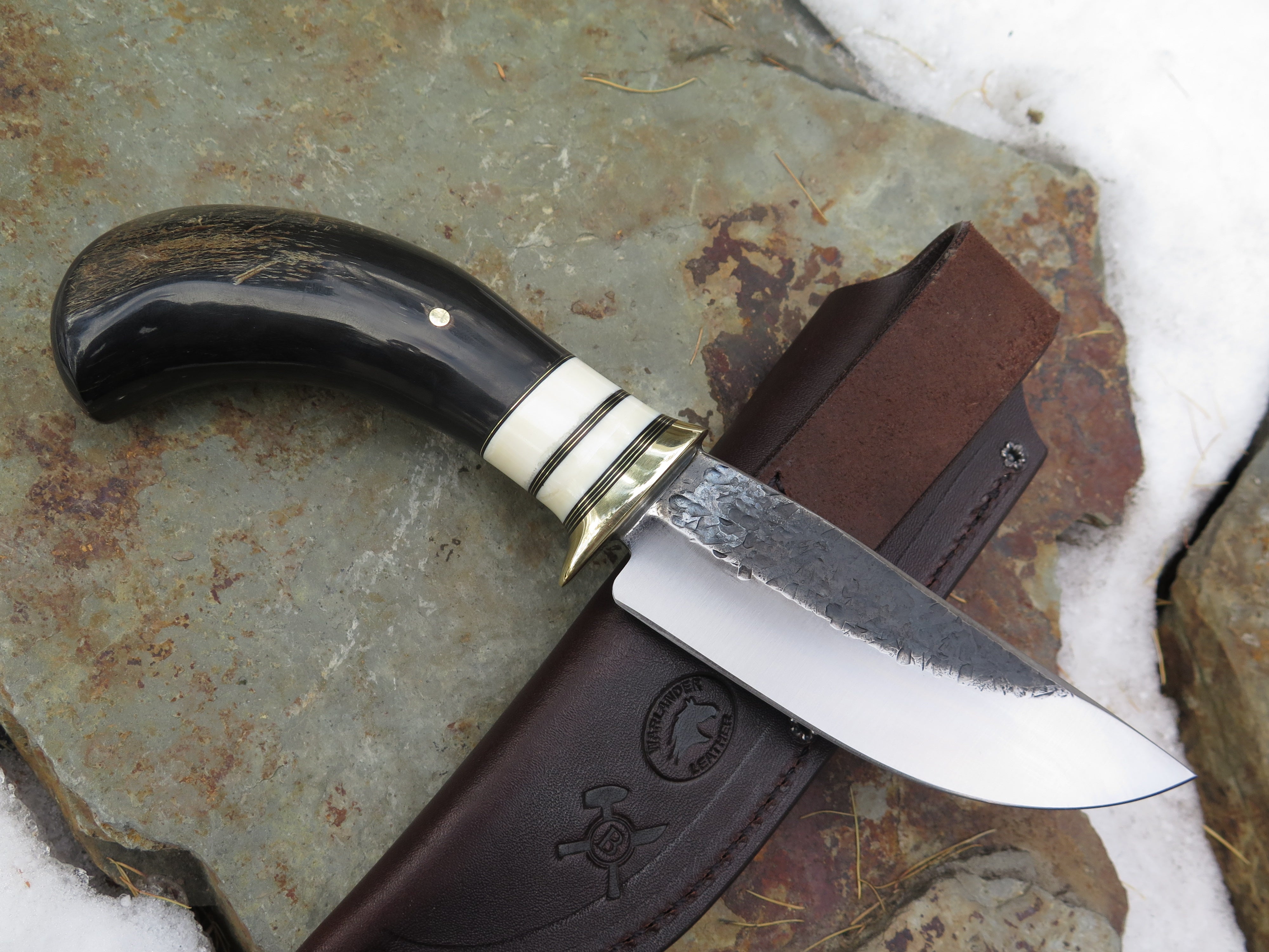 This beautiful new Hunter from Behring Made© is hand forged from 3/16" thick high carbon 01 tool steel and measures 5" from tip to guard with a razor sharp hollow grind and our hammermark finish. The brass guard is soldered in place above brass, black fiber and two fossil walrus ivory spacers as well as a buffalo horn handle that is pinned through the tang with brass. The overall length measures 9 3/4" and it comes in the shown leather belt pouch sheath, though substitutions are available upon request.