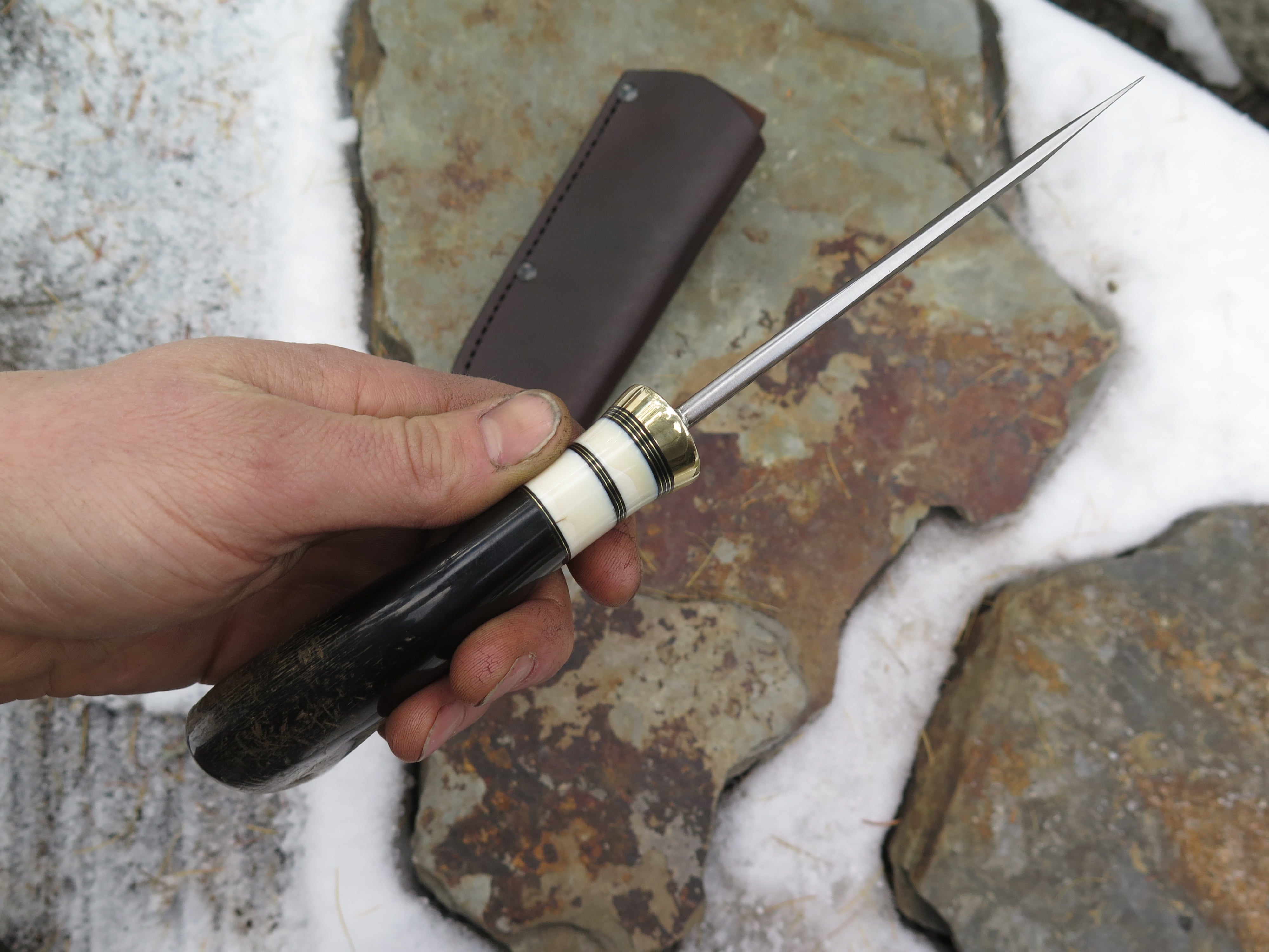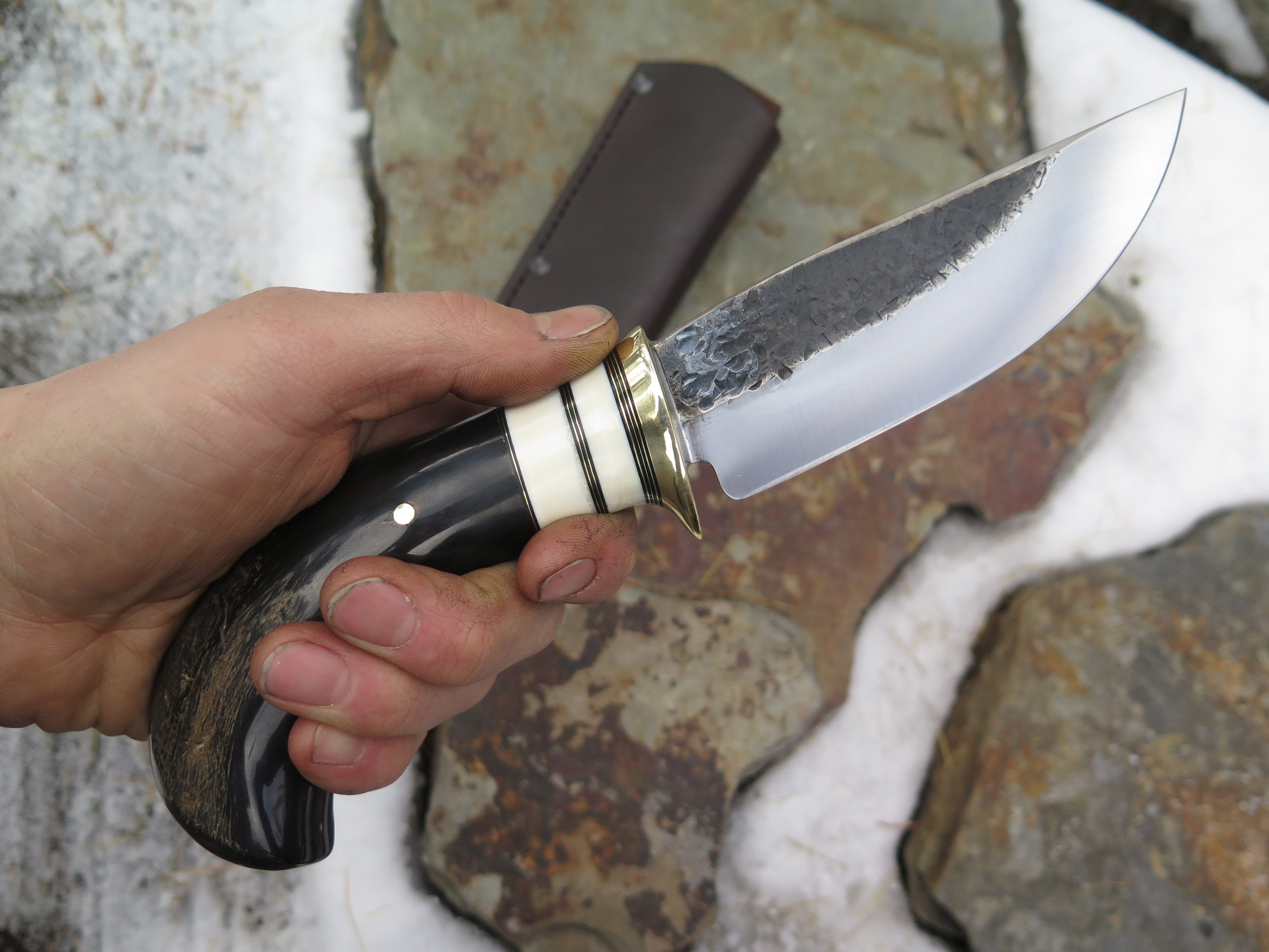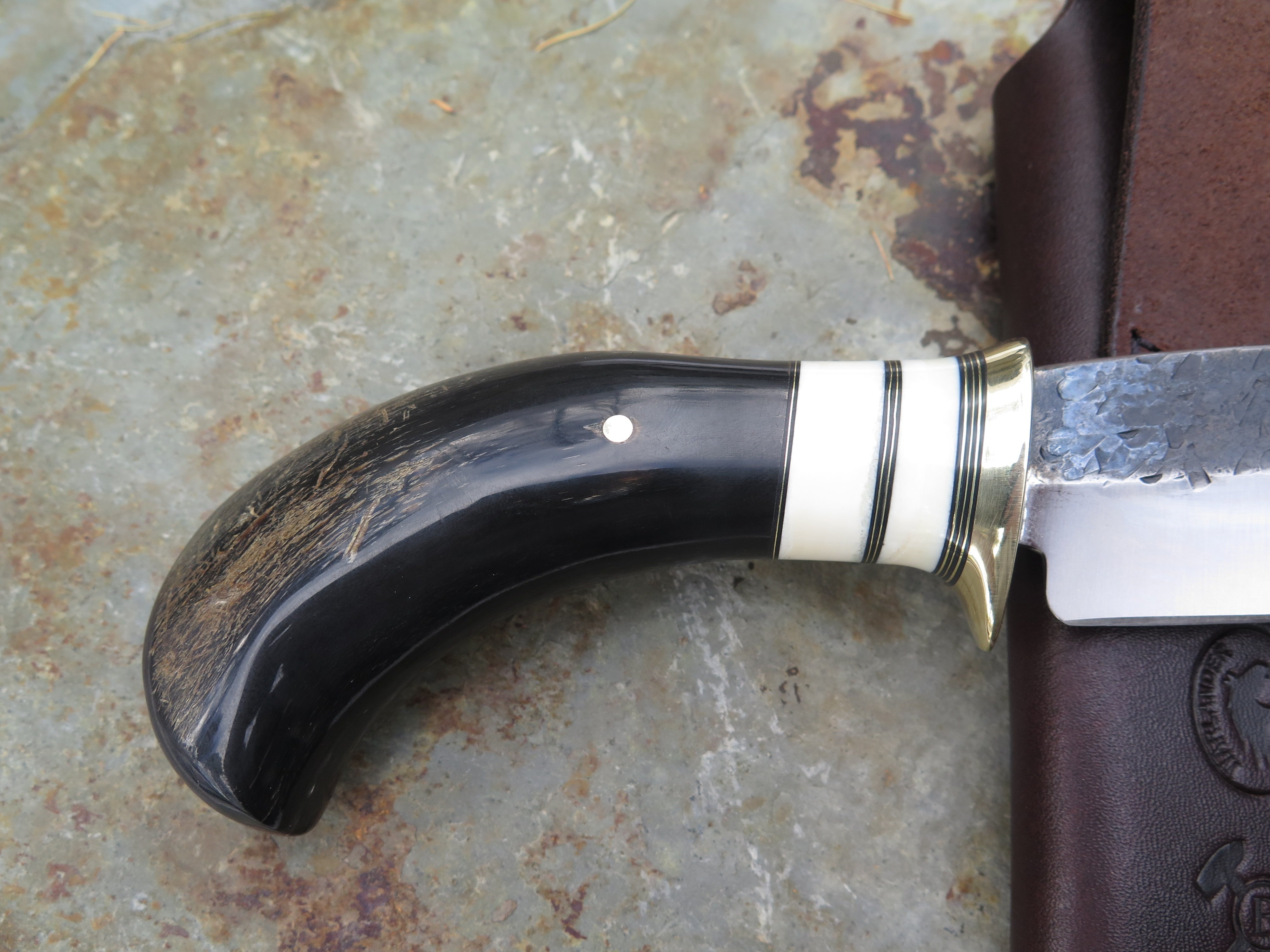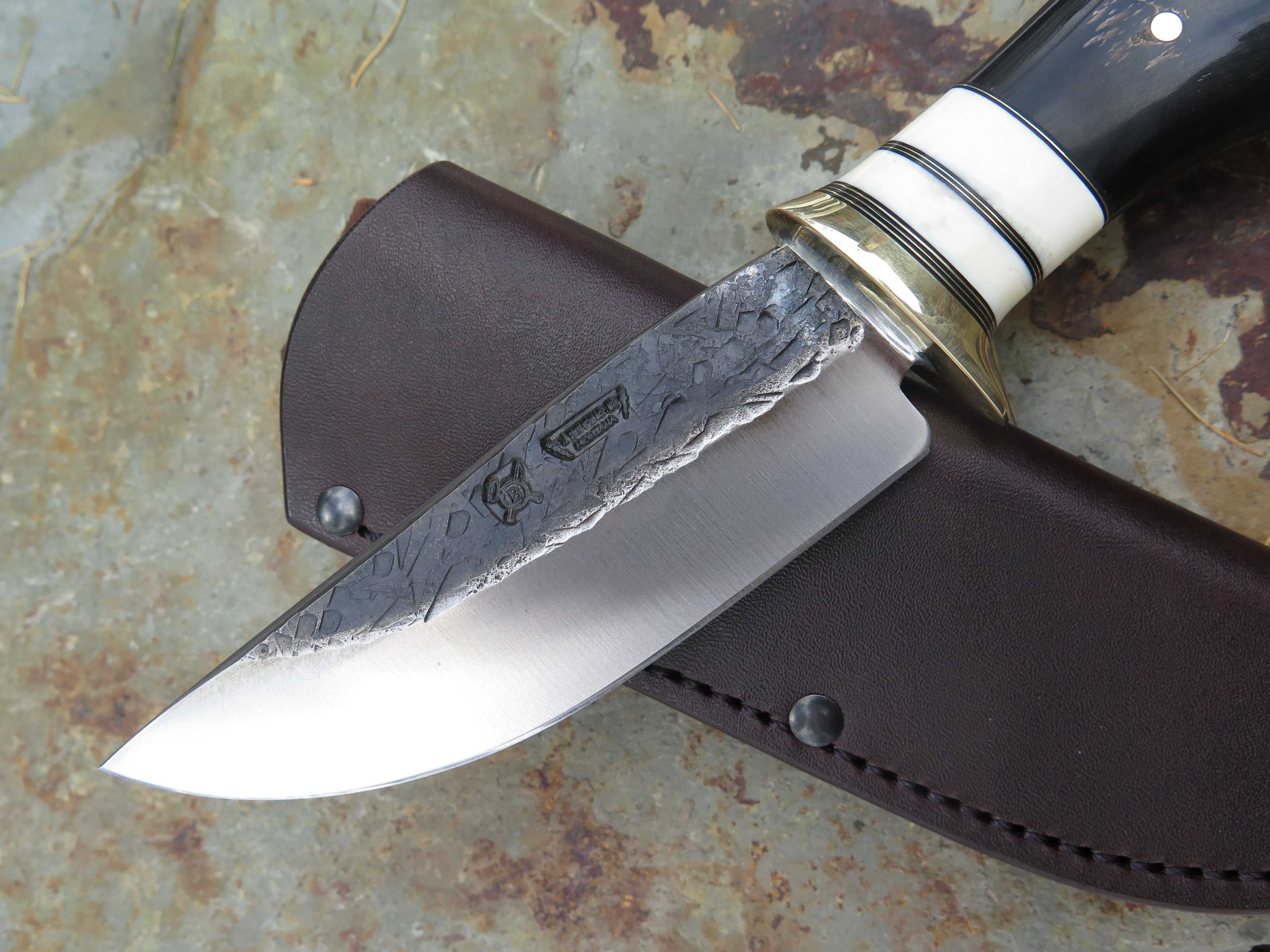 This beautiful new Hunter from Behring Made© is hand forged from 3/16" thick high carbon 01 tool steel and measures 5" from tip to guard with a razor sharp hollow grind and our hammermark finish. The brass guard is soldered in place above brass, black fiber and two fossil walrus ivory spacers as well as a buffalo horn handle that is pinned through the tang with brass. The overall length measures 9 3/4" and it comes in the shown leather belt pouch sheath, though substitutions are available upon request.