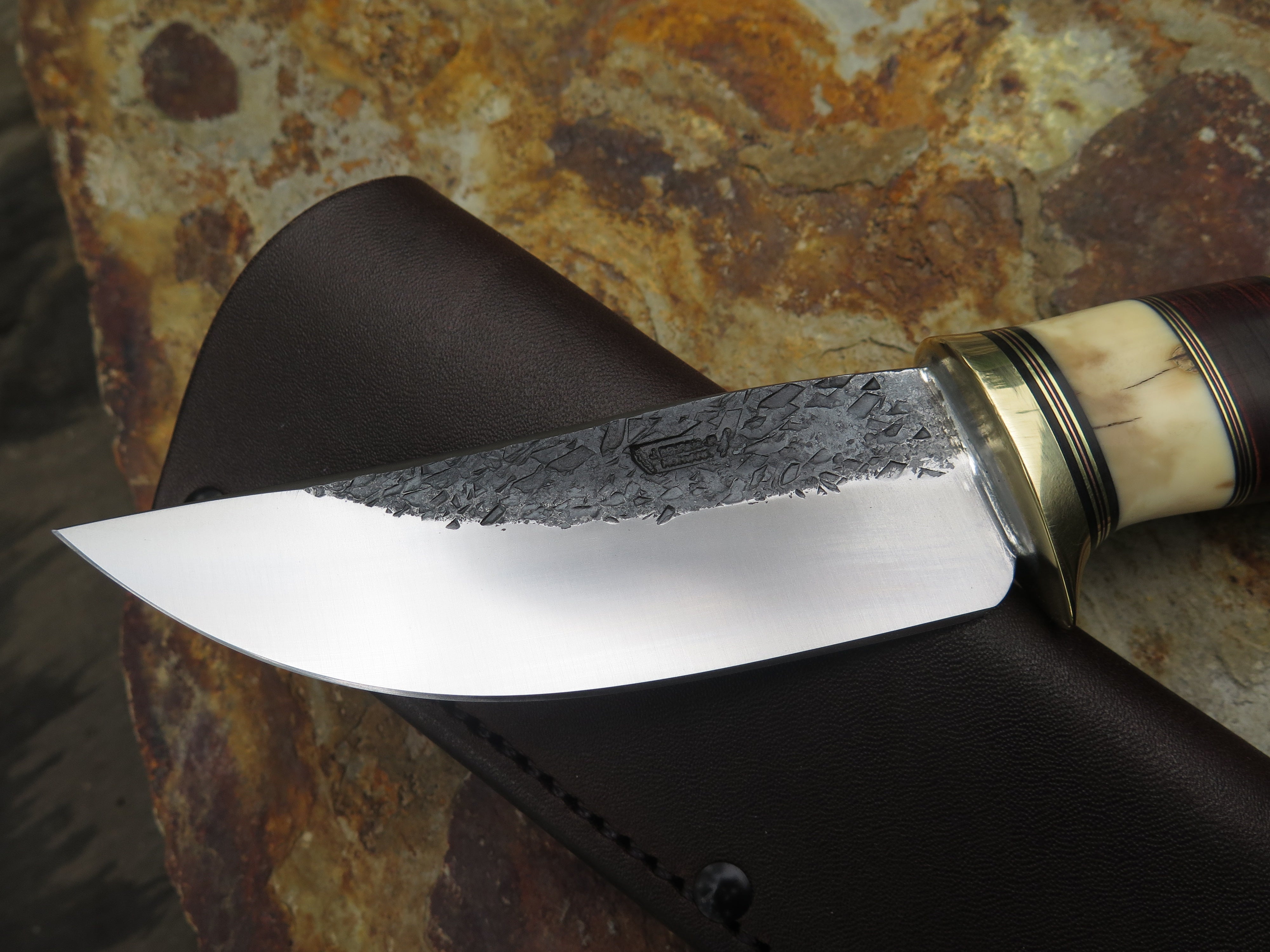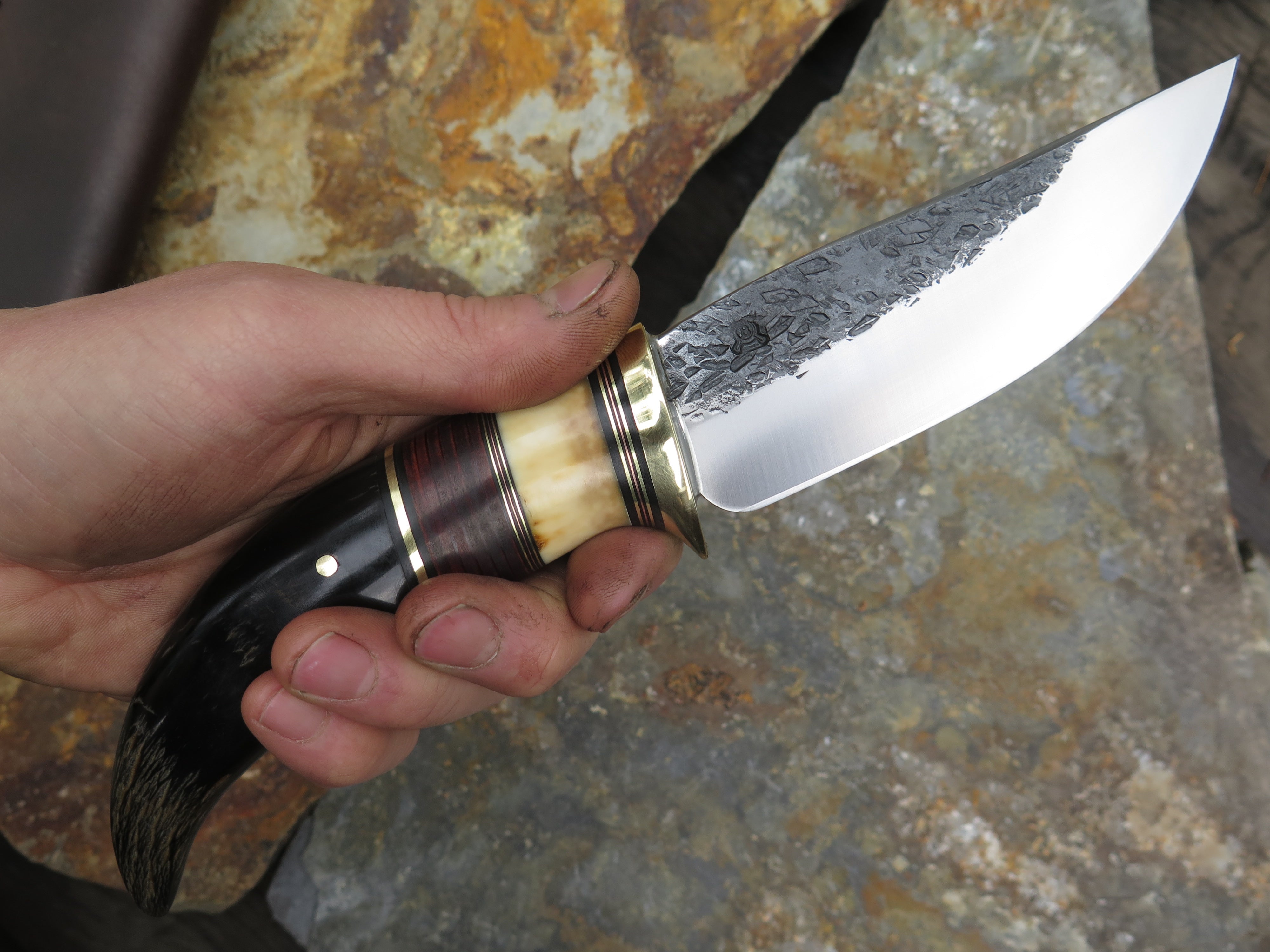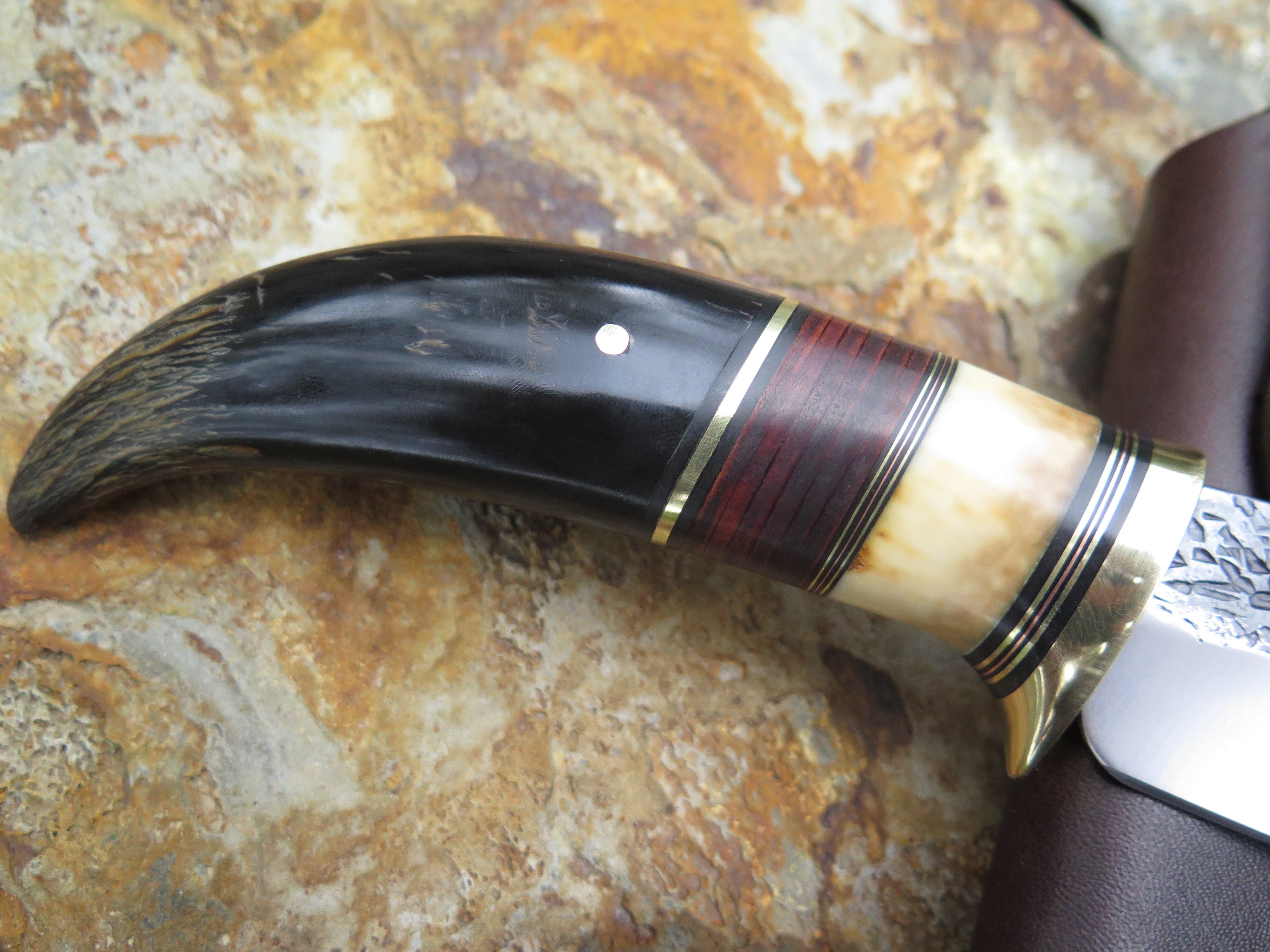 This beautiful new Hunter from Behring Made© is hand forged from 3/16" thick high carbon 01 tool steel and it measures 5" from tip to guard with a razor sharp hollow grind and our hammermark finish. The brass guard is soldered in place above black fiber, copper, brass, horsehide and fossil walrus ivory spacers with a buffalo horn tip handle that's pinned with brass through the tang. The overall length measures just over 10" and it comes in a classic leather belt pouch sheath.