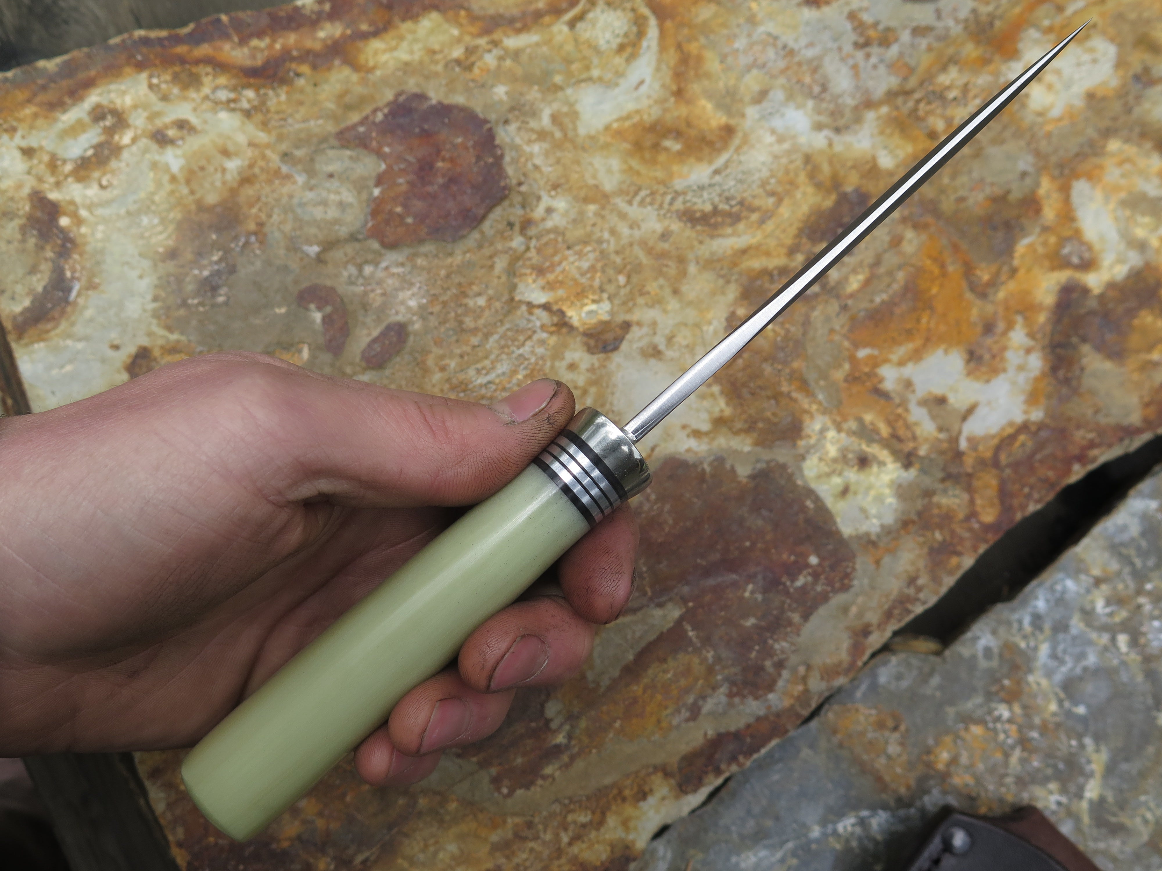 This awesome Hunter from Behring Made© is hand forged from 3/16" thick high carbon 01 tool steel and it measures 5" from tip to guard with a razor sharp convex grind. The nickel silver guards are soldered in place above black fiber and aluminum spacers that top the jade green g10 handle that is also pinned with aluminum. Overall length measures 9 1/2" and it comes in a classic pouch sheath.