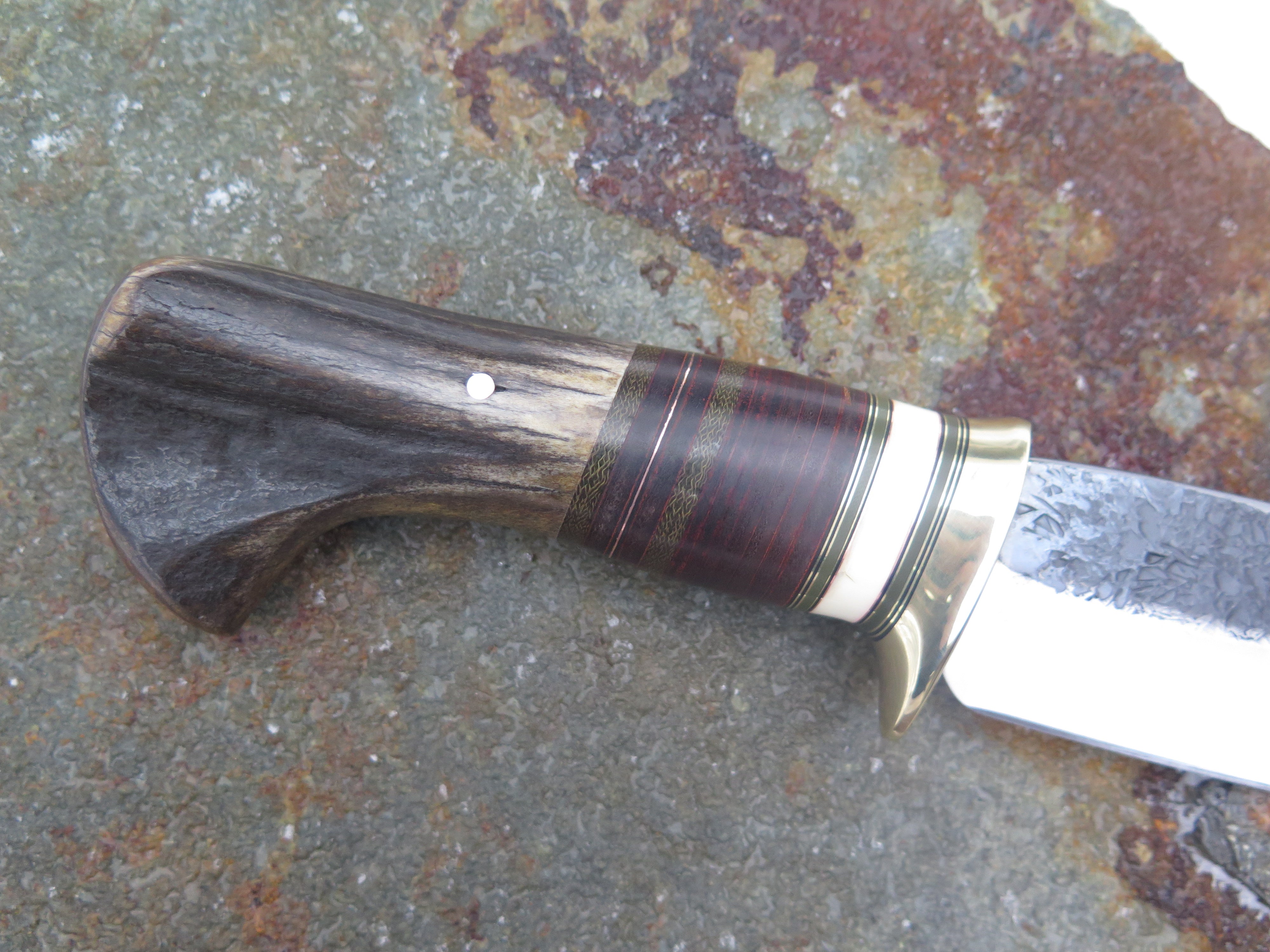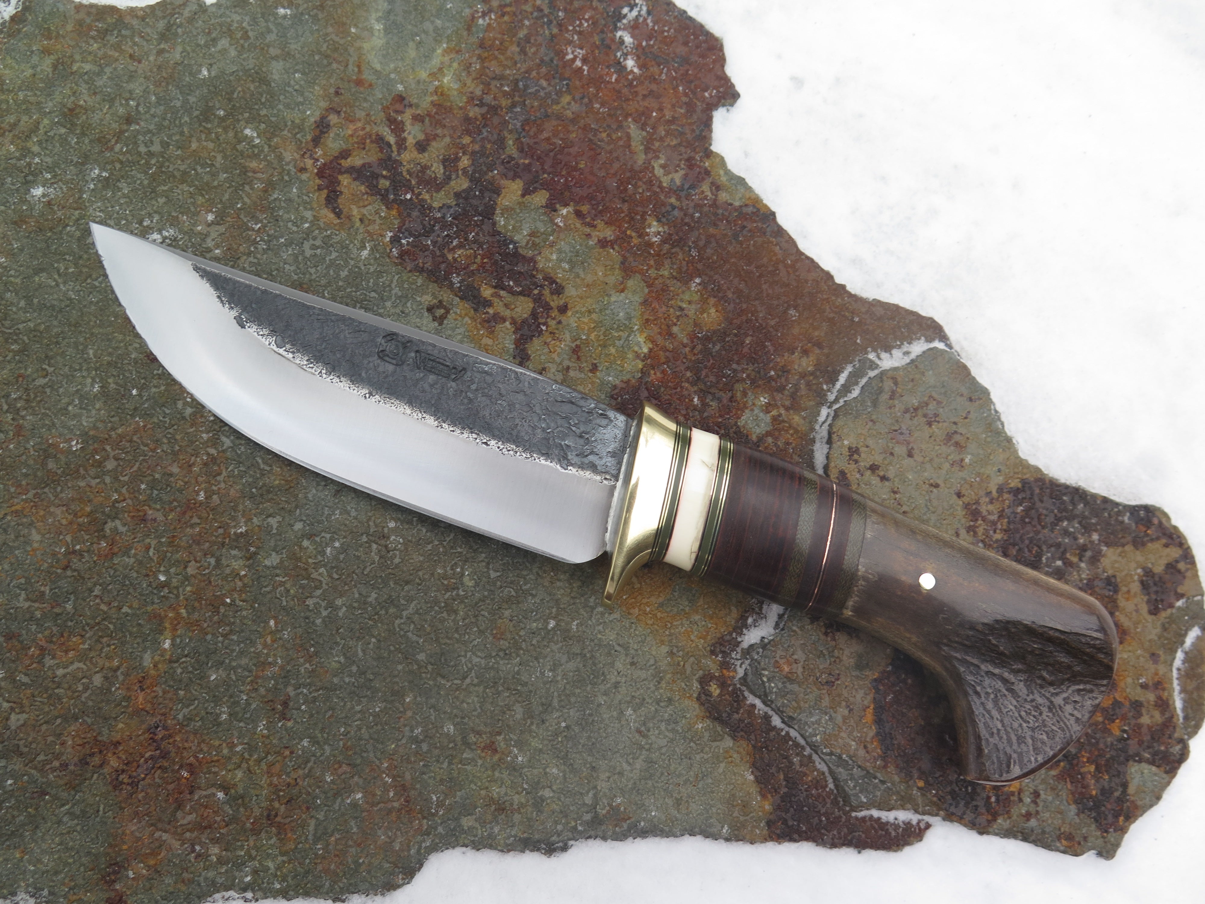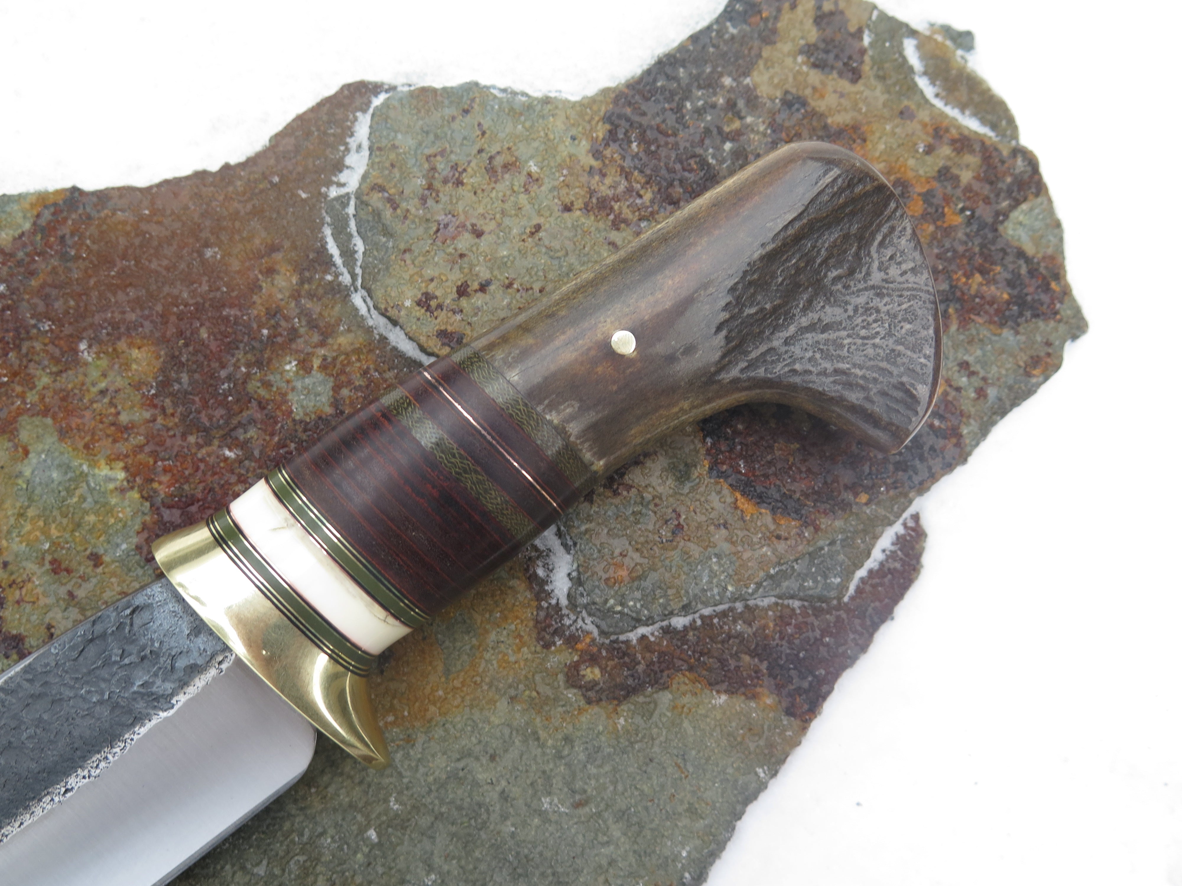 This beastly new Hunter from Behring Made© is hand forged from 1/4" thick high carbon 01 tool steel and it measures 6" from tip to guard with a razor sharp hollow grind and our hammermark finish. The brass guard is soldered in place above black fiber, green micarta and G10, copper, brass, horsehide and fossil walrus spacers as well as a shiras moose handle that's pinned through the tang with brass. The overall length measures 11 1/2" and it's going to come in a Behring Made custom sheath (yes, you heard that right- custom made right here in house)!