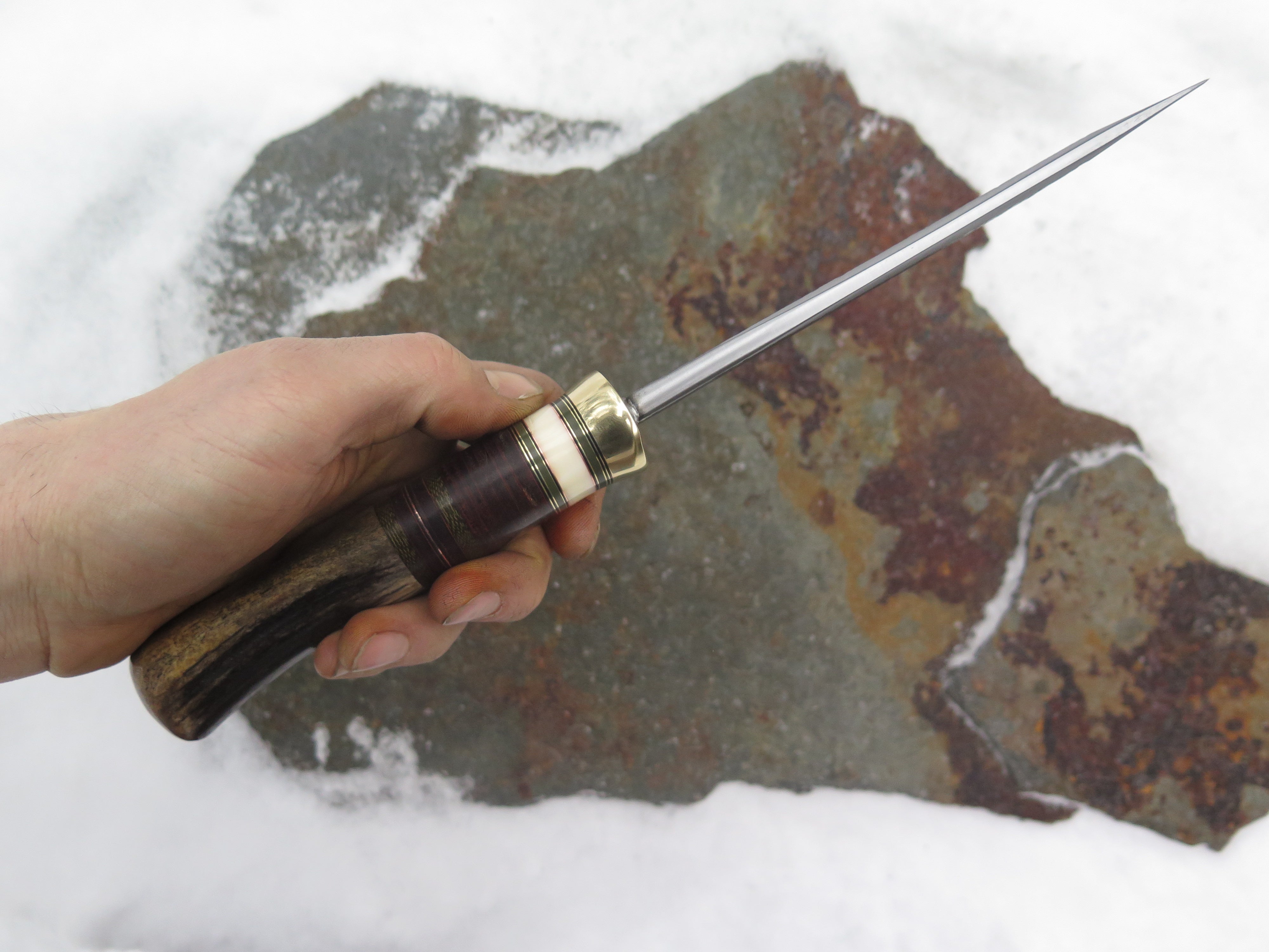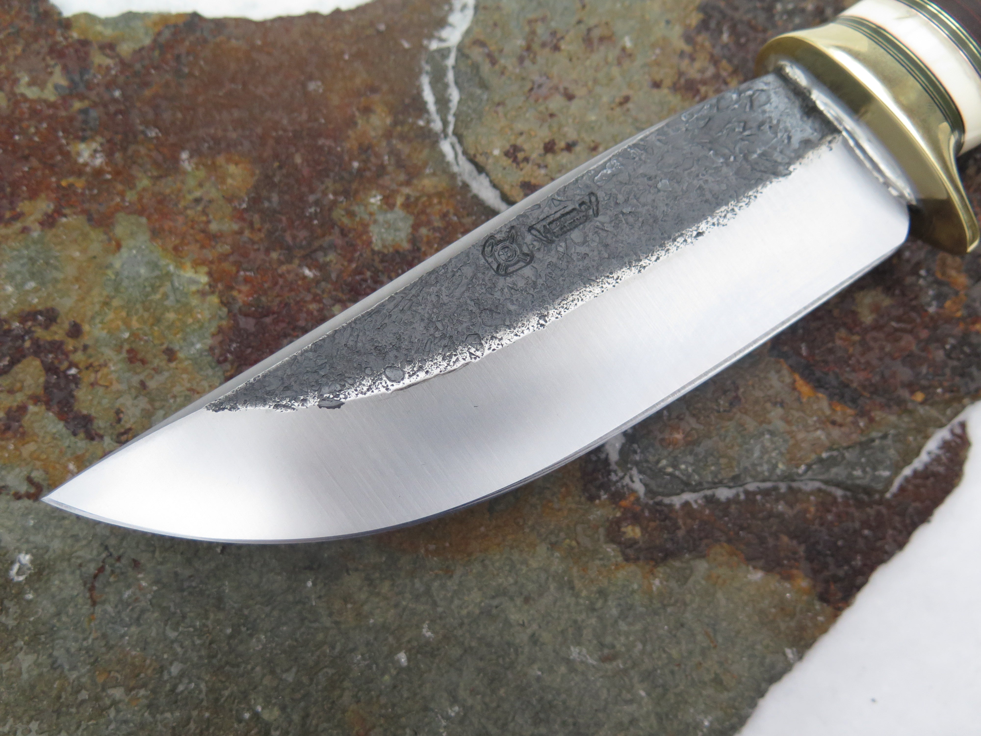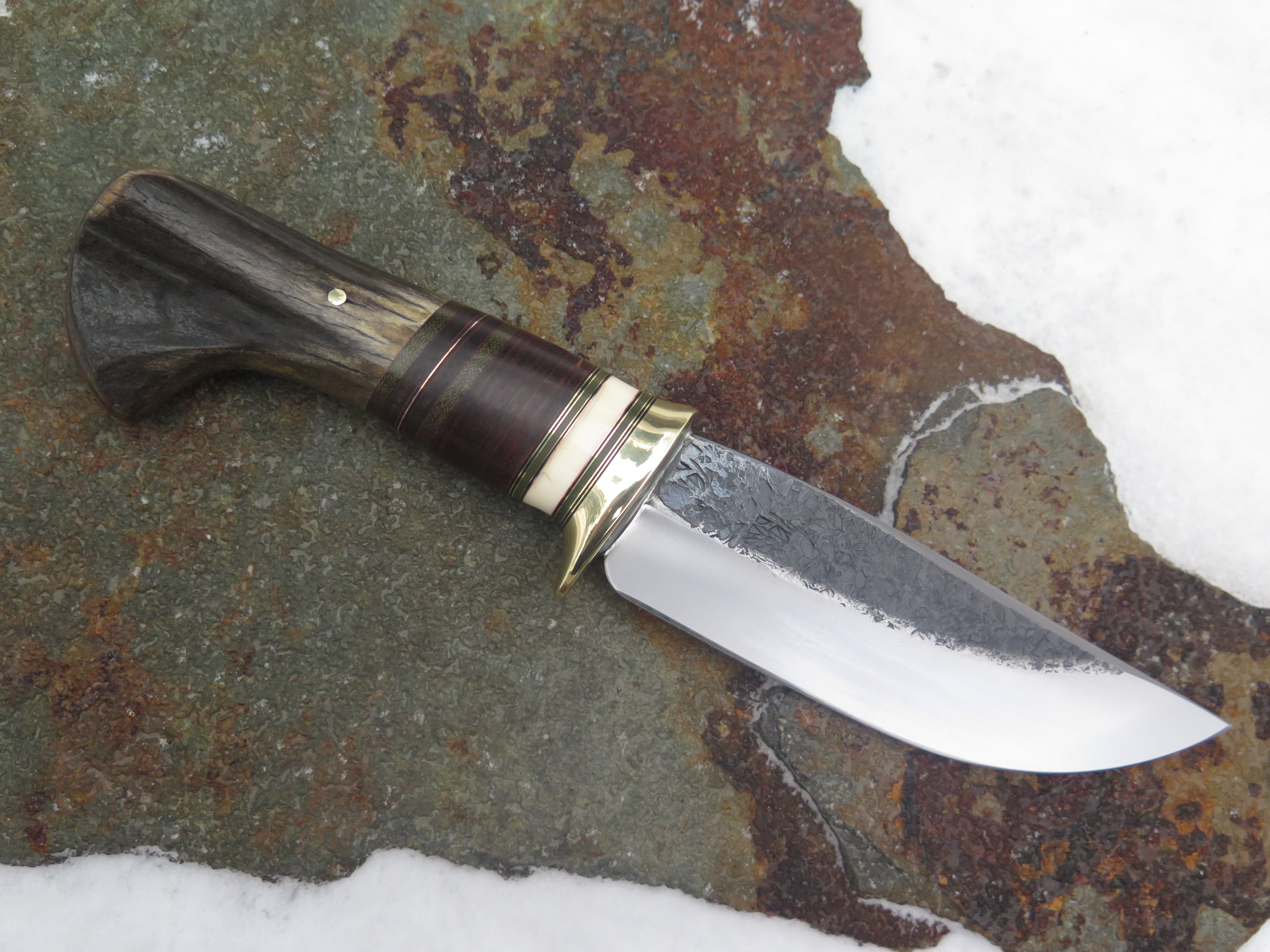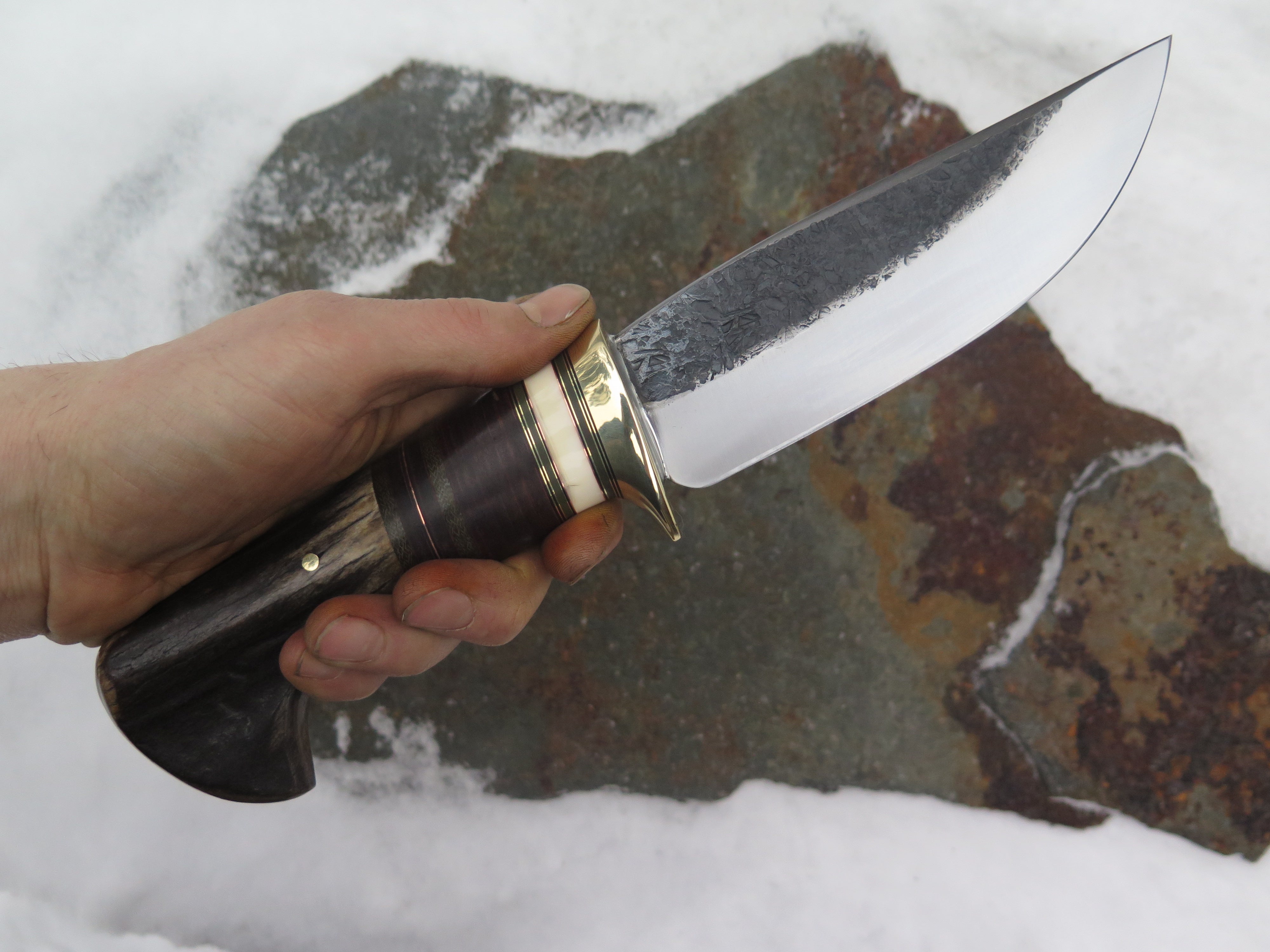 This beastly new Hunter from Behring Made© is hand forged from 1/4" thick high carbon 01 tool steel and it measures 6" from tip to guard with a razor sharp hollow grind and our hammermark finish. The brass guard is soldered in place above black fiber, green micarta and G10, copper, brass, horsehide and fossil walrus spacers as well as a shiras moose handle that's pinned through the tang with brass. The overall length measures 11 1/2" and it's going to come in a Behring Made custom sheath (yes, you heard that right- custom made right here in house)!