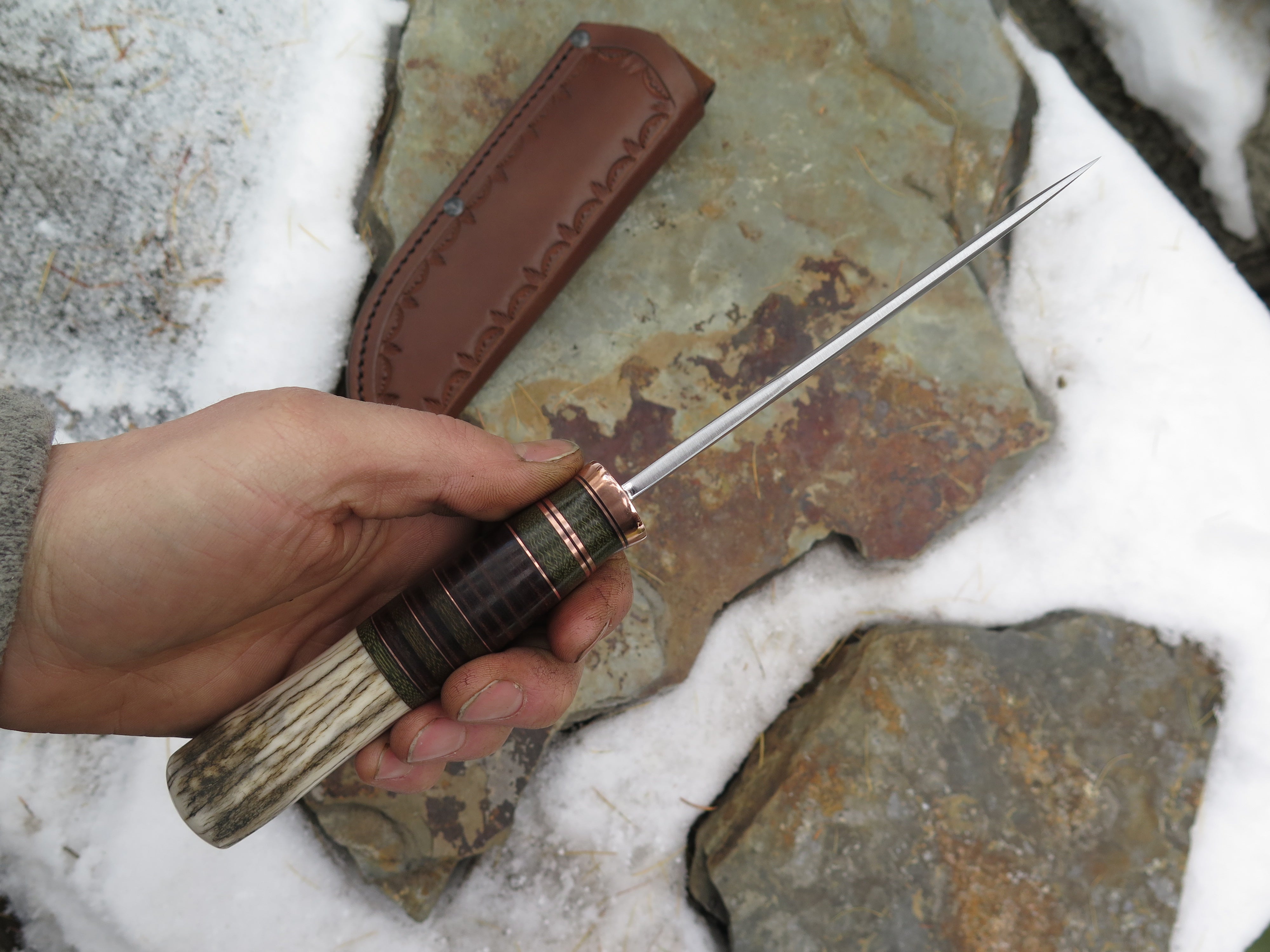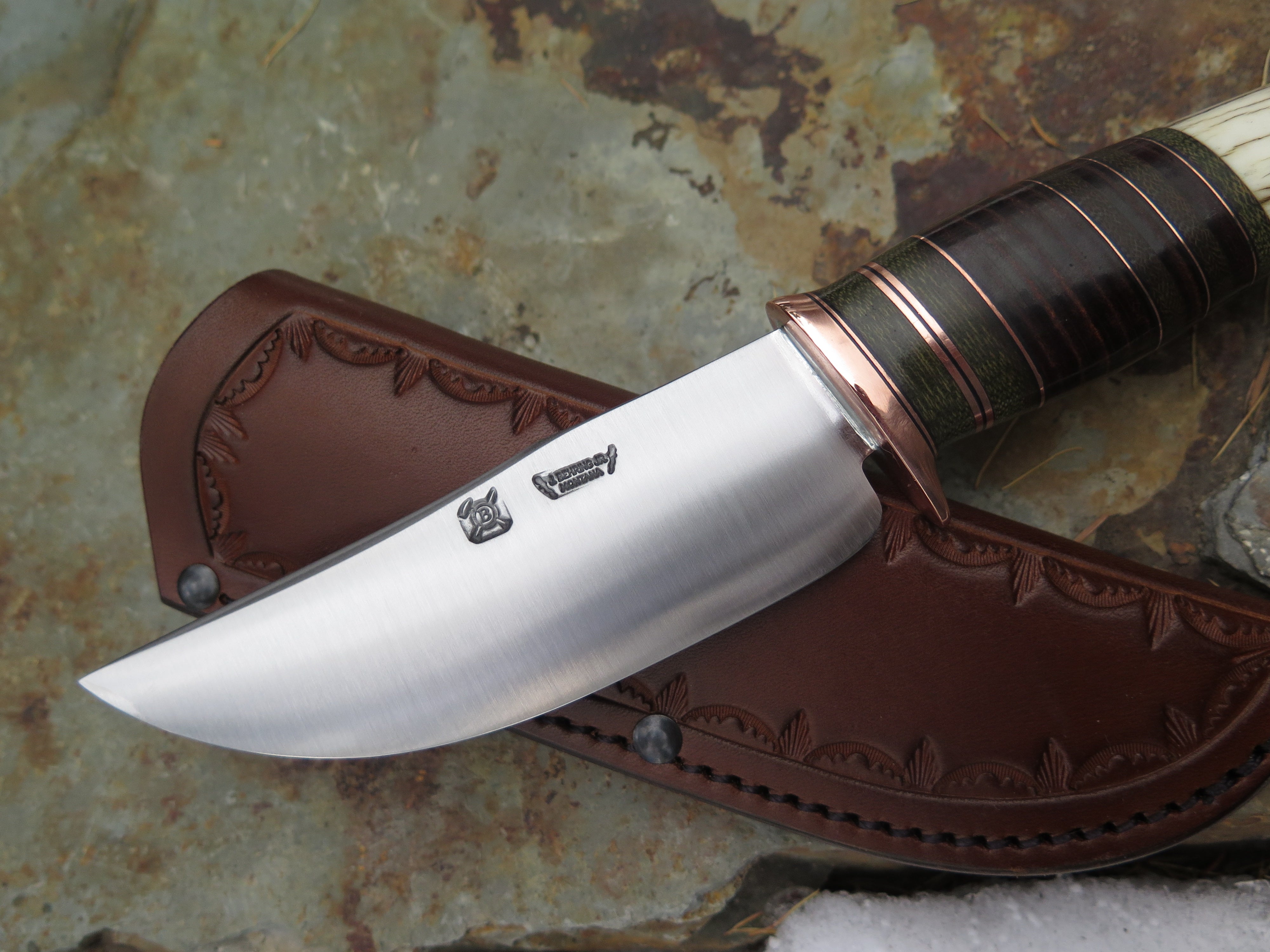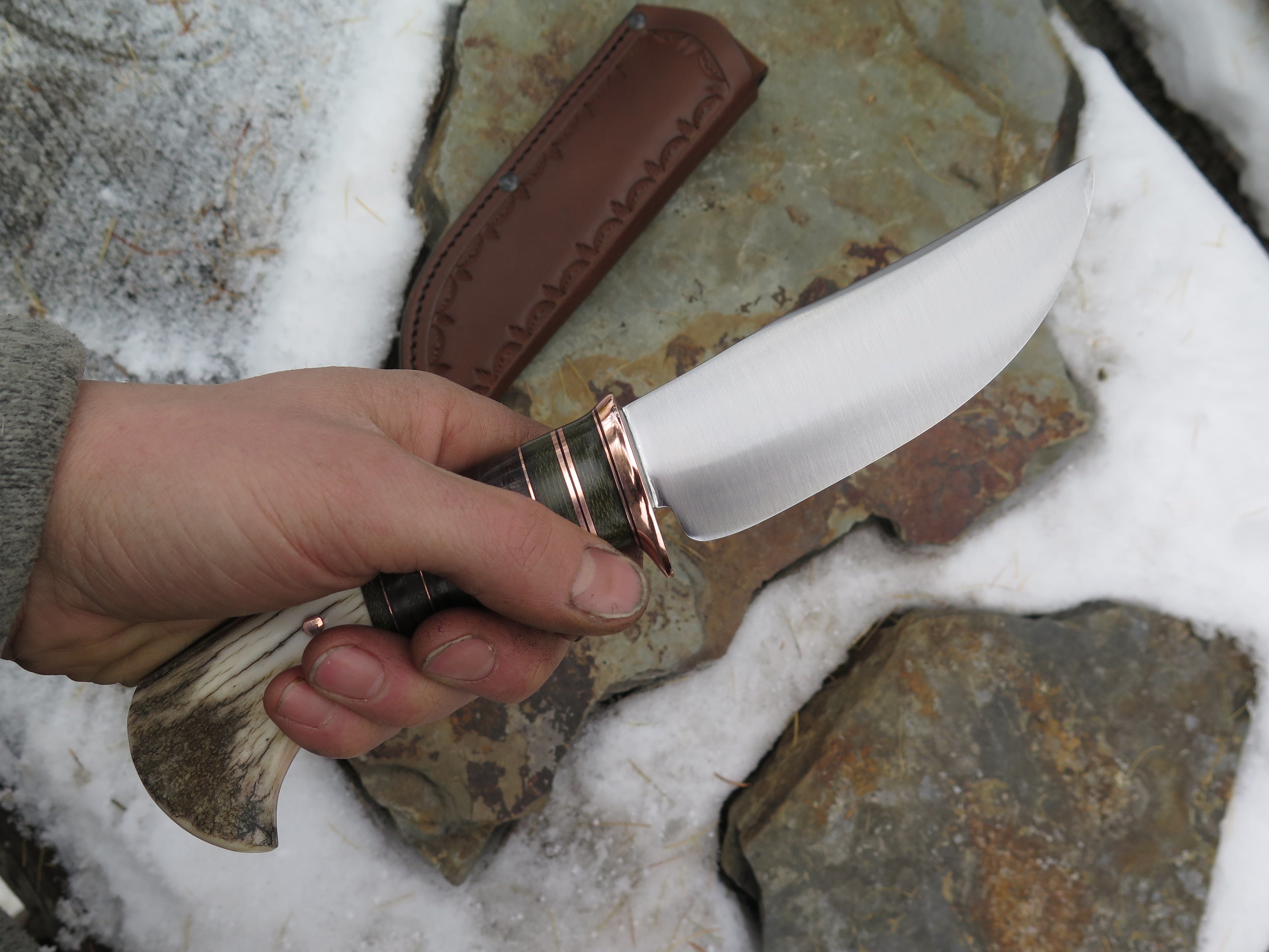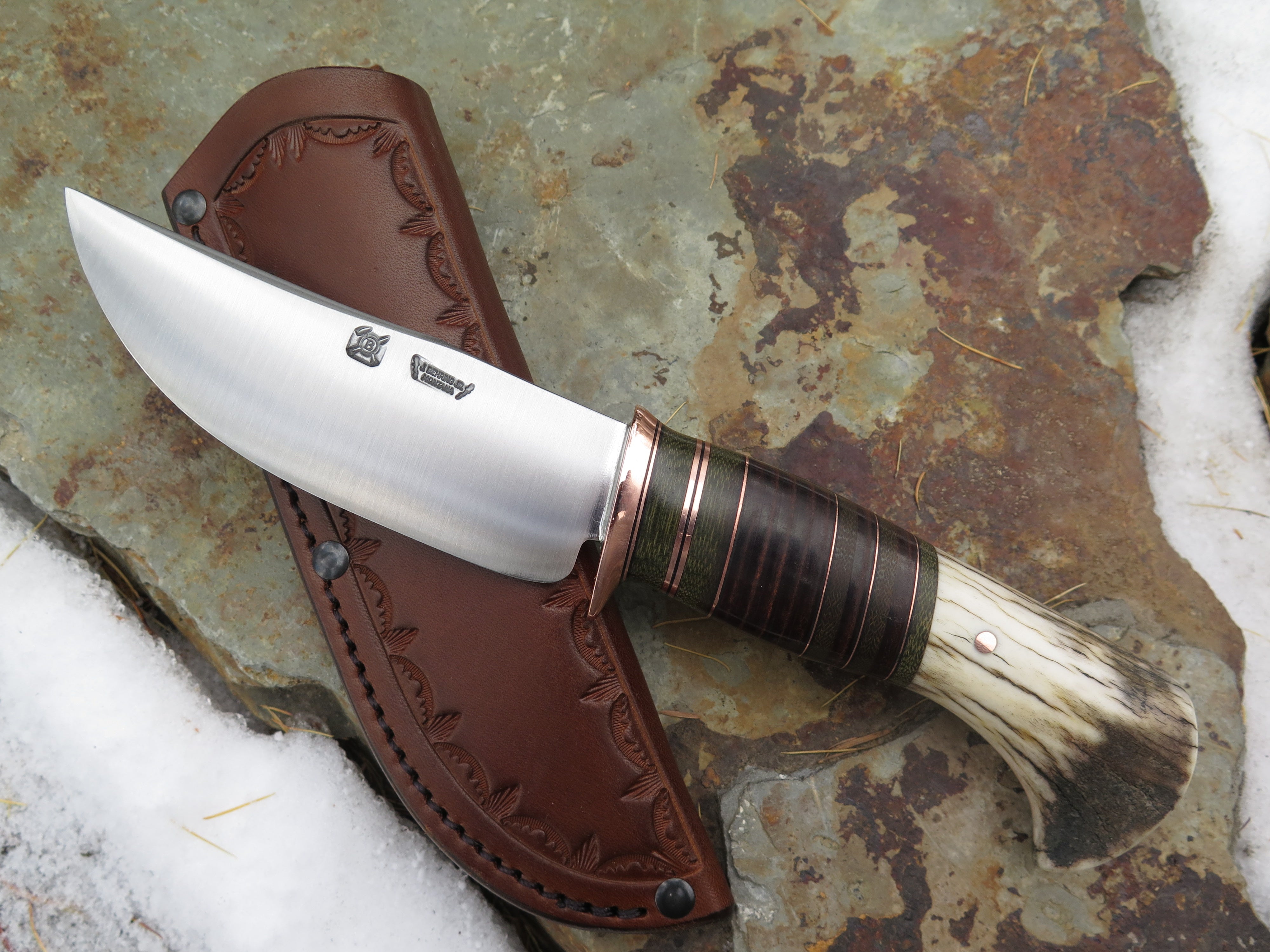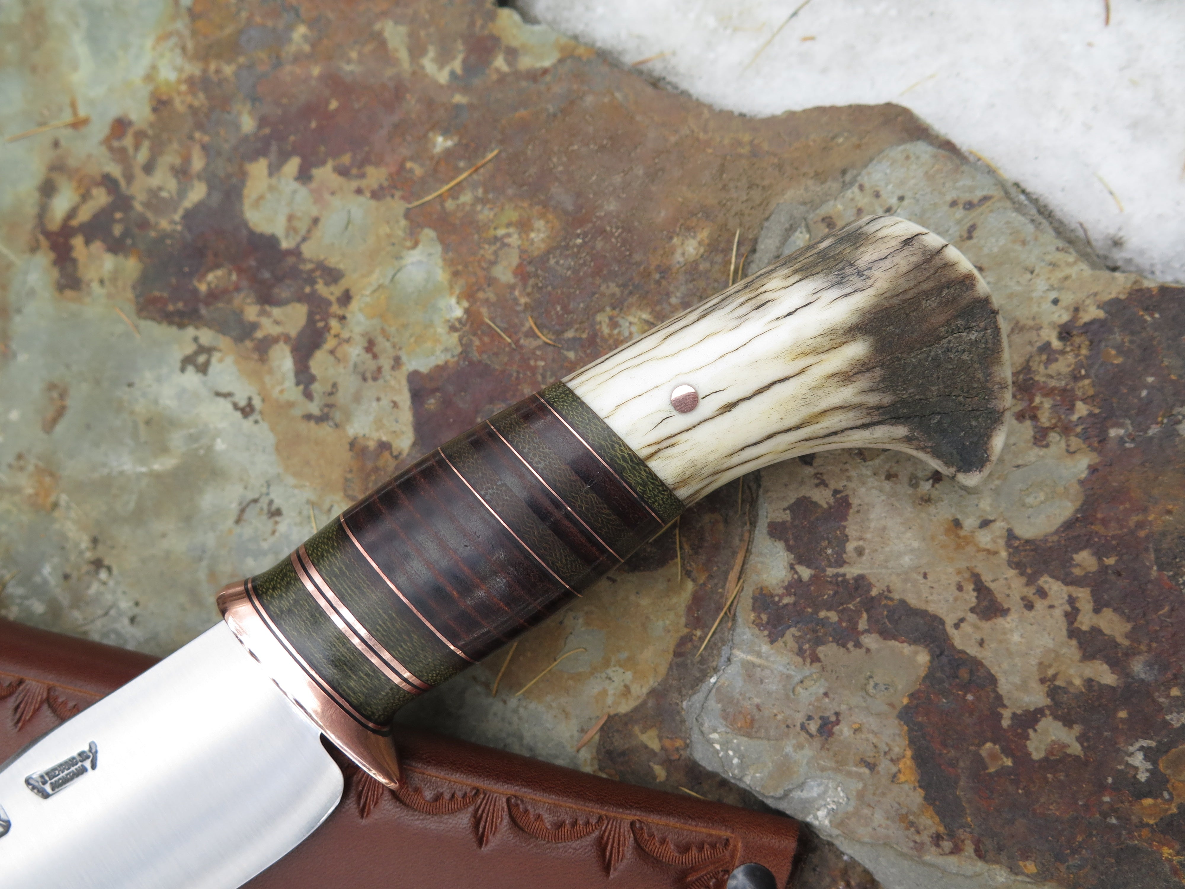 This beautiful new Hunter from Behring Made© is hand forged from 316" thick high carbon 01 tool steel and measures 5" from tip to guard with a razor sharp convex grind. The copper guard is soldered in place above green micarta, black fiber, copper and horsehide leather spacers as well as a shiras moose antler butt that is pinned through the tang with copper. The overall length measures 10" and it comes in the shown leather belt pouch sheath, though substitutions are available upon request.