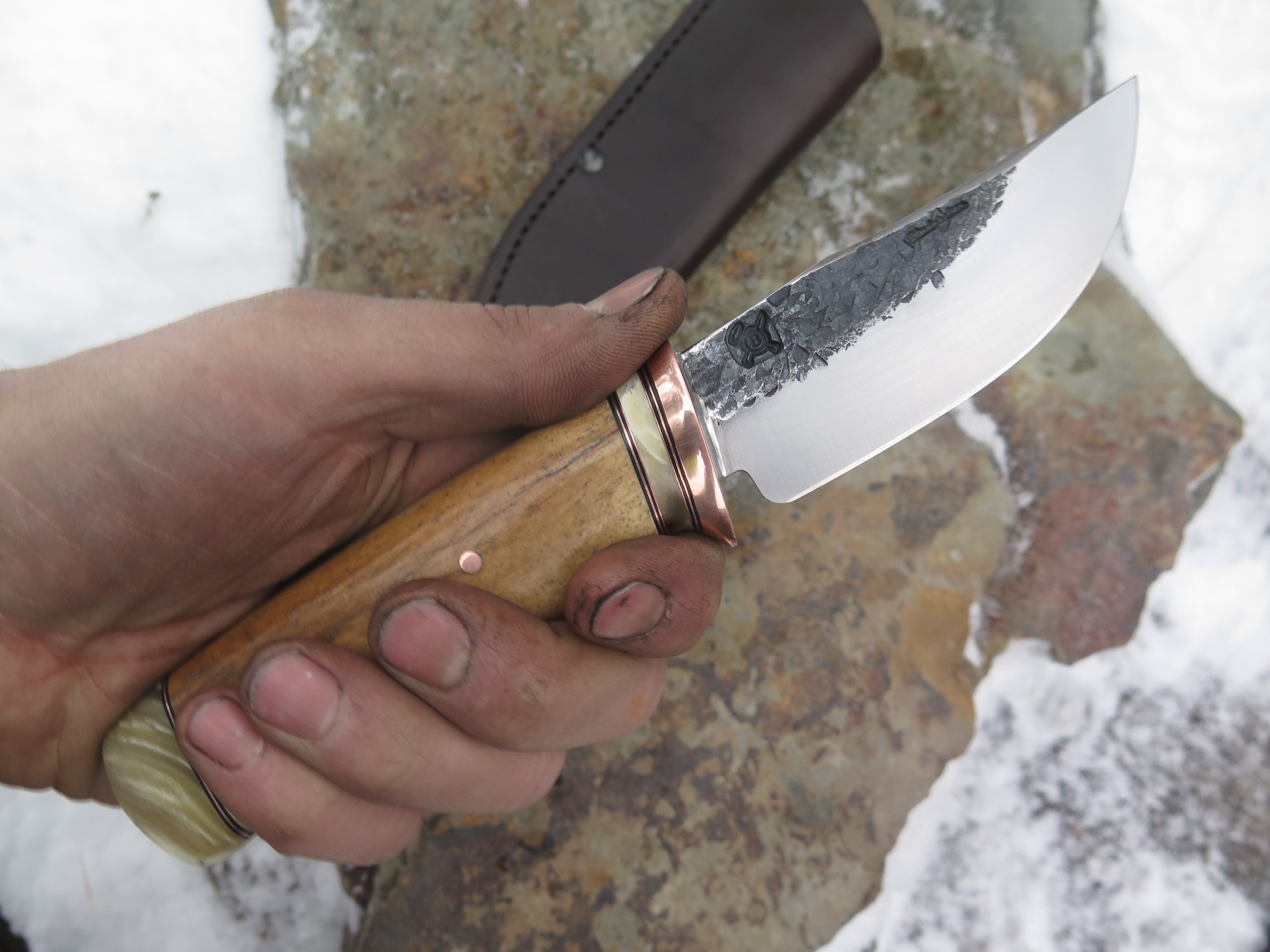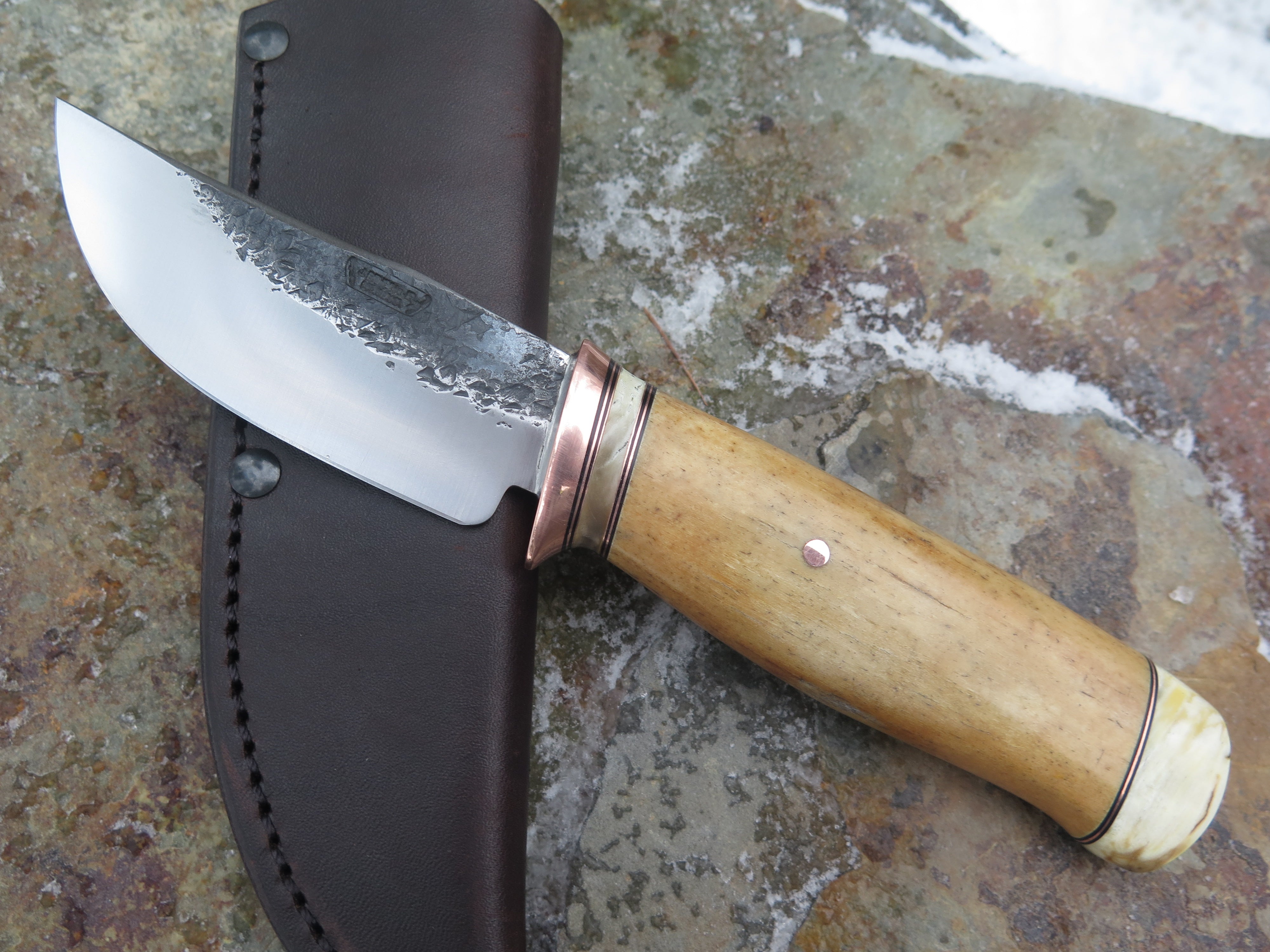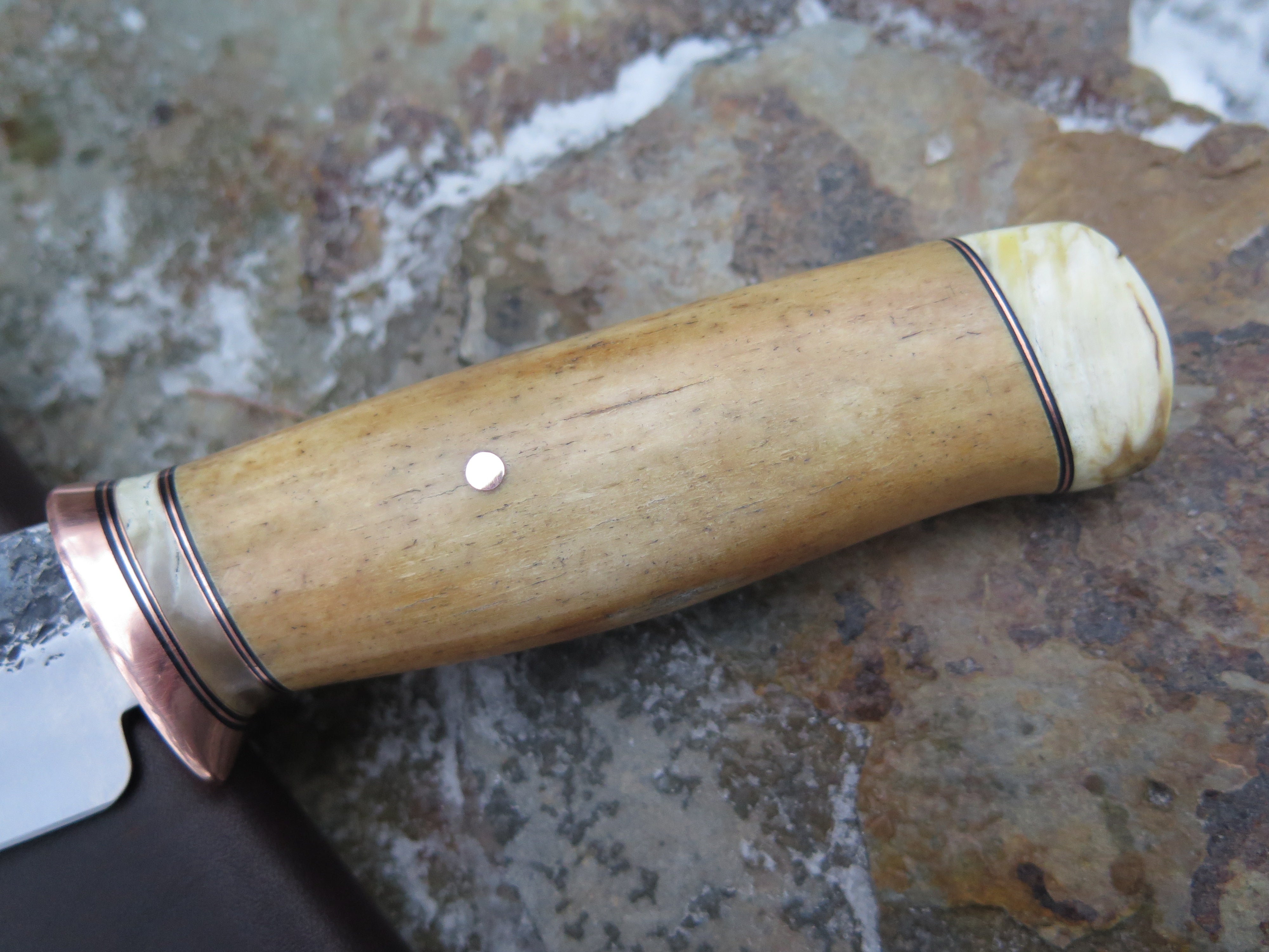 This beautiful new Hunter from Behring Made© is hand forged from pre-WWII Studebaker truck leaf springs and it measures 3 3/4" from tip to guard with a razor sharp hollow grind and our hammermark finish. The copper guard is soldered in place above black fiber, copper and musk ox boss spacers with a Stellar's sea cow rib bone handle that's pinned with copper. James included a musk ox boss buttcap and the overall length measures out to 8 1/4". This one is guaranteed for life in a classic brown belt pouch sheath.