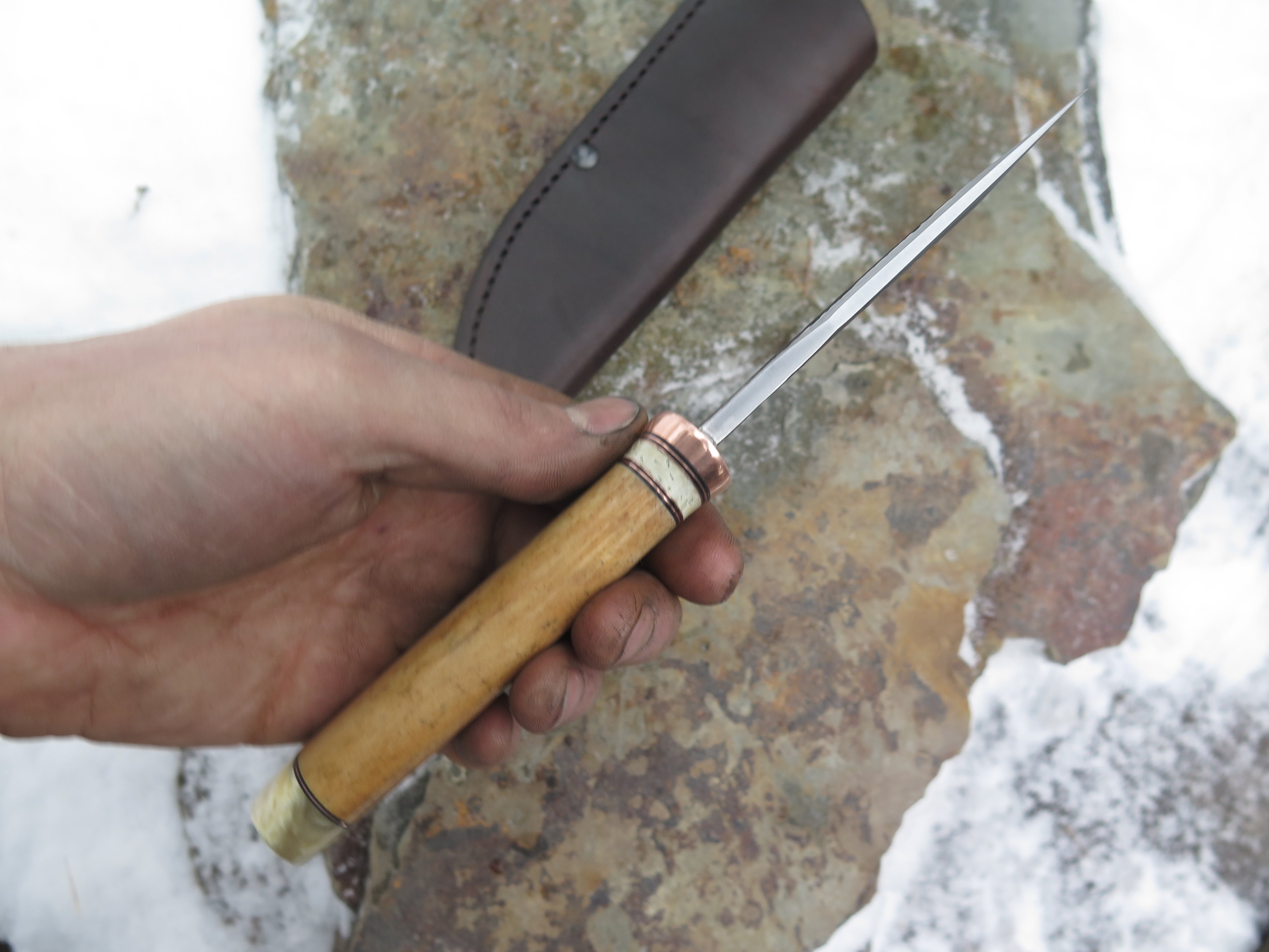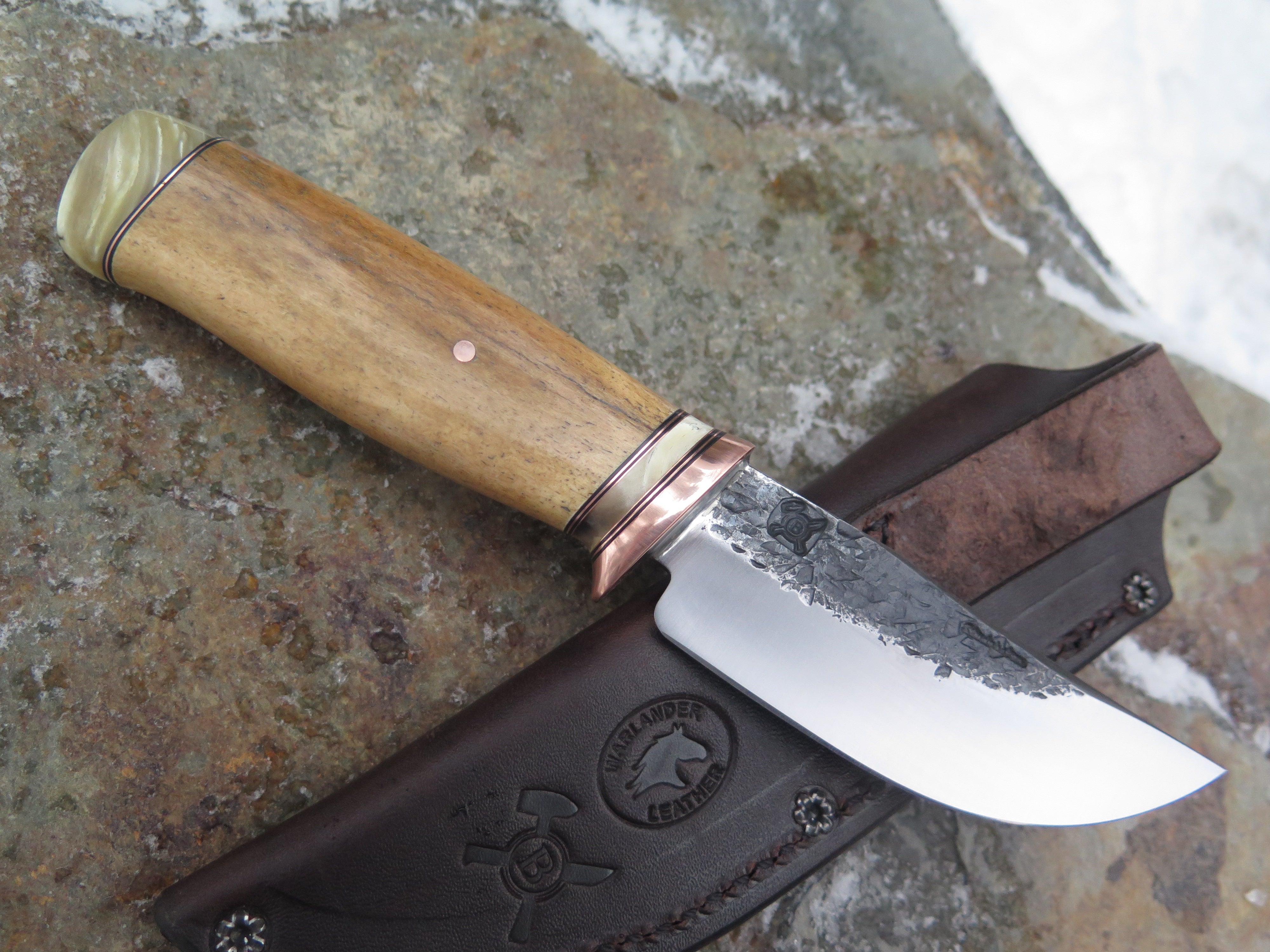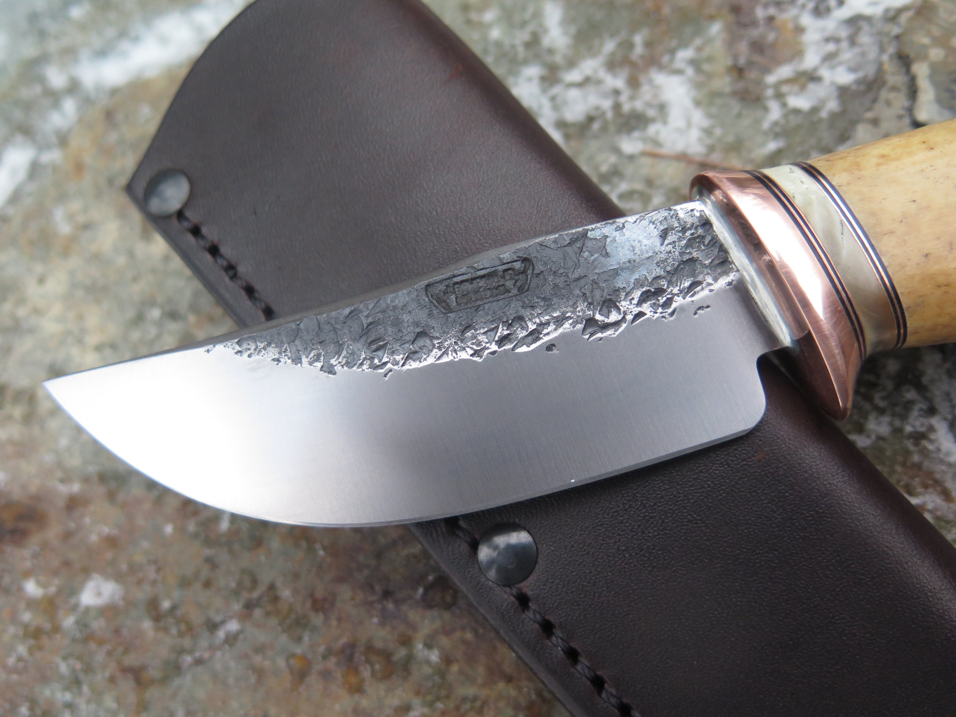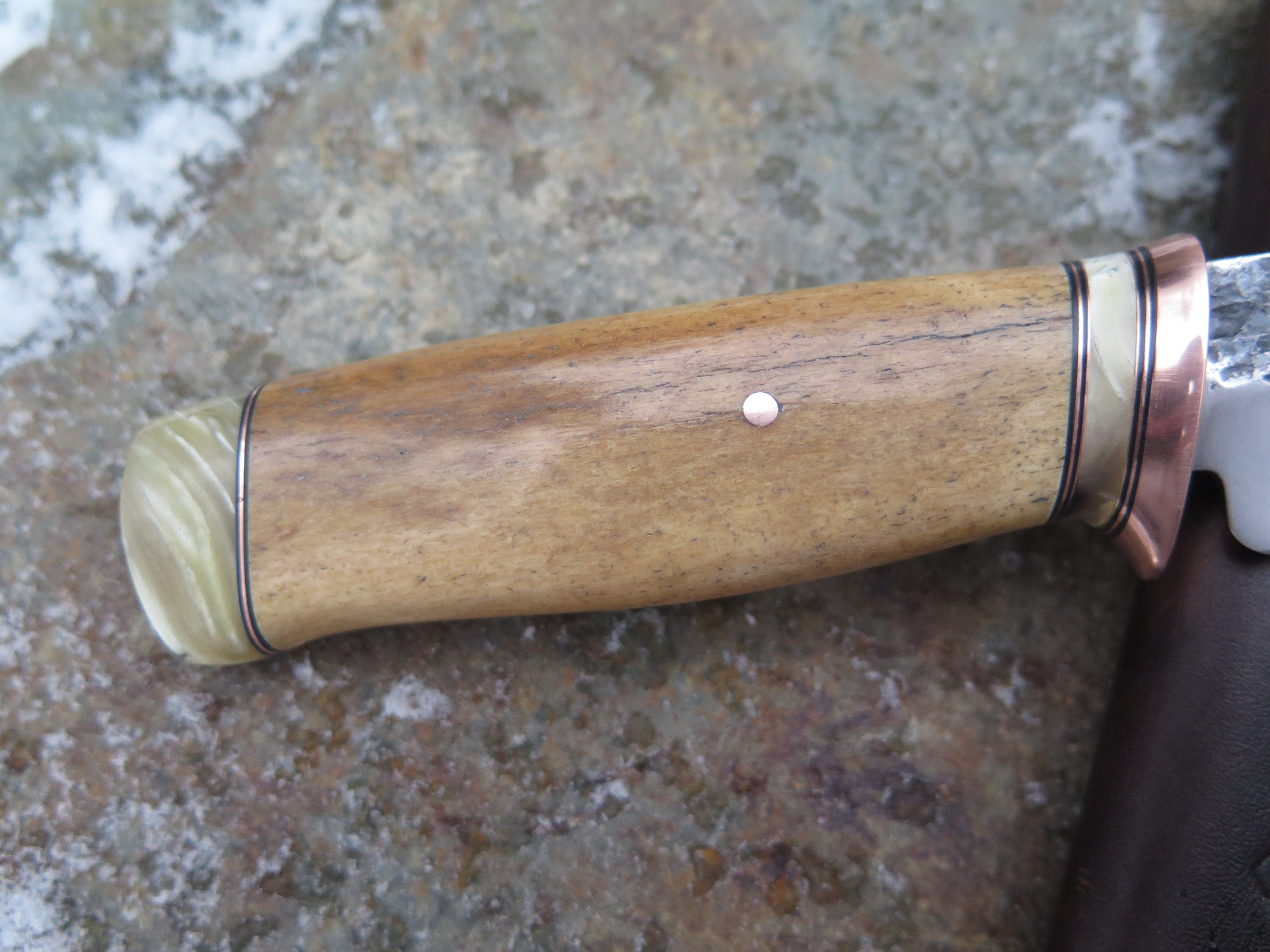 This beautiful new Hunter from Behring Made© is hand forged from pre-WWII Studebaker truck leaf springs and it measures 3 3/4" from tip to guard with a razor sharp hollow grind and our hammermark finish. The copper guard is soldered in place above black fiber, copper and musk ox boss spacers with a Stellar's sea cow rib bone handle that's pinned with copper. James included a musk ox boss buttcap and the overall length measures out to 8 1/4". This one is guaranteed for life in a classic brown belt pouch sheath.