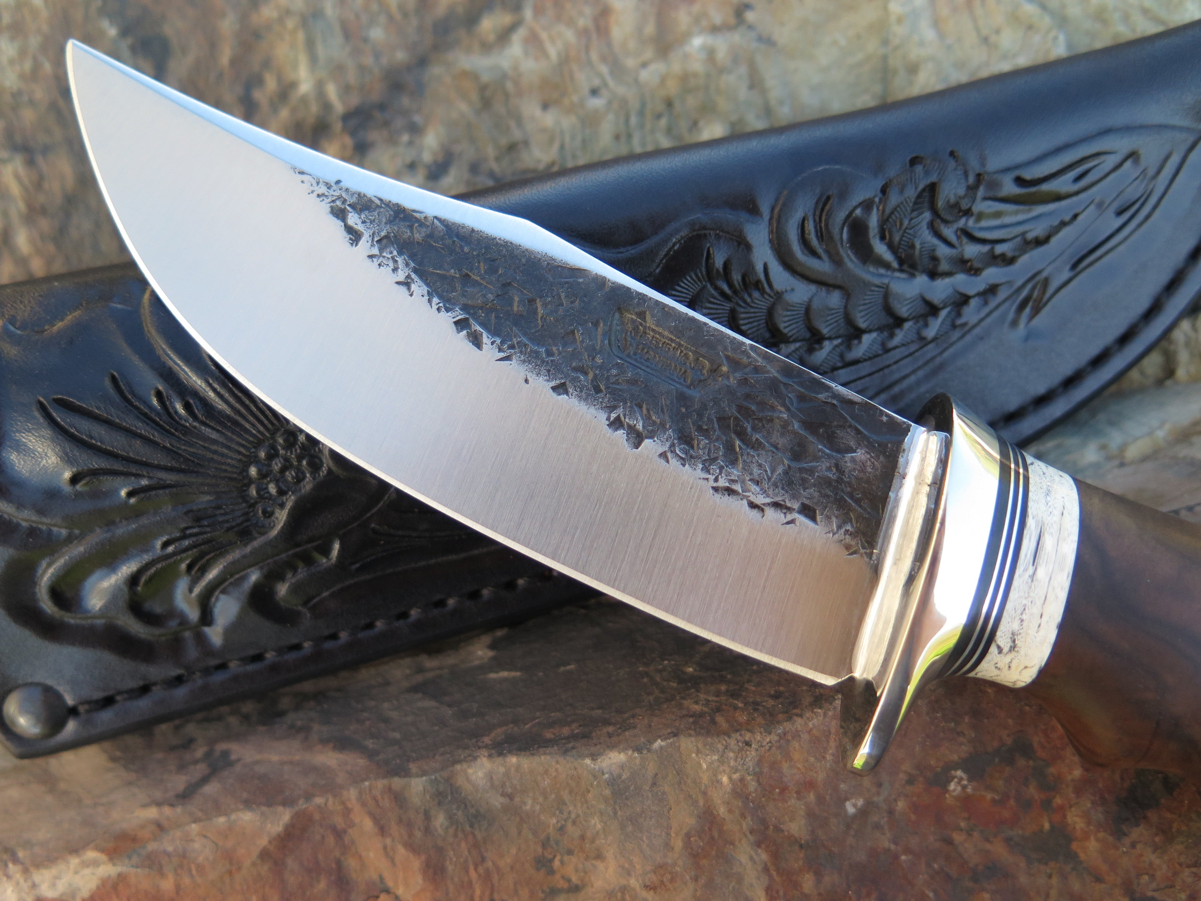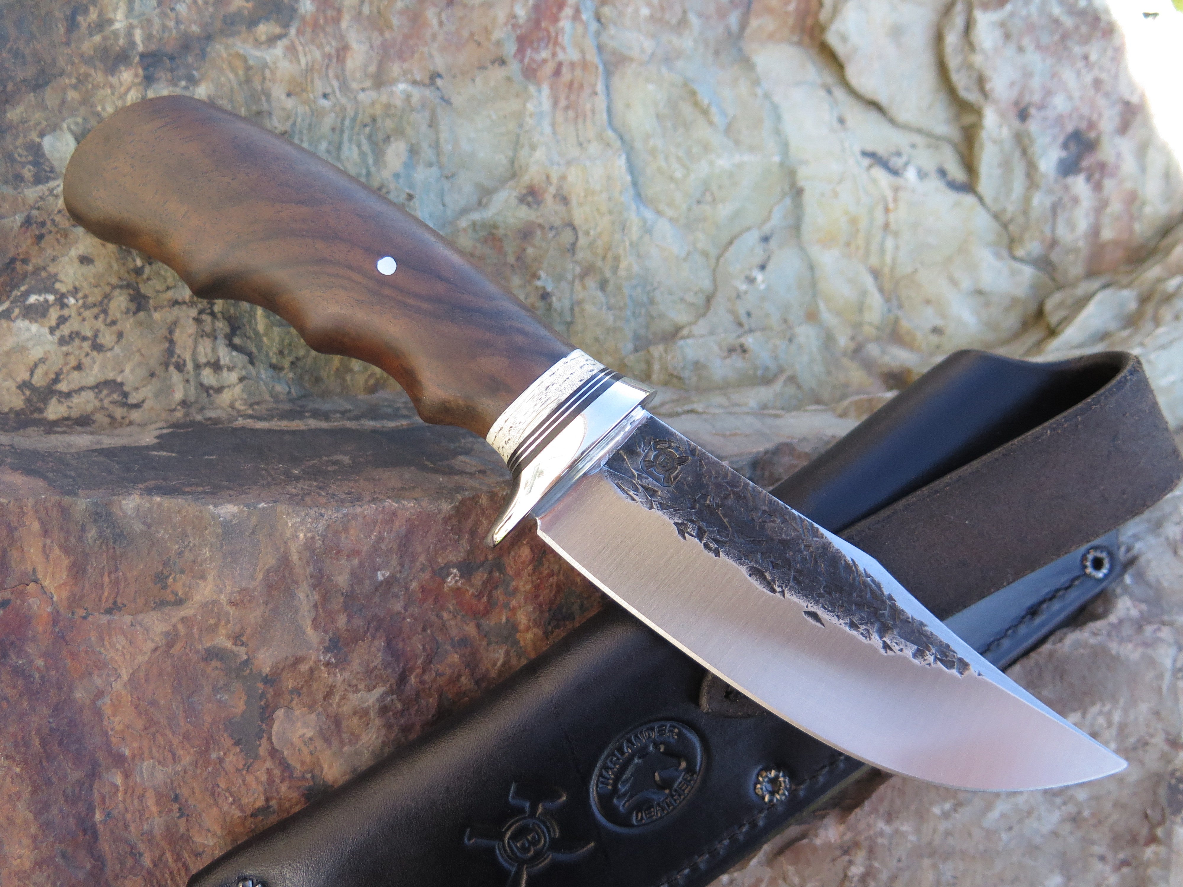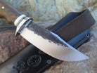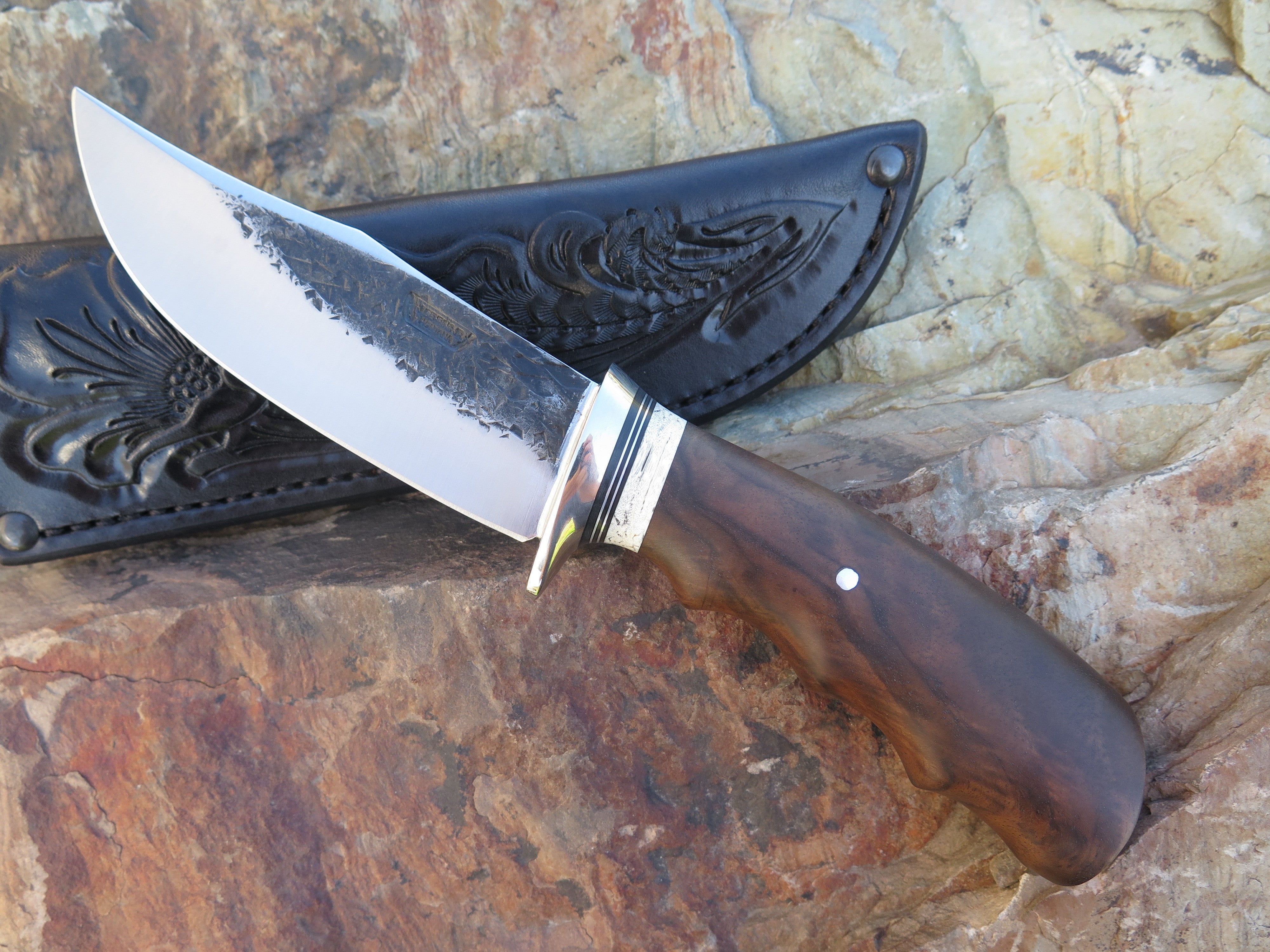 This new Hunter from Behring Made™ is as beautiful as it is functional! Hand forged from 3/16" thick high carbon 01 tool steel, the blade measures 4 1/2" from tip to guard with a razor sharp hollow grind and a hammermark finish. The nickel silver guard is soldered in place above black fiber, aluminum and musk ox boss spacers and the handle is a gorgeous piece of Claro walnut in the Ward Gay finger grip style, plus it's pinned through the tang with aluminum for a rock solid construction that's guaranteed. Overall length measures 8 7/8" and it comes in a Warlander Leather pouch sheath, though this can be changed upon request.