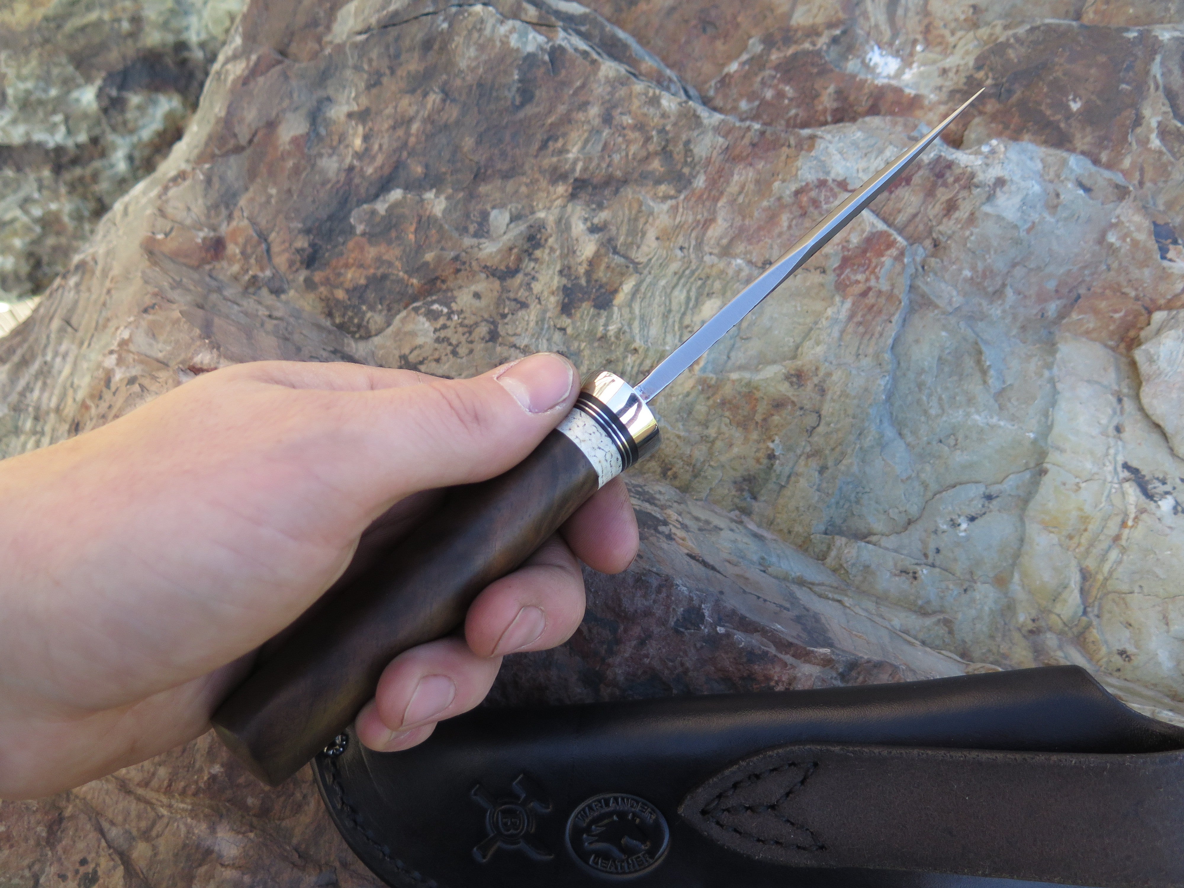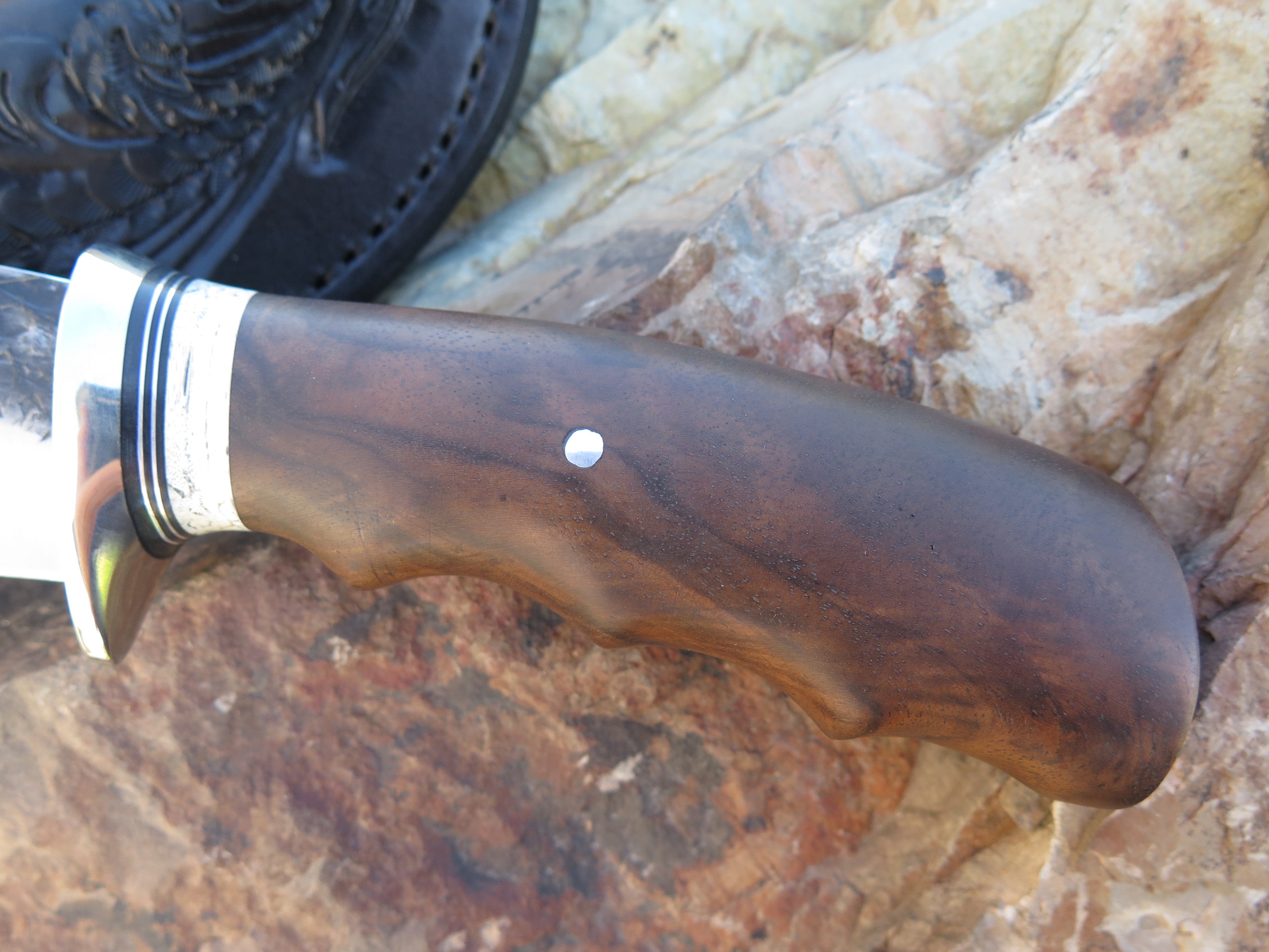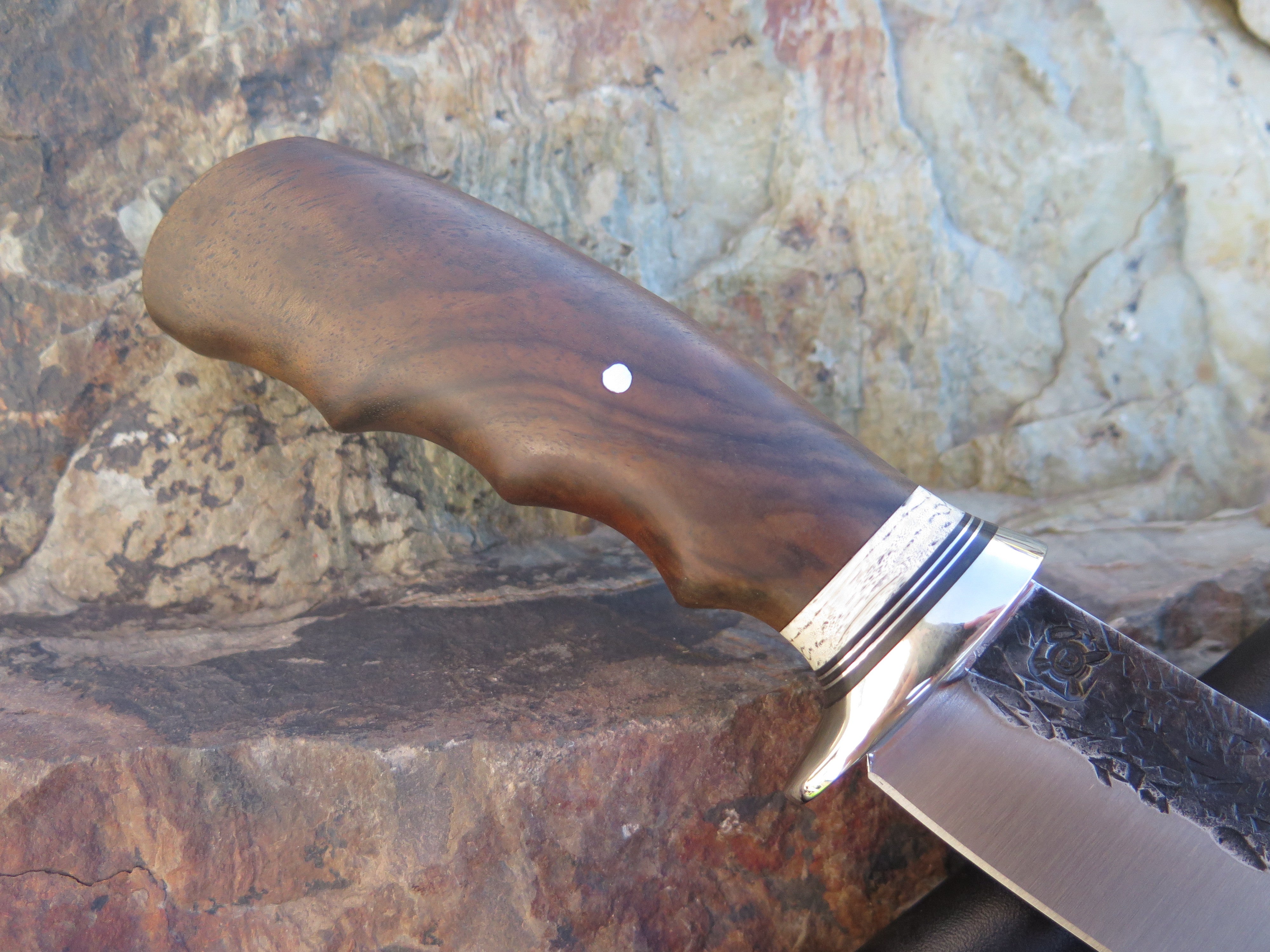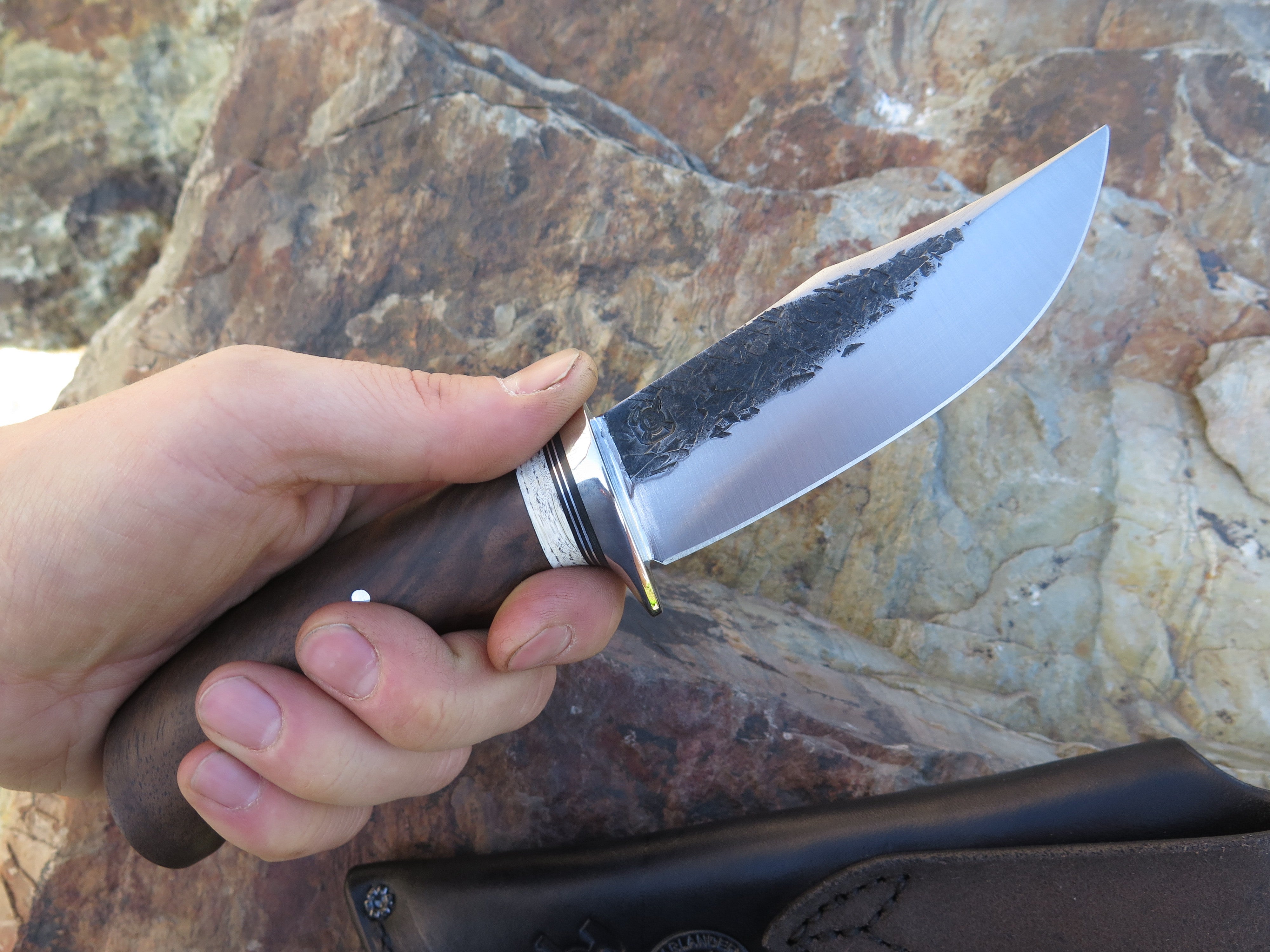 This new Hunter from Behring Made™ is as beautiful as it is functional! Hand forged from 3/16" thick high carbon 01 tool steel, the blade measures 4 1/2" from tip to guard with a razor sharp hollow grind and a hammermark finish. The nickel silver guard is soldered in place above black fiber, aluminum and musk ox boss spacers and the handle is a gorgeous piece of Claro walnut in the Ward Gay finger grip style, plus it's pinned through the tang with aluminum for a rock solid construction that's guaranteed. Overall length measures 8 7/8" and it comes in a Warlander Leather pouch sheath, though this can be changed upon request.