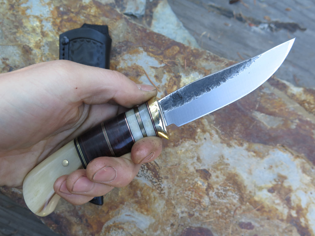 This new addition to the Pintail Archive from Behring Made© is hand forged from 1/8” thick high carbon 01 tool steel and it measures 4 1/4” from tip to guard with a razor sharp hollow grind and our hammermark finish. The brass guard is soldered in place above black, brass, copper and horsehide spacers with a two big horn sheep accents and a butt of the same that’s pinned through the tang with brass. The overall length measures just over 8 3/8” and it comes in premium tooled belt pouch sheath. Please allow 4-8 weeks for production and delivery. Material figure will vary, and we hand select so that we can guarantee satisfaction. Contact if you need more info or want to make changes.