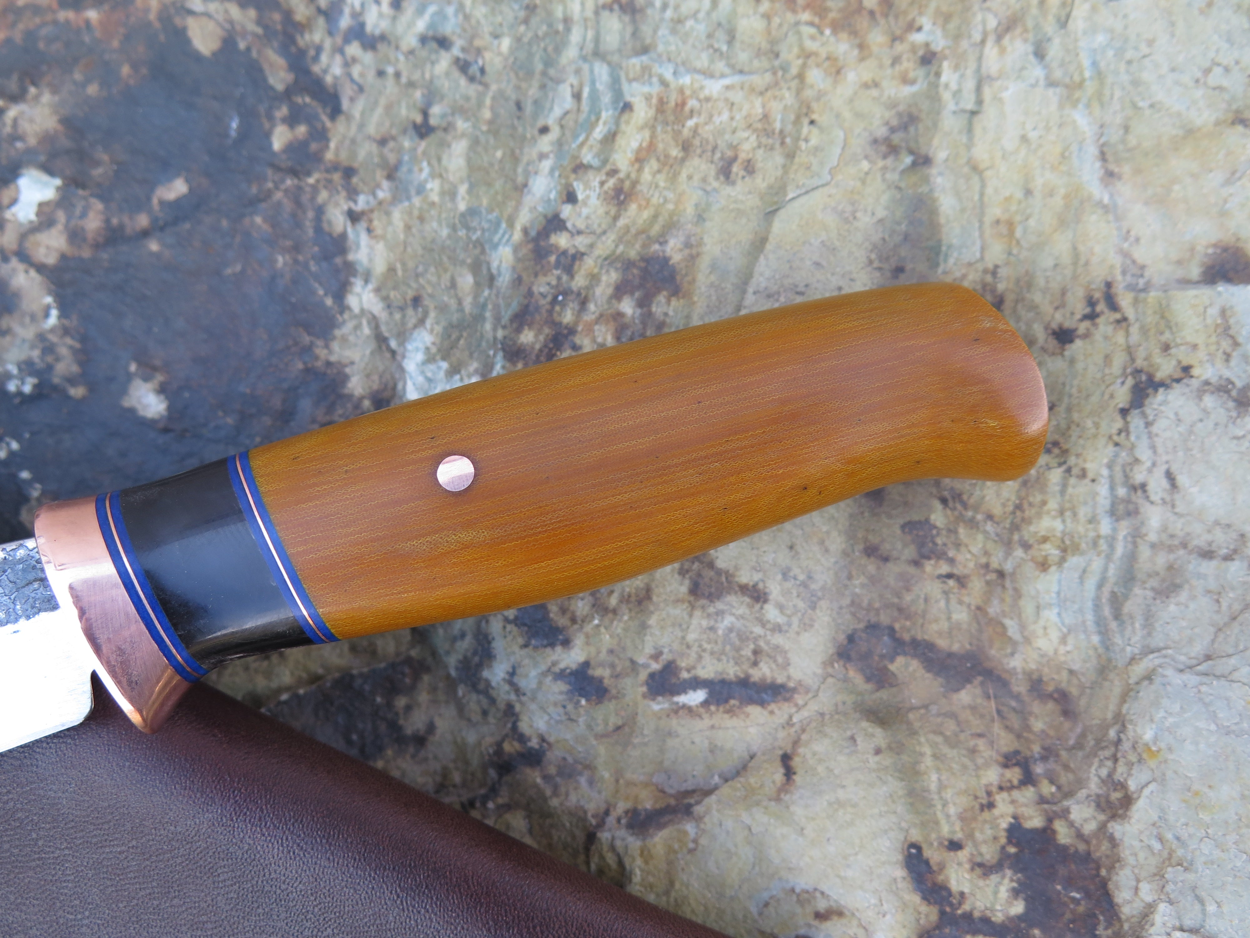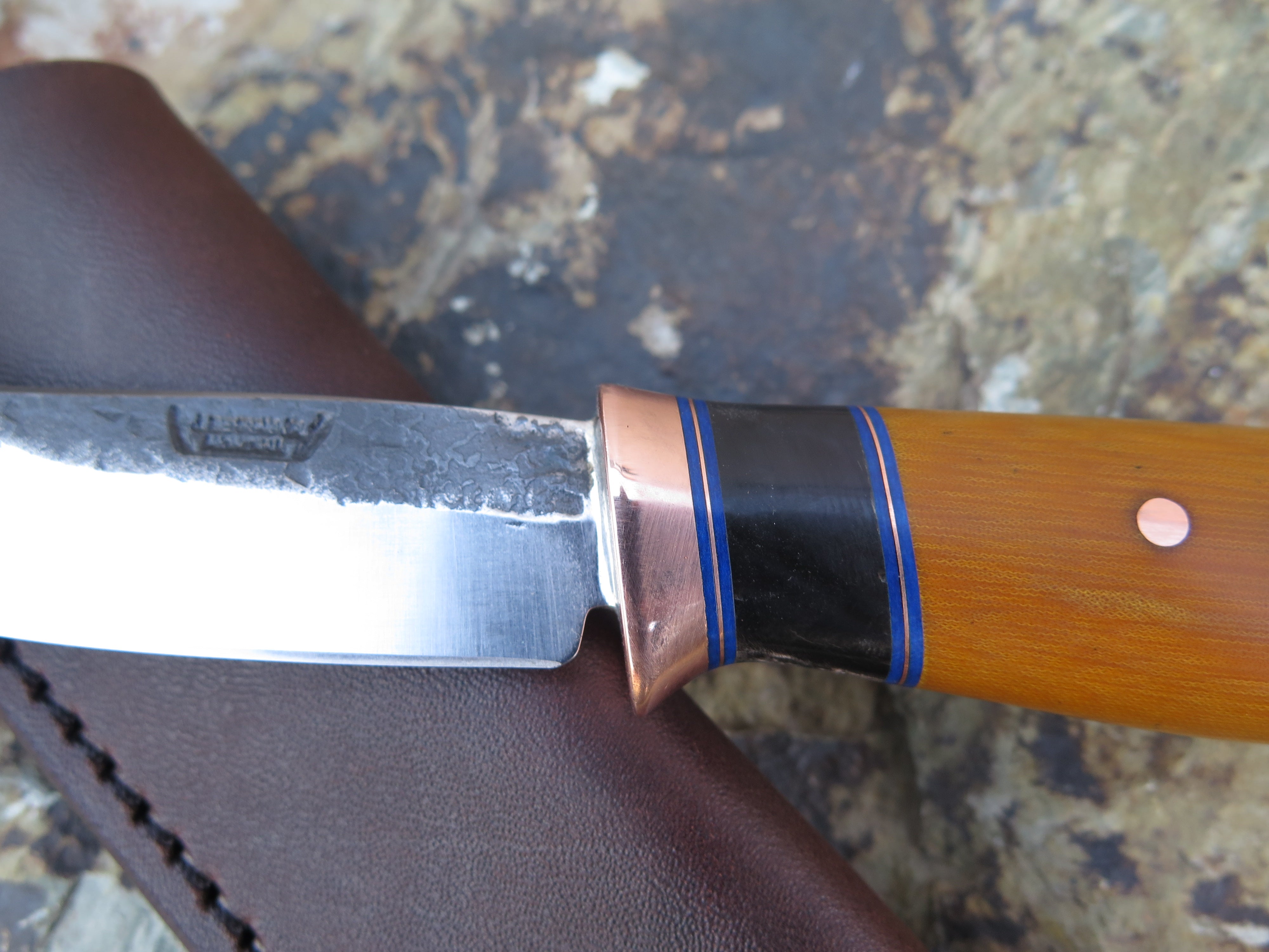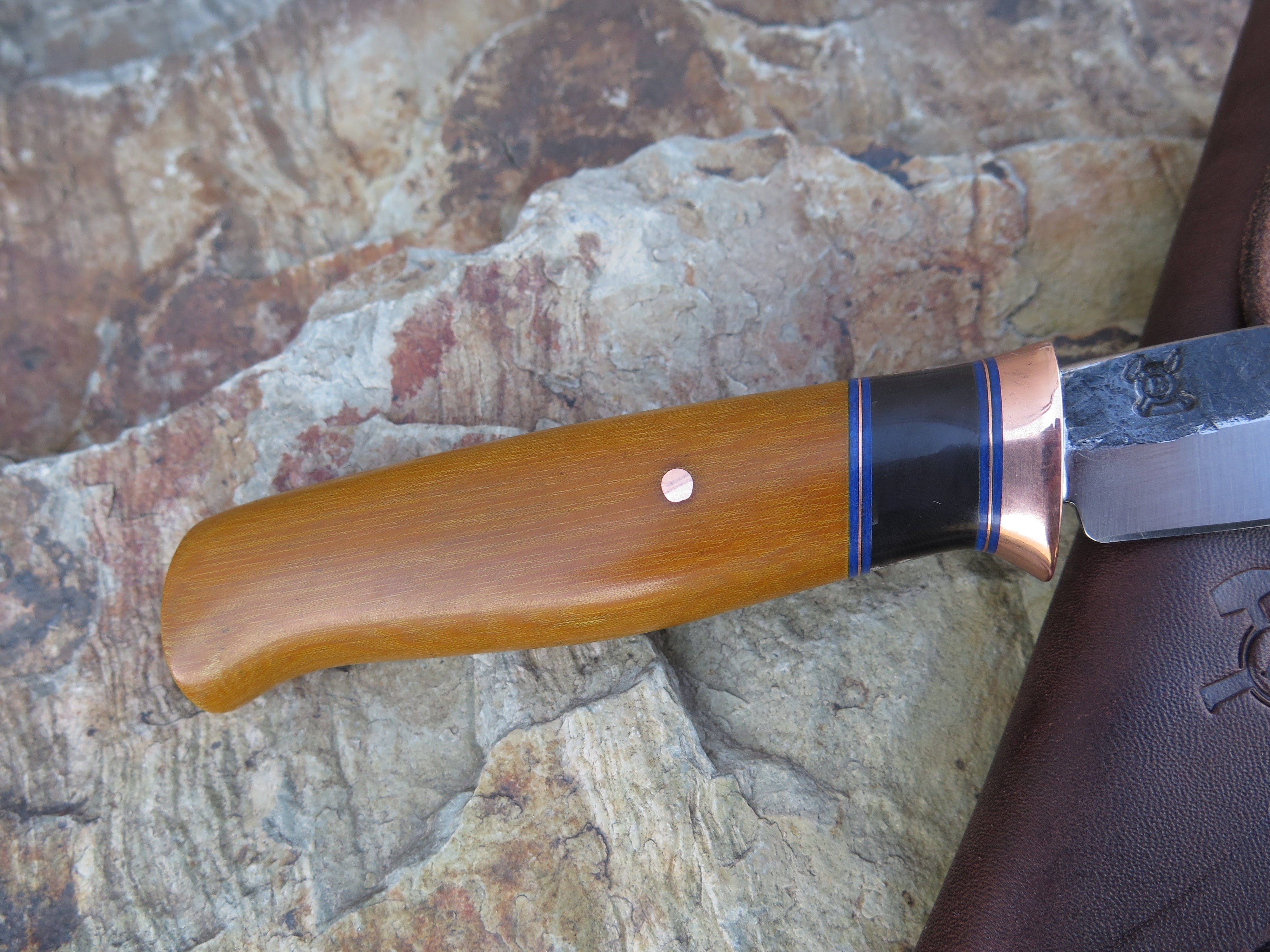 This beautiful new Pintail from Behring Made© is hand forged from 1/8" thick high carbon 01 tool steel and it measures just under 4" from tip to guard with a razor sharp hollow grind and our hammermark finish. The copper guard is soldered in place above blue fiber, copper and black buffalo horn spacers. The yellow micarta handle is pinned through the tang with copper and overall length is 8 1/8". Guaranteed for life, this one comes in a classic belt pouch sheath.