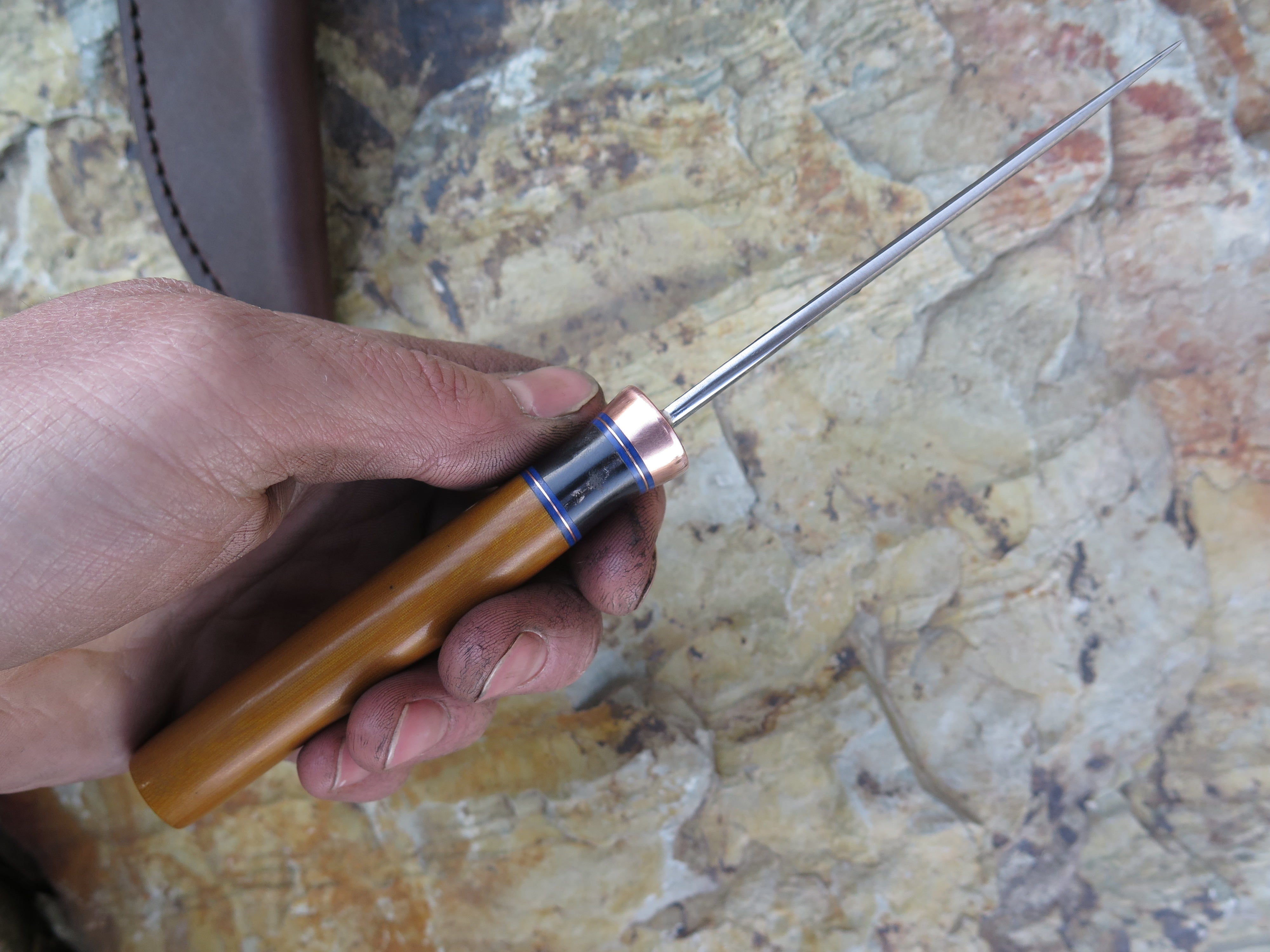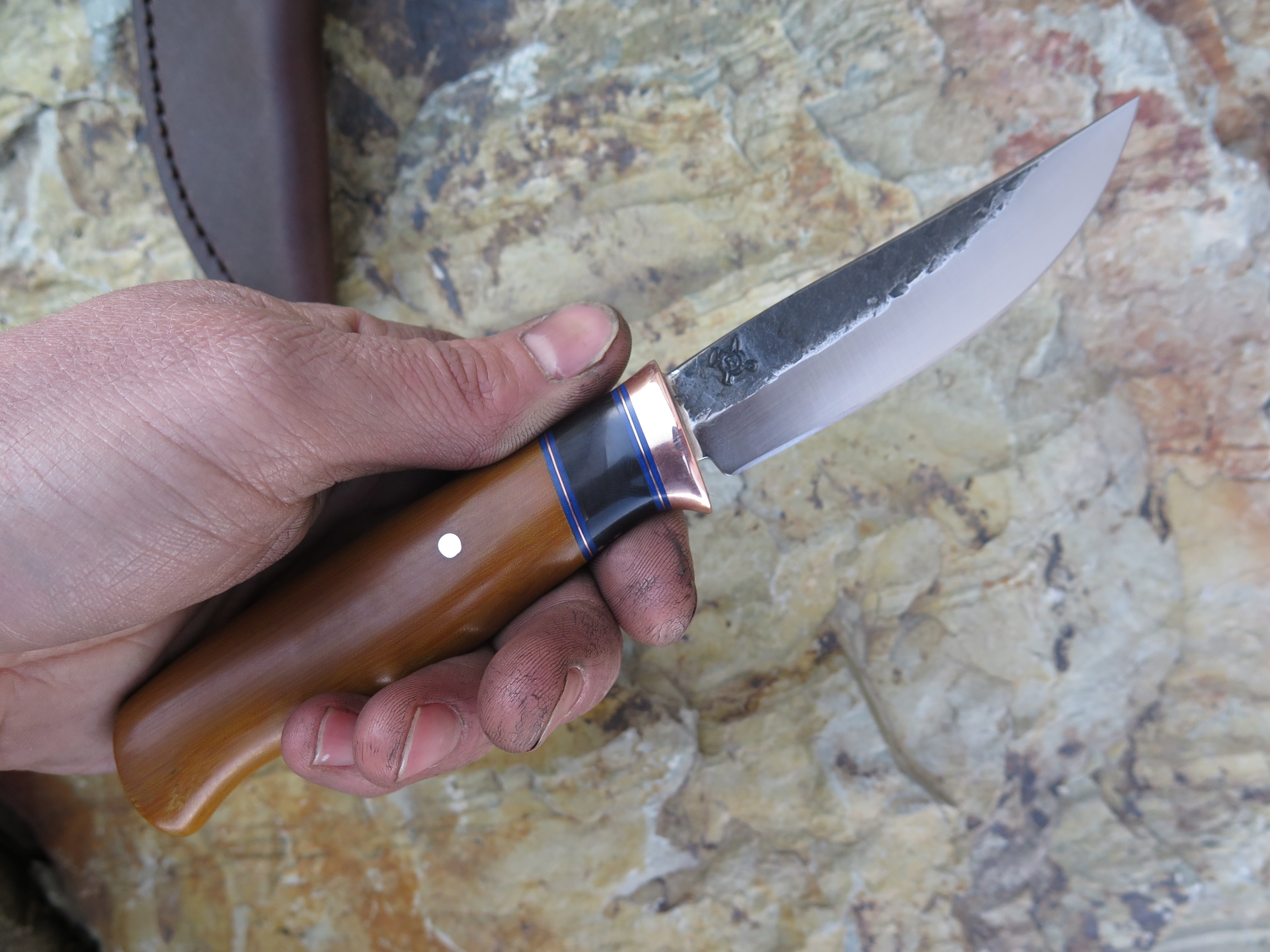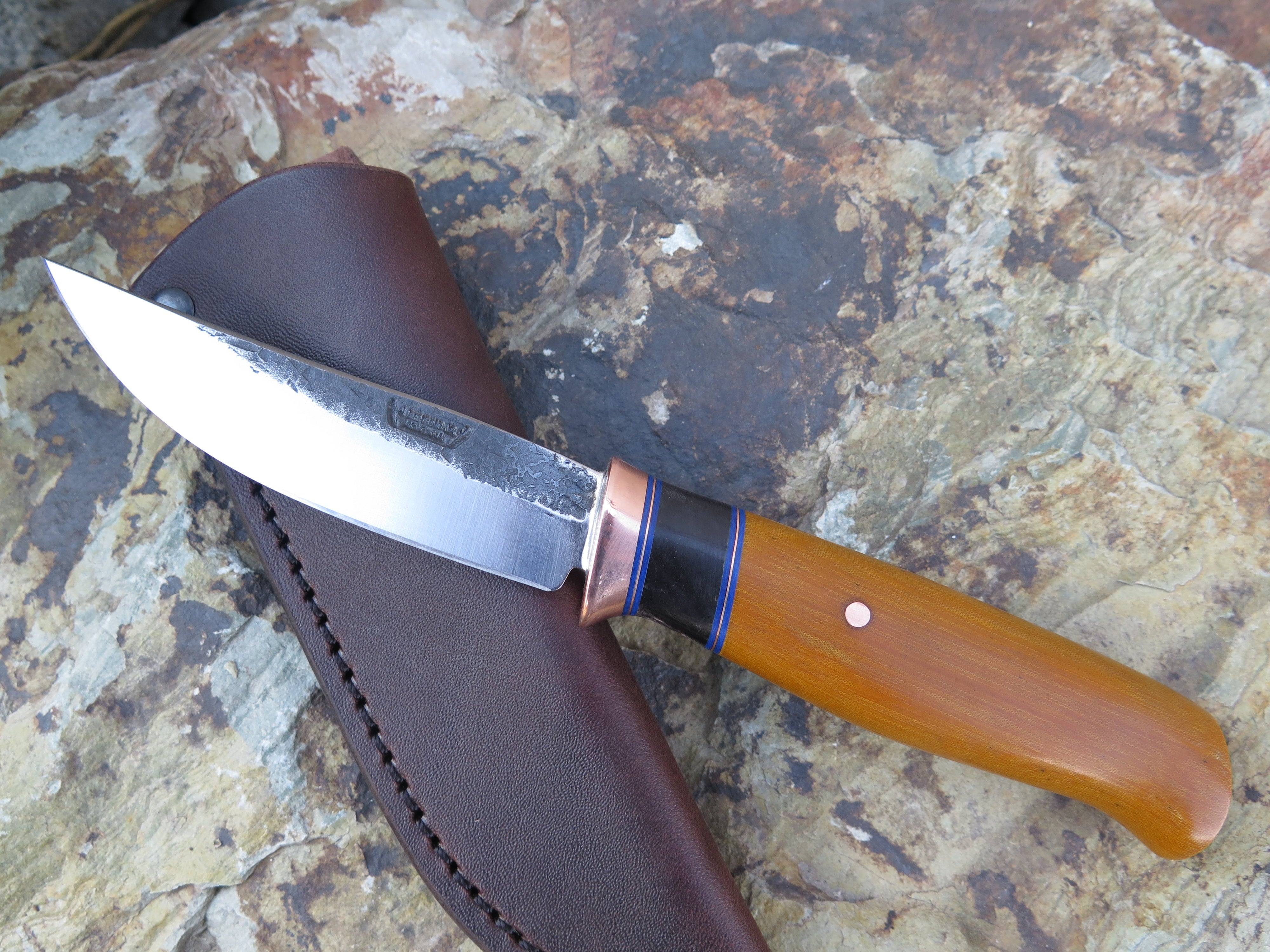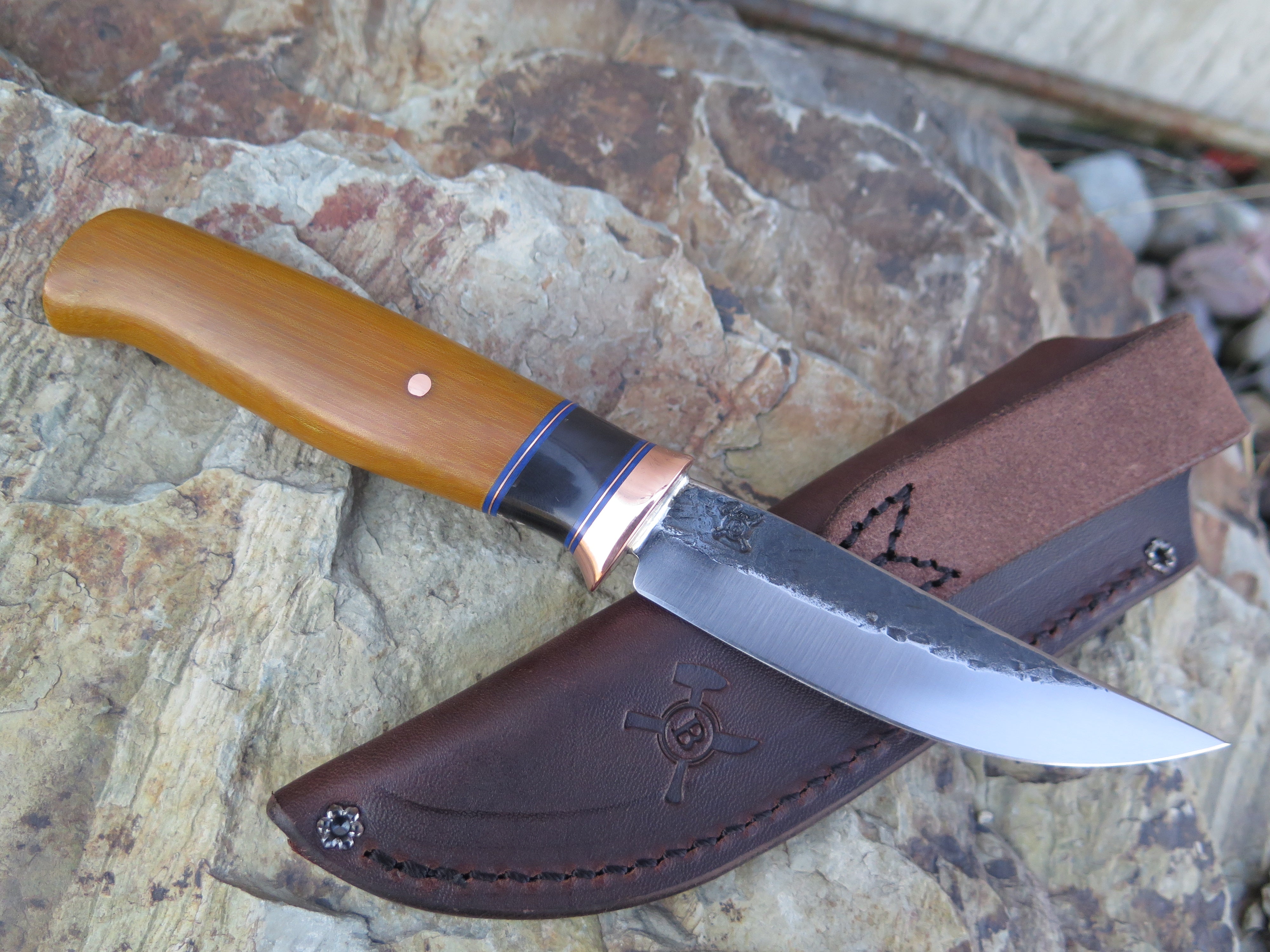 This beautiful new Pintail from Behring Made© is hand forged from 1/8" thick high carbon 01 tool steel and it measures just under 4" from tip to guard with a razor sharp hollow grind and our hammermark finish. The copper guard is soldered in place above blue fiber, copper and black buffalo horn spacers. The yellow micarta handle is pinned through the tang with copper and overall length is 8 1/8". Guaranteed for life, this one comes in a classic belt pouch sheath.