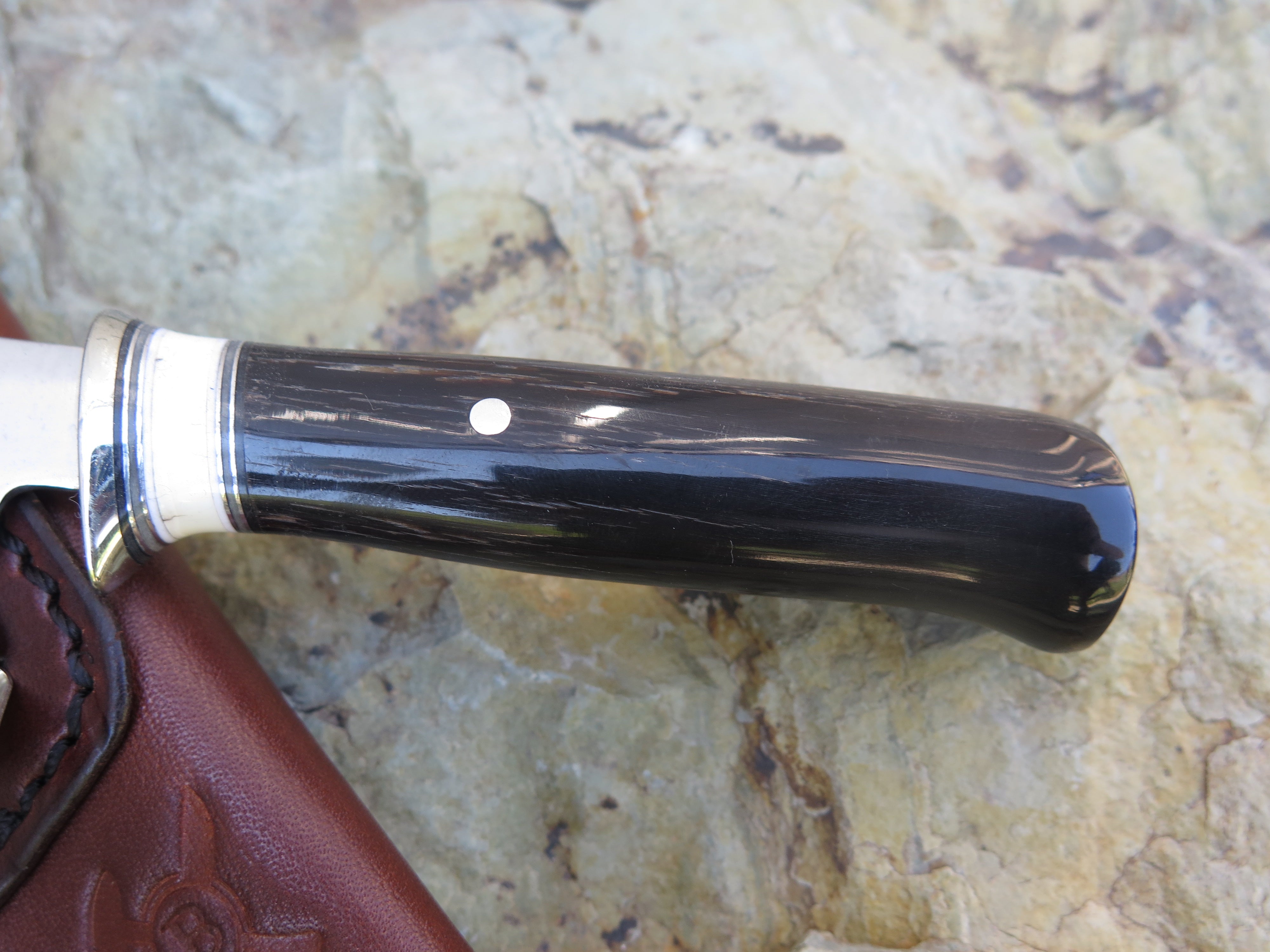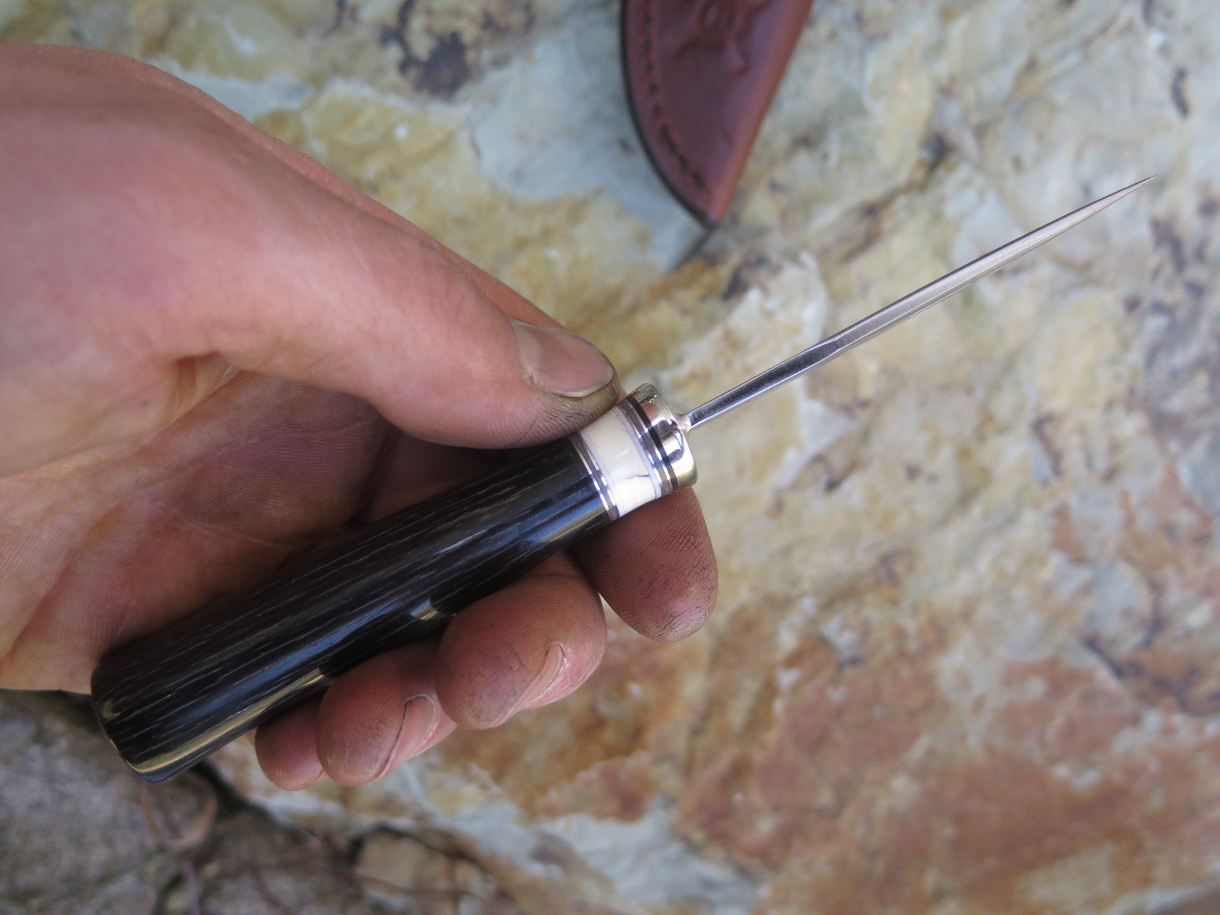 This ideal new Alaskan Pocket knife from Behring Made© is hand forged from 1/8" thick high carbon 01 tool steel and it measures 2 3/4" from tip to guard with a razor sharp convex grind. The nickel silver guard is soldered in place above black, grey and white fiber, aluminum and premium fossil walrus ivory spacers that offer a perfect transition to the buffalo horn handle that is pinned through the tang with aluminum. Overall length measures 6 1/4" and it comes in a clip sheath for the right pocket.