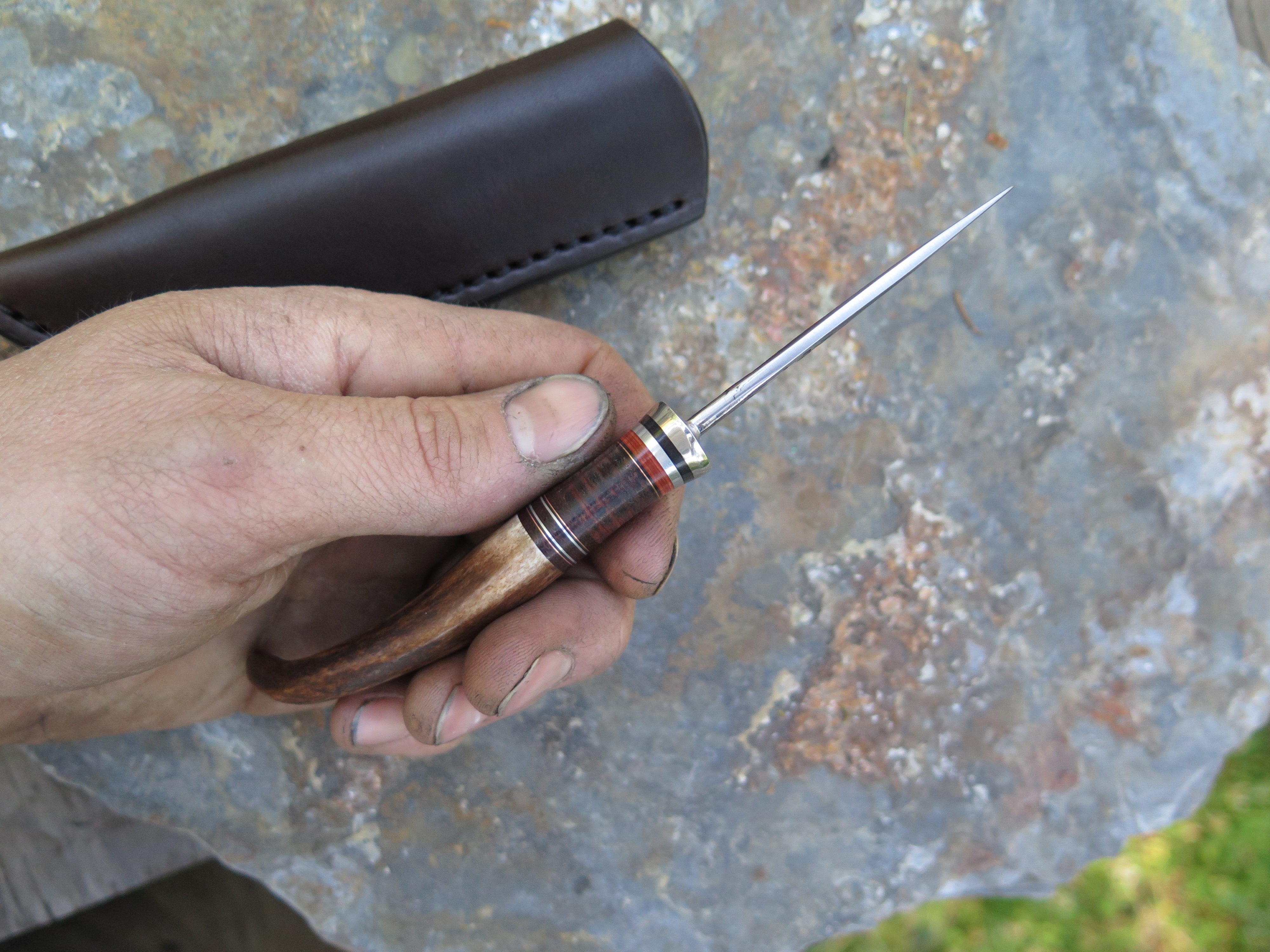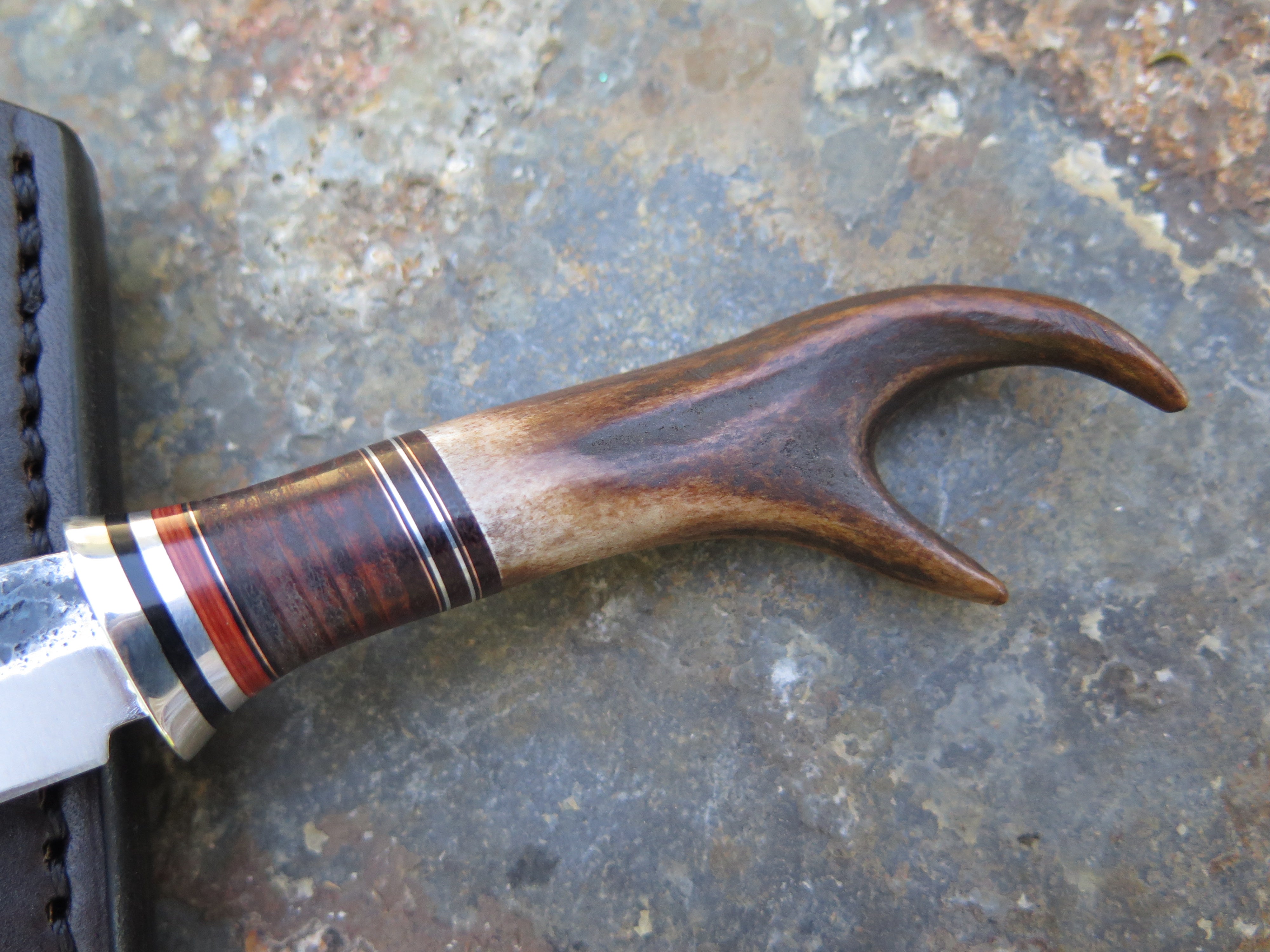 This outstanding new Pocket Knife from Behring Made© is hand forged from 1/8" thick high carbon 01 tool steel and it measures 2 1/2" from tip to guard with a razor sharp hollow grind and our hammermark finish. The nickel silver guard is soldered in place above black and maroon fiber, copper, aluminum and horsehide leather spacers as well as the beautiful mermaid tail shaped whitetail handle. The overall length measures 6" and it comes in a spring clip right-handed pocket sheath.