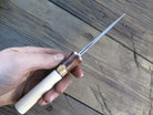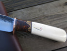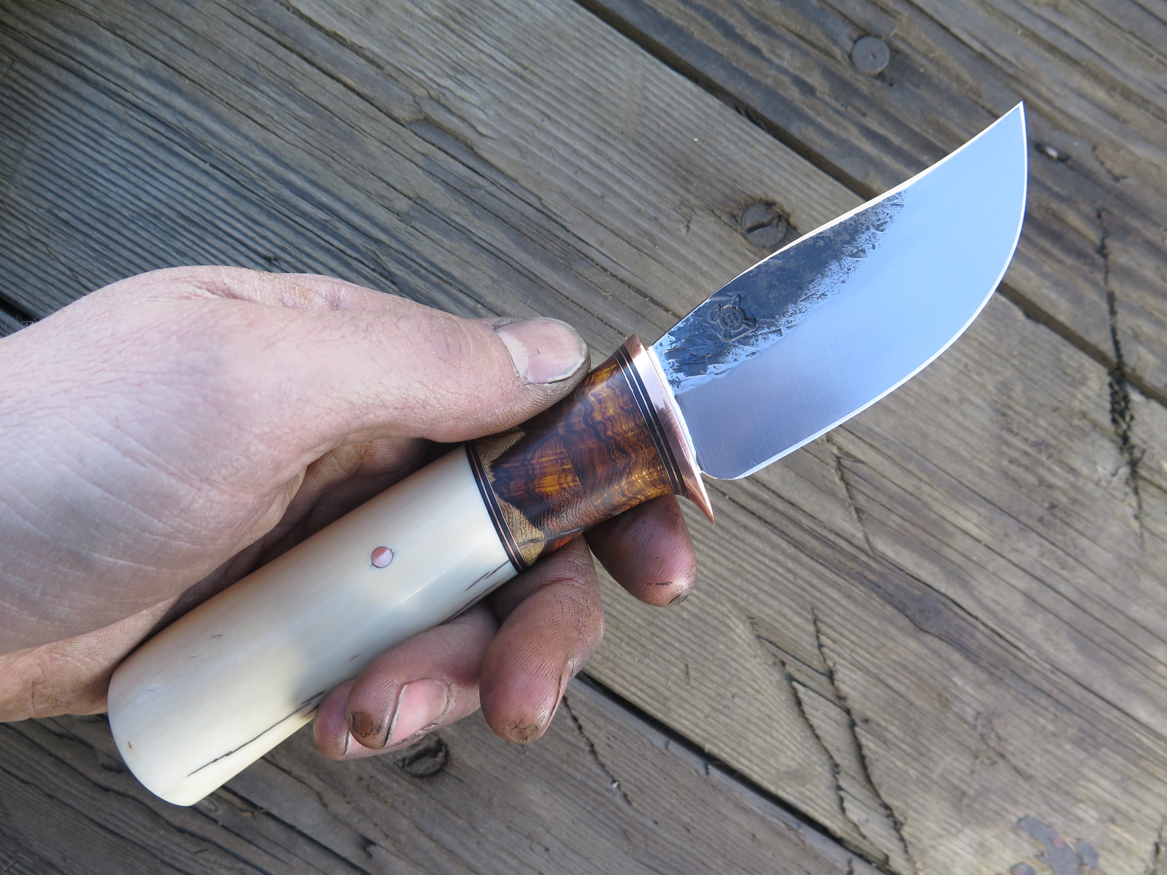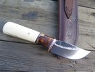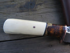 This new Sharptail from Behring Made© is a truly perfect option for the discerning hunter. The blade is hand forged from 3/16" thick high carbon 01 tool steel and it measures 3 1/2" from tip to guard with a razor sharp hollow grind and our hammermark finish. The copper guard is soldered in place above black fiber, copper and premium desert ironwood spacers while the handle is incredible fossilized mammoth ivory that we pinned through the tang with copper. The overall length measures 7 7/8" and it comes in the shown classic belt pouch sheath, though you can upgrades can be made by request.